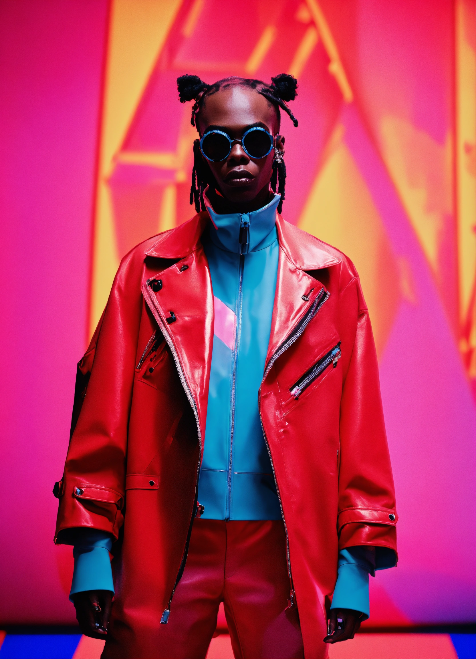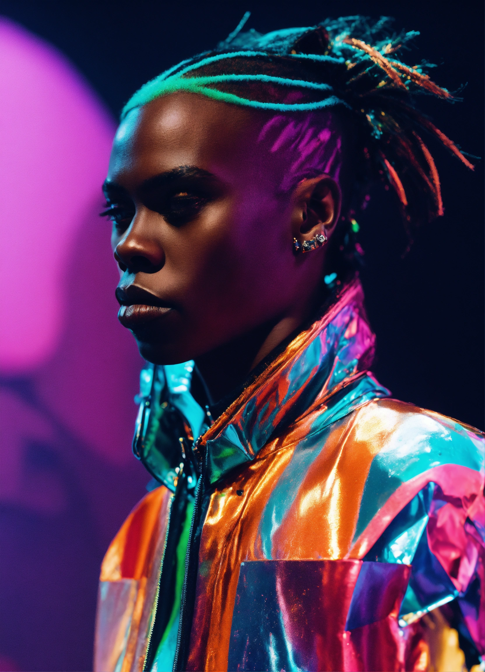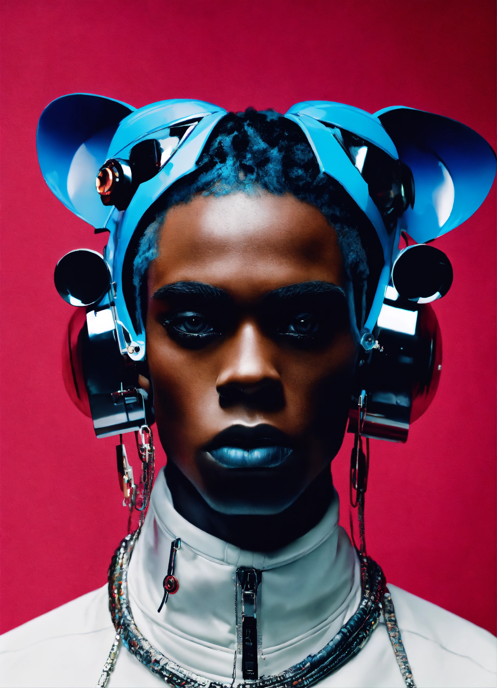 Yves tumor wearing futuristic new wave fashion collection inspired by animals manga android robots logo icon stylized by andy warhol geometrical edgy expressionism designed by xsander zhou balenciaga alexsander wang off white cristopher raeburn avant-garde fashion editorial fashion fashion magazine cinematic shot ultra hd concept art glitch runway on mars