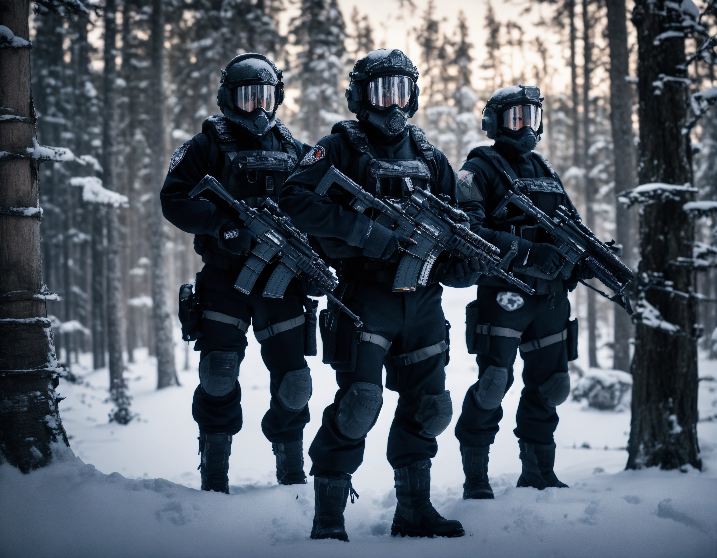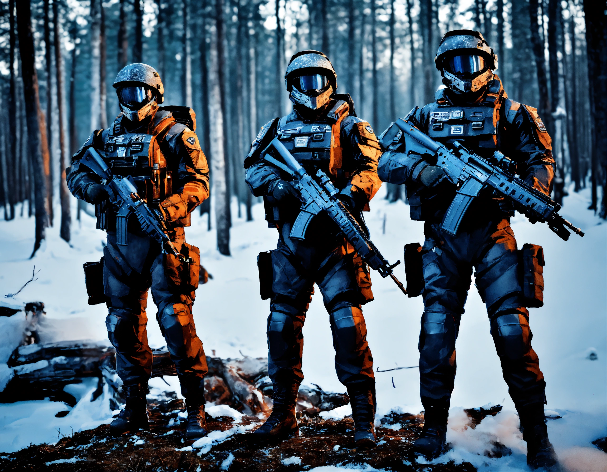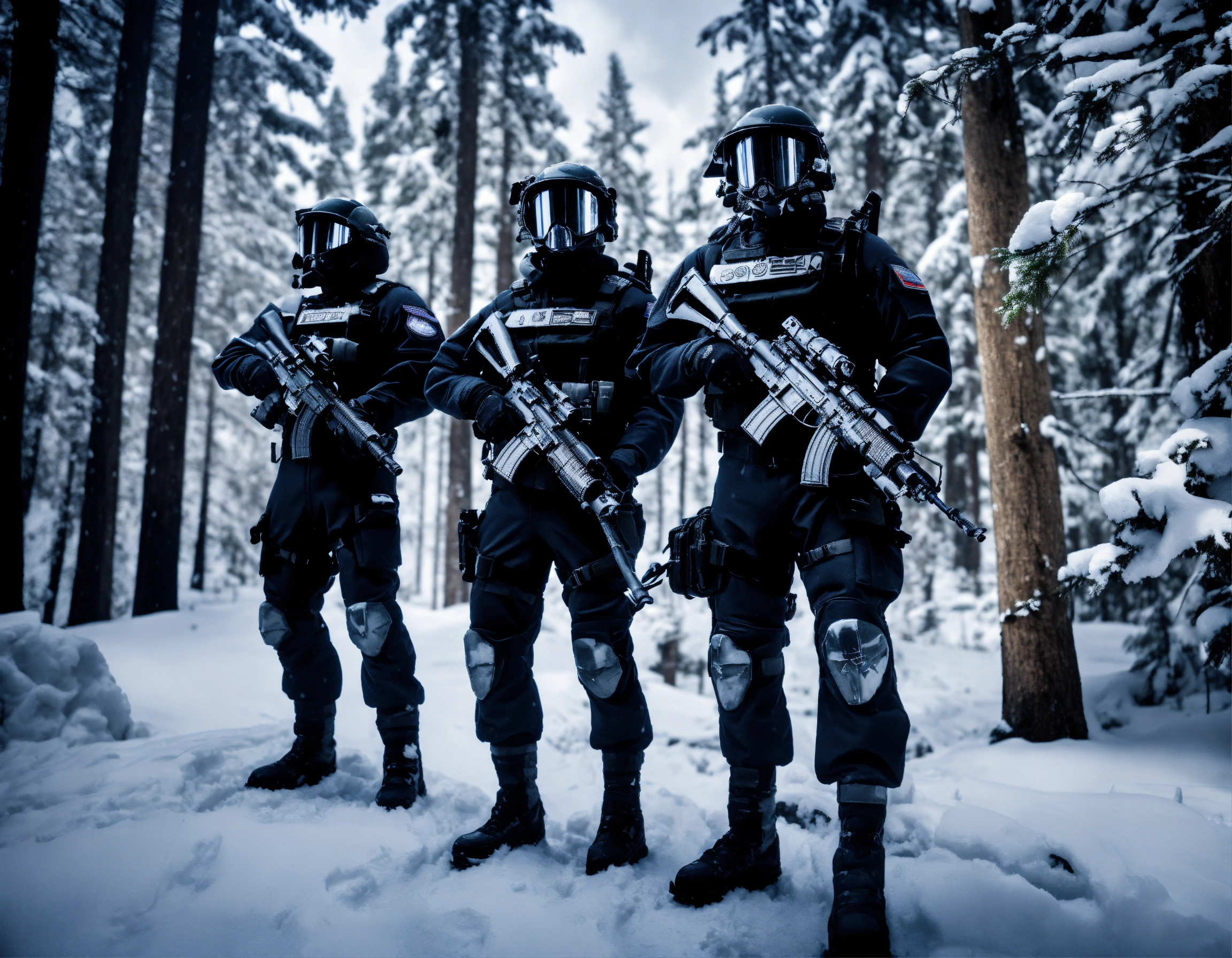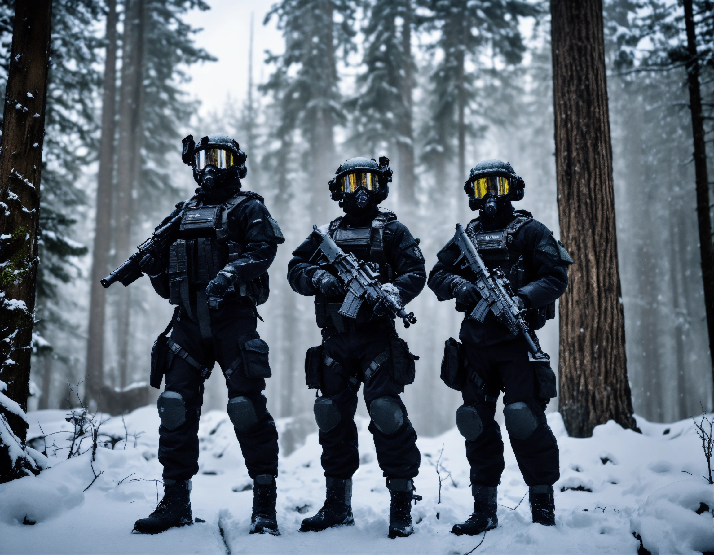 A highly detailed realistic photo of three soldiers wearing a black snow sci-fi tactic suit, with a black helmet, face covered, with a futuristic submachine rifle and a tool belt, with a wheel logo on the shoulder. in the background, .a forest of dead big trees with snow and clouds.