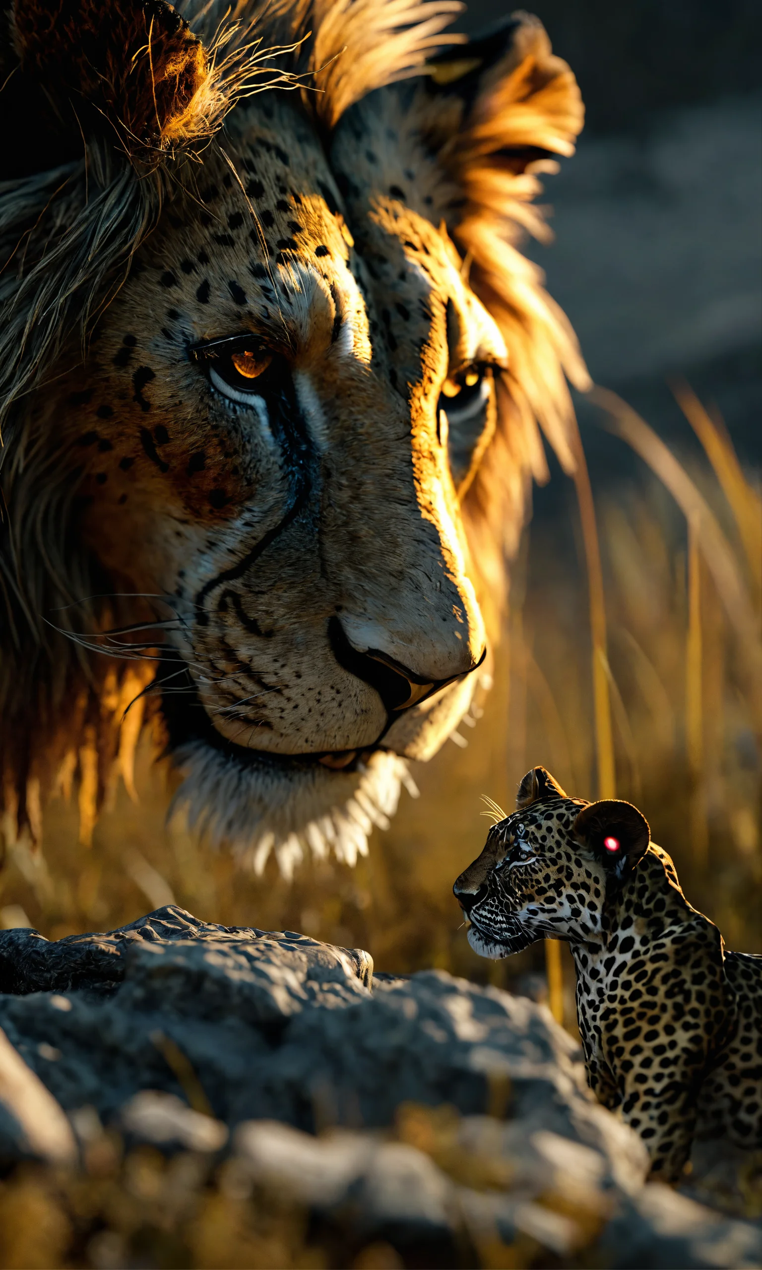 Battle, struggle, and war - the battle for survival: a lion vs. leopard odyssey on the savannah plains - hyperdetailed, hyperrealistic, 8k, hyperrealism realistic, cinematic lighting, design stage design, no text, realistic, volumetric lighting, ray tracing, ultra-detailed, intricate details, movie scene, vibrant colors, intricate design, hdr, 32k resolution, unreal engine 5, cinematic, ultra-wide angle, depth of field, hyper-detailed, insane details, intricate details, beautifully color graded, unreal engine, cinematic, photoshoot, depth of field, dof, speed 1/1000, f/22, white balance, 32k, super-resolution, megapixel, pro photo rgb.