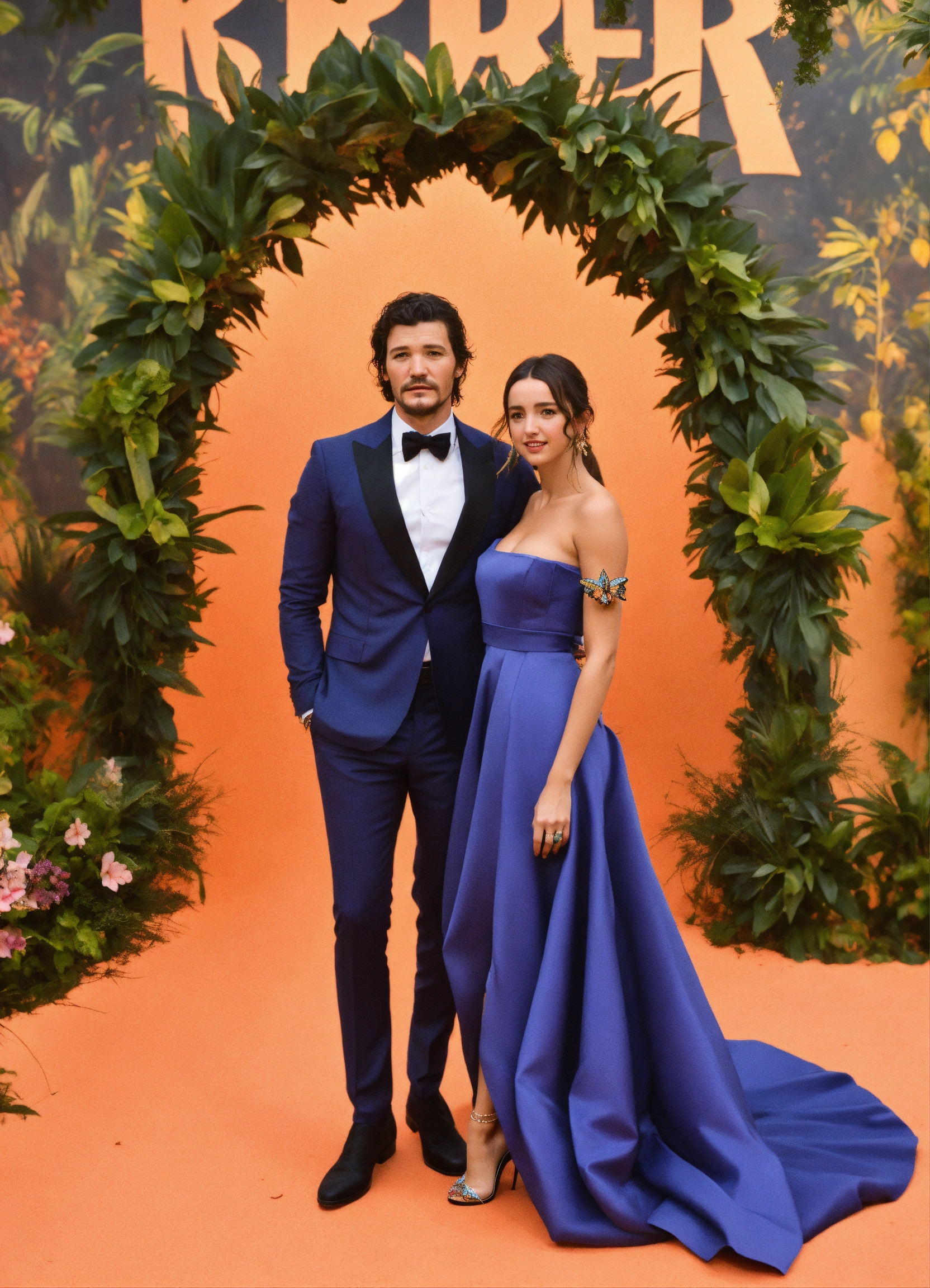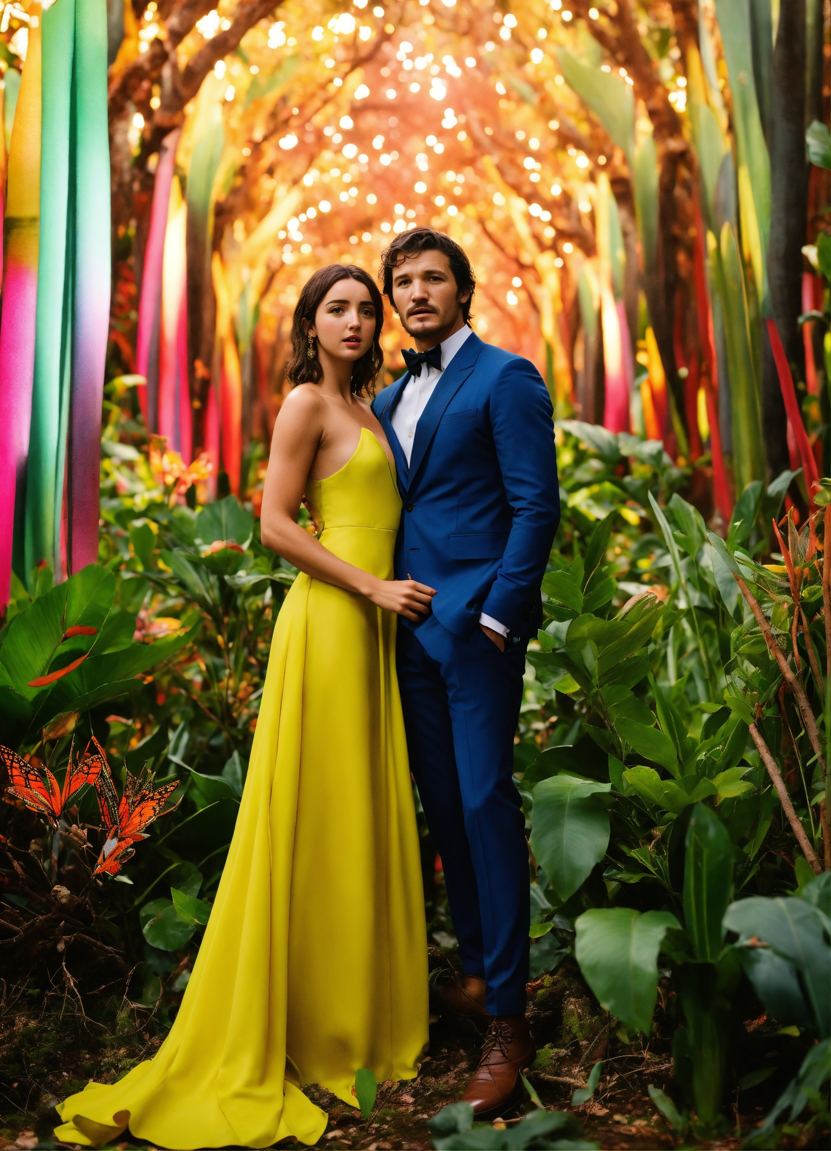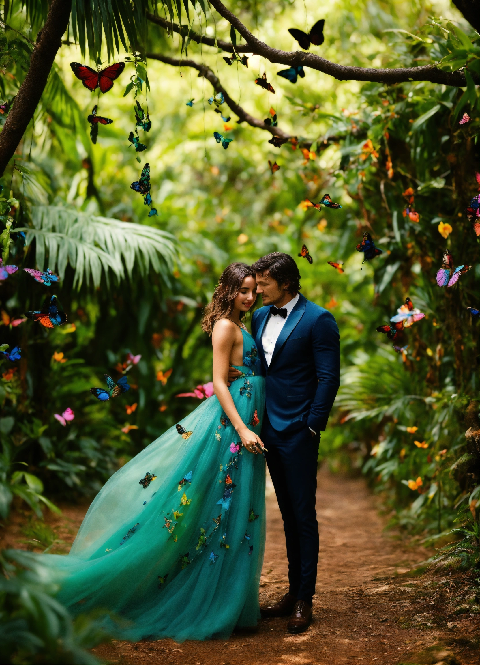 Pedro pascal y ana de armas vestidos de gala están abrazados en medio de un exuberante bosque tropical nocturno, con luciérnagas y mariposas de colores revoloteando a su alrededor. ambos están felices, ajenos a las ramas, raíces y lianas que salen de la tierra y de los árboles y les envuelven mágicamente. hyper realistic, high definition