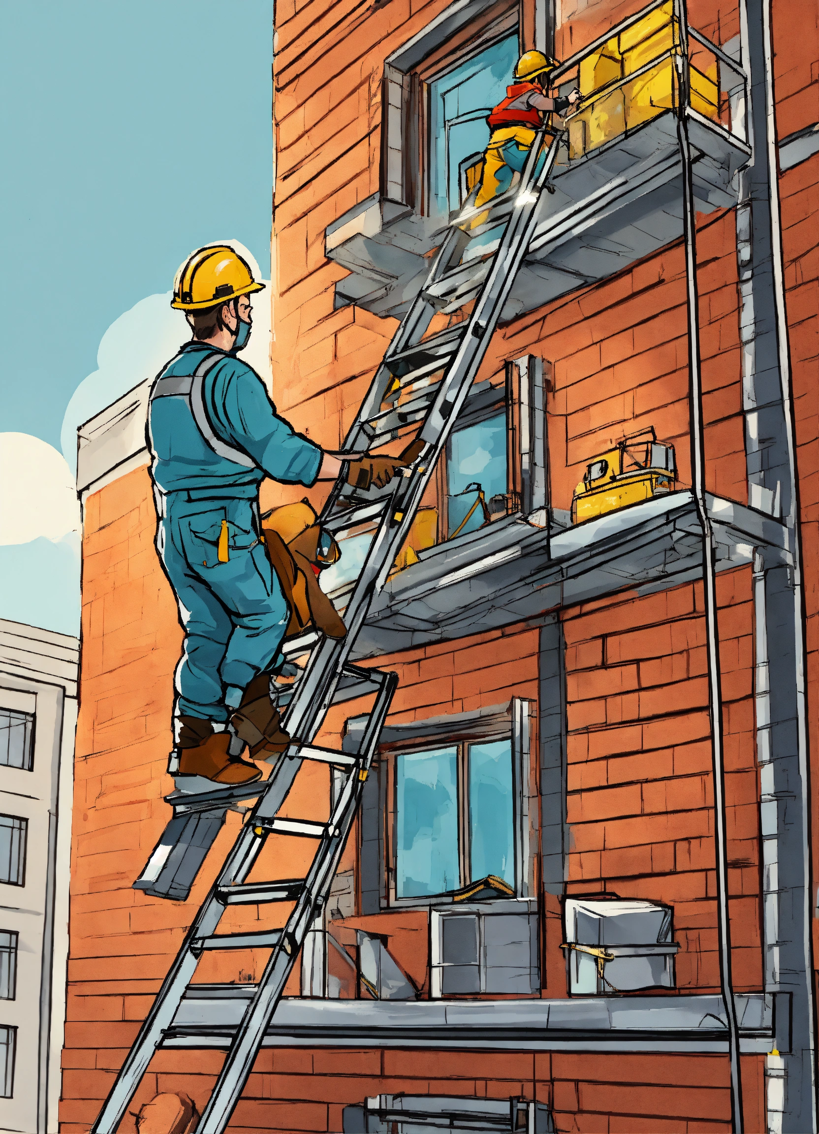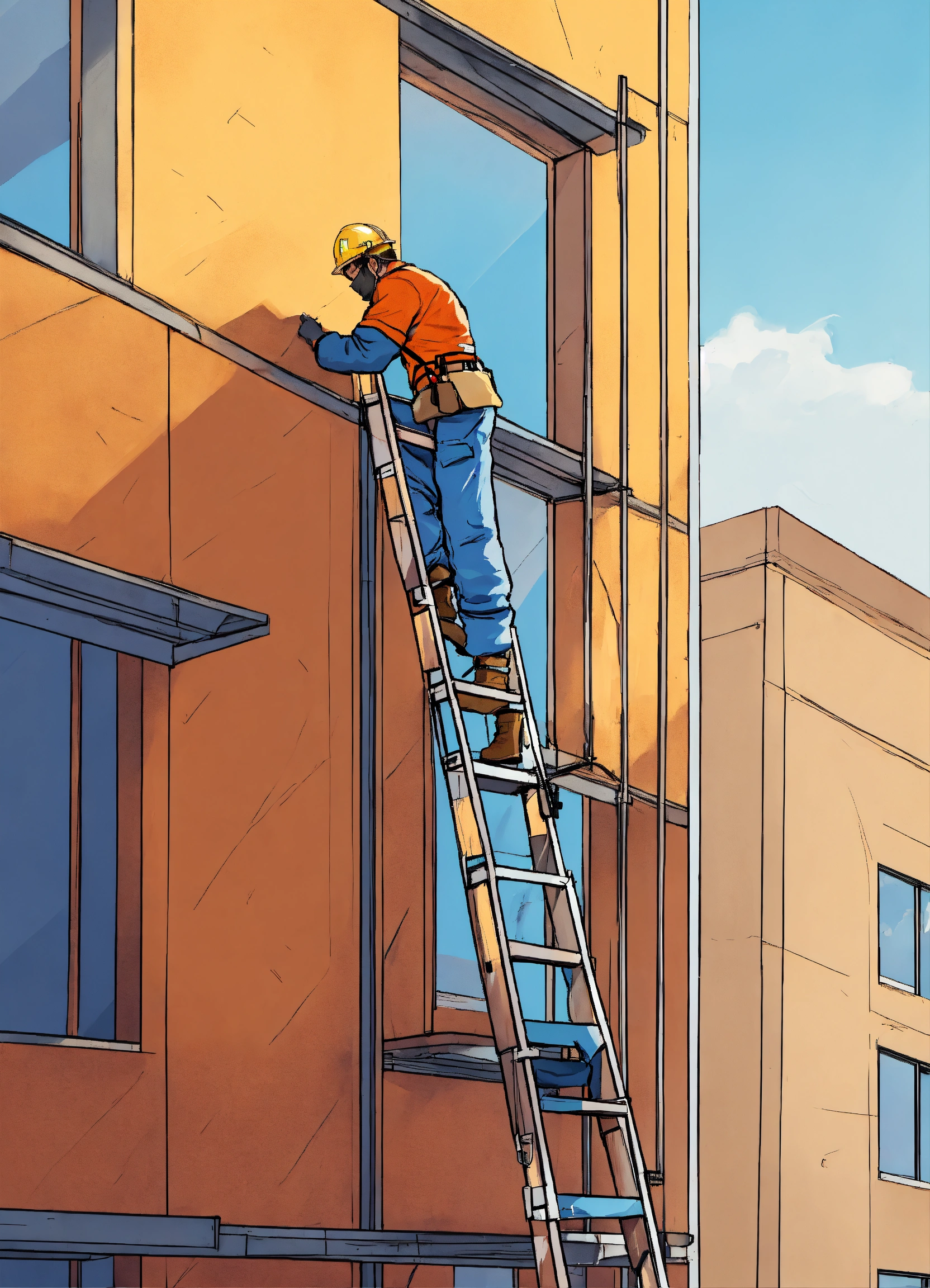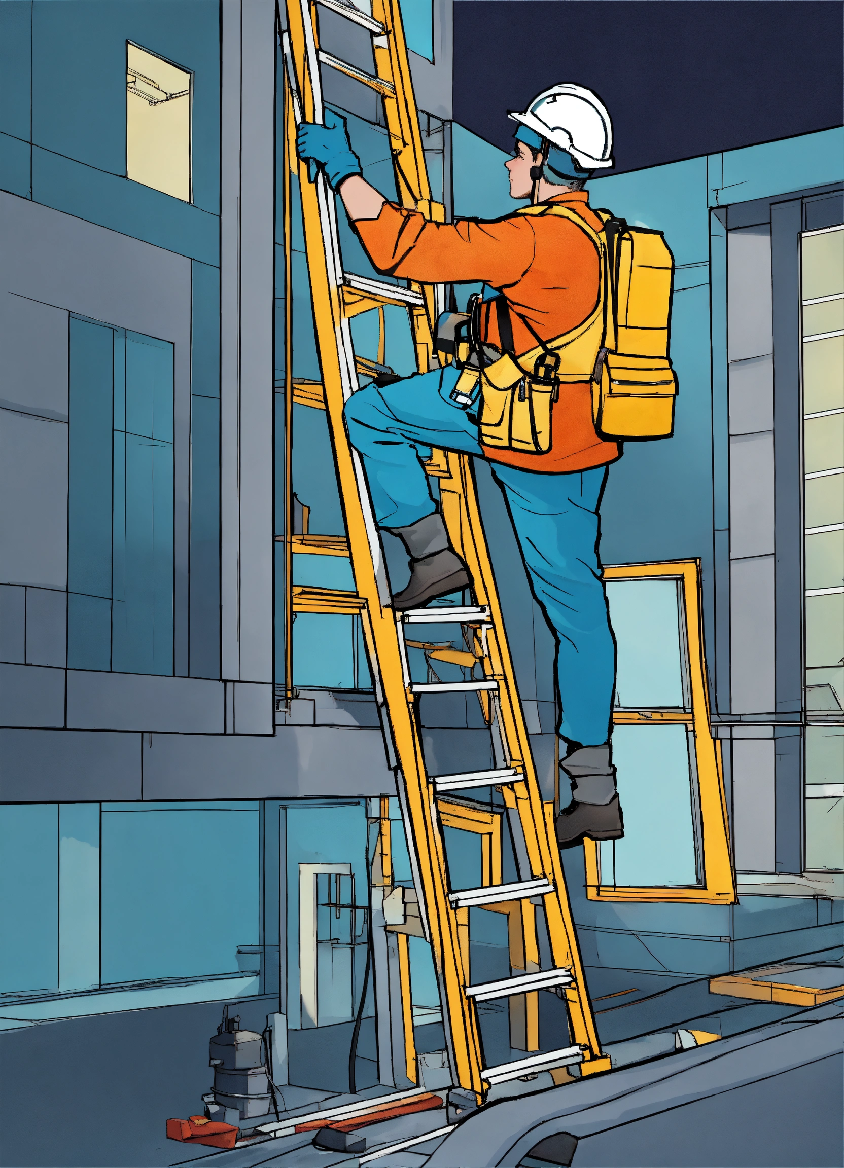 Construction worker climbing on a-type ladder, with complete ppe, inside the building, a-type ladder, cartoonized