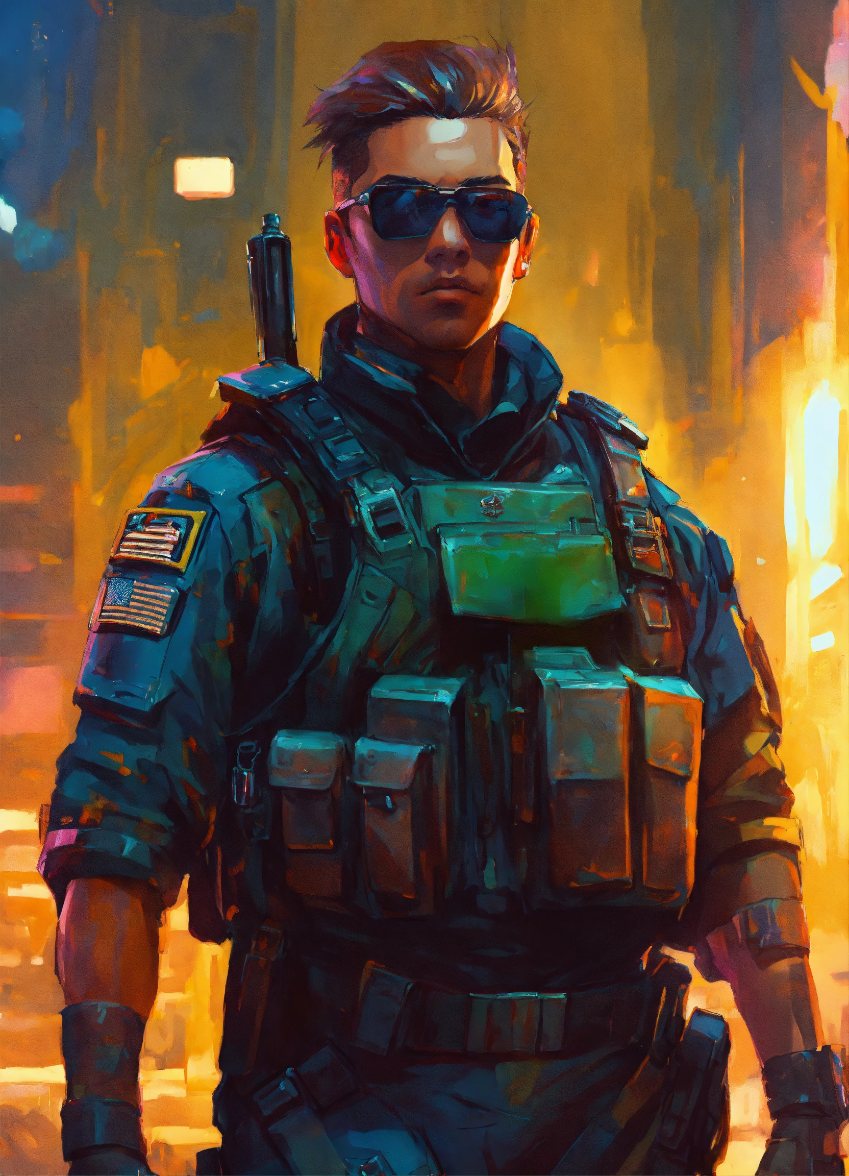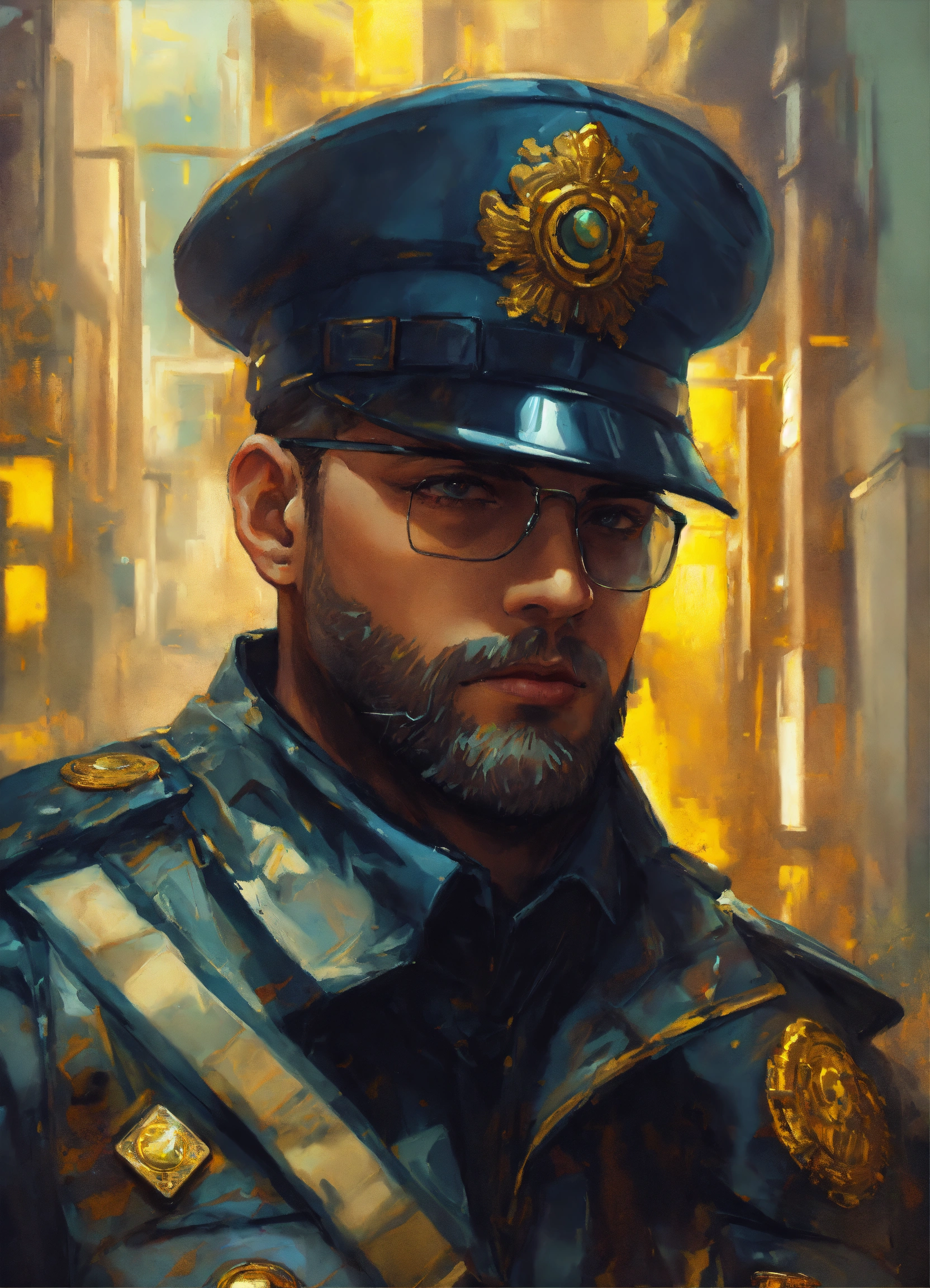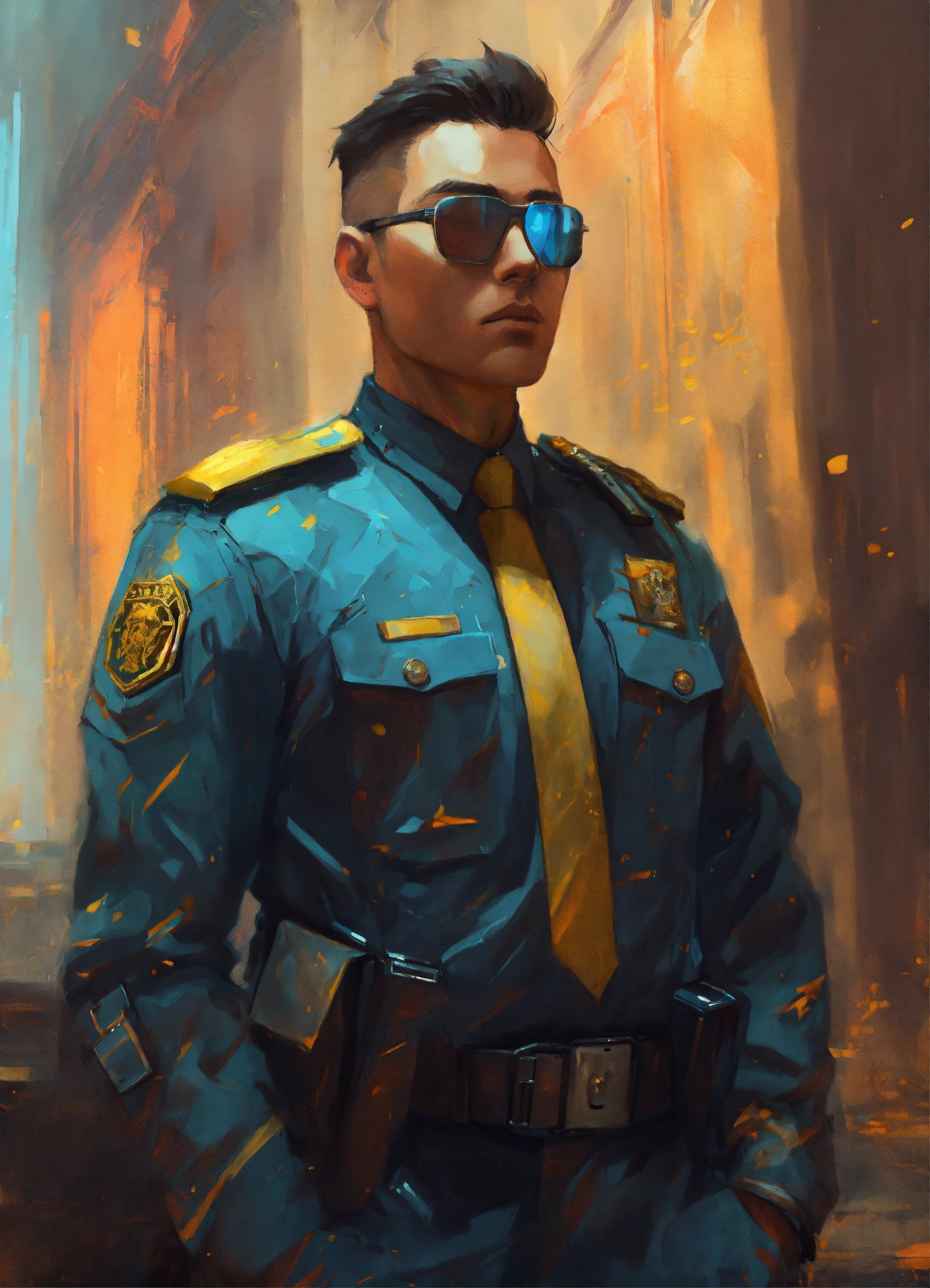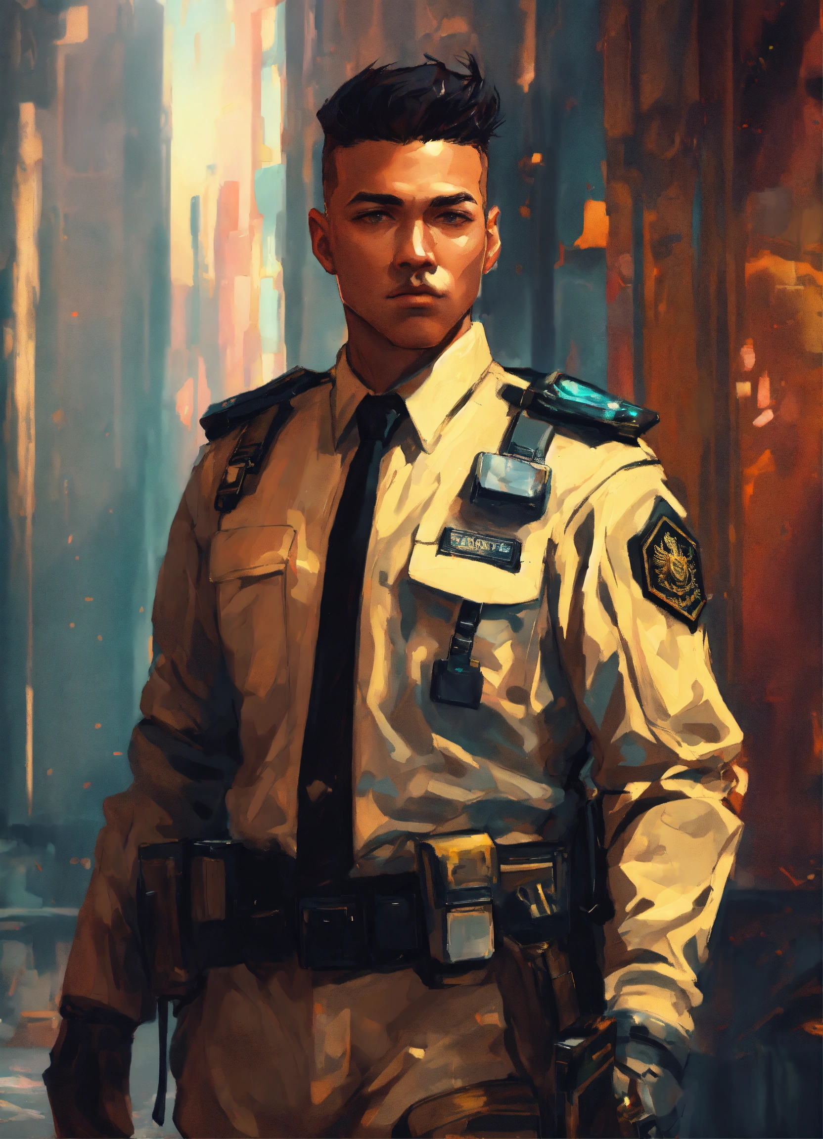 Cyberpunk security officer in a guard uniform, fancy office, with lots of marble stone gritty oil paining art style