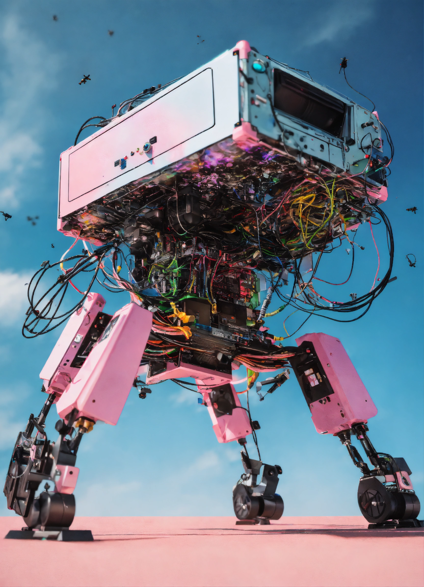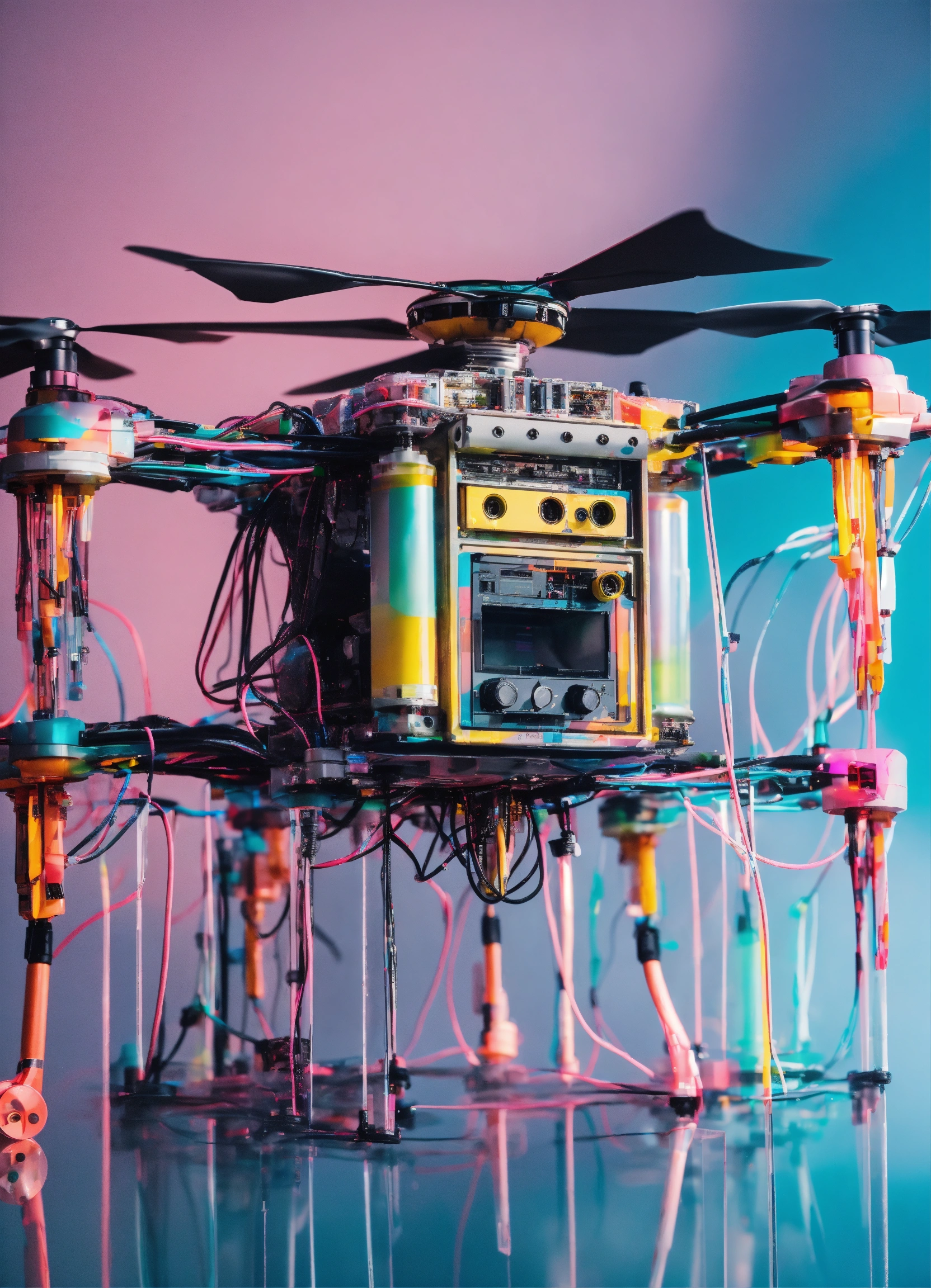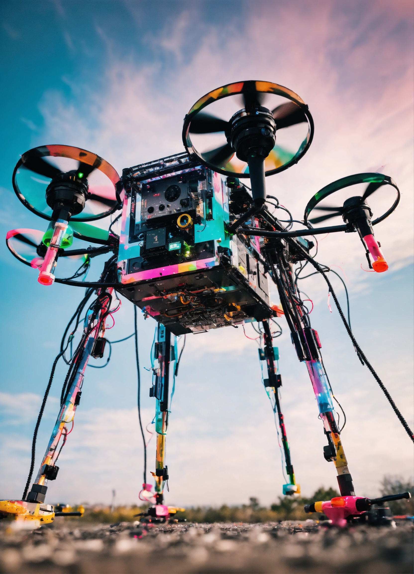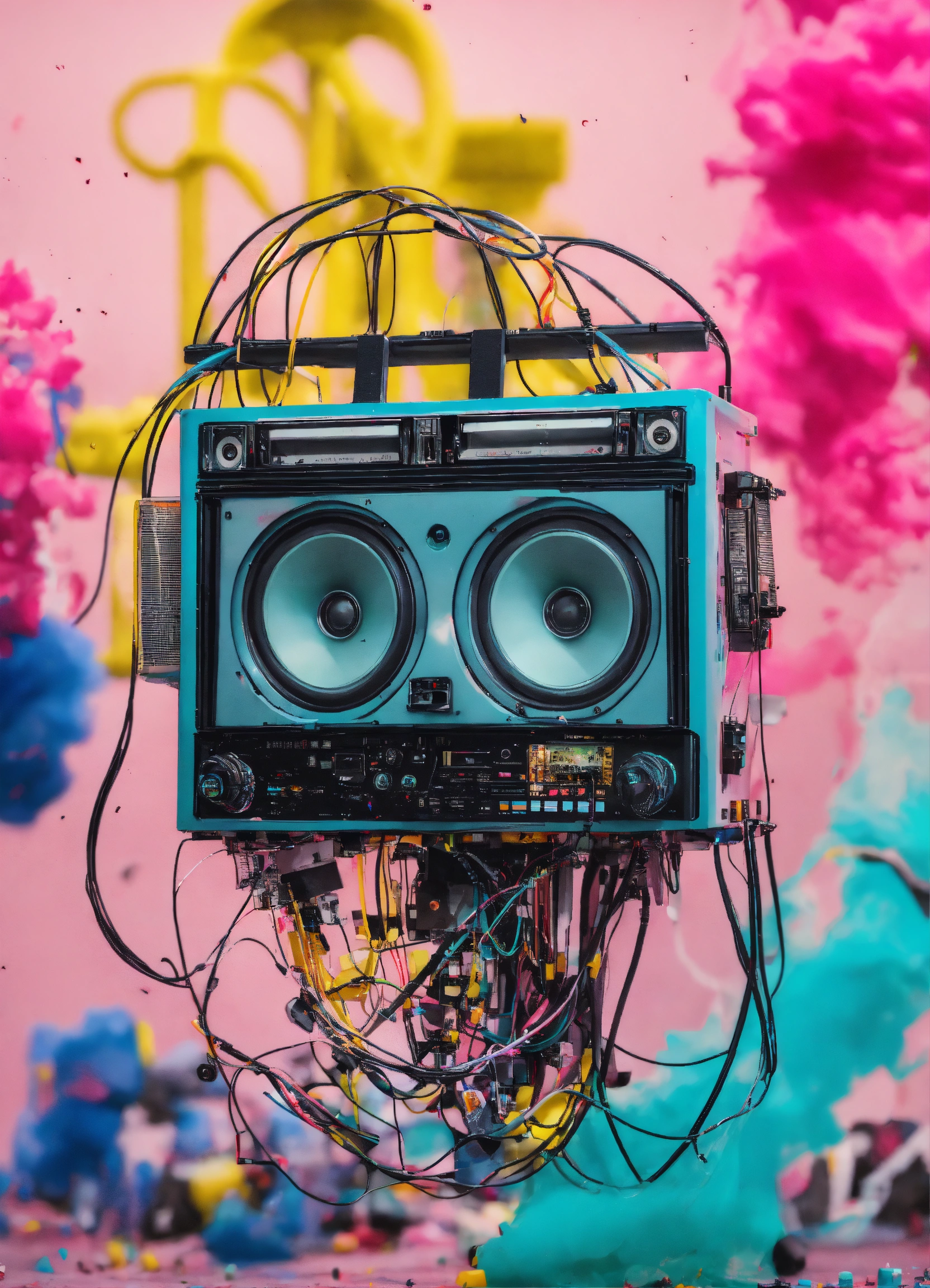 Pastel colors low-angle view shot photography of a emerged from spiral black ink splatters, flying huge 3d plexiglass multi cassette ghetto blaster army drone robot body, full of cables and wires, with big boomers, 80 degree view