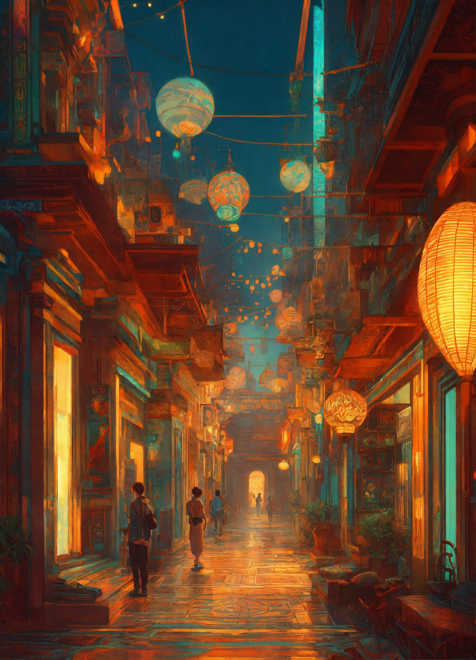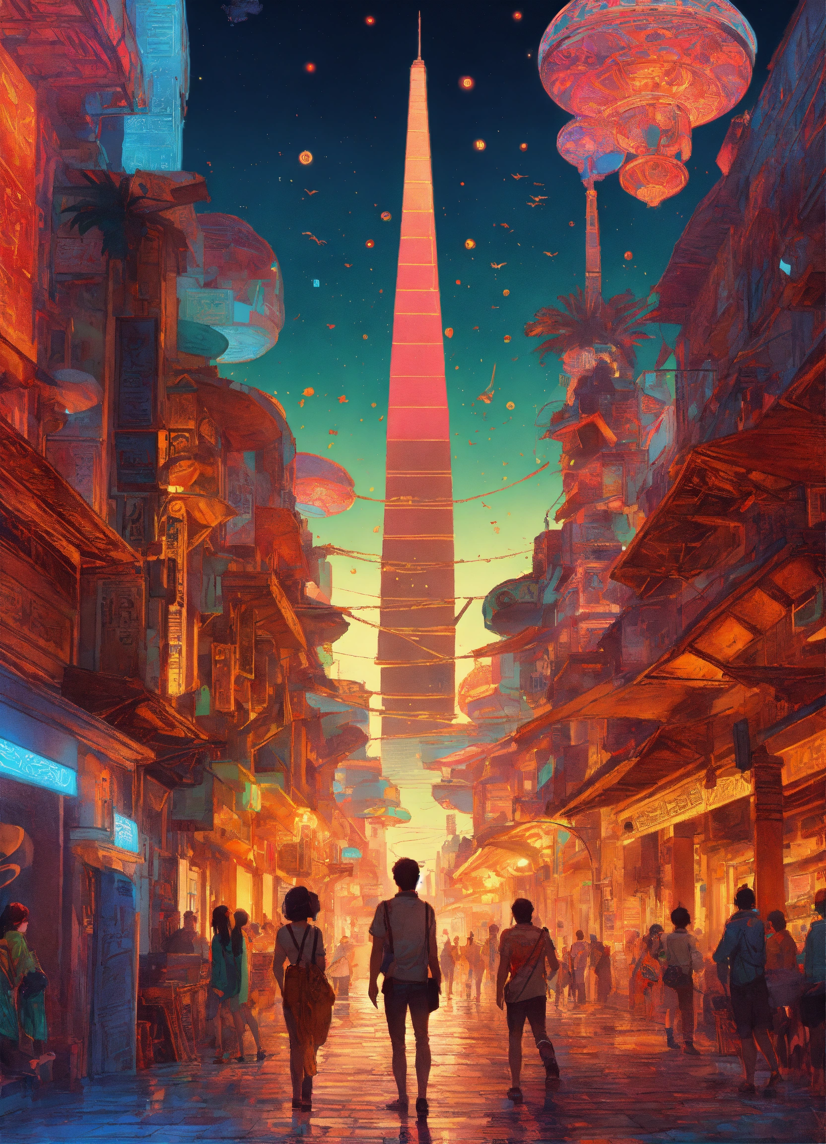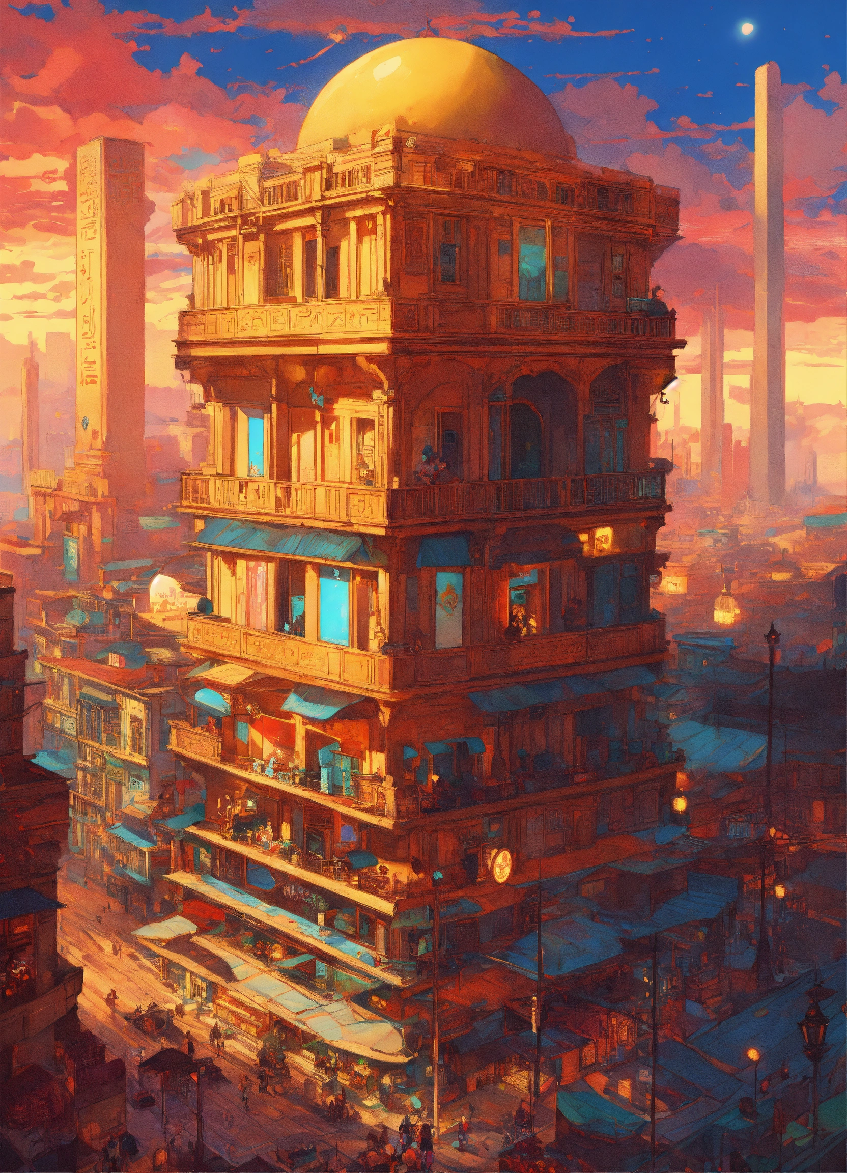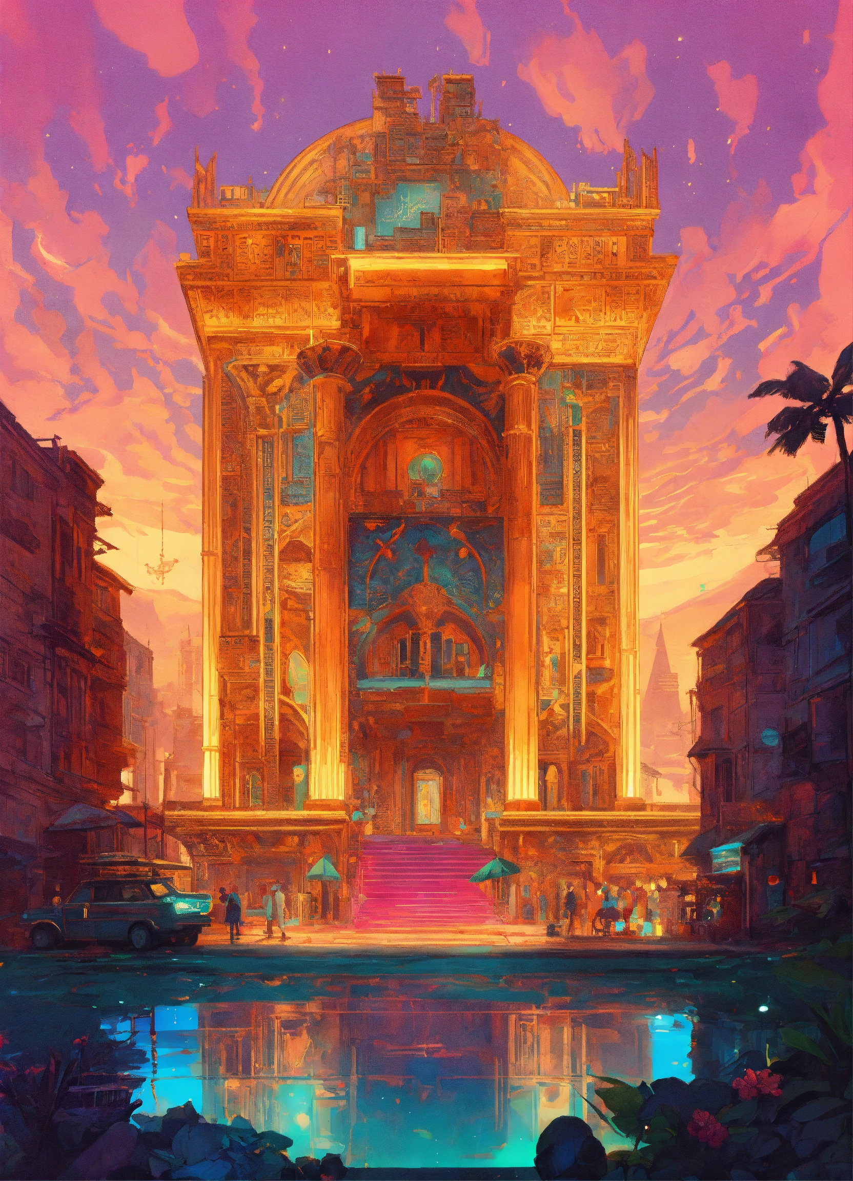 Fantasy city, egyptian architecture, gold, ernst haeckel maria sibylla merian. tristan eaton, victo ngai, artgerm, rhads, ross draws, kaethe butcher, hajime sorayama, greg tocchini, virgil finlay, fantasy, colors, neon lights, digital painting, pixiv, by ilya kuvshinov, neon lights, 3d, perspective