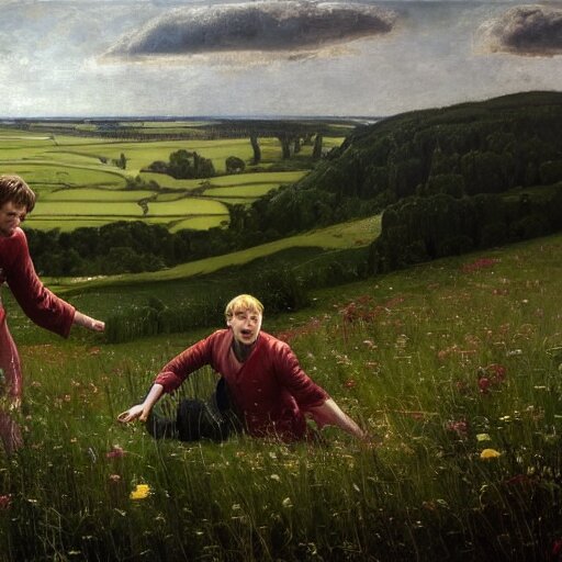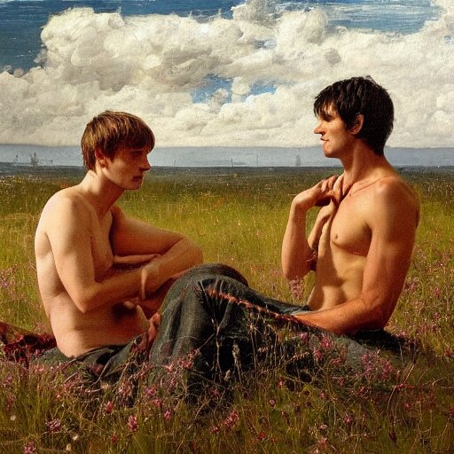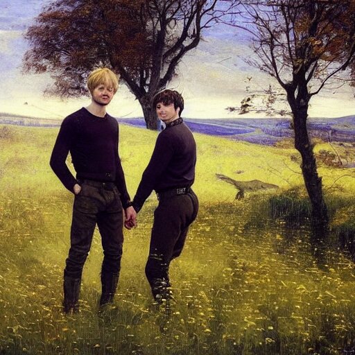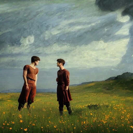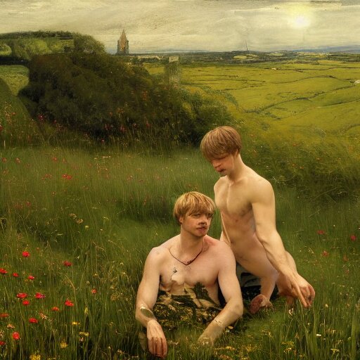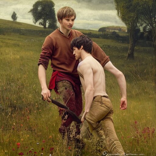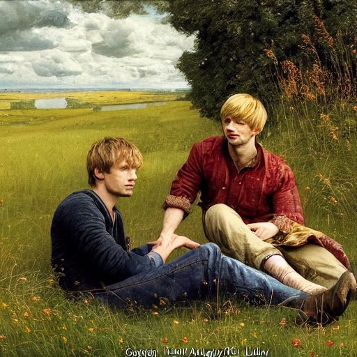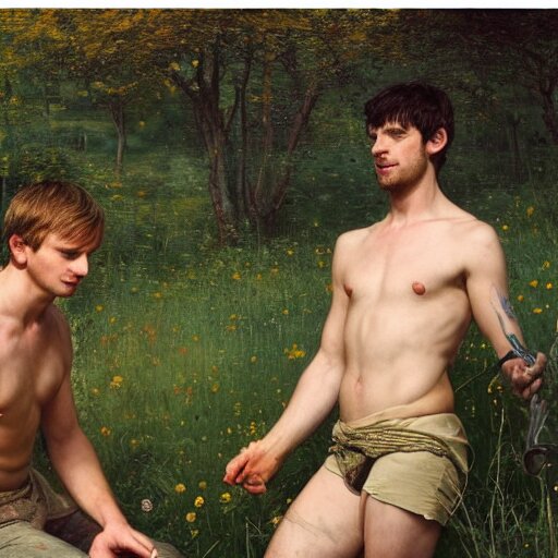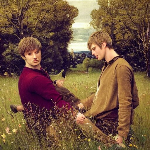 Bradley james and colin morgan are in a beautiful meadow, happy. gay male couple. from the television show merlin ( 2 0 0 8 ). ; high - detailed oil painting by igor sychev, ilya repin, caravaggio, william blake, alex grey, thomas eakins and beksinski trending on artstation, masterpiece, 4 k