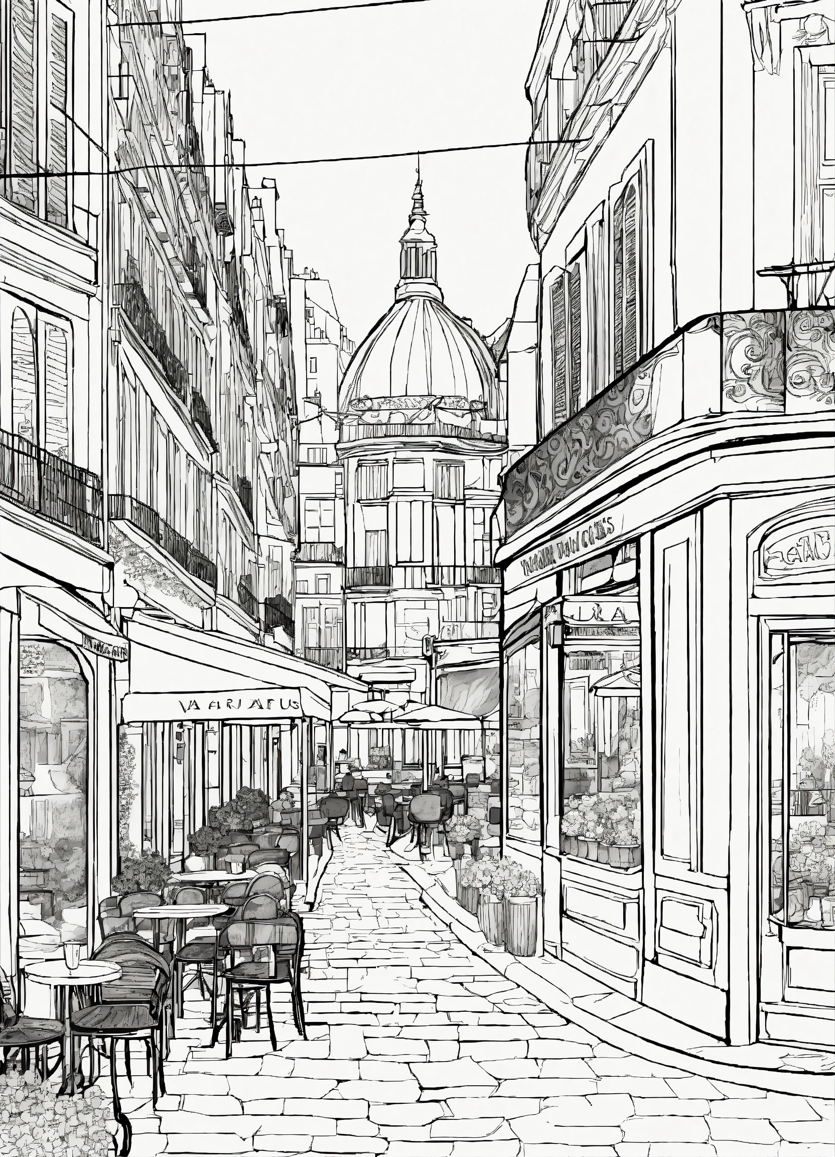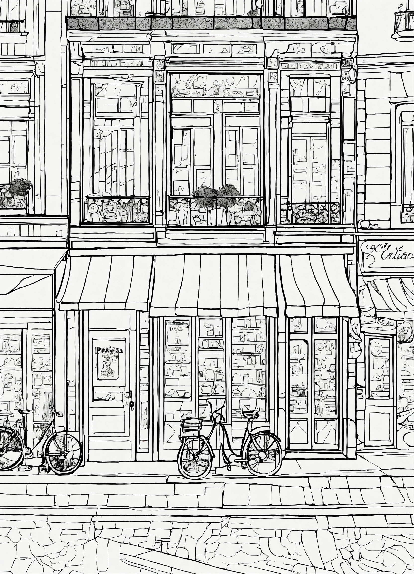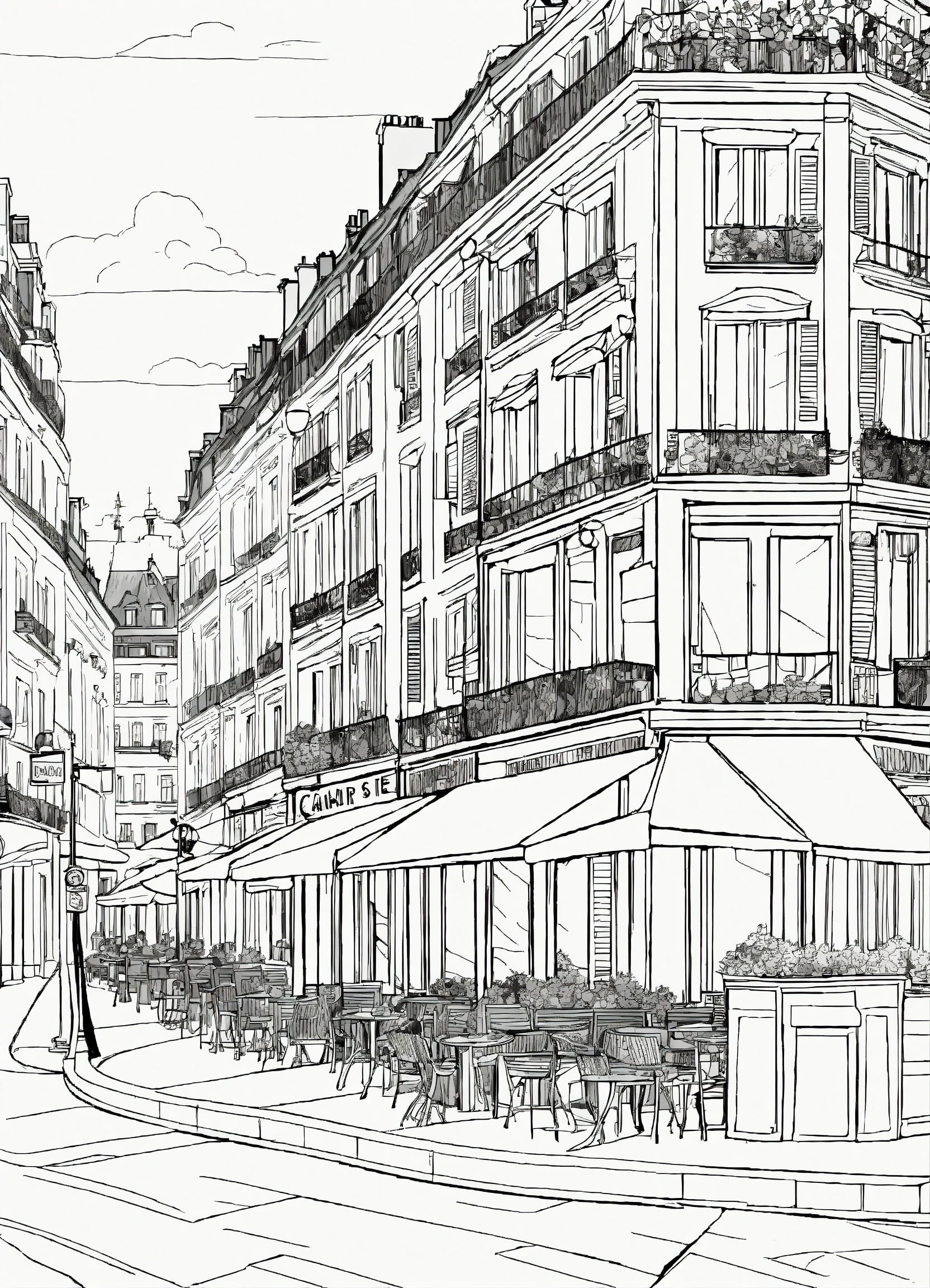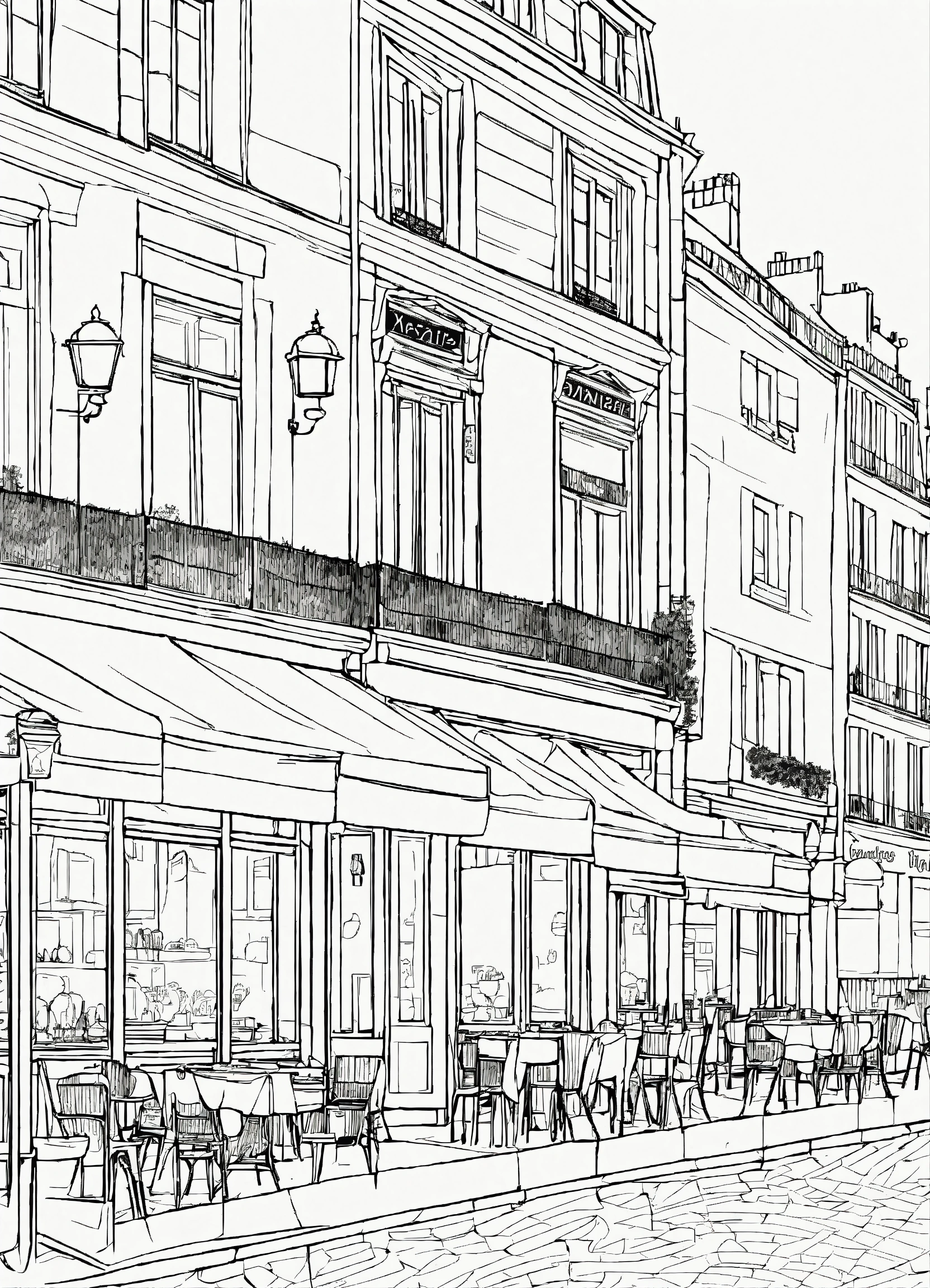 A coloring page of paris street scene, cafés, (masterpiece), (coloring page), line art drawing, minimalist, graphic, (line art), vector graphics, clear and distinct lines, intricate patterns, varied line weights, smooth curves, bold outlines, crisp shapes, inspired by van gogh