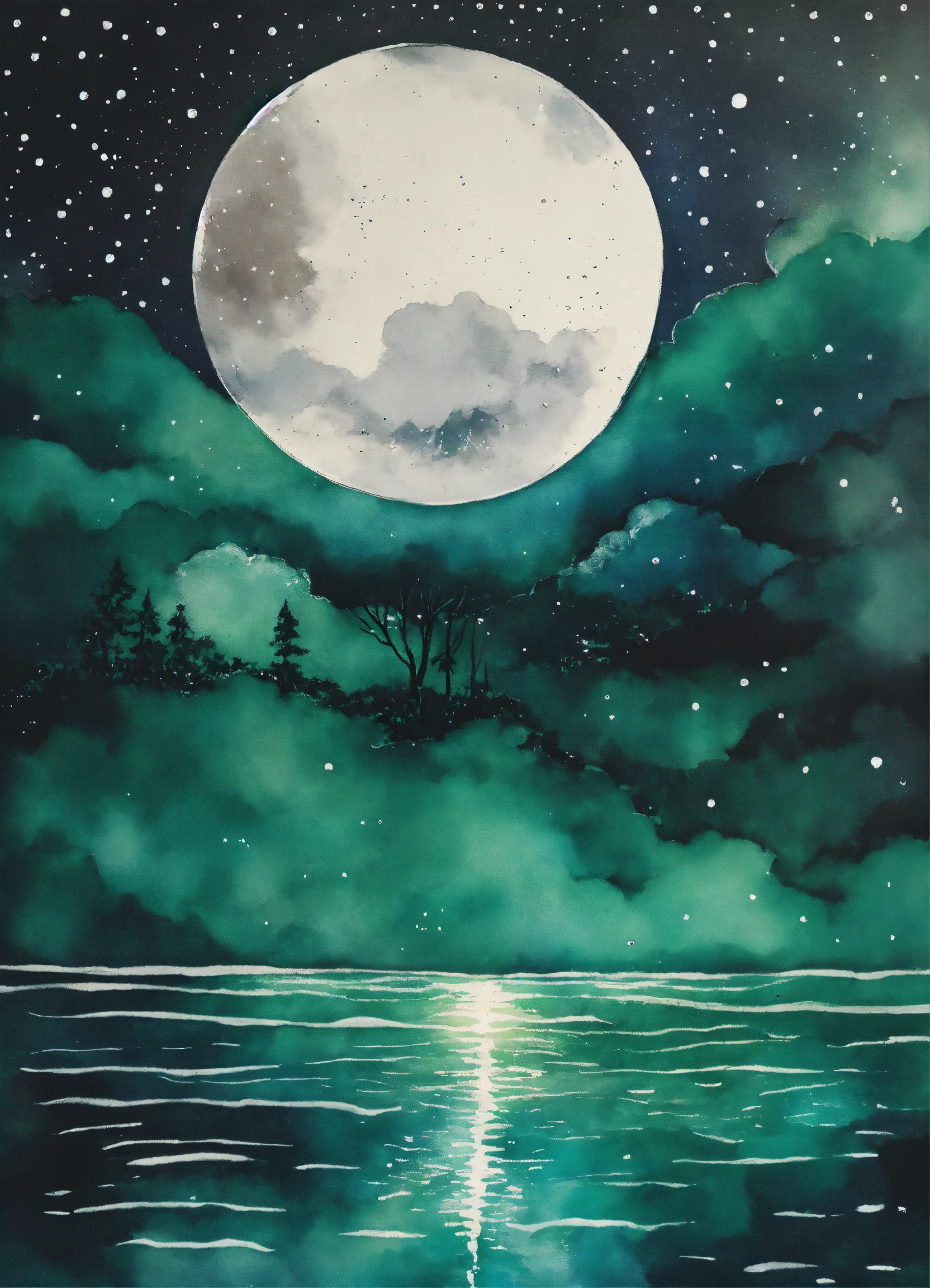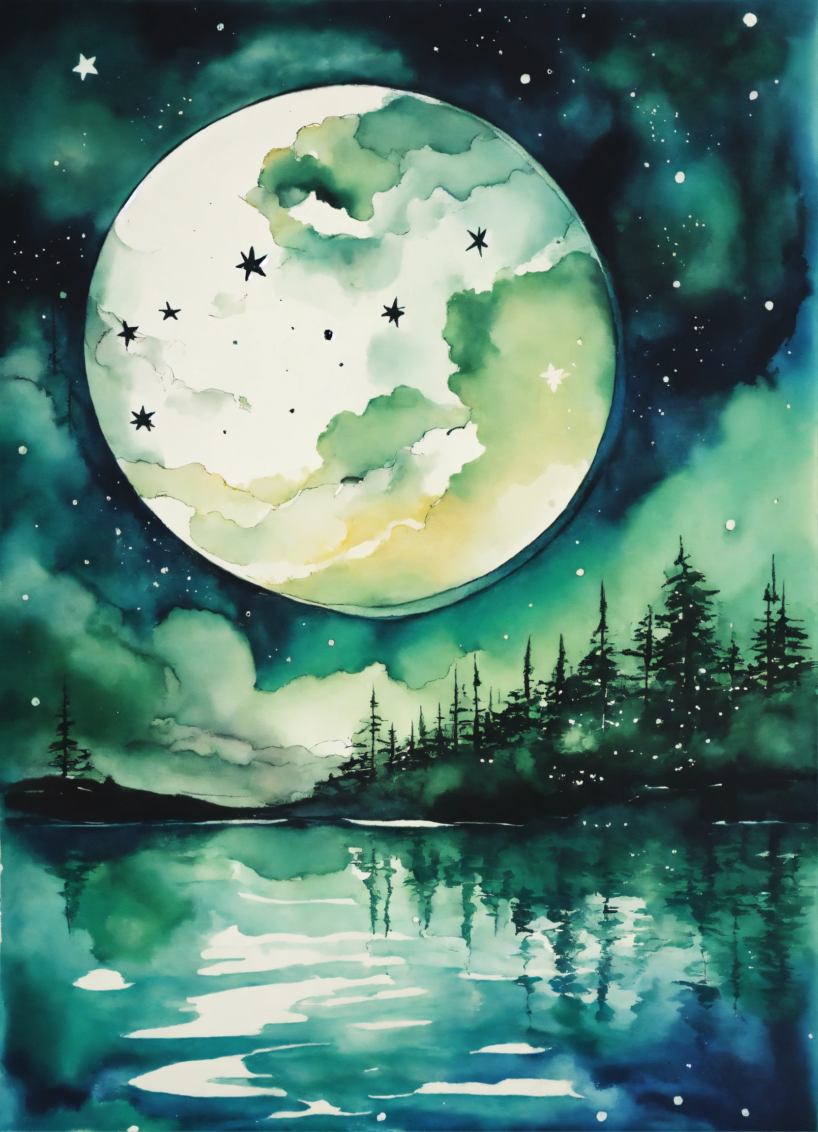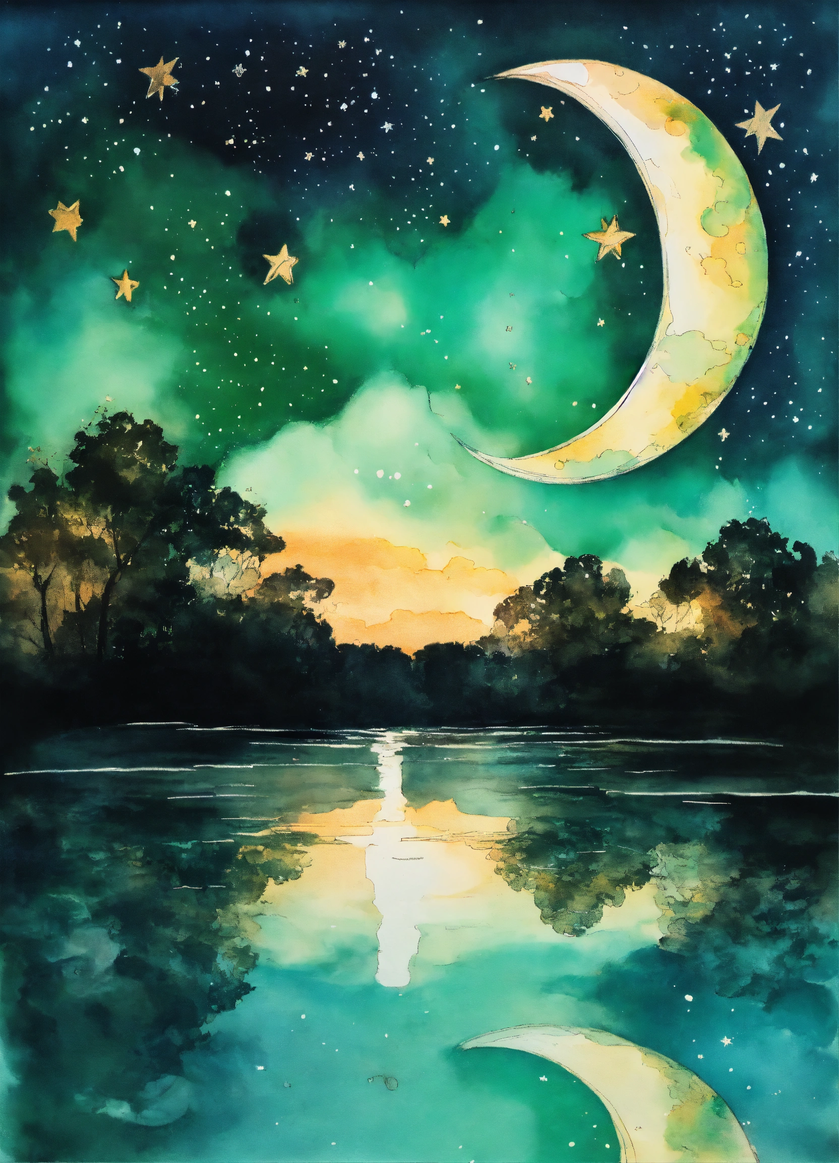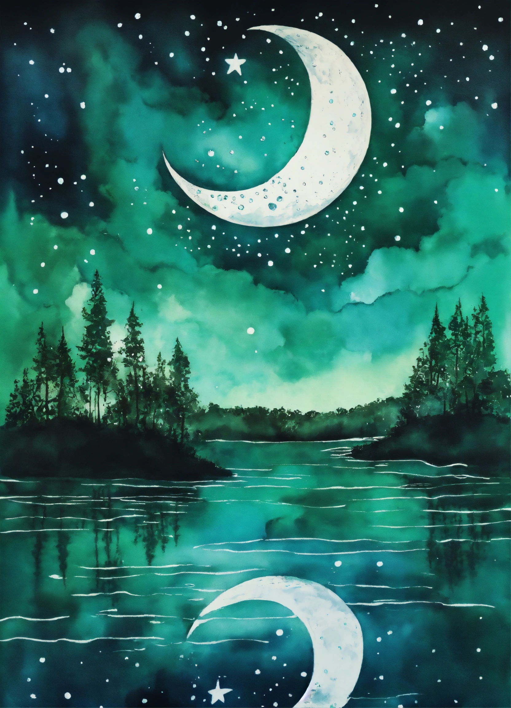 Ink drawing floating clouds, twinkling stars at night, crescent moon, reflection of a transparent spiritual face in water, feeling of deep love, spirit and soul, hues of emerald and silver