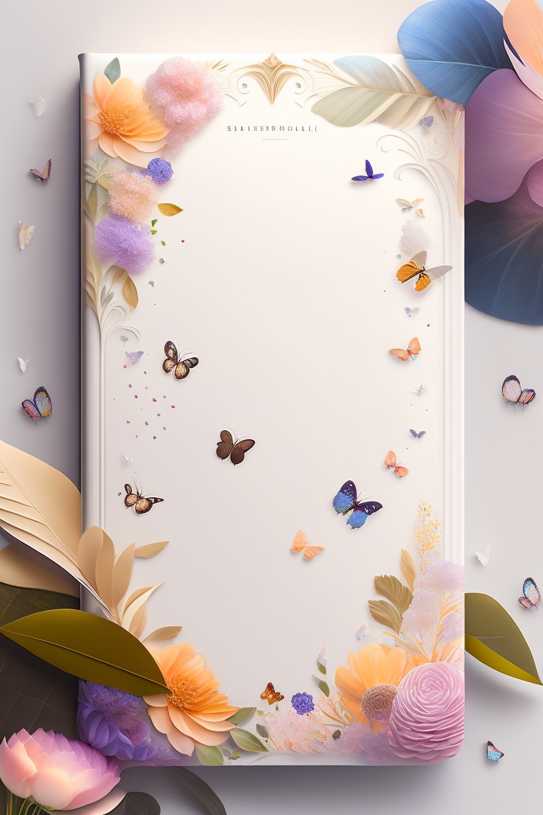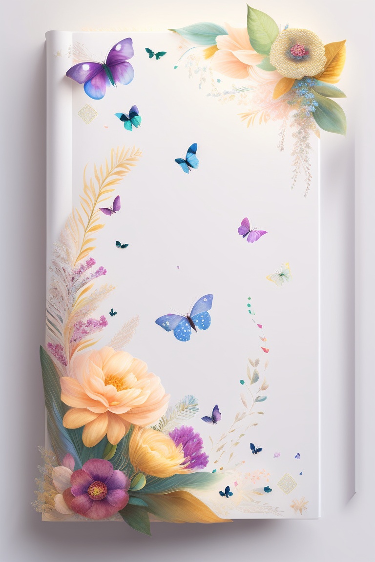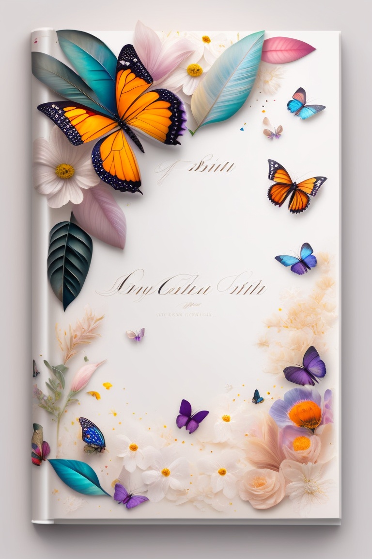 Beautiful cover page on a white background with butterflies, feathers, flowers, and stars scatter across the page, creating a sense of movement and magic.