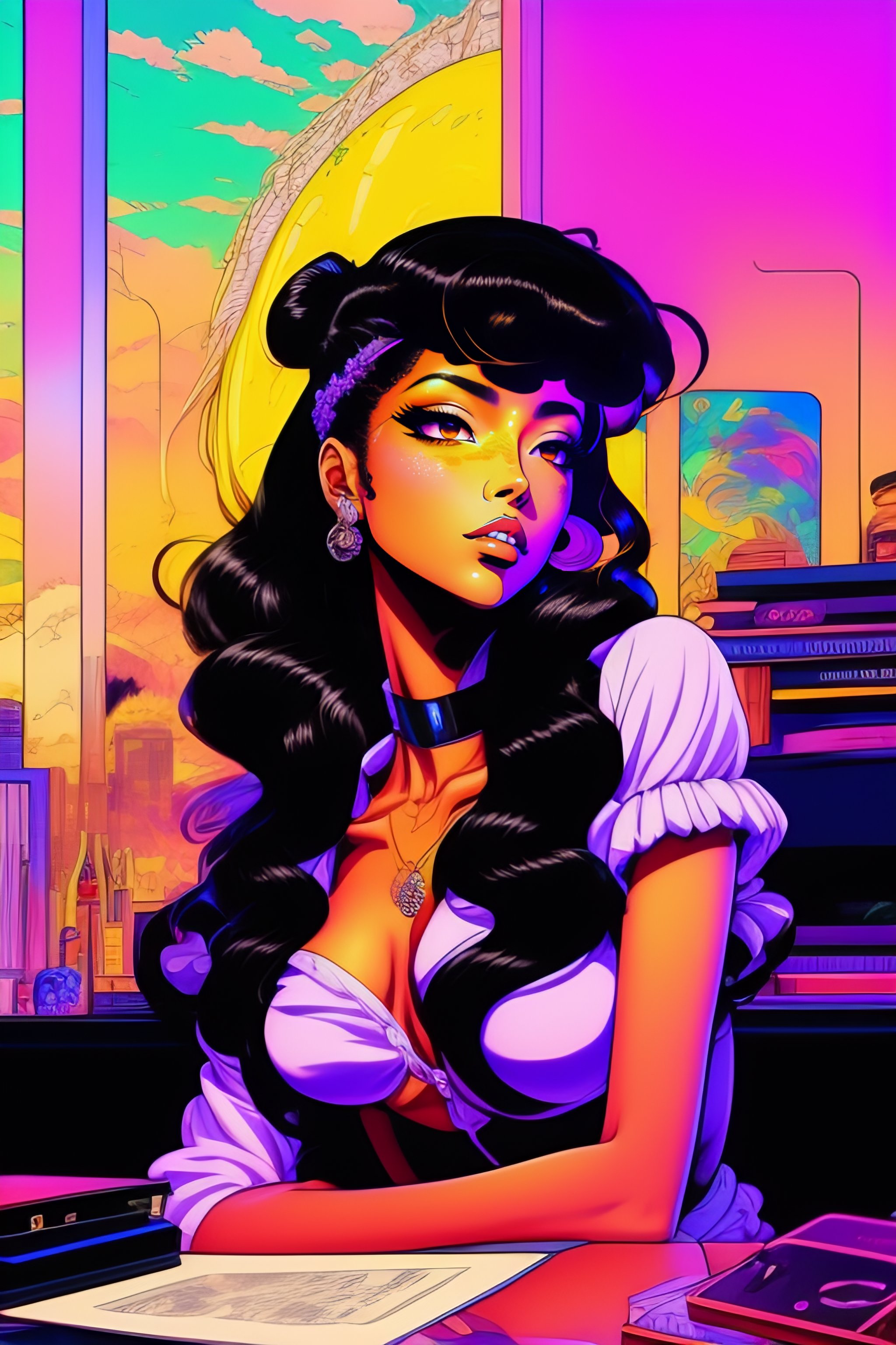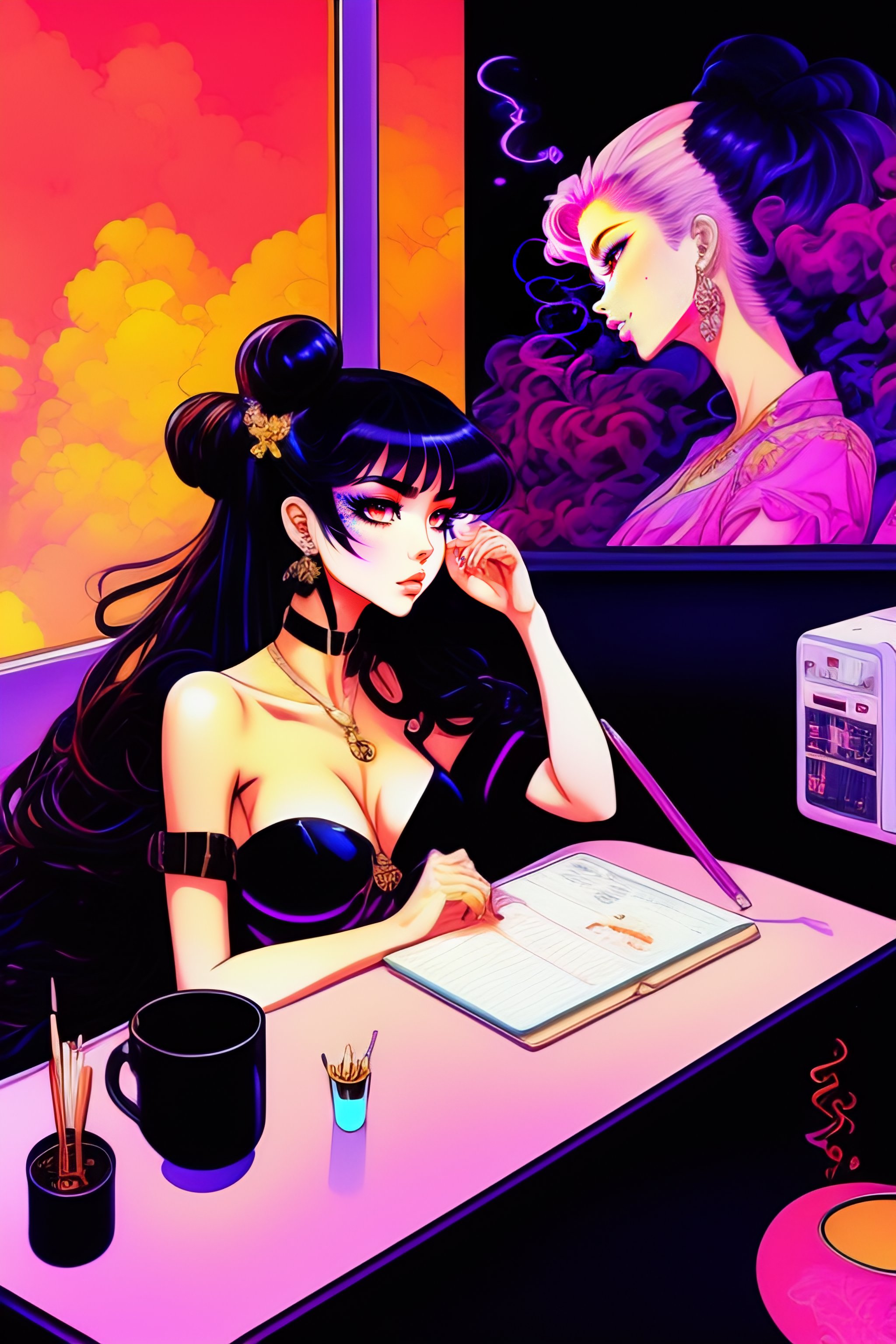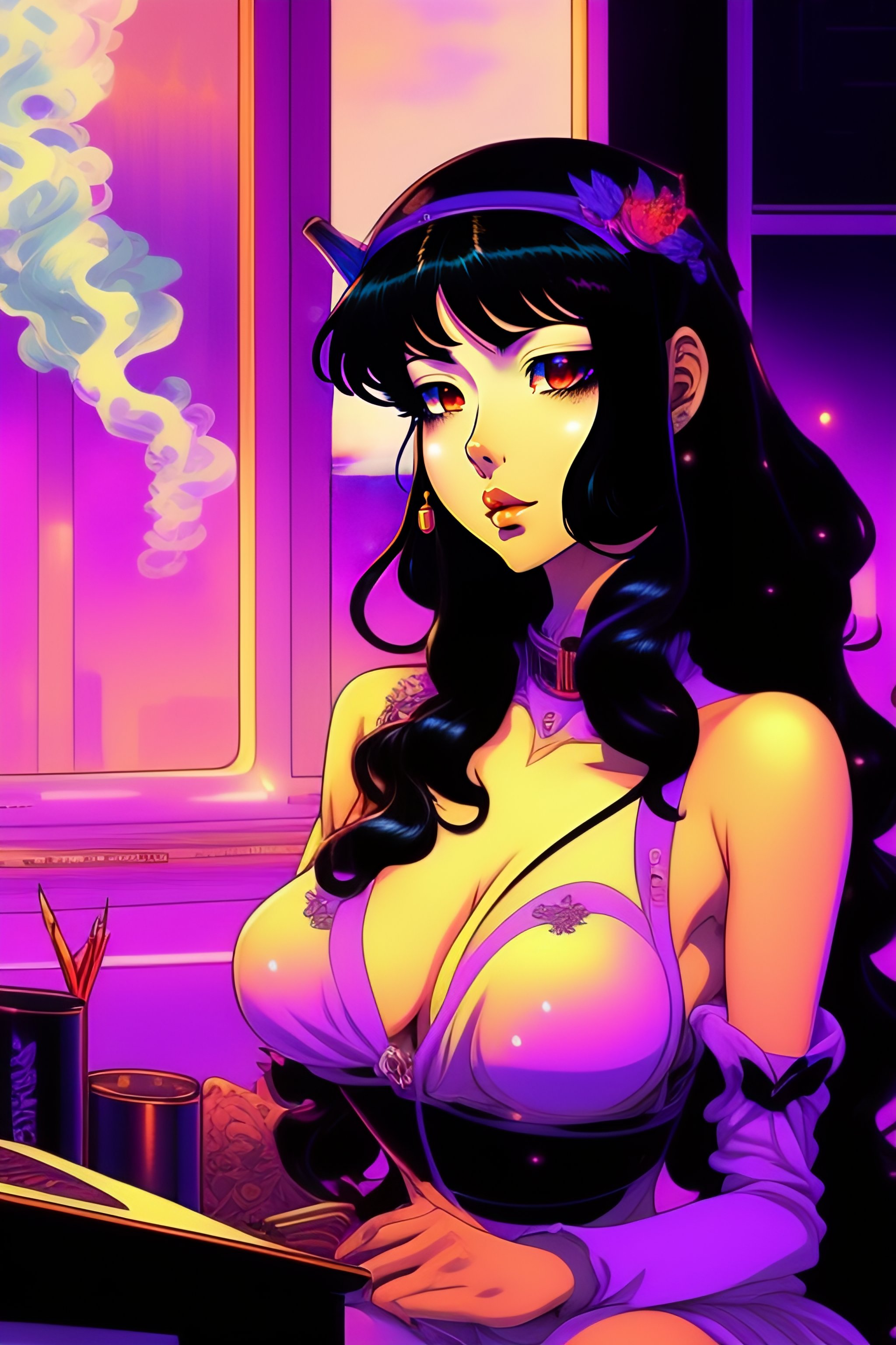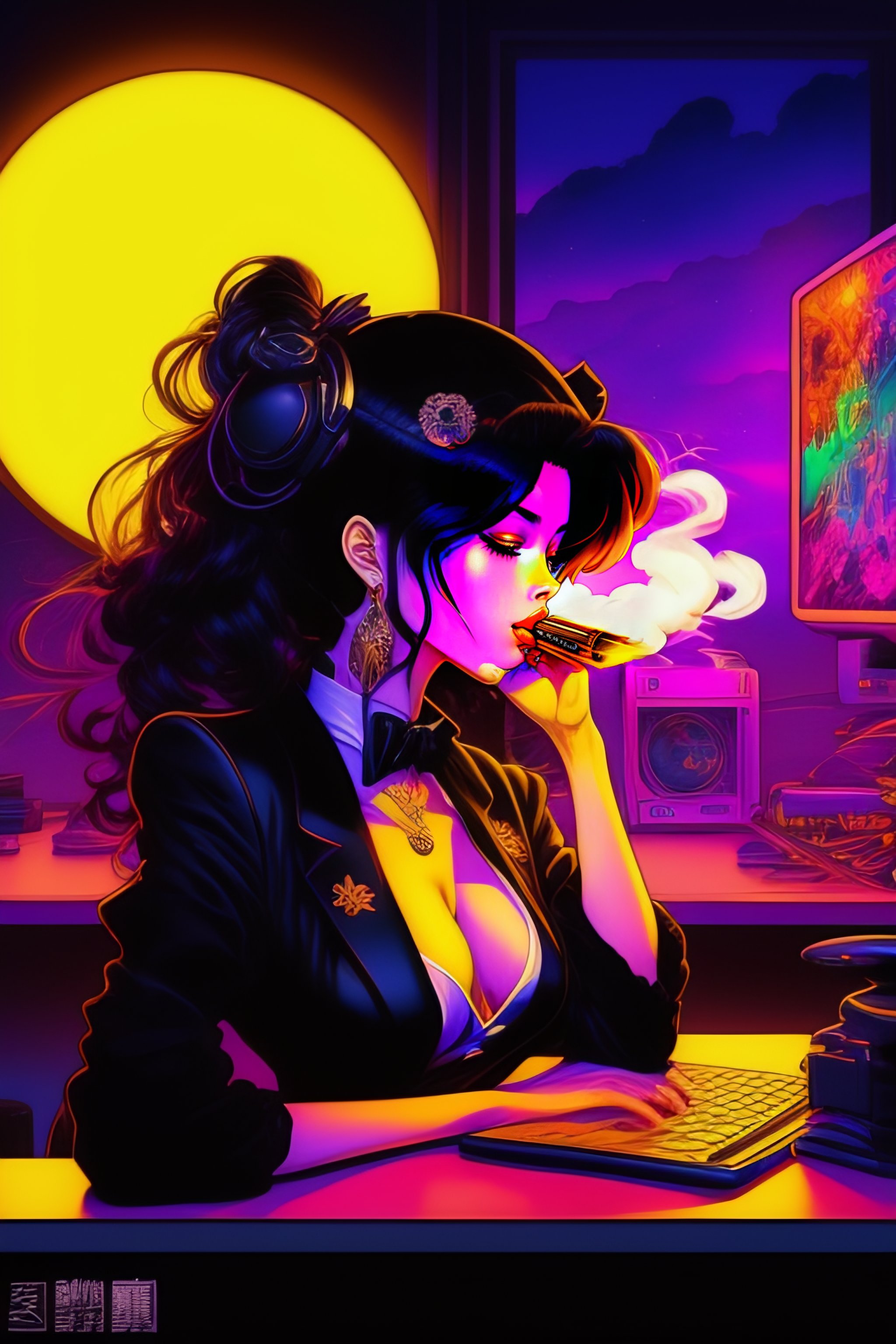 Vintage 90's anime style. beautiful black model smoking weed at her desk; by kaethe butcher, hajime sorayama, greg tocchini, virgil finlay, sci-fi, colors, neon lights