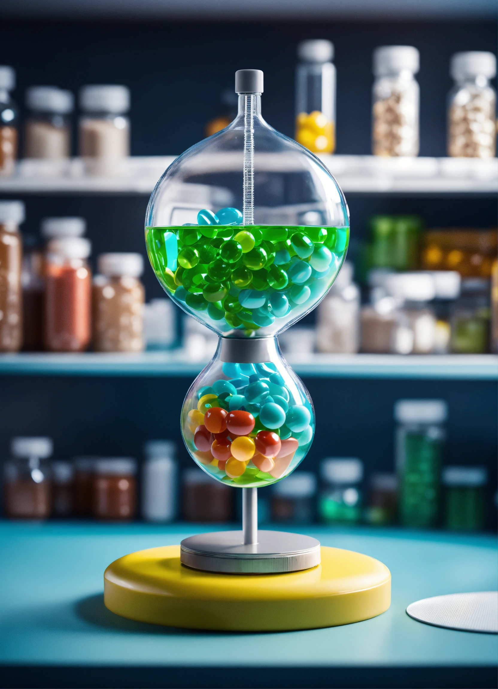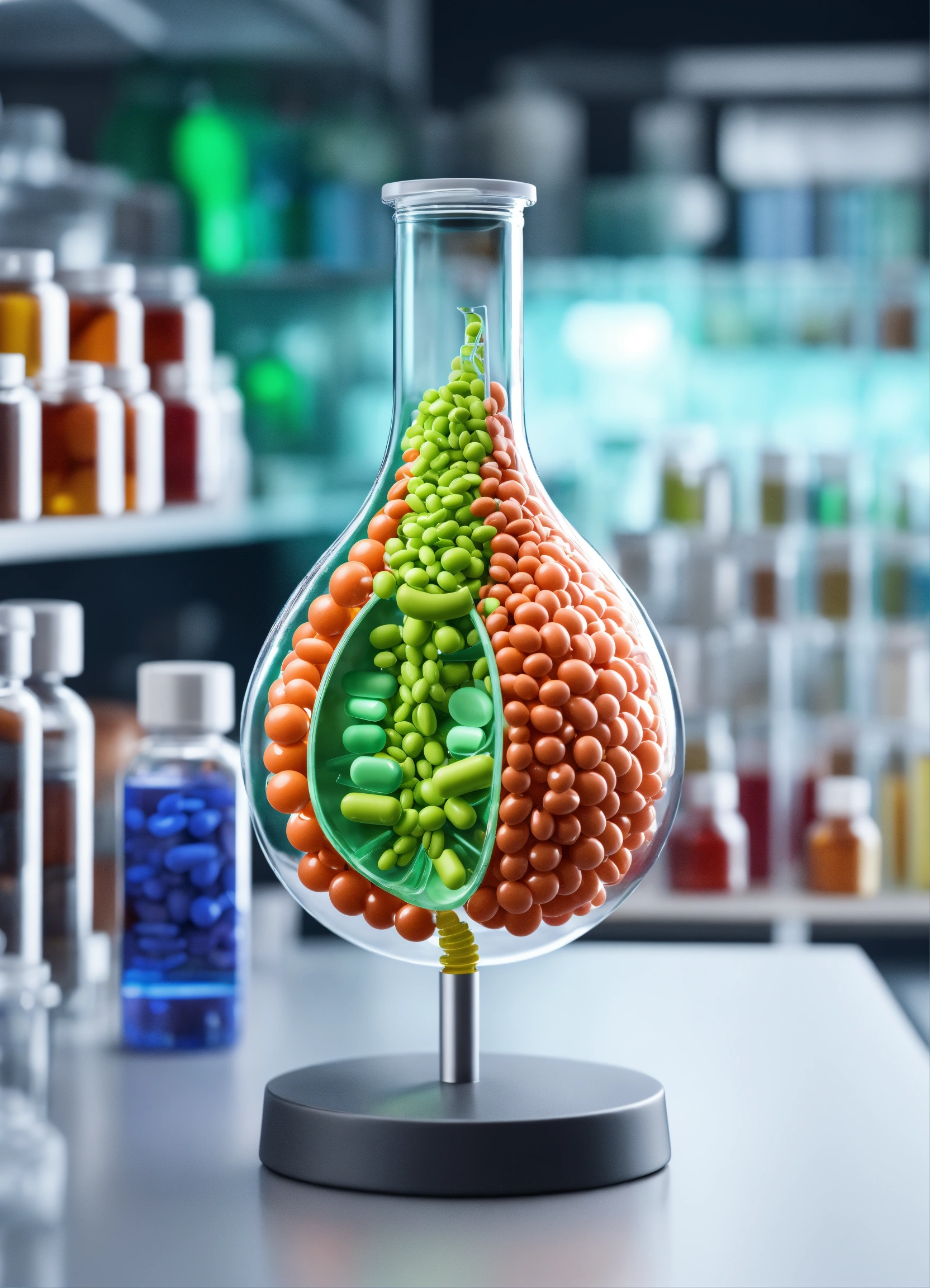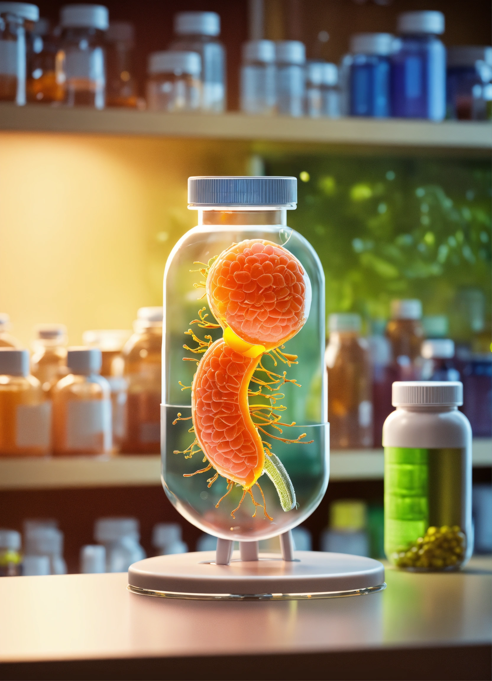 Plastic 3d model of human gallbladder on a stand, on the background of laboratory and medical jars with vitamins and capsules, real clear and bright photo