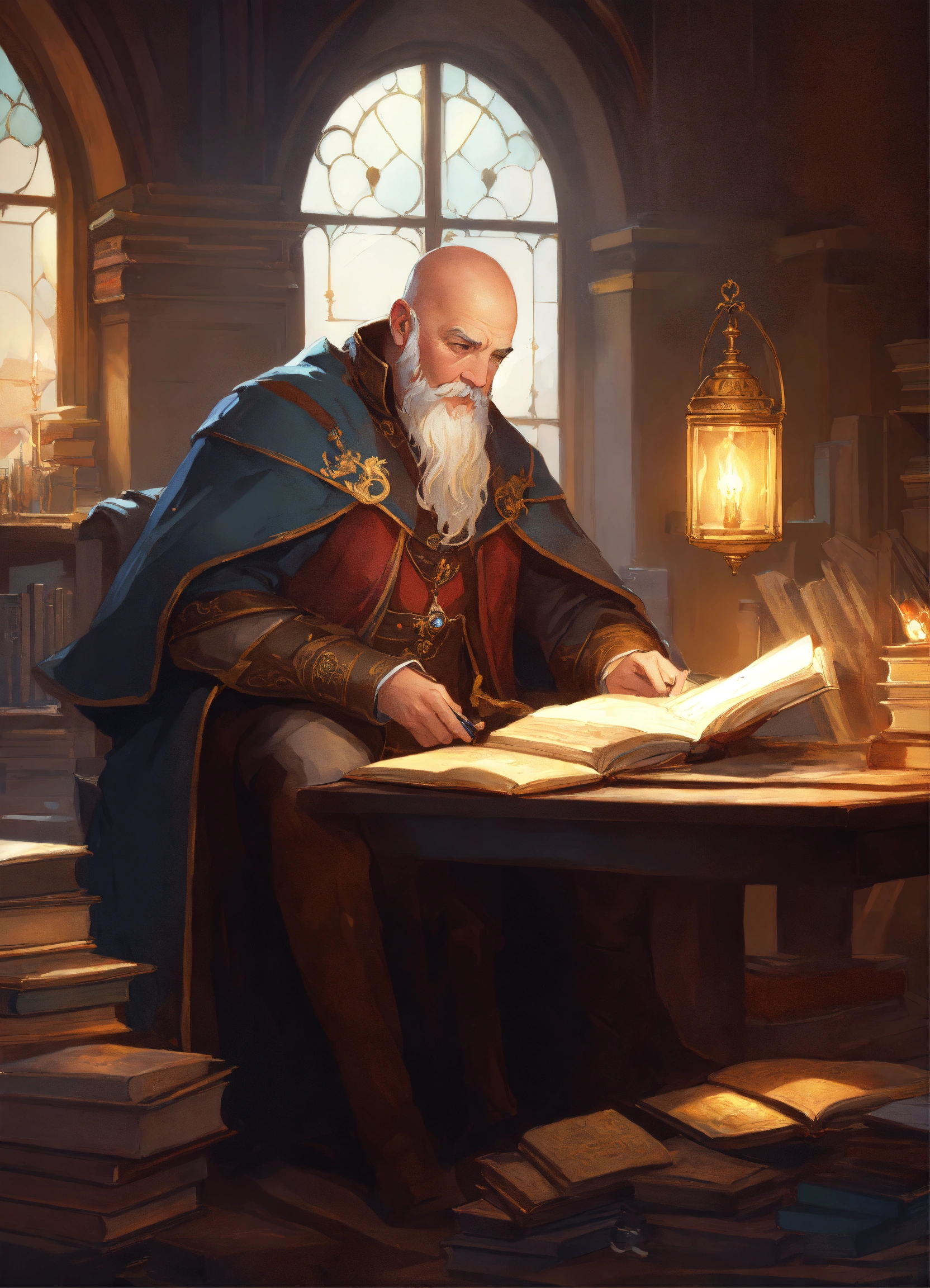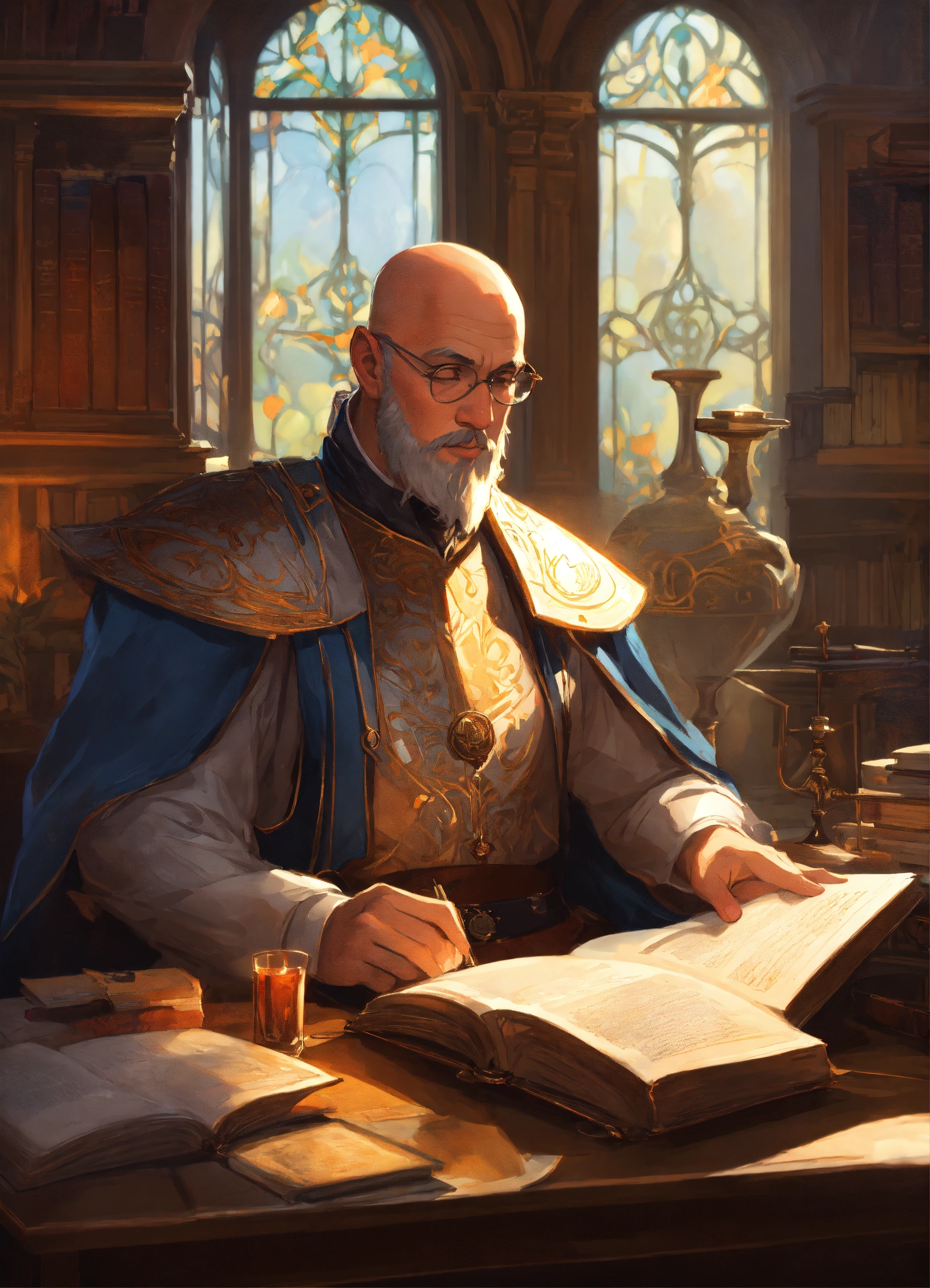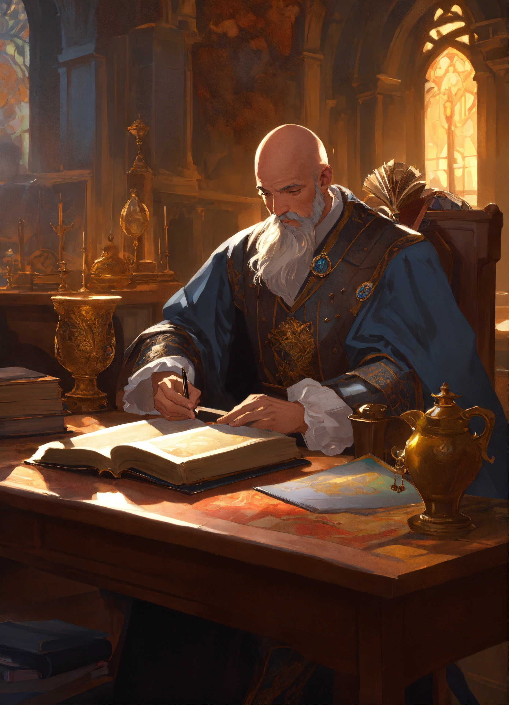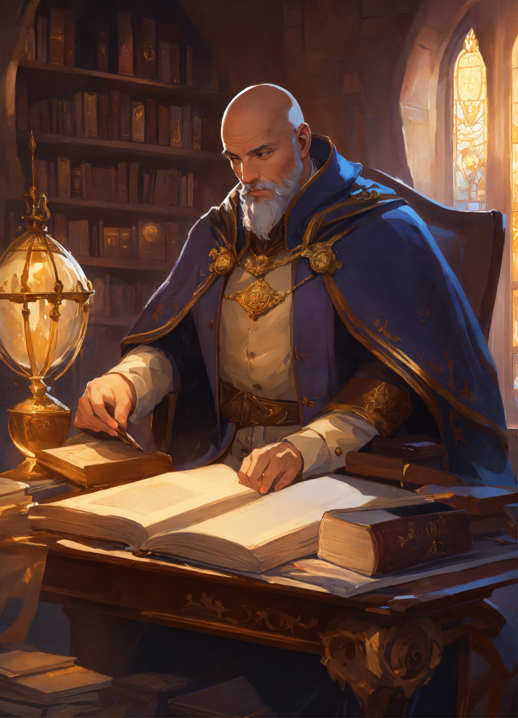 Male noble chancellor bald medieval reading books in his desk, art by artgerm and greg rutkowski and alphonse mucha and loish and wlop, artstation, illustration