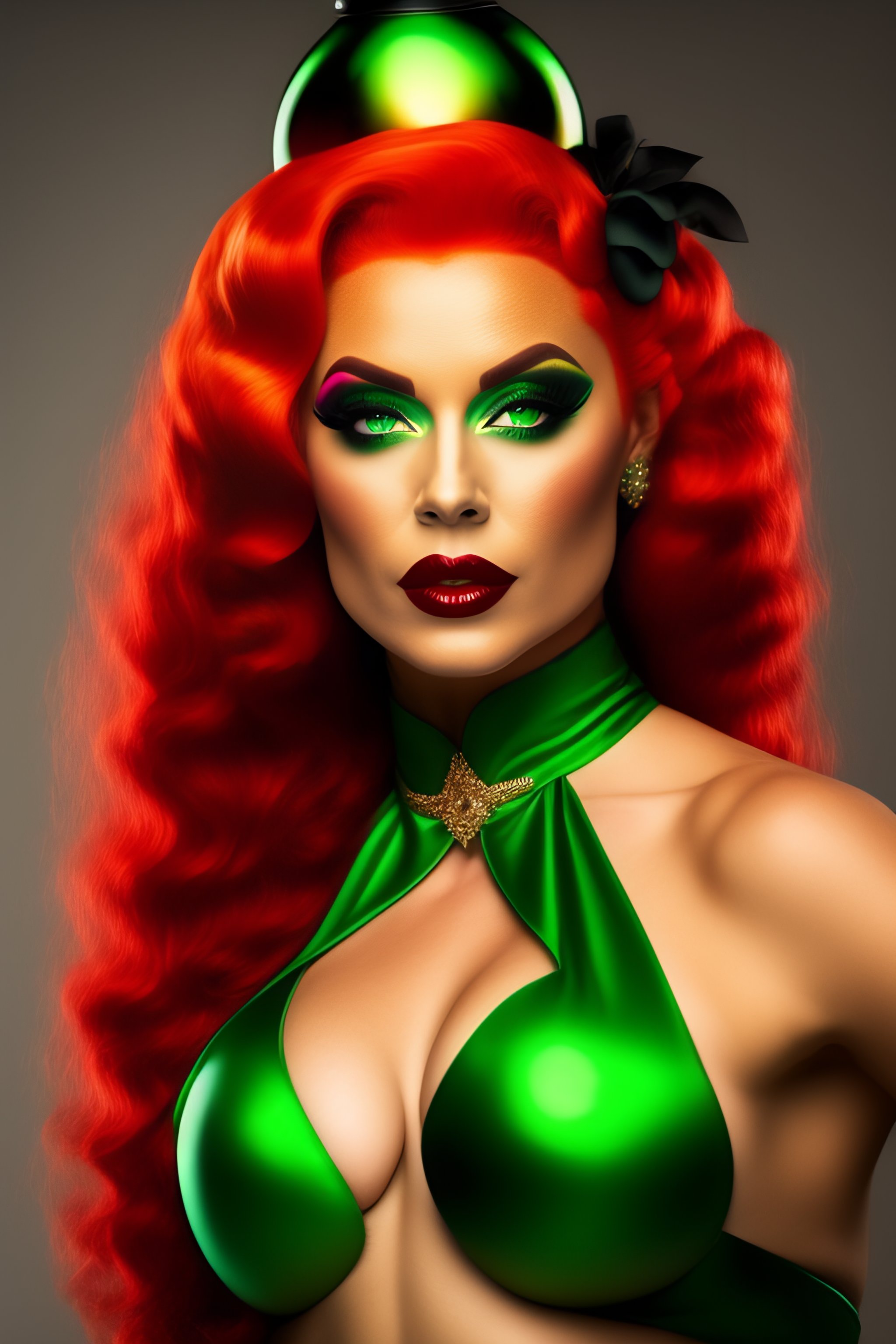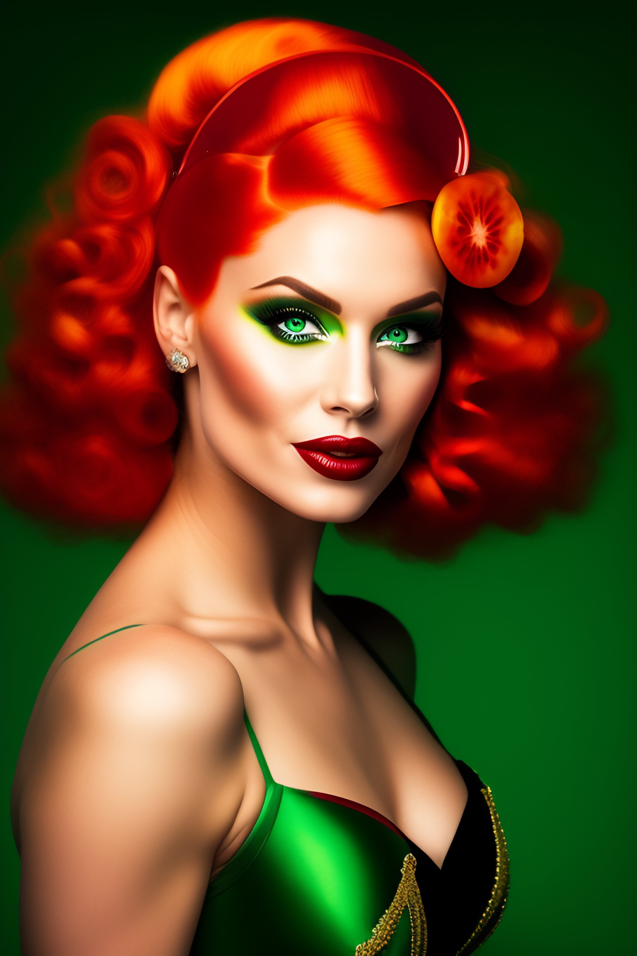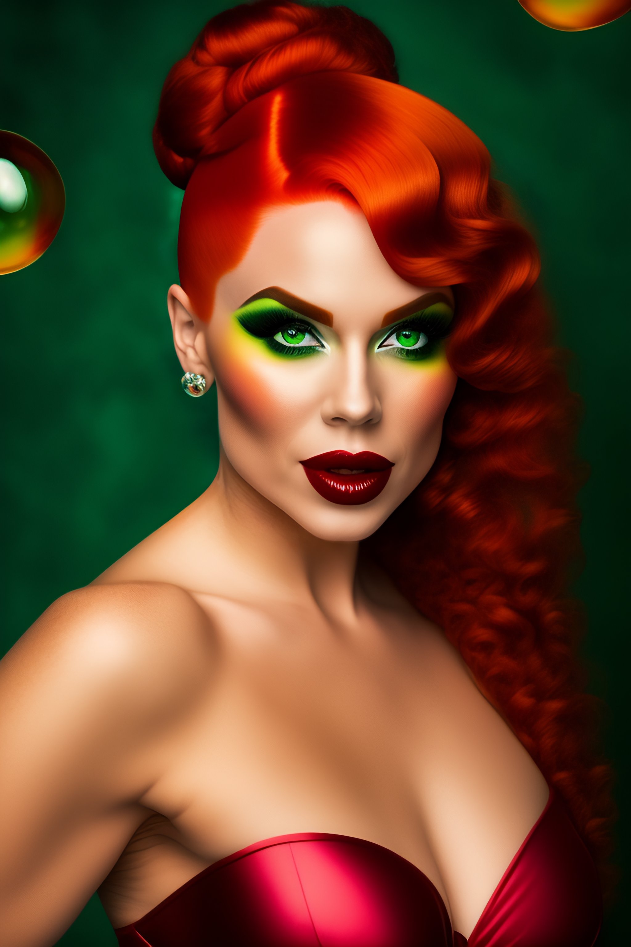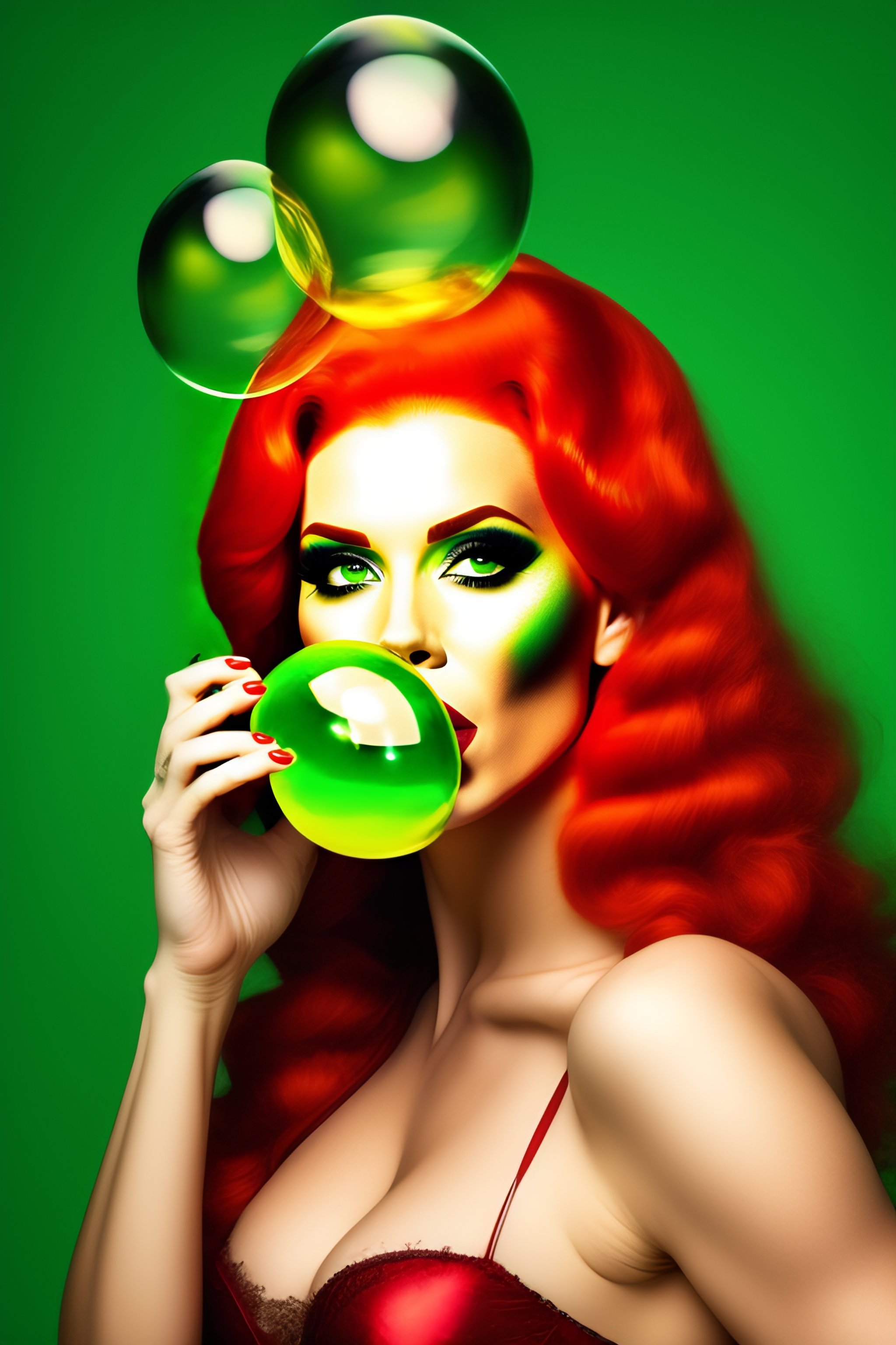 Ugly green eyed burlesque dancer with red hair and large bubbles all around eating a banana