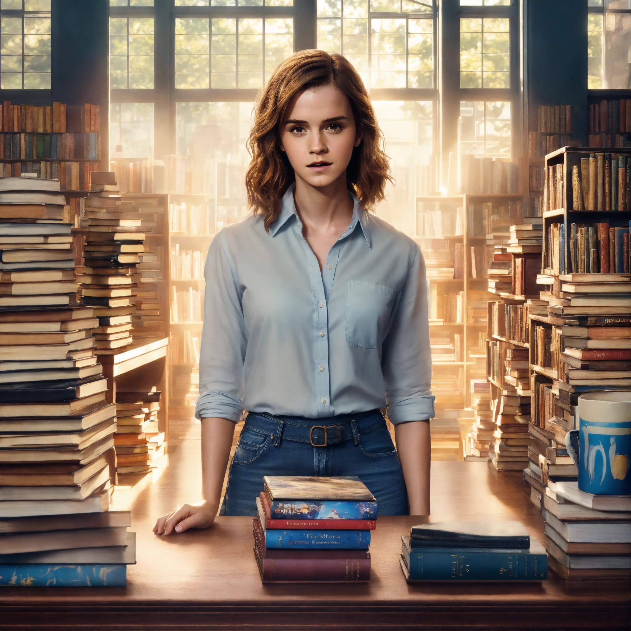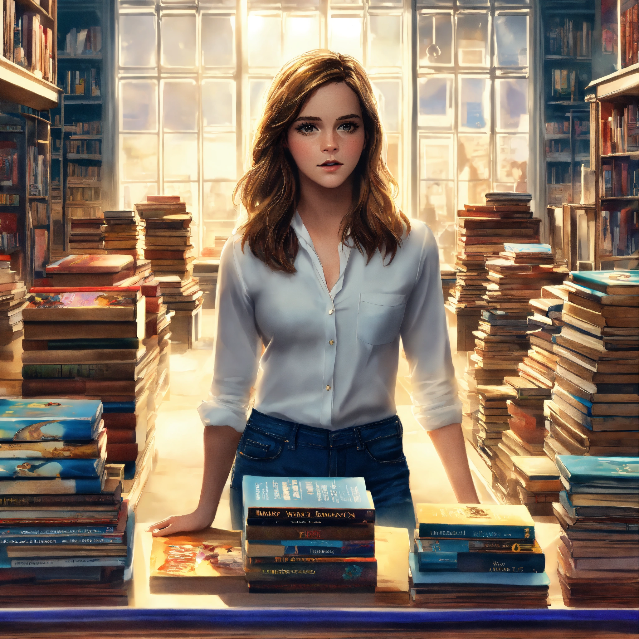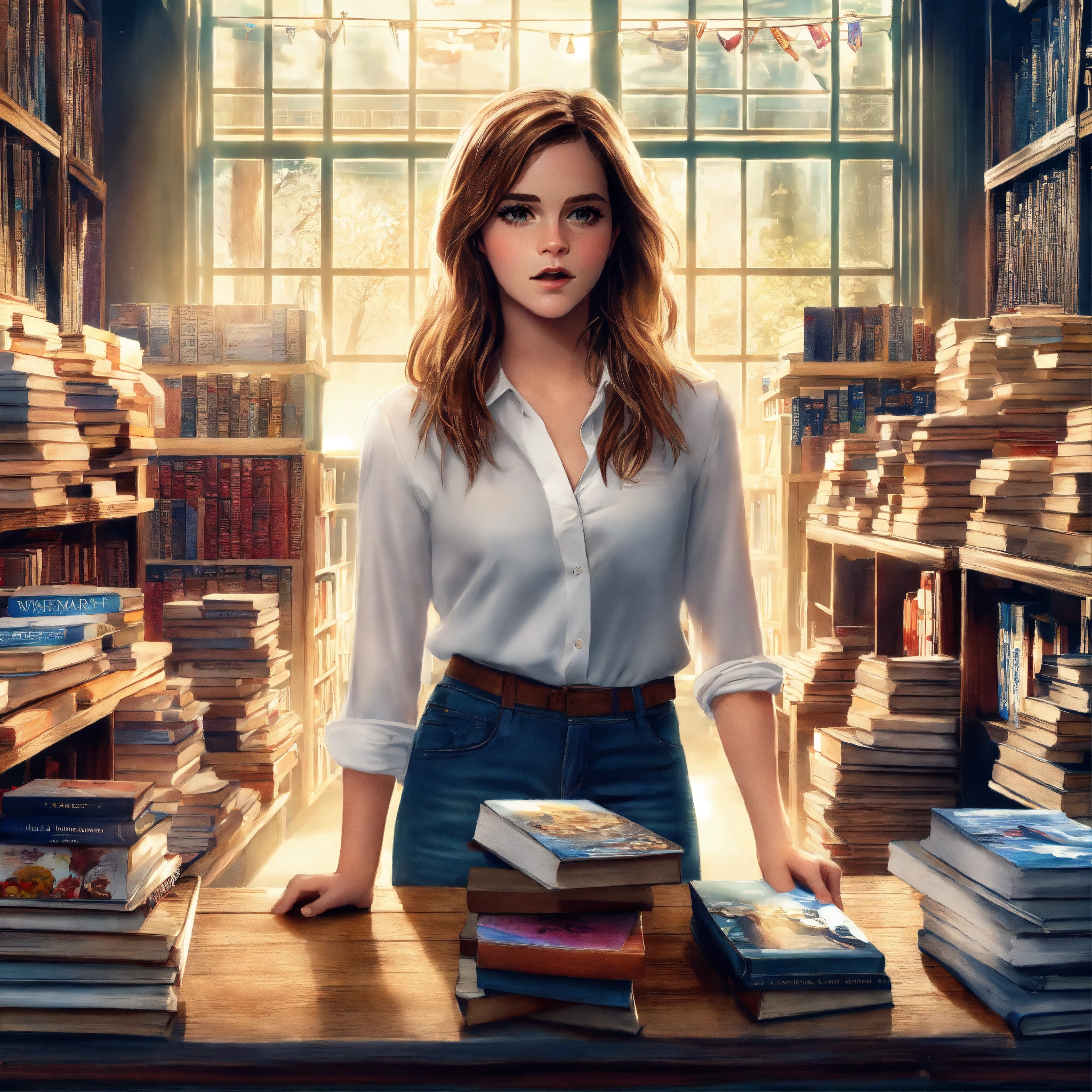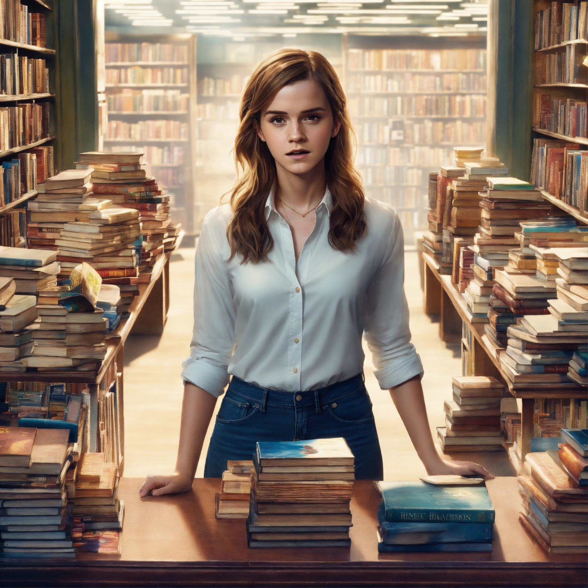 Masterpiece, highest quality, emma watson as hermione granger in white shirt and blue jeans in a bookshop behind a checkout counter with stack of books. 8k resolution. digital art, high quality, realistic.
