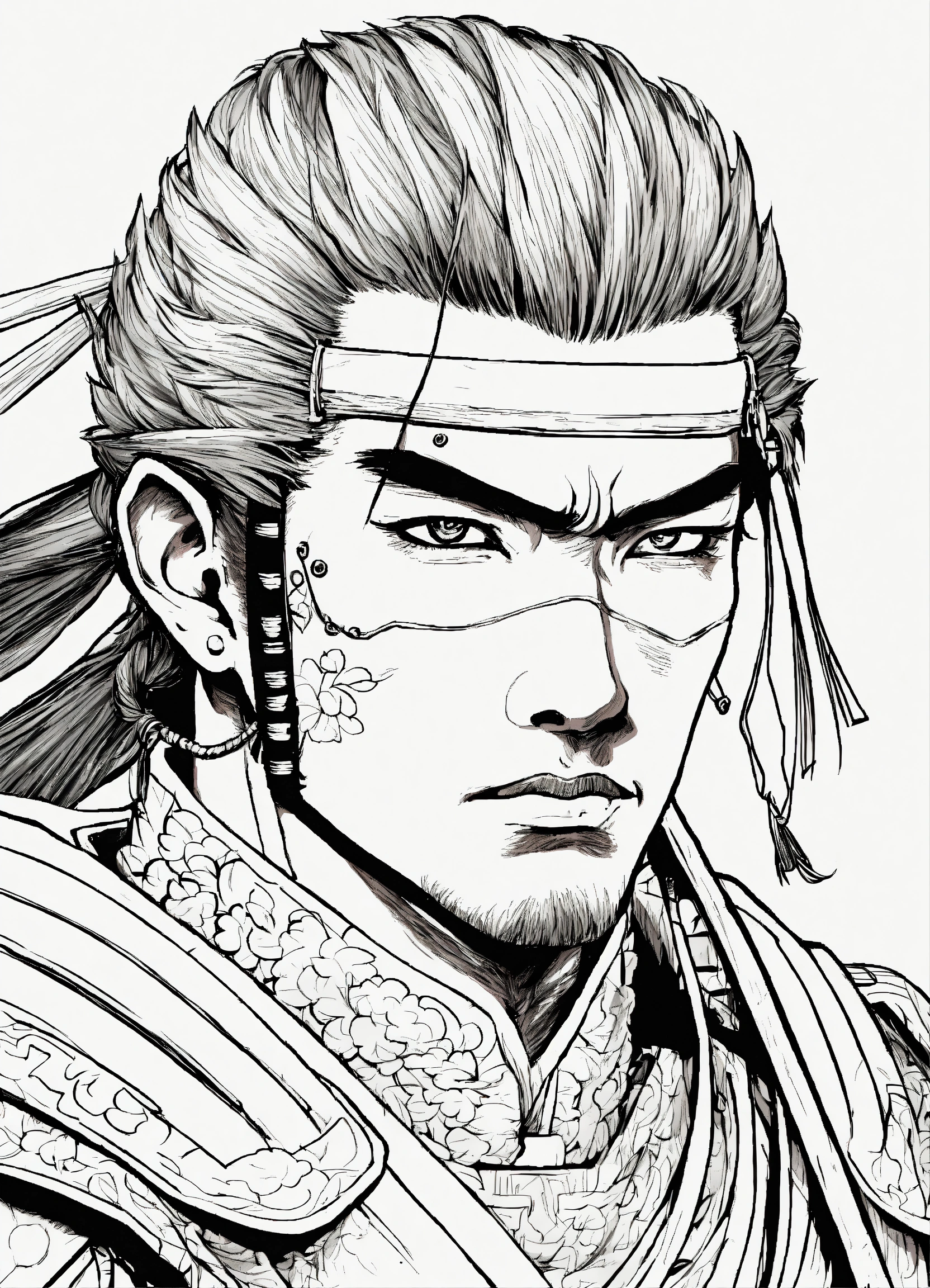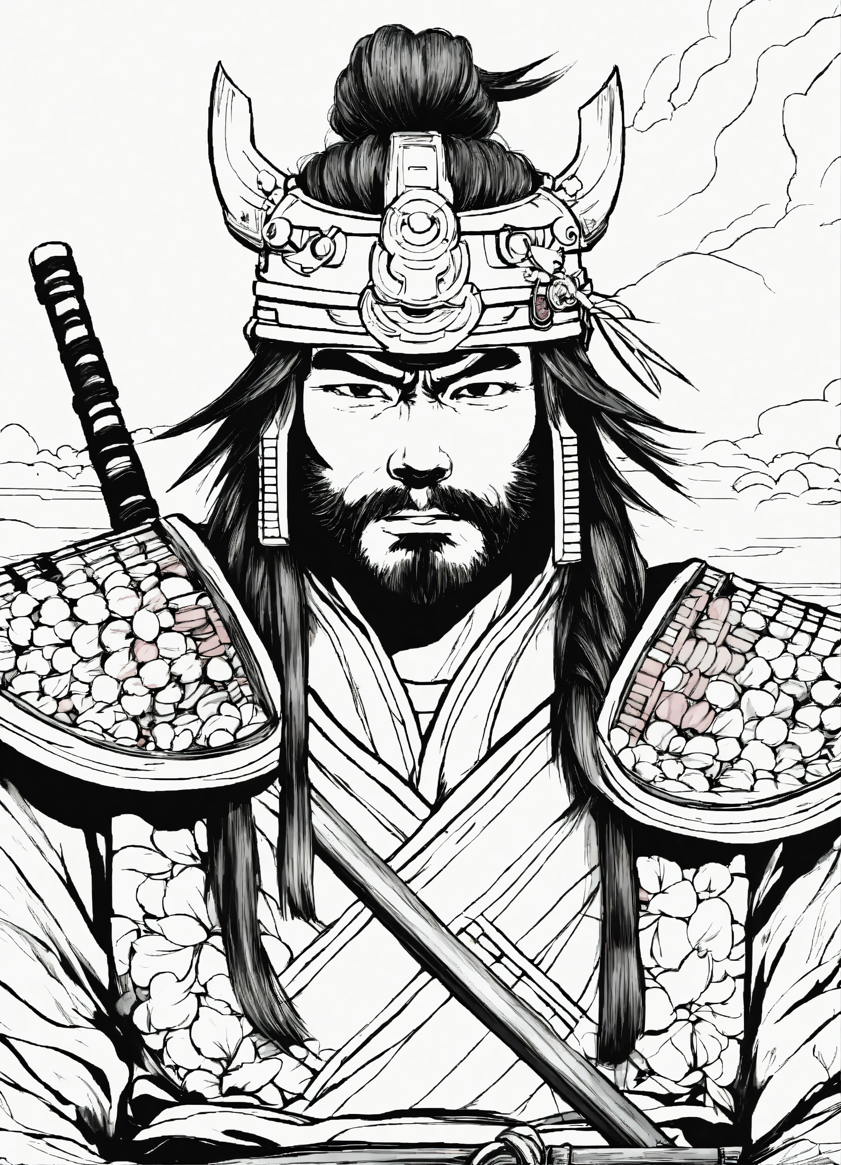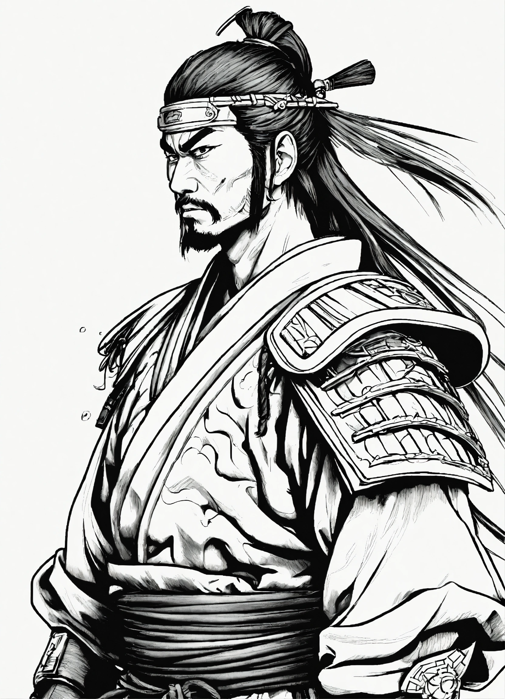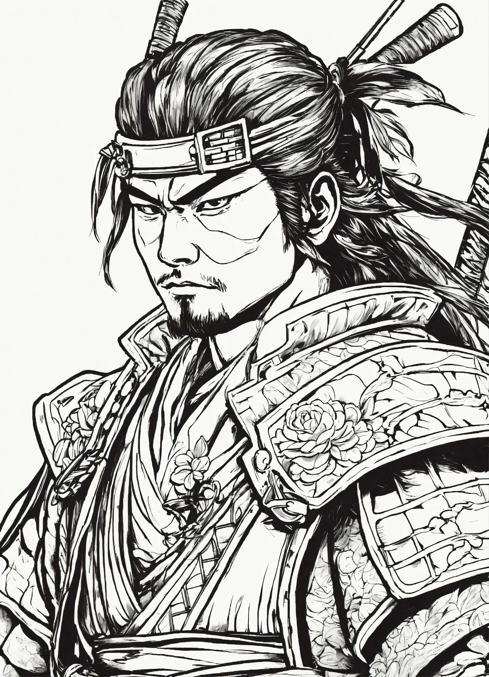 Generate a portrait of a samurai, 4k resolution, anime, in the style of akira toriyama style, with clear lines, no shadows, on a pure white background suitable for a adult's coloring book.