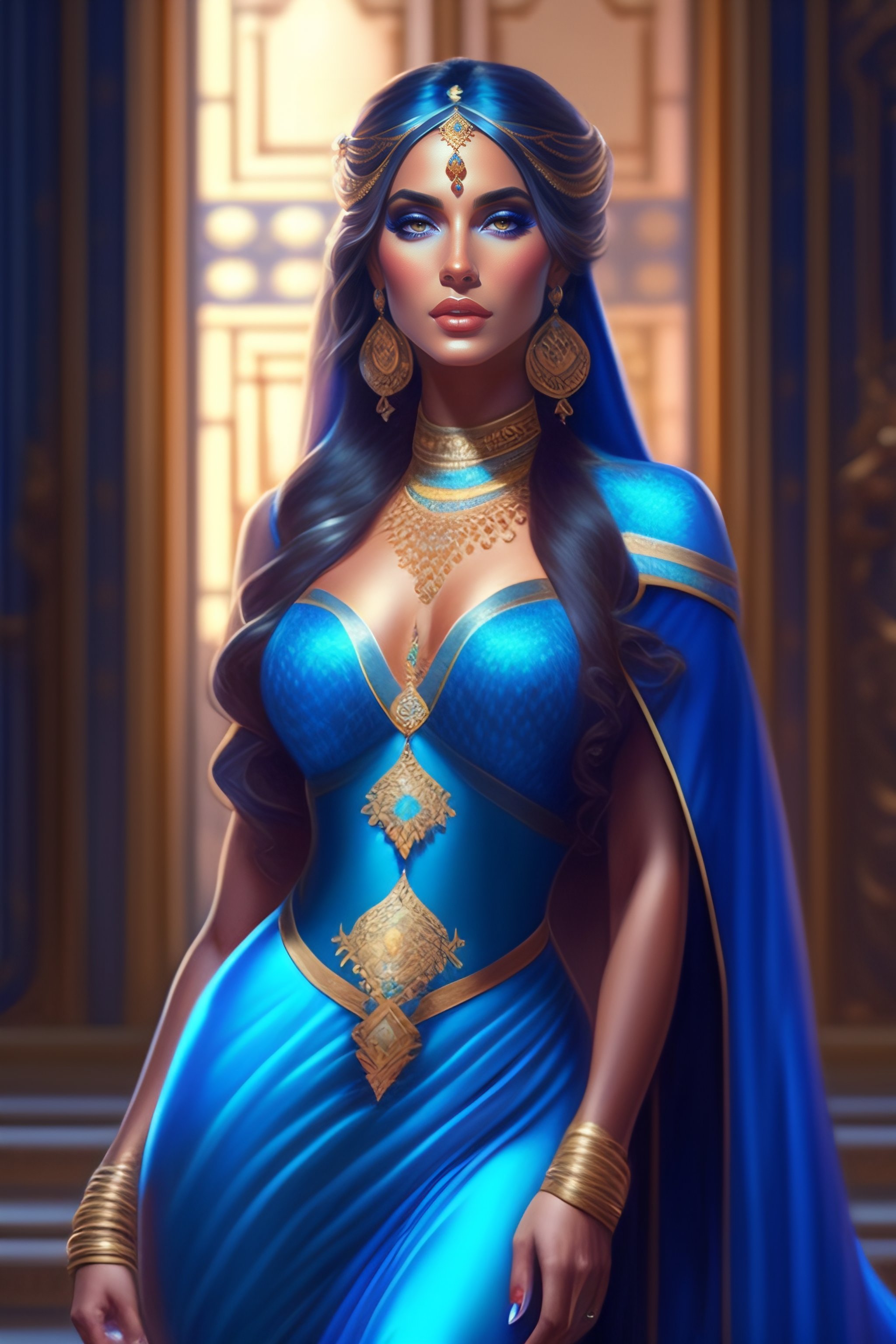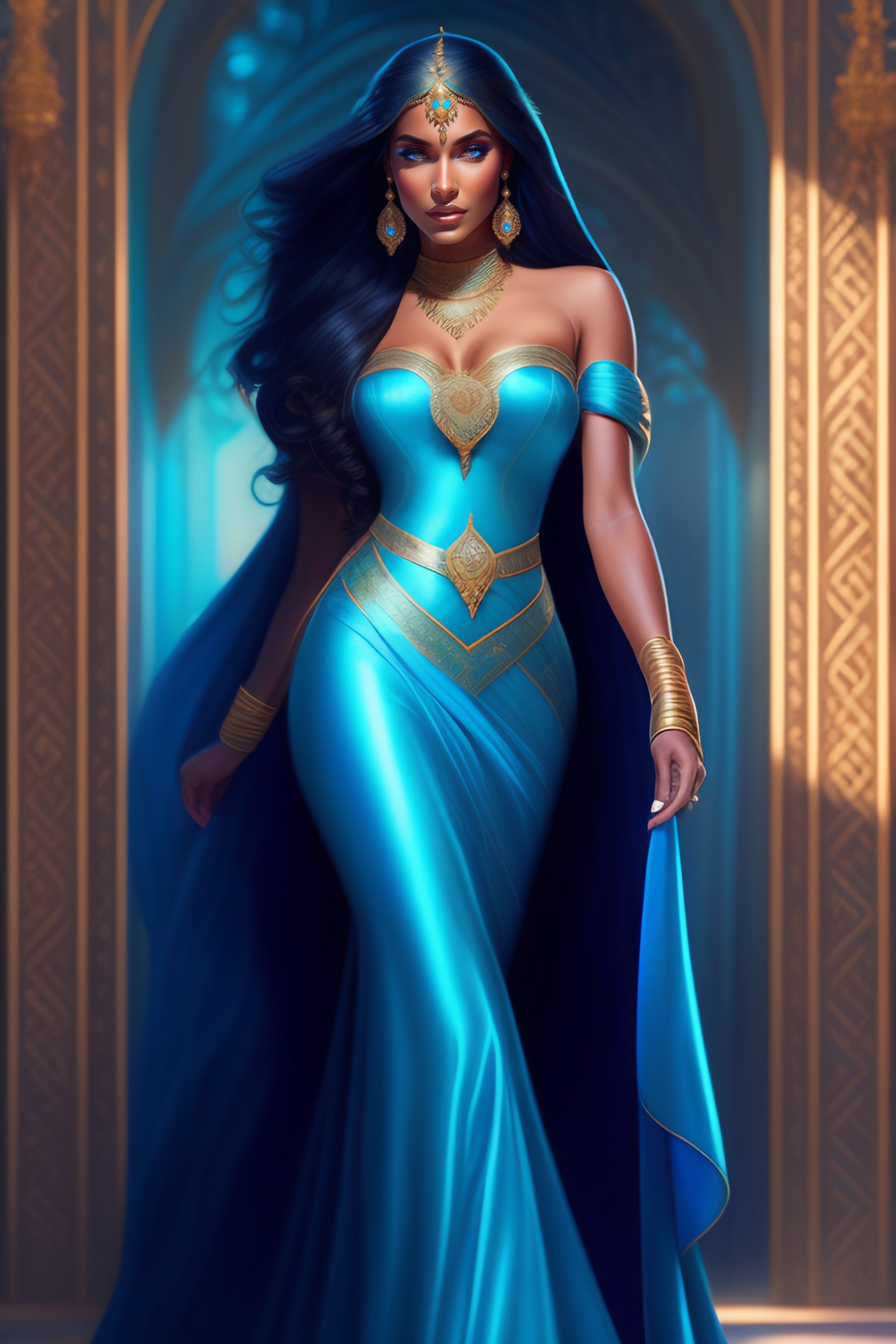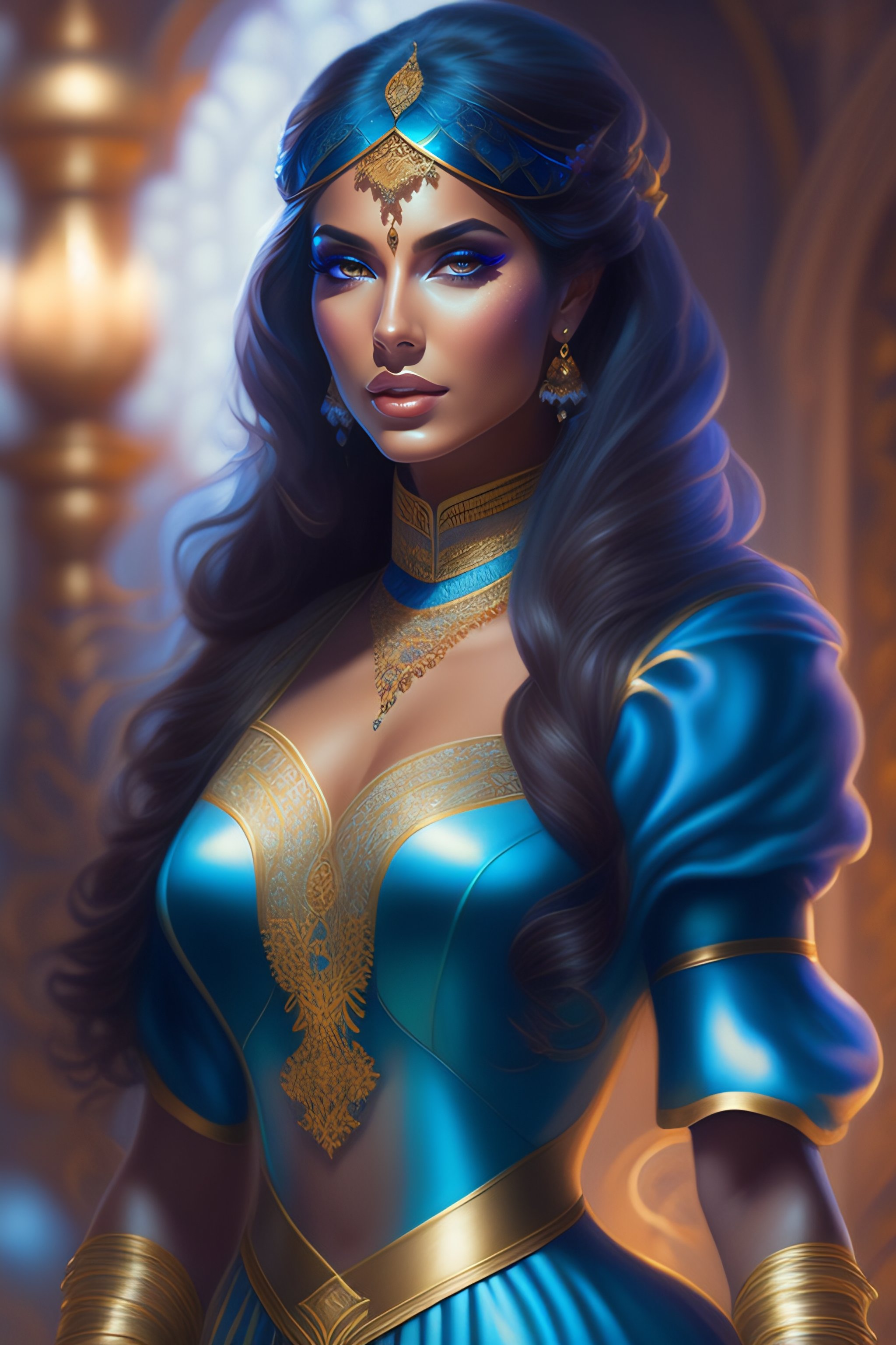 Ultra realistic illustration, full body portrait, princess jasmine in blue revealing garments, fantasy, intricate, elegant, highly detailed, digital painting, artstation, concept art, smooth, sharp focus, illustration, art by artgerm and greg rutkowski and alphonse mucha