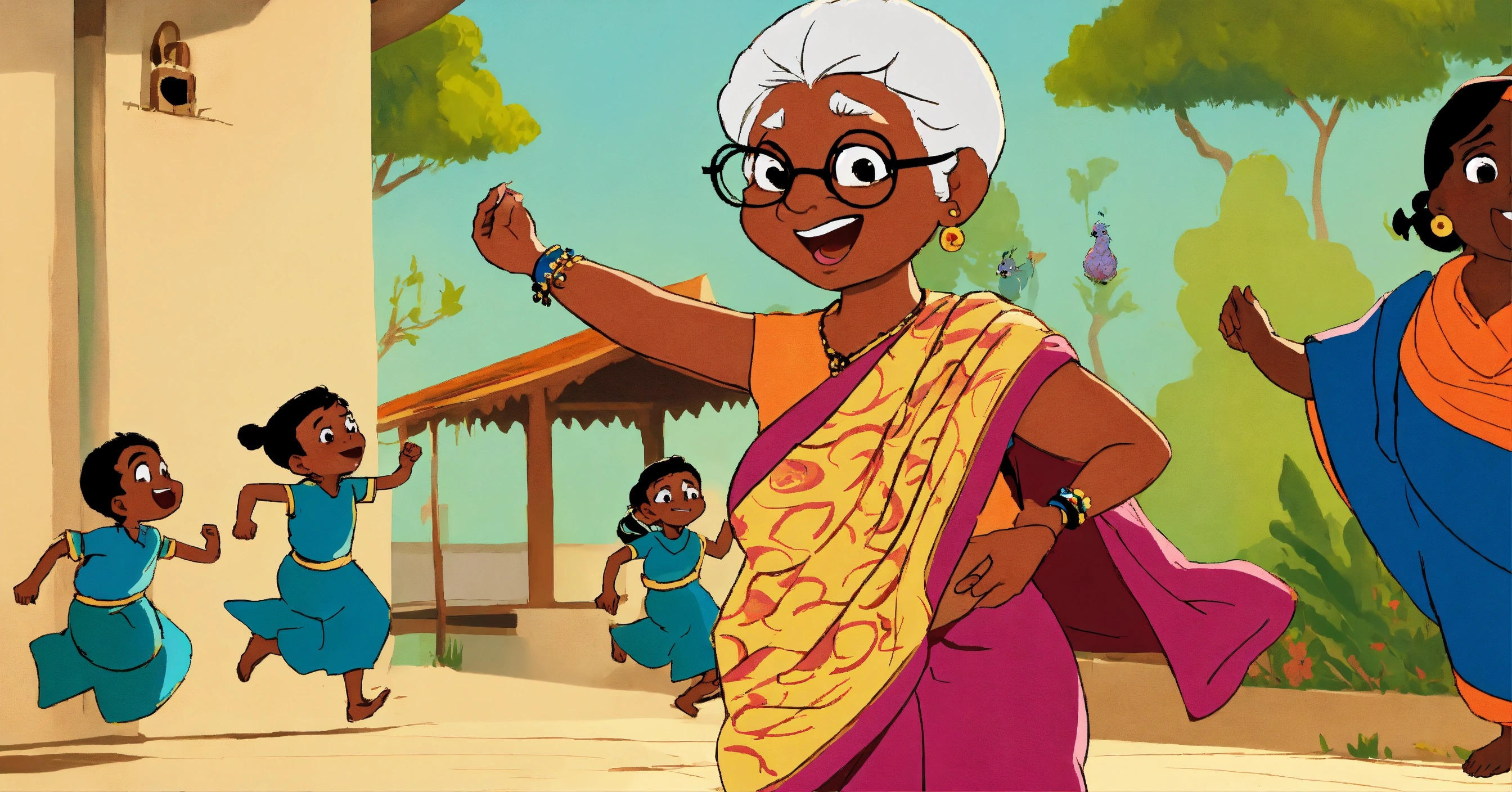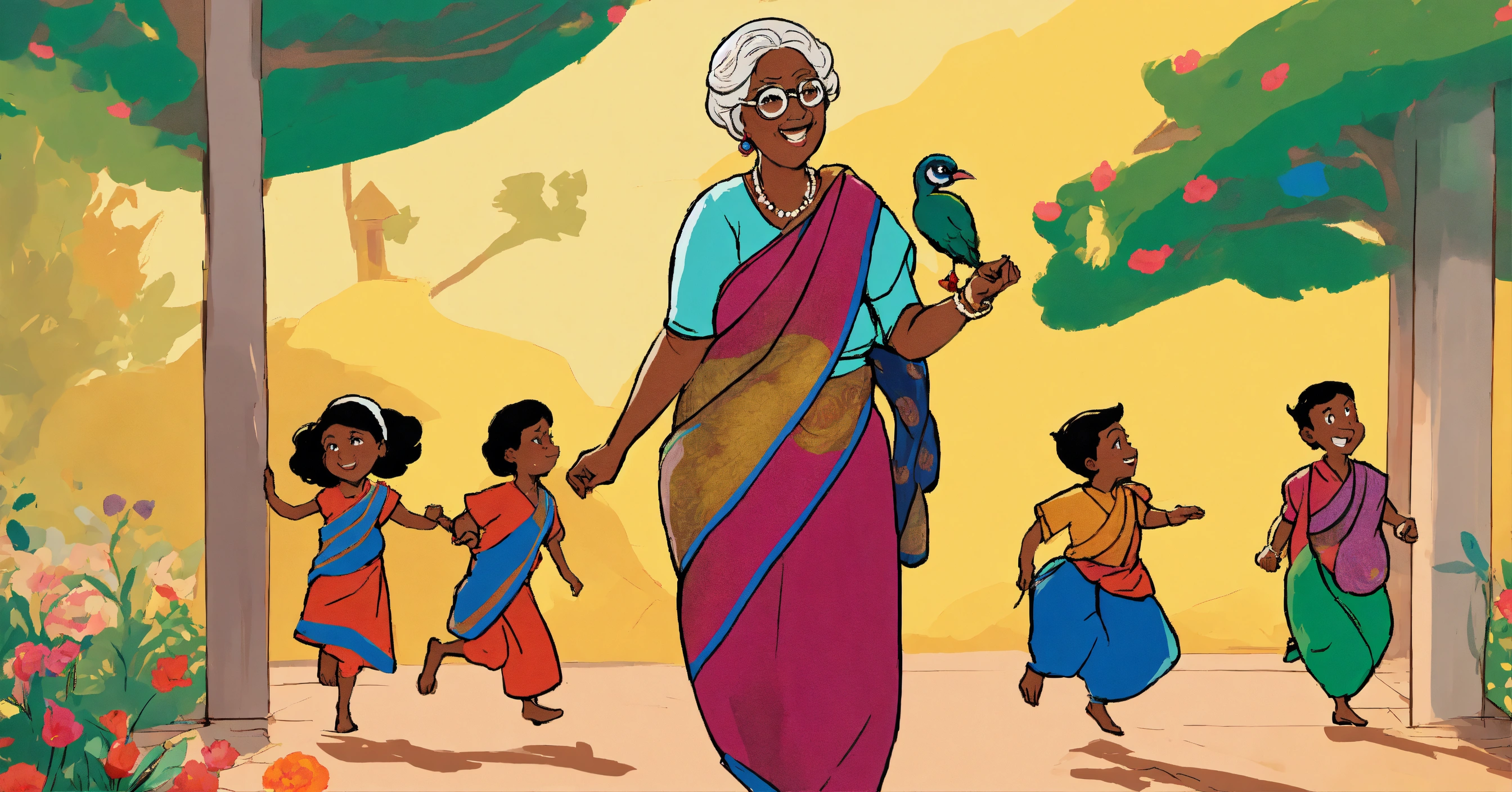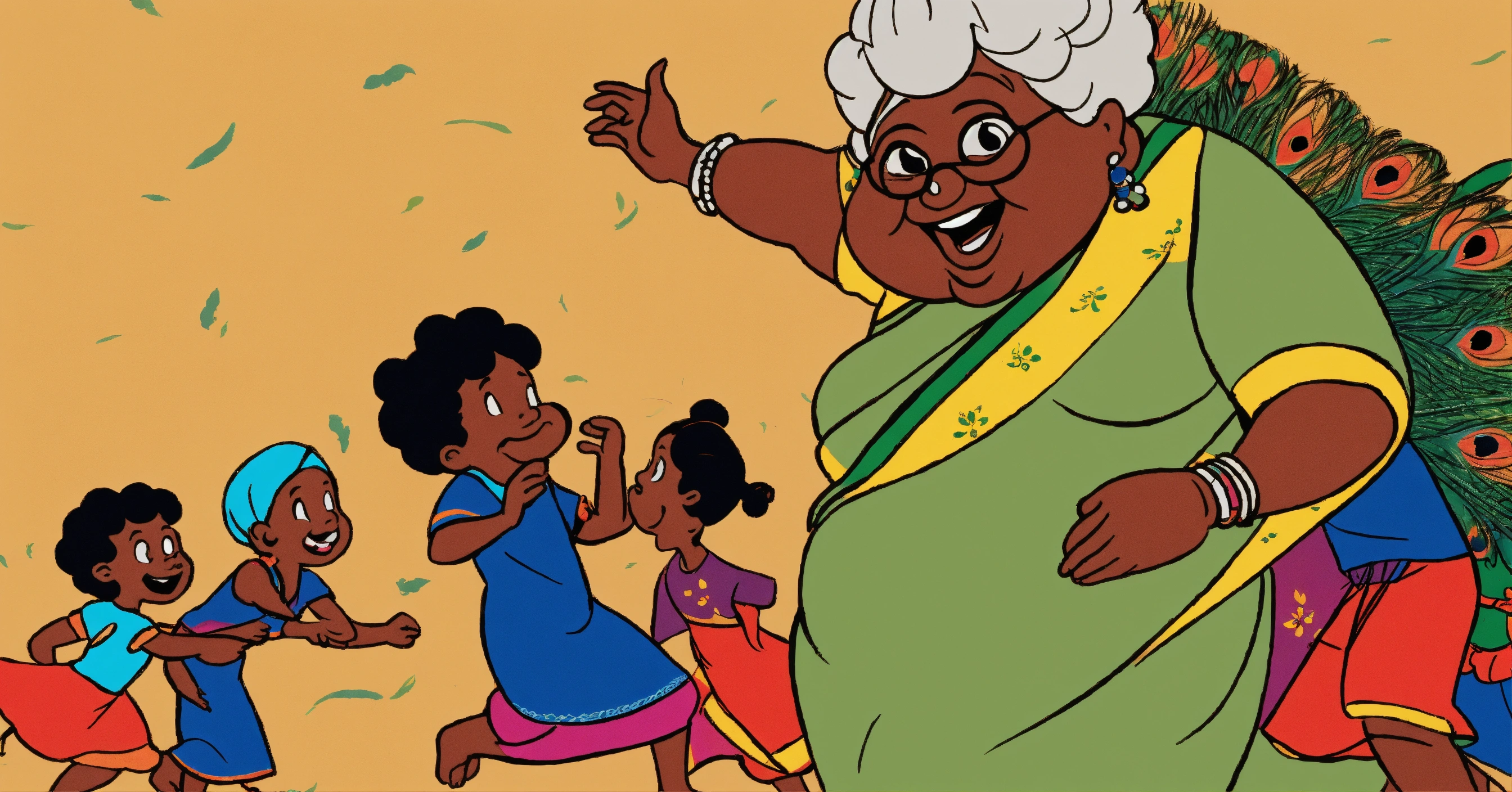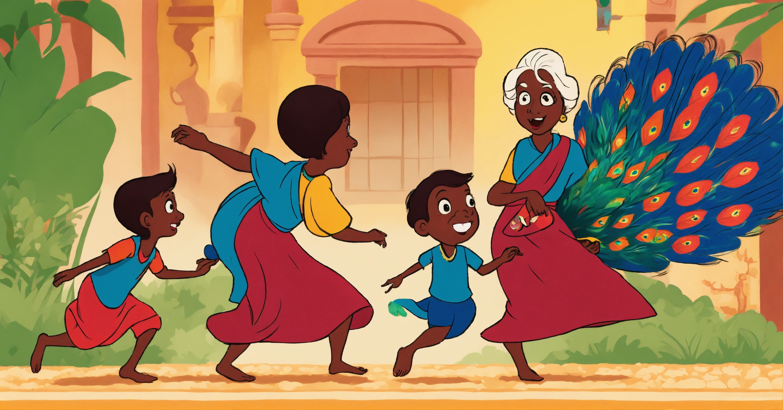 No background, medium dark-skinned grandma in a sari looking annoyed as children run away laughing with a peacock, round cartoon figures, simple primary colors, bold black outlines, style of donald bluth