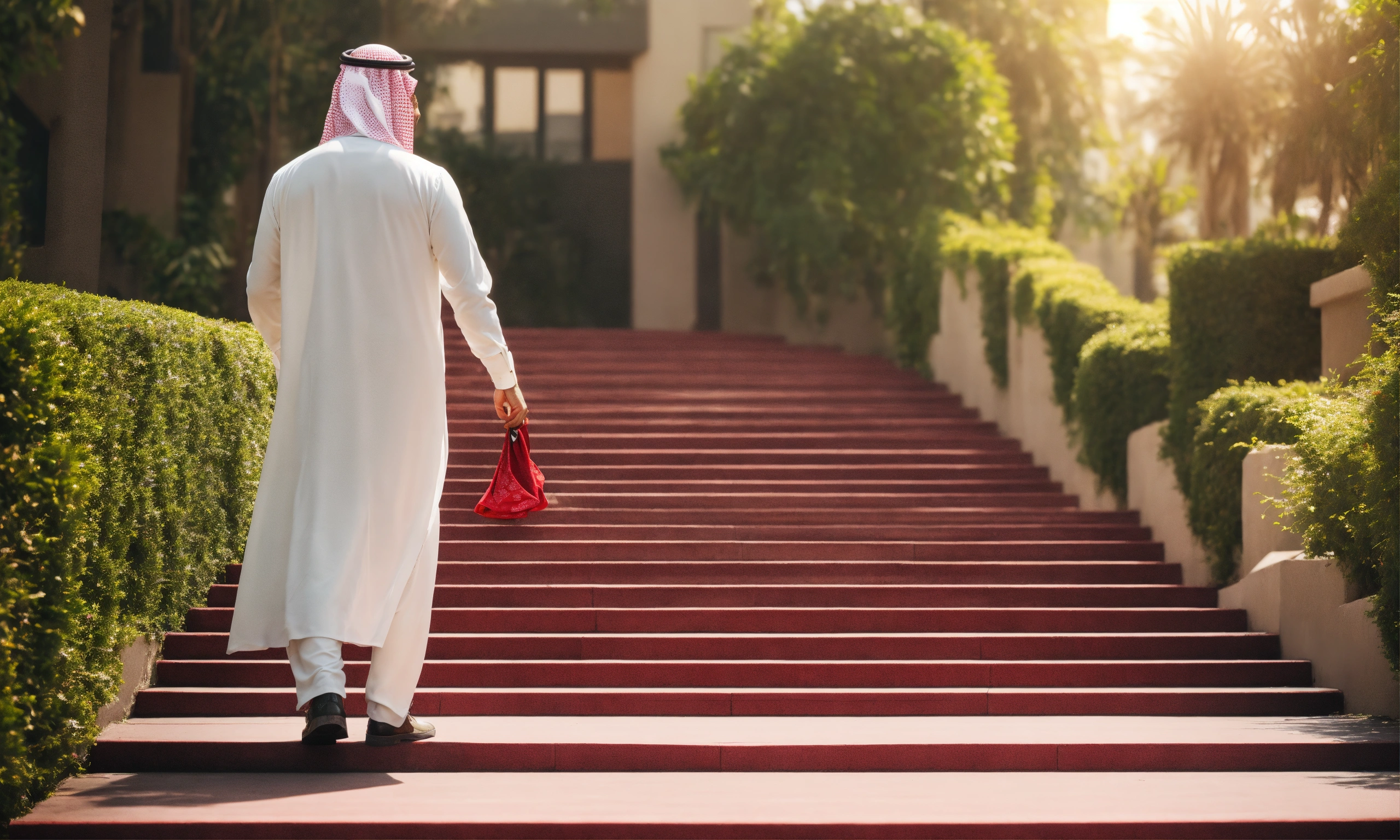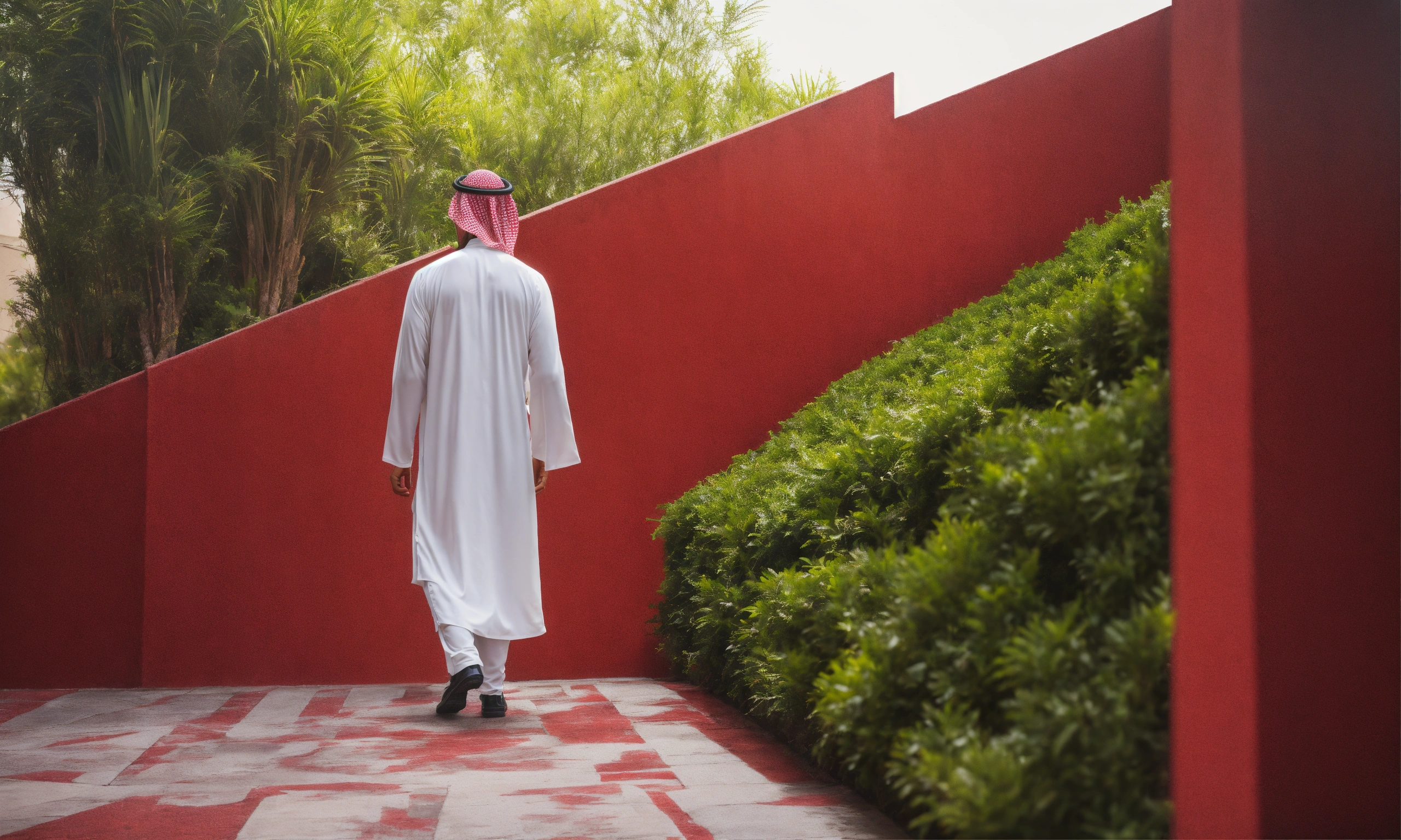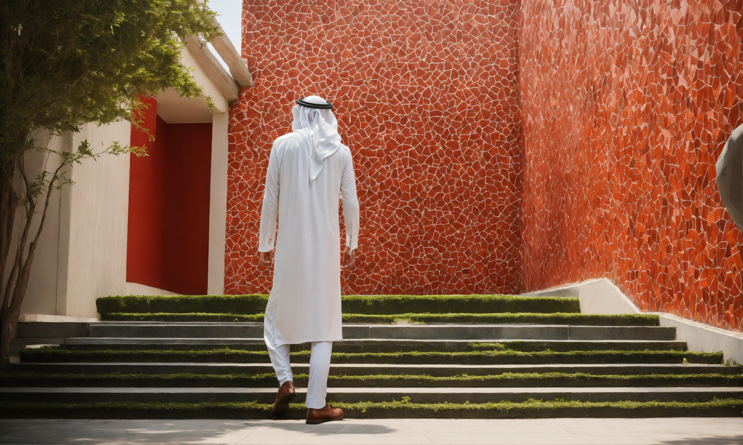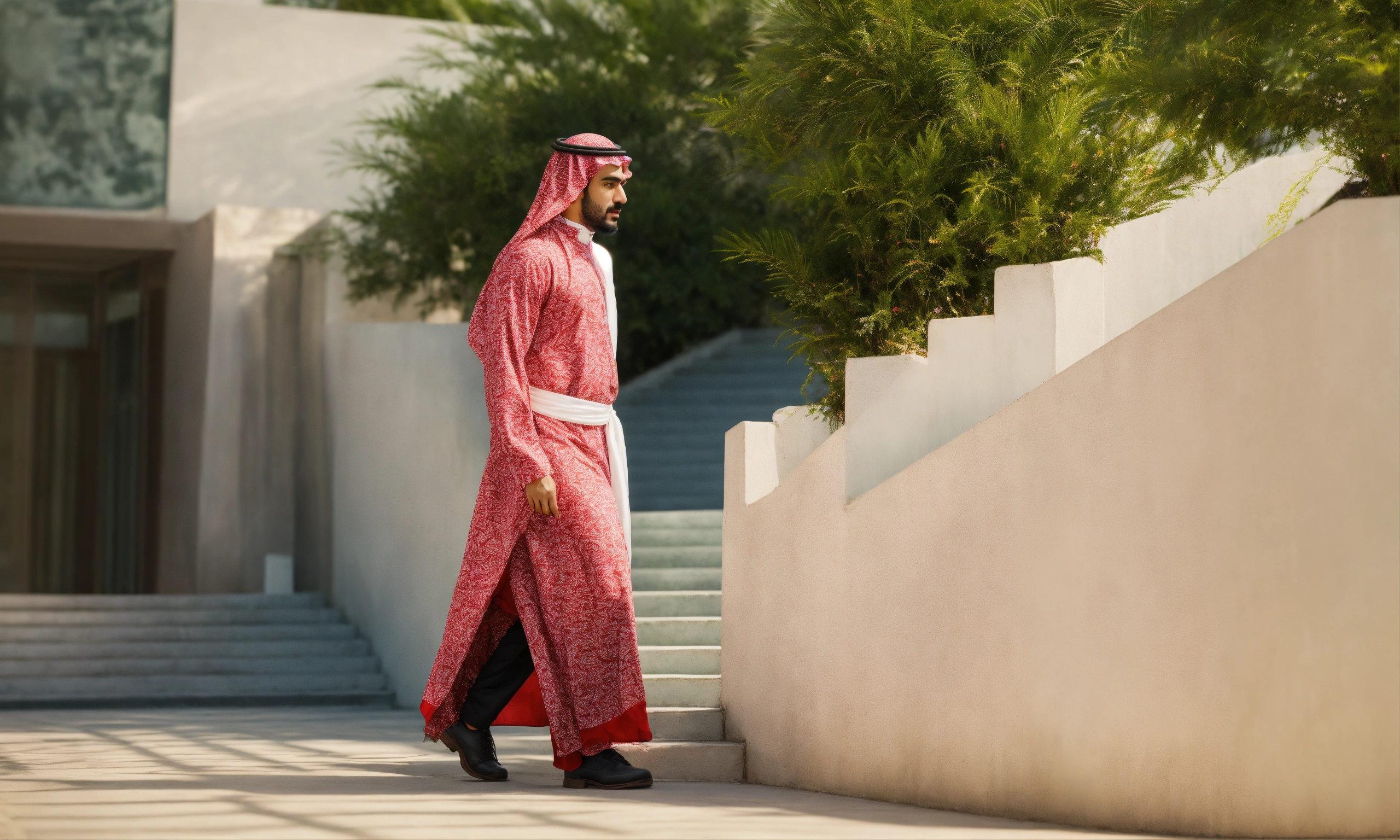 Saudi man climbing up steps, looking right, right side, side-way, white costume, saudi head cover, red pattern, close up, glass, abstract, modern, street, greenery, natural light, warm, photo-realistic, 8k, high definition
