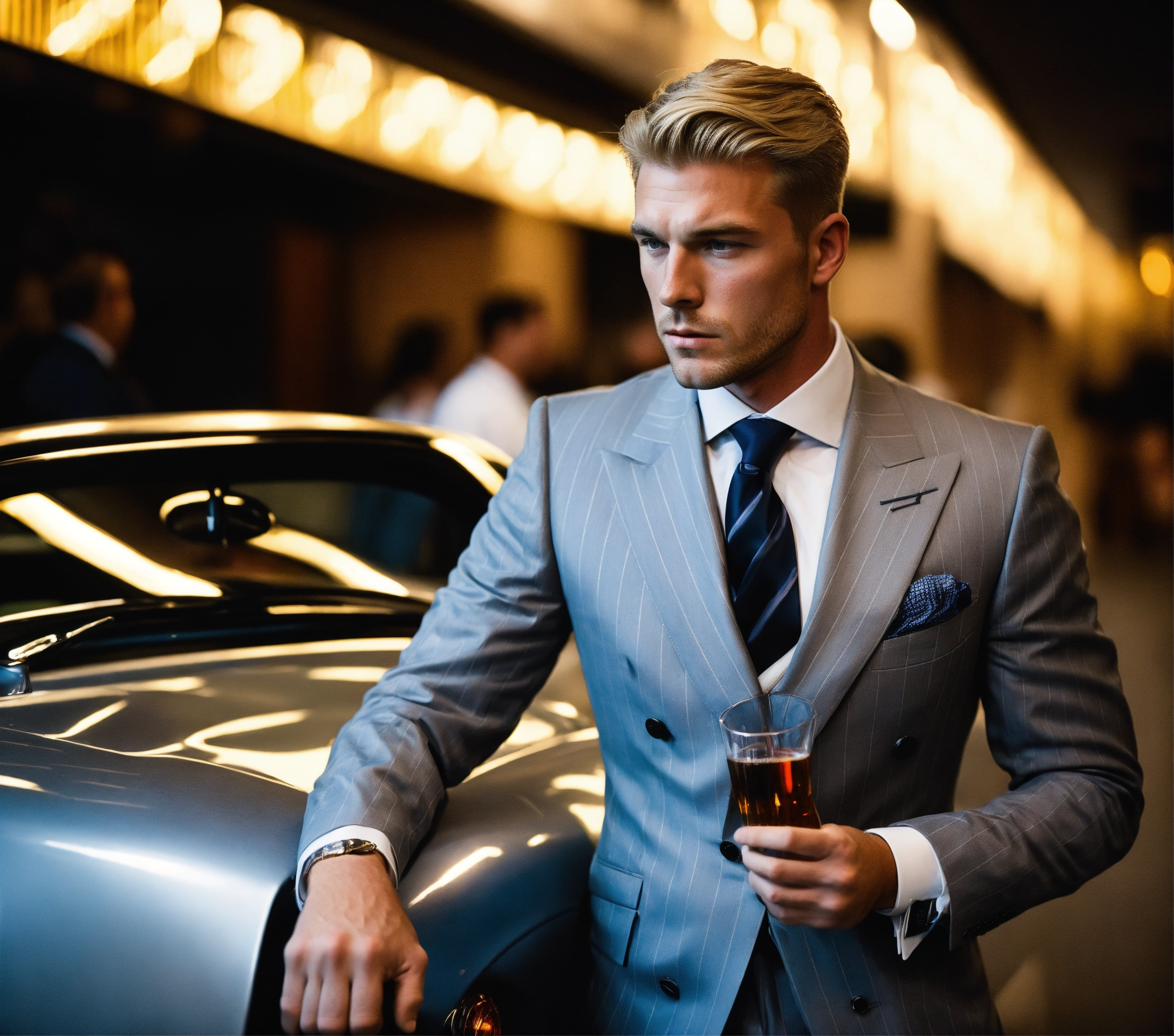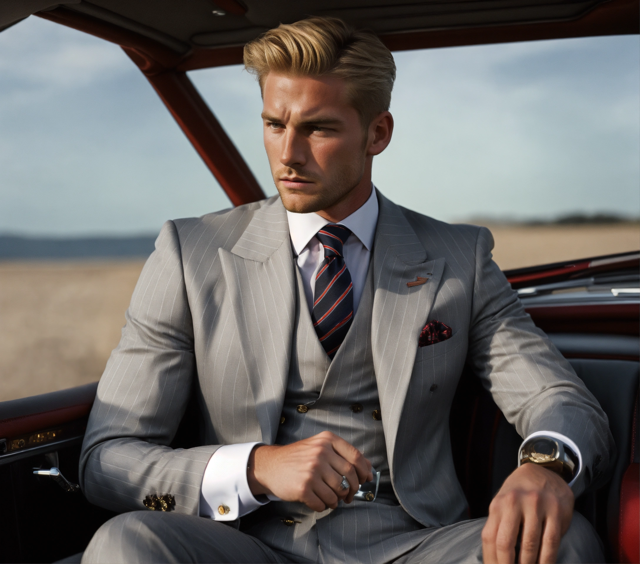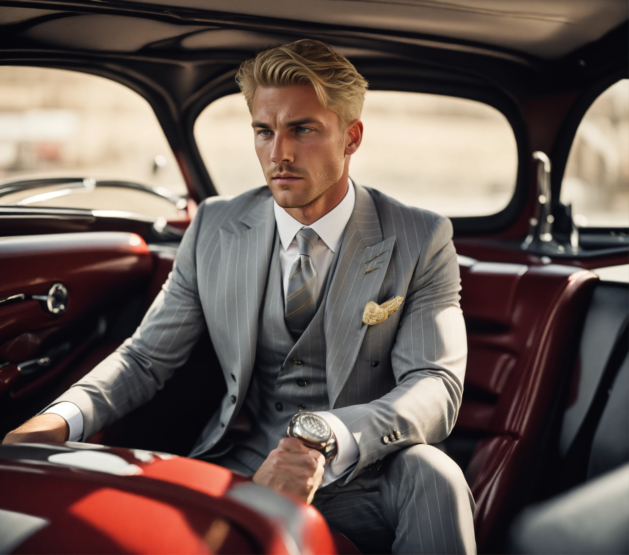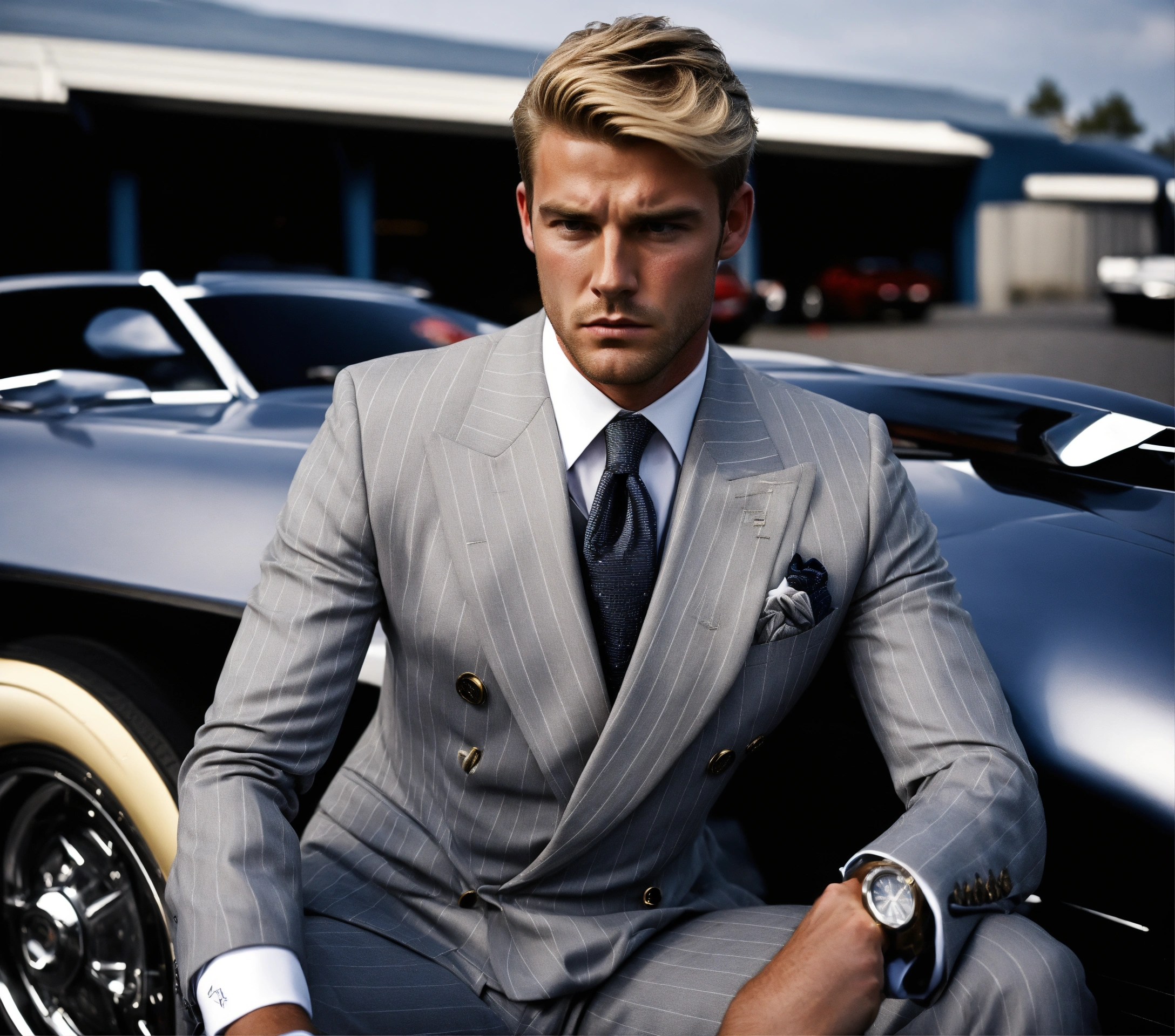 A blonde male sportsman in light grey pinstripe double breasted suit, club tie, drinving a sport car, frowning