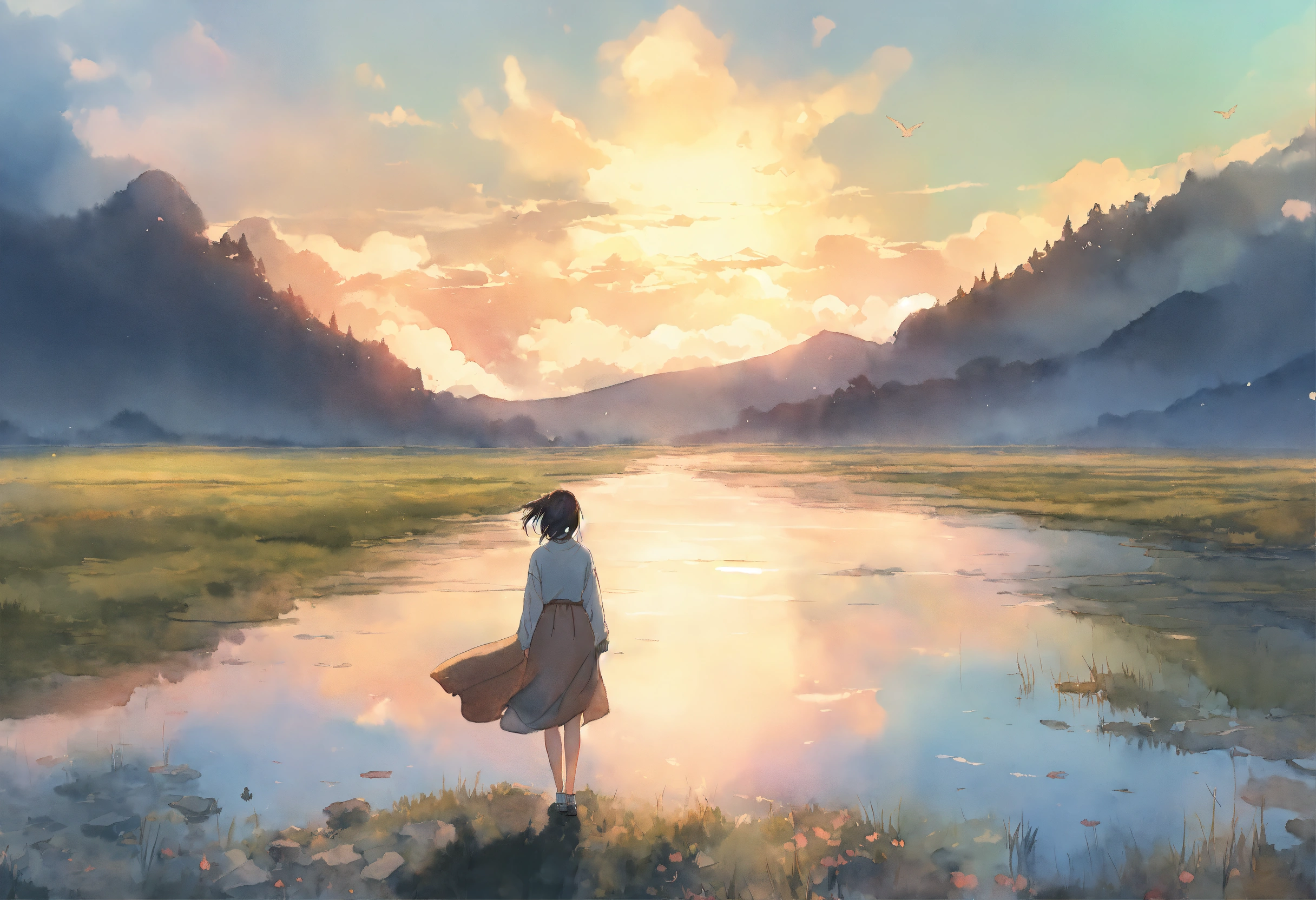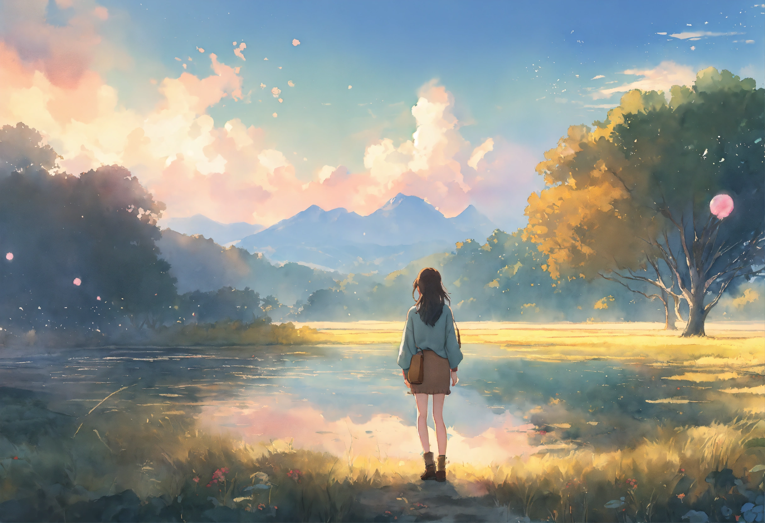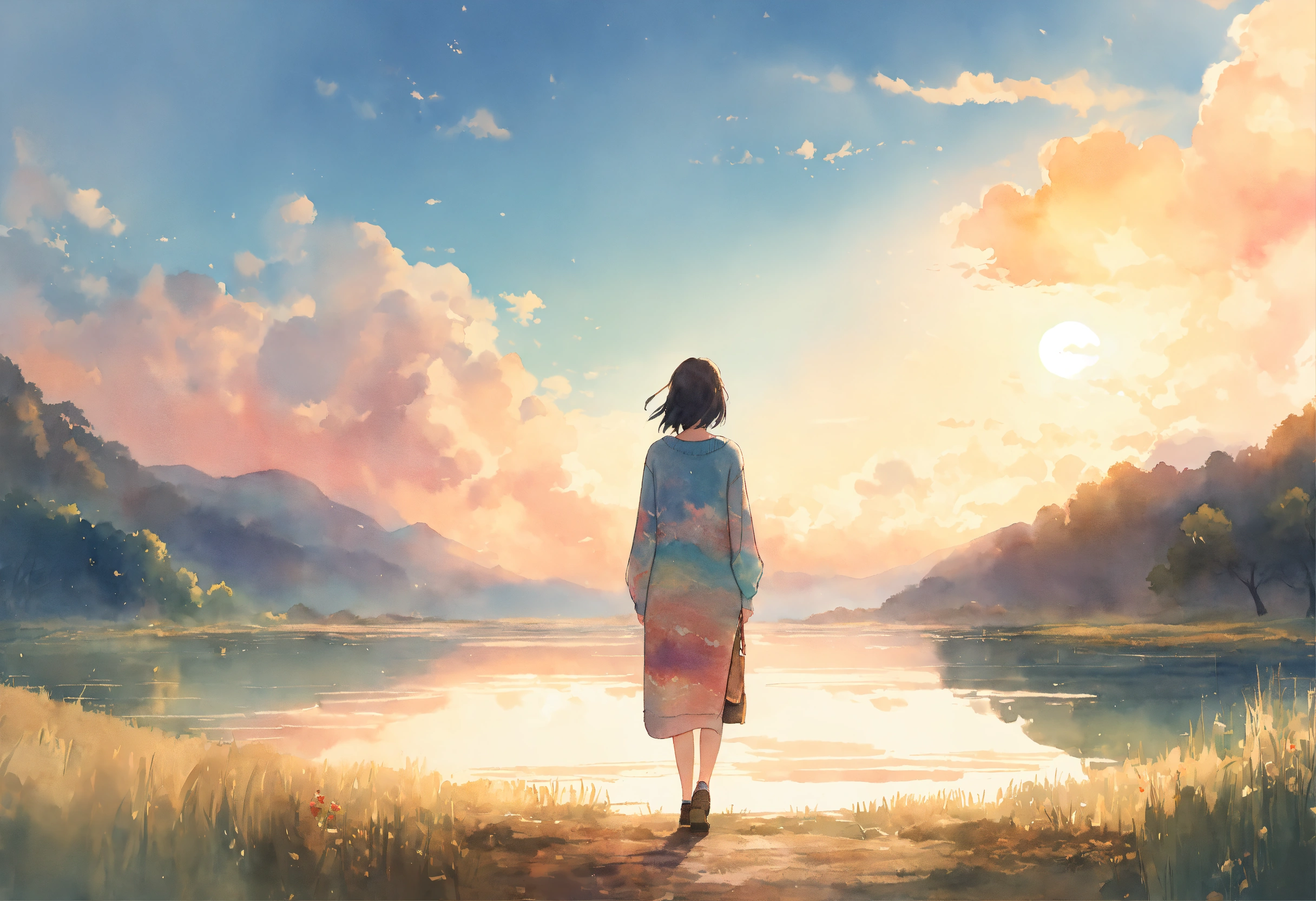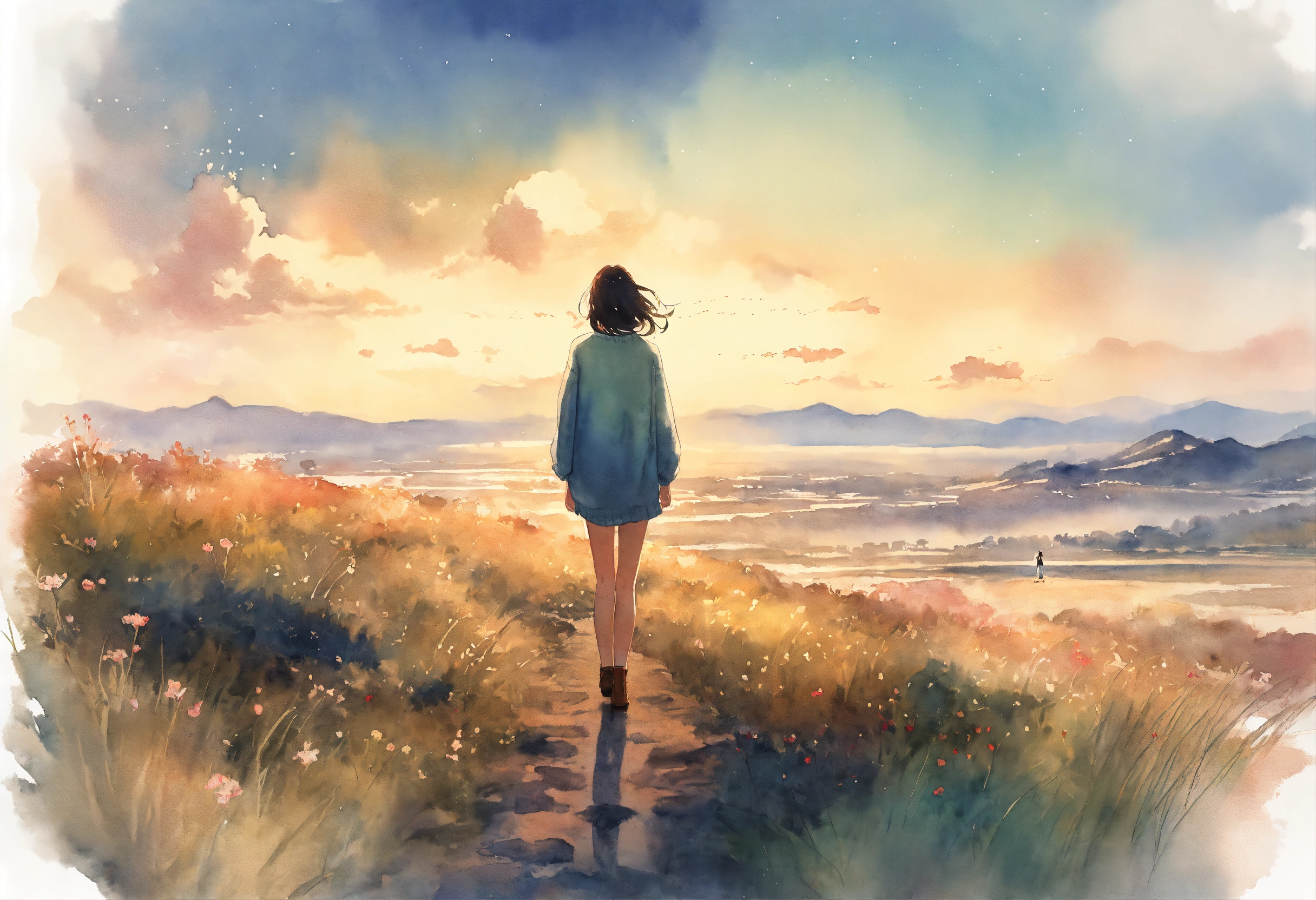 Full body watercolor illustration of a minuscule 20 years old women standing in the middle of an immense magical setting, facing backwards, centered, small figure in large landscape, wearing a long boho sweater, comfortable, stylish, chic, no makeup, effortless, relaxed, casual, laid-back, beautiful light sky, low saturation, muted colors, animation, fantasy art, by makoto shinkai