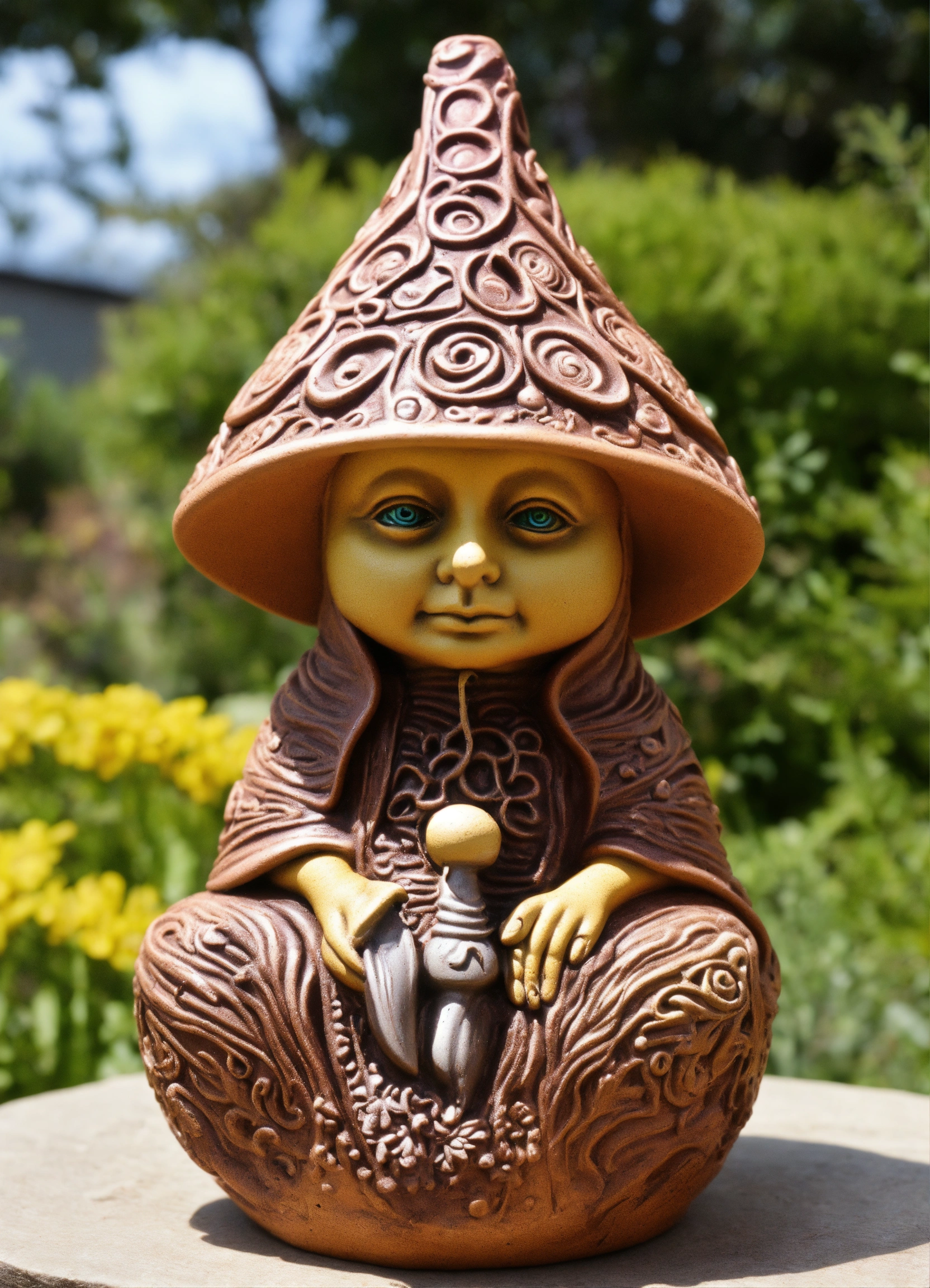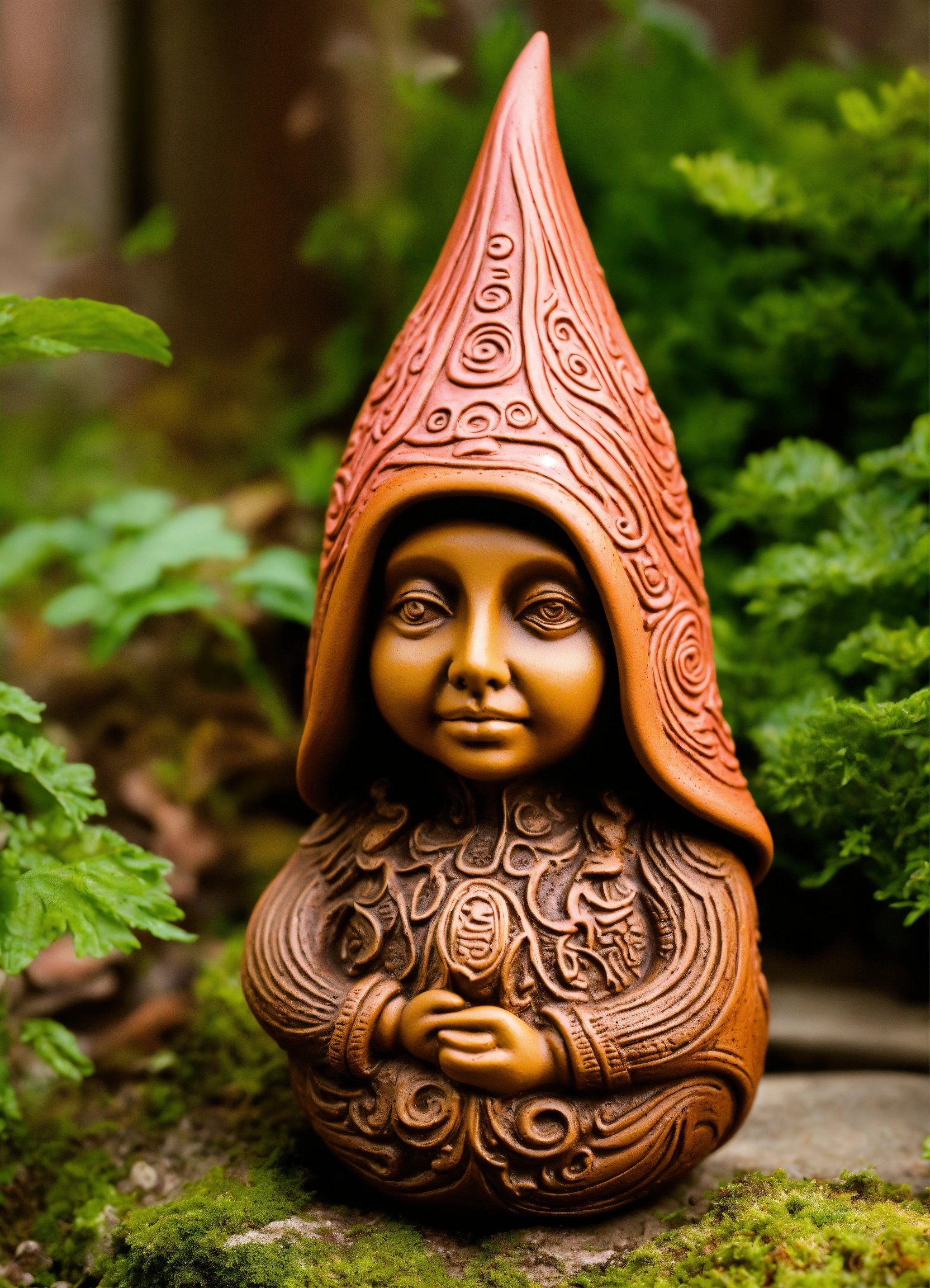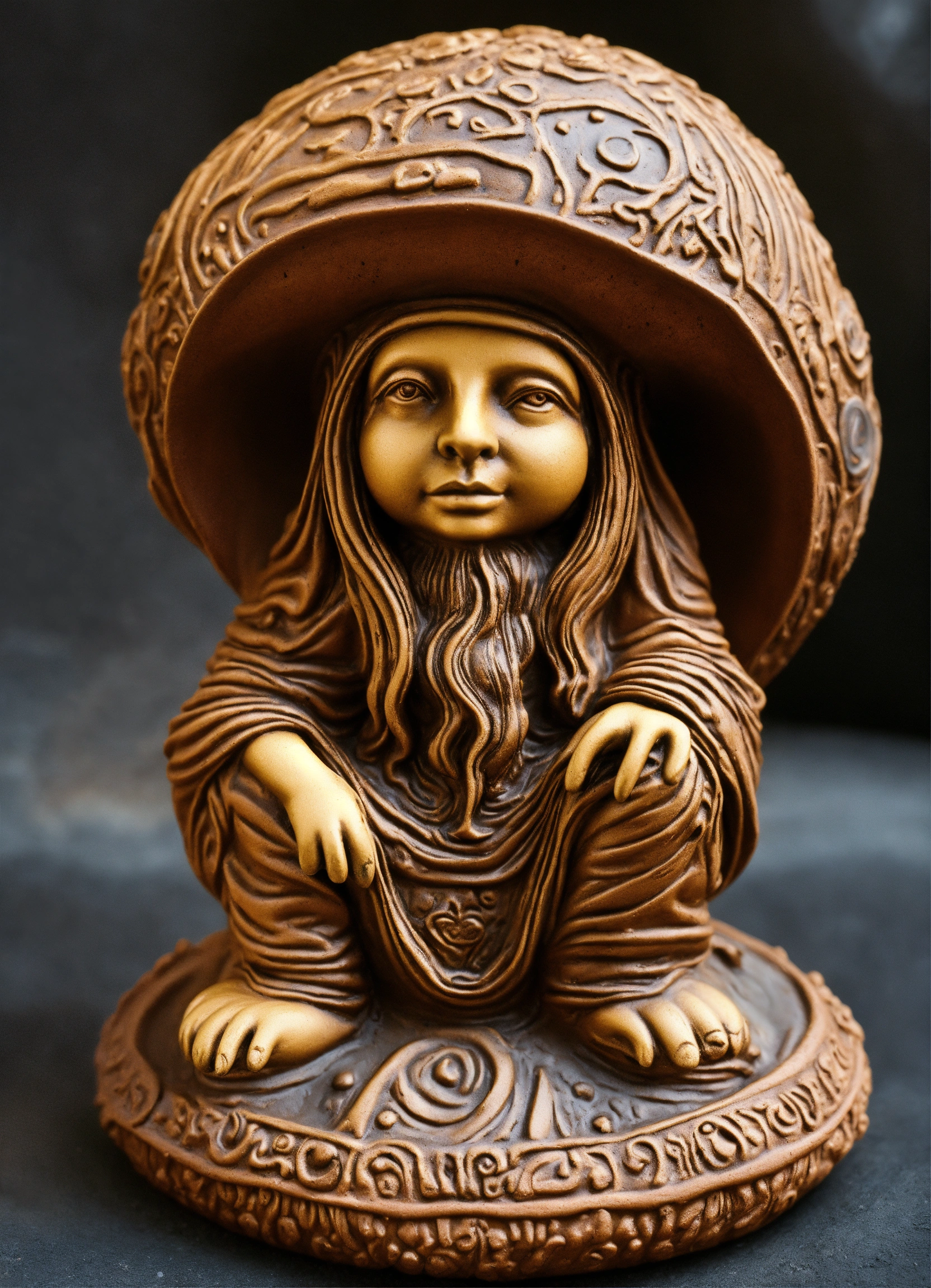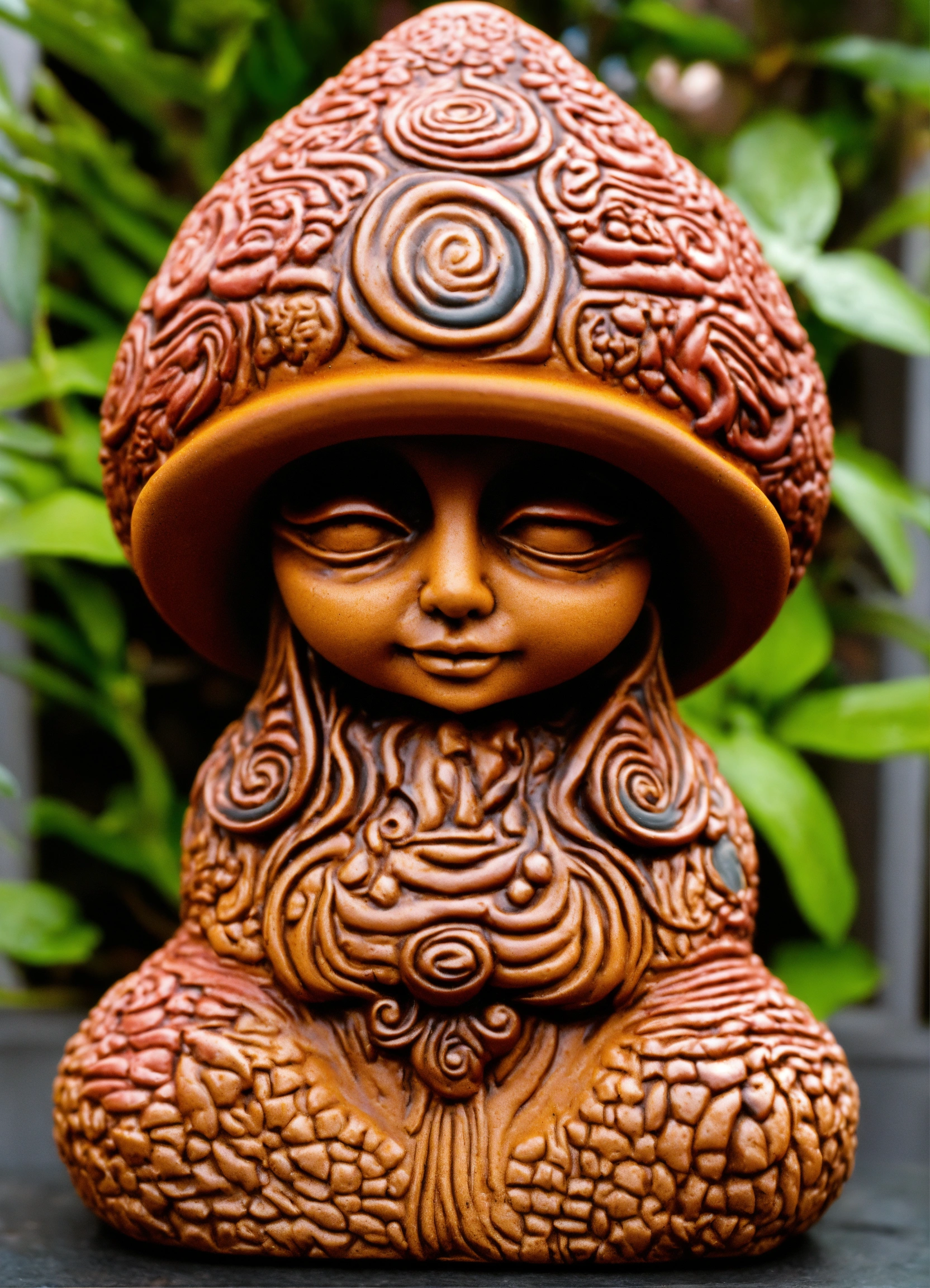 An ancient clay meditative hooded sculptured mushroom garden gnome ornament teardrop shaped, style of alex grey, h r giger