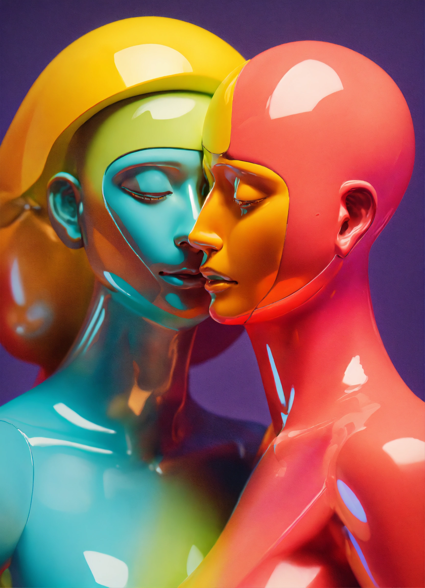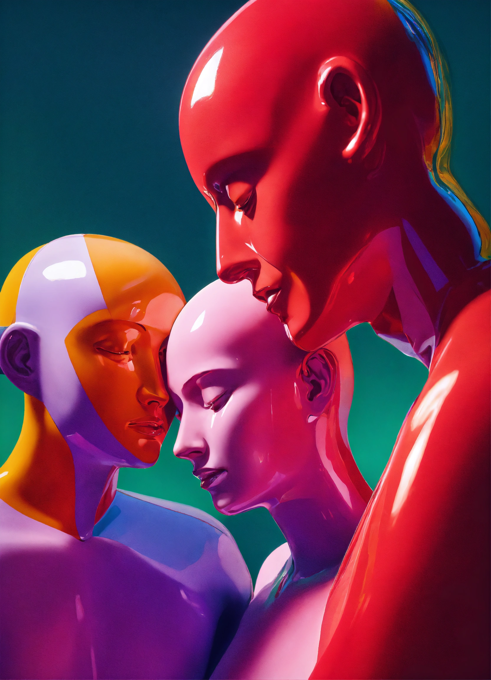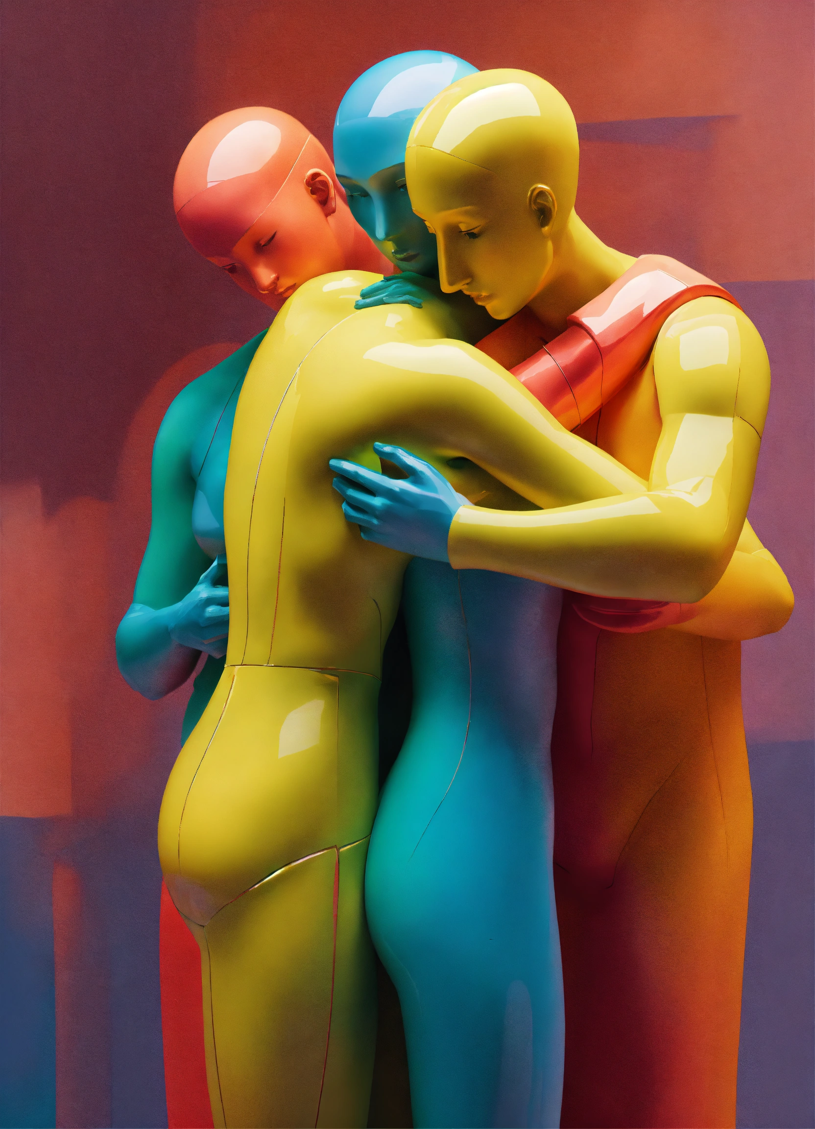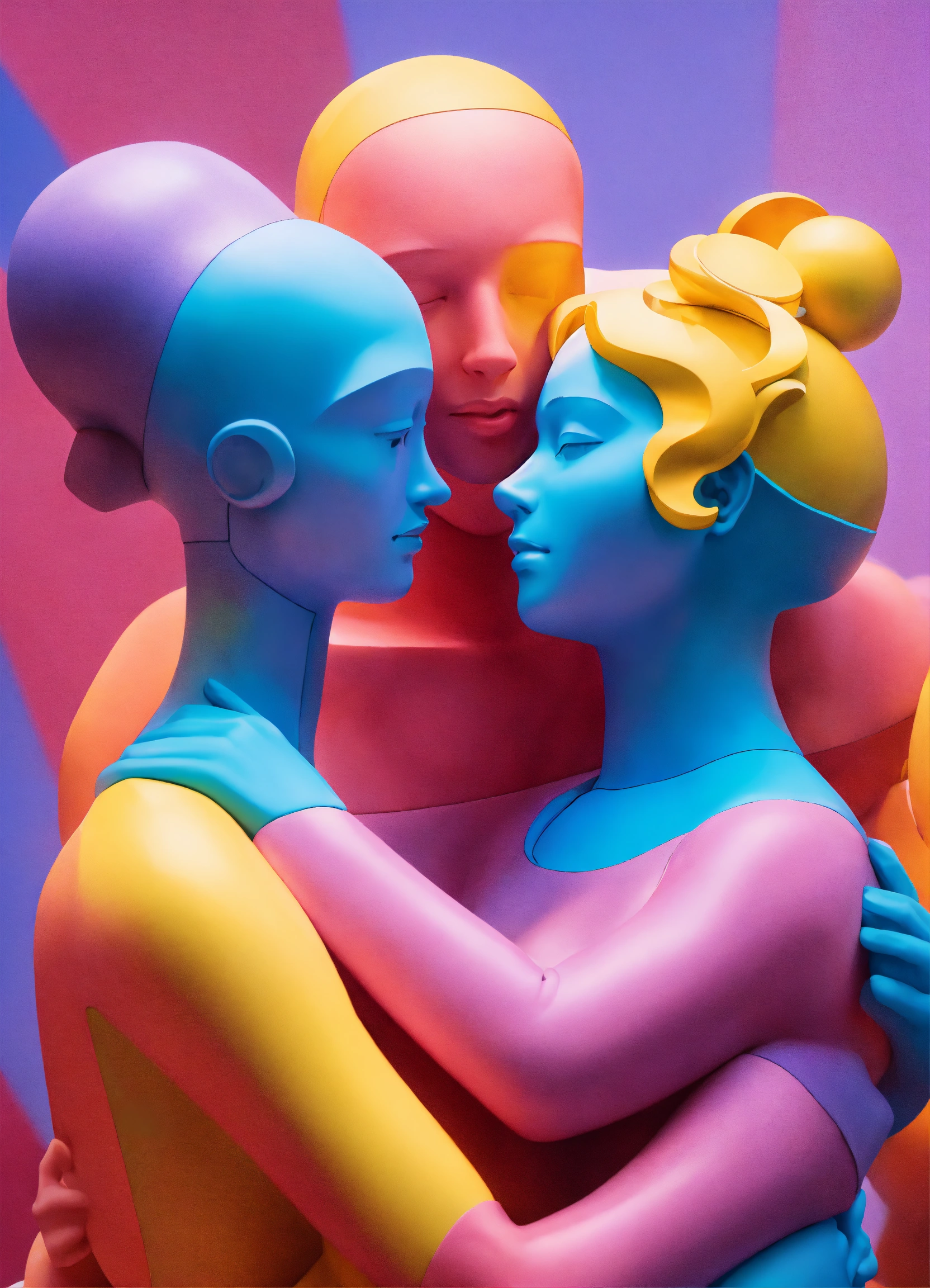A colorful vibrant positive closeup portrait of a group of figurative sculptures showing affection and support hugging each other, by moebius, edward hopper and james gilleard, steven outram colorful flat surreal design, 3d, psychedelic hallucinations style