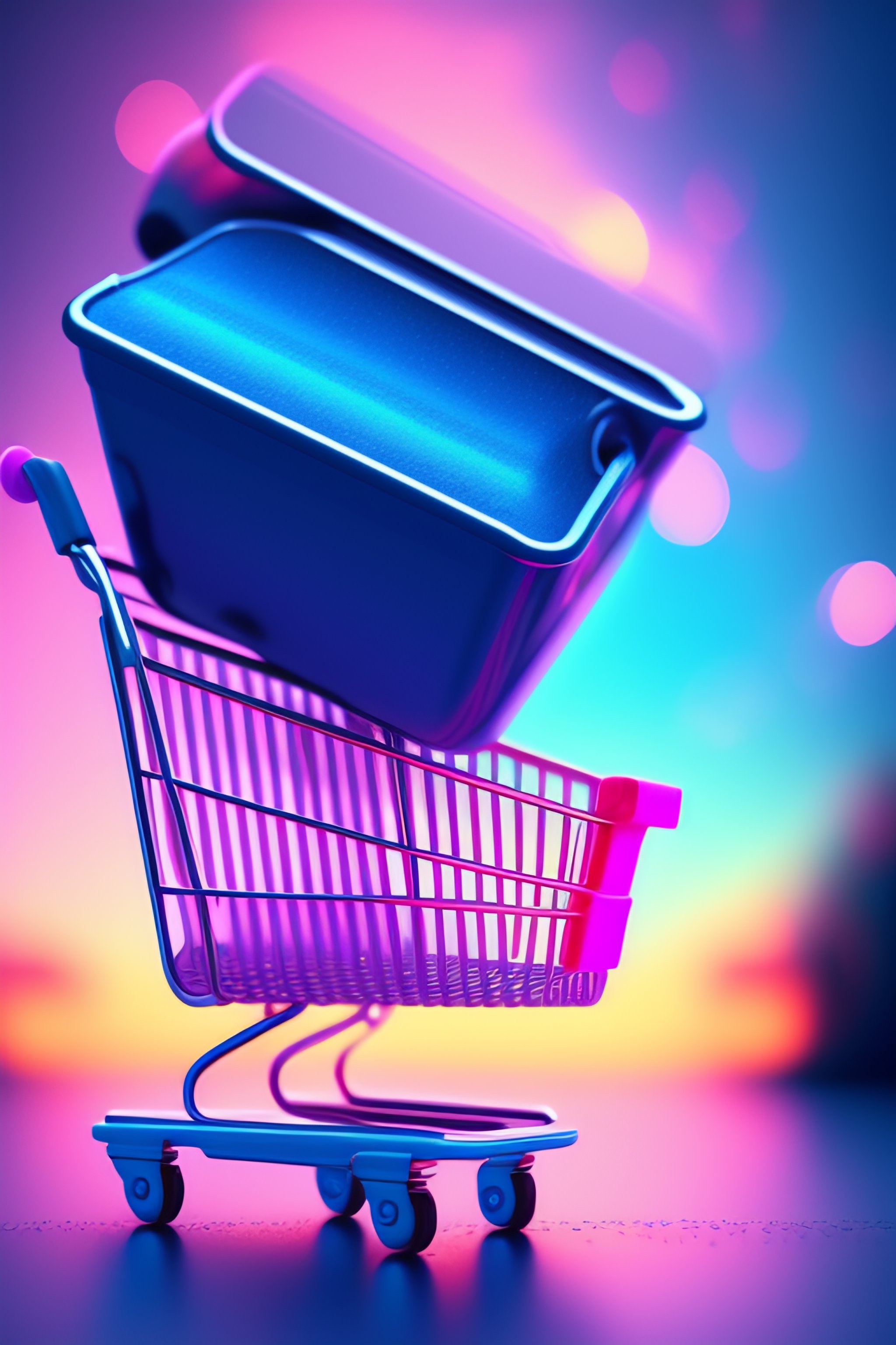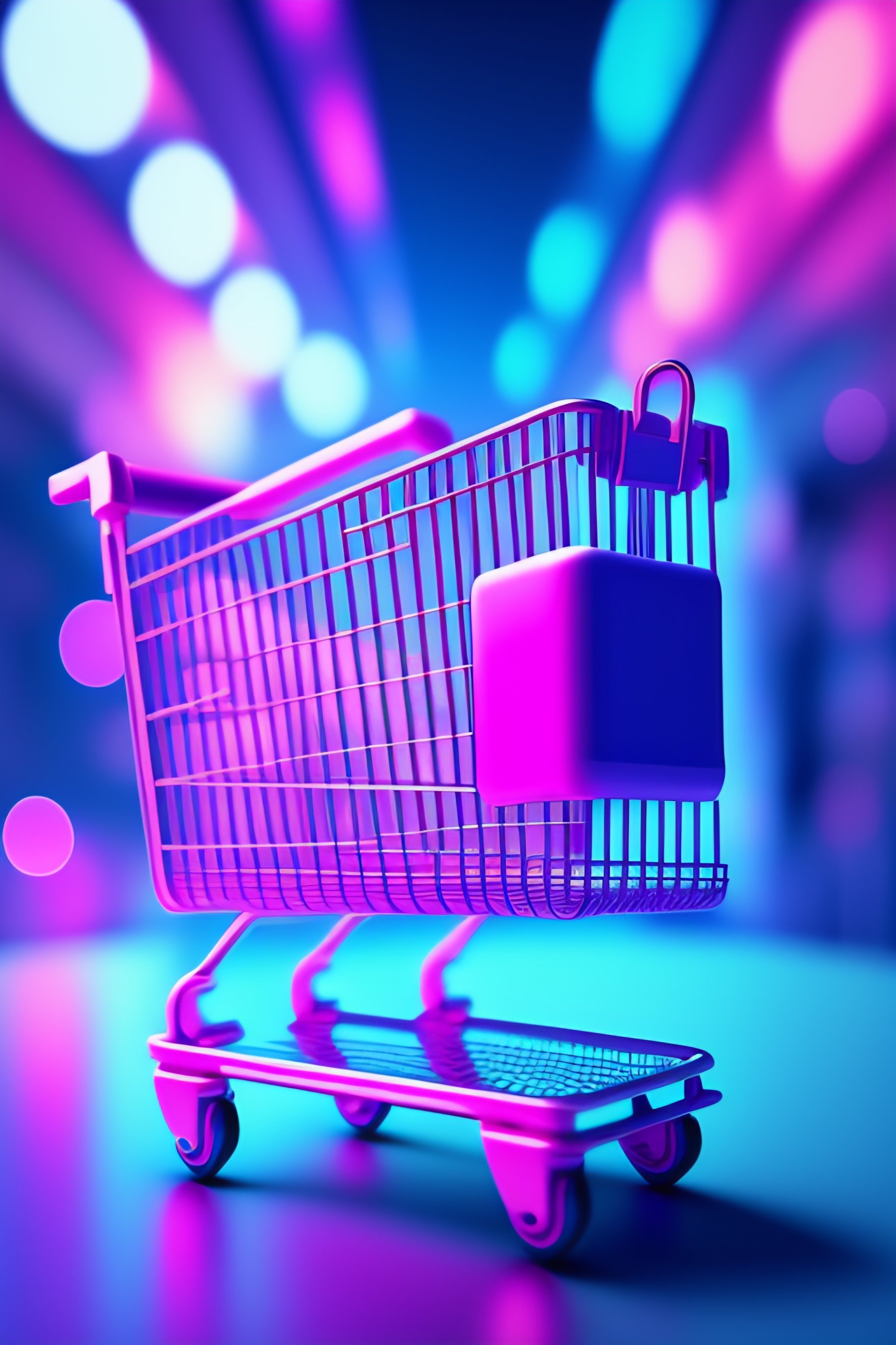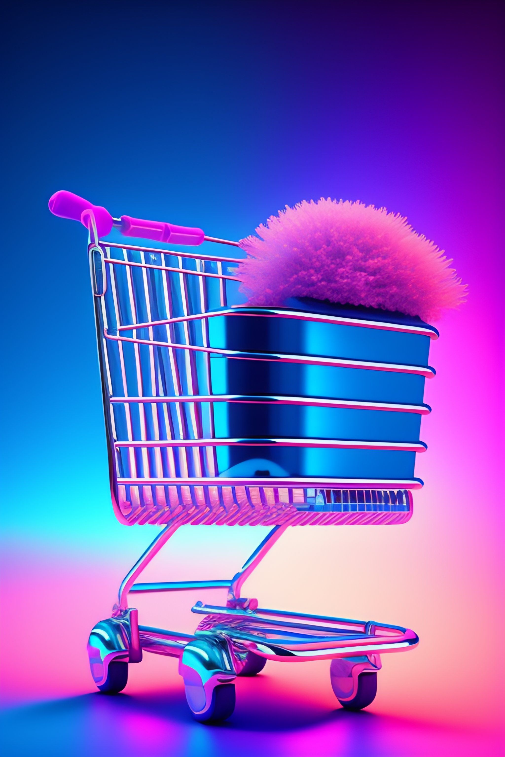 Futuristic loyalty nft in shopping cart, wallpaper in vaporwave aesthetic, photorealistic, blue and pink