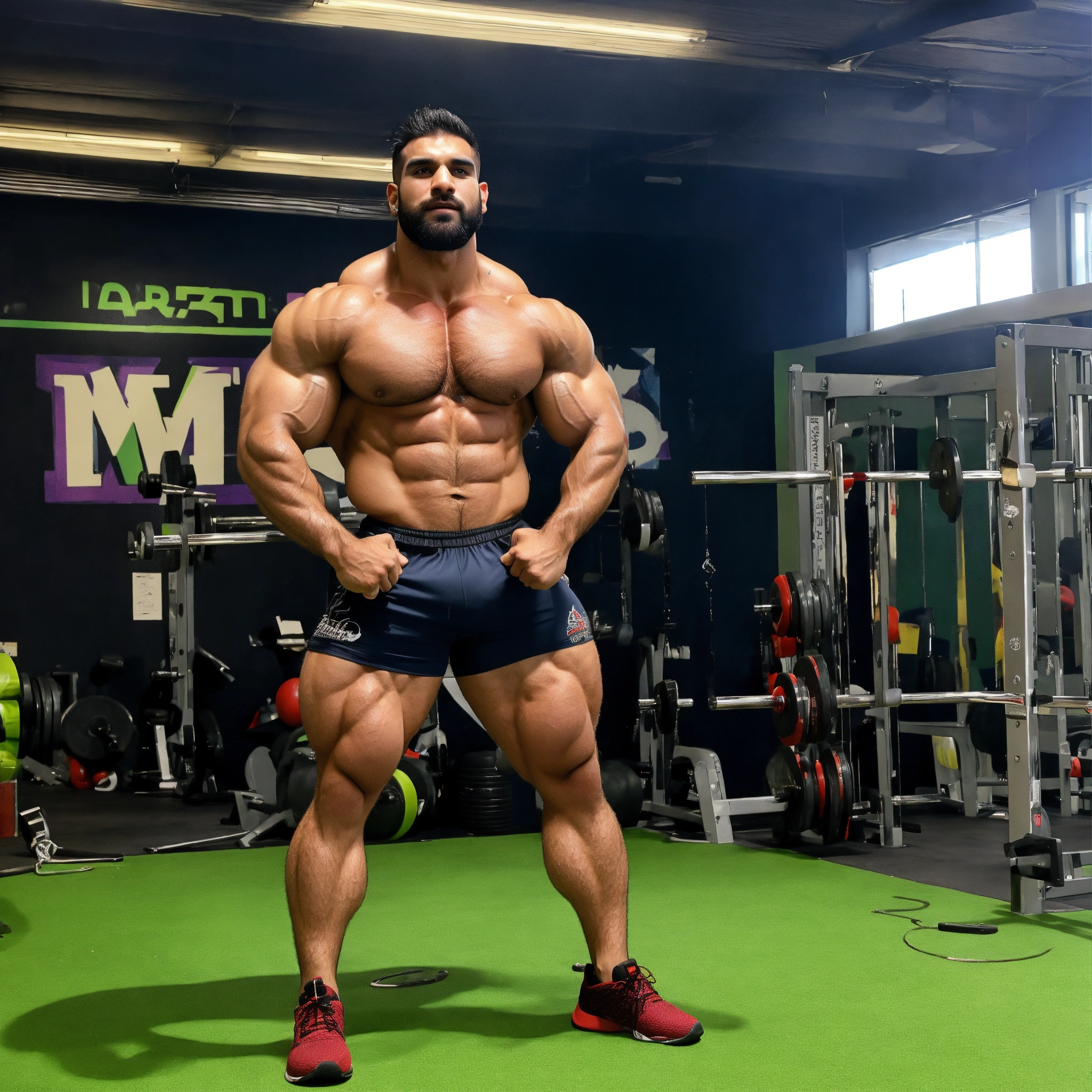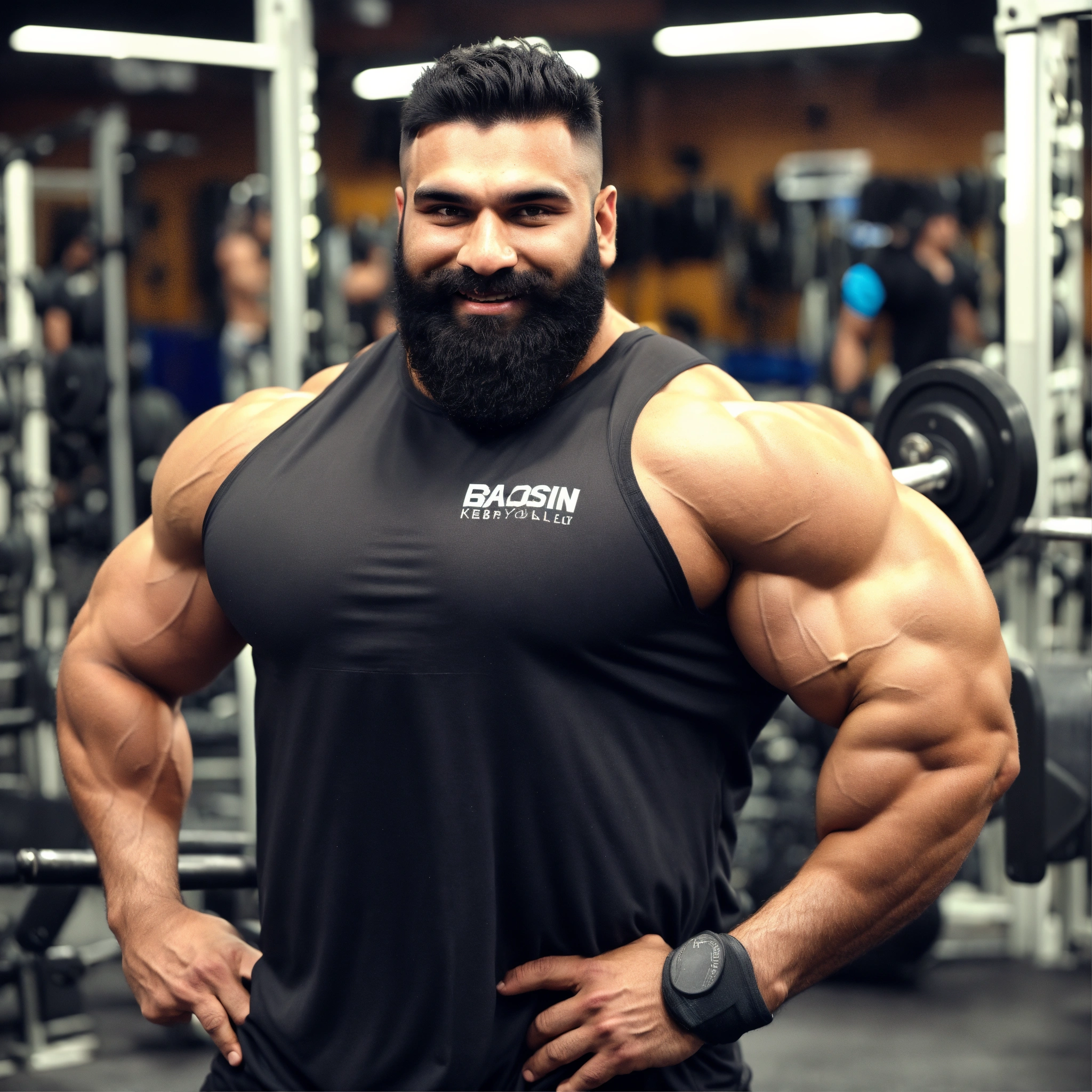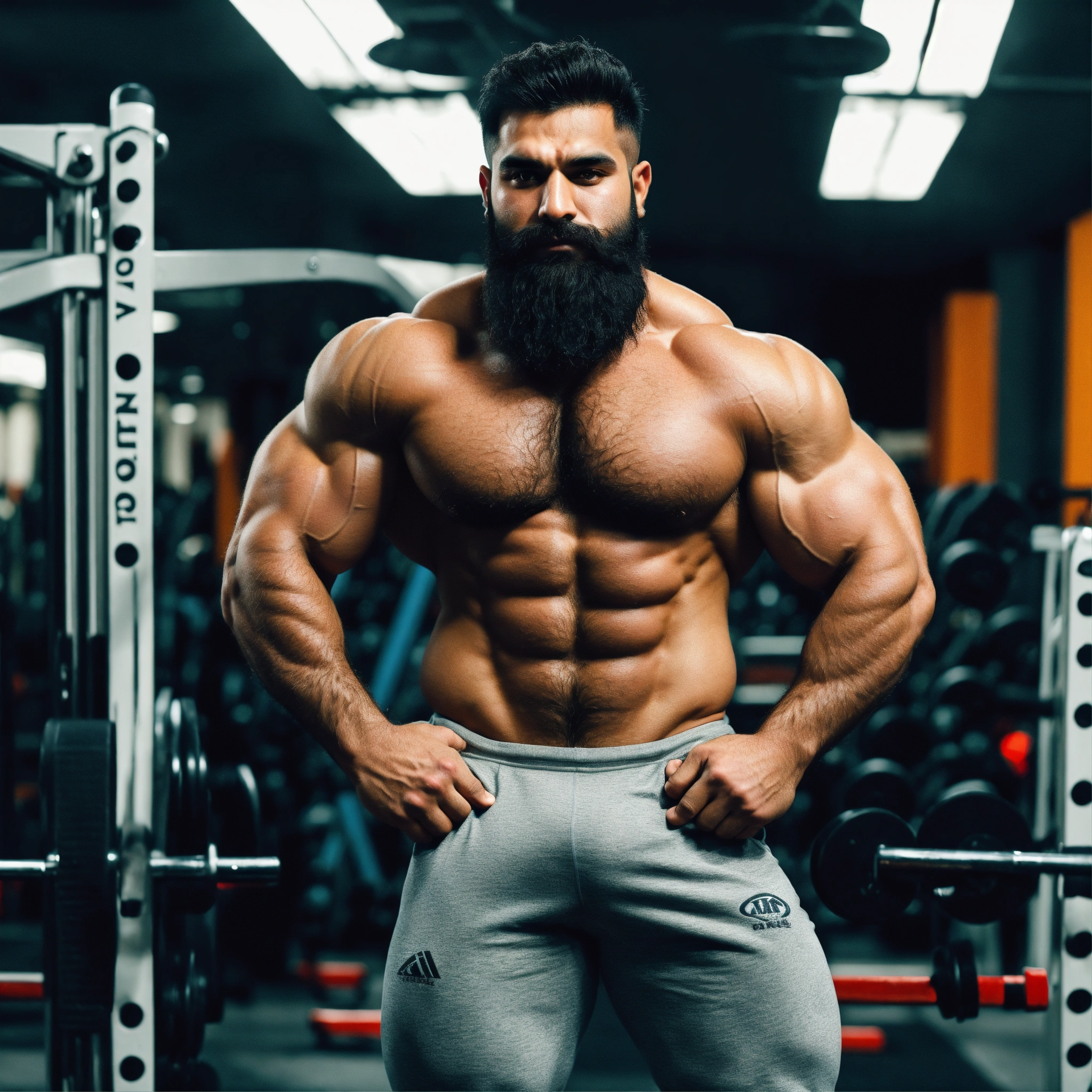 30-year-old hairy man with big muscles, wasim khan, big bodybuilder, body like a wrestler, at the gym
