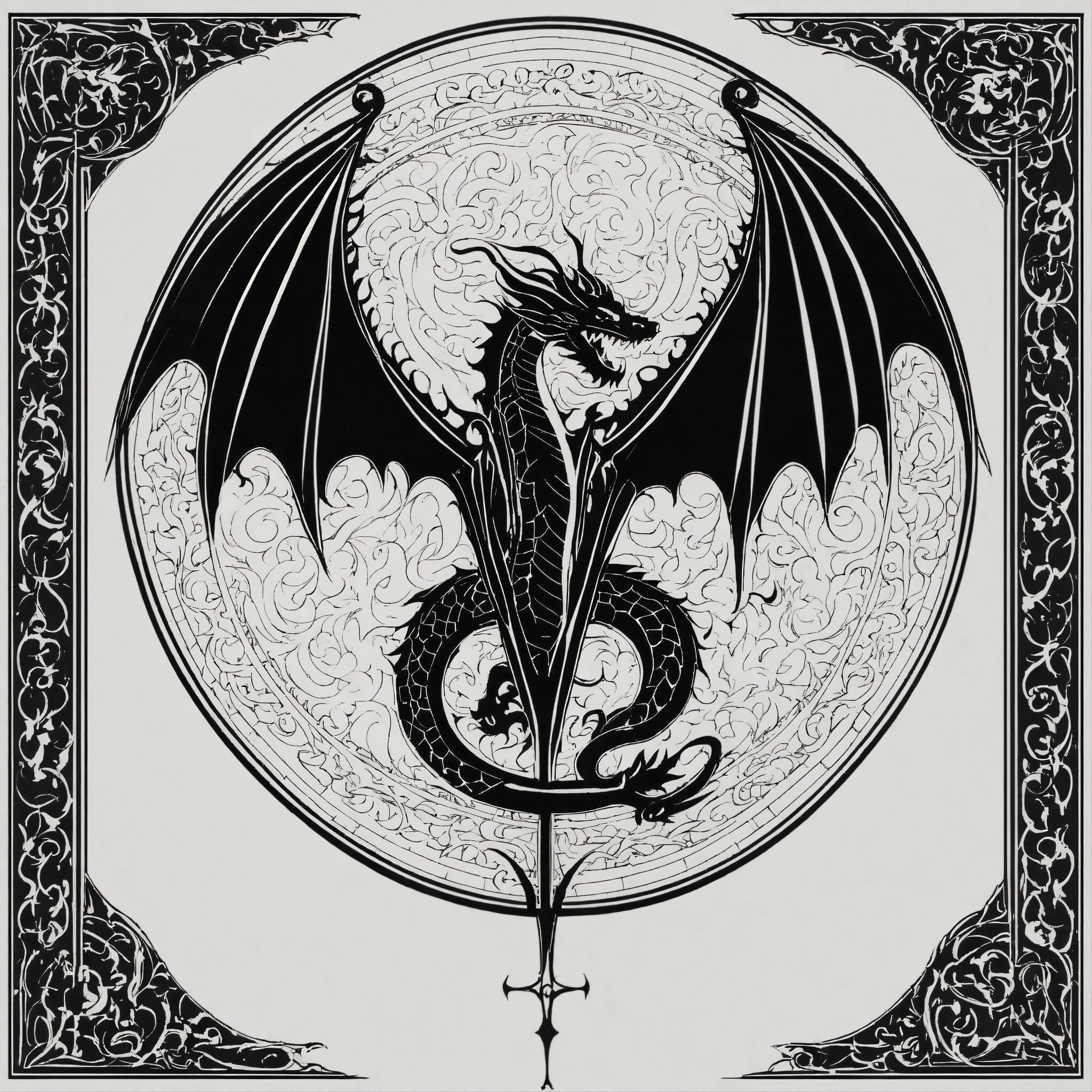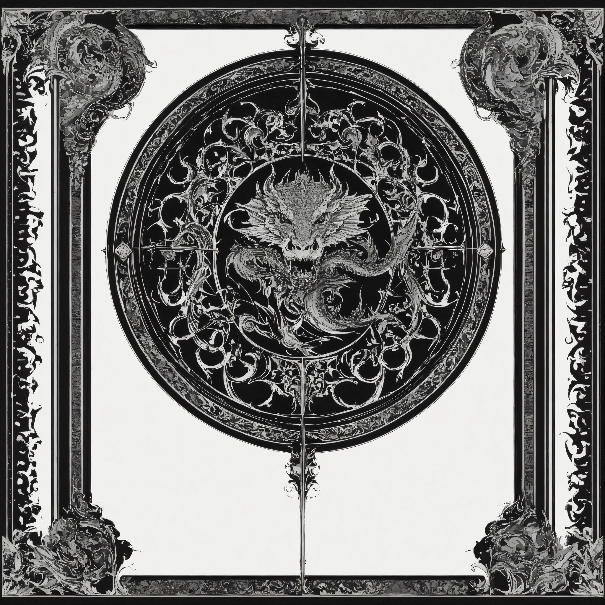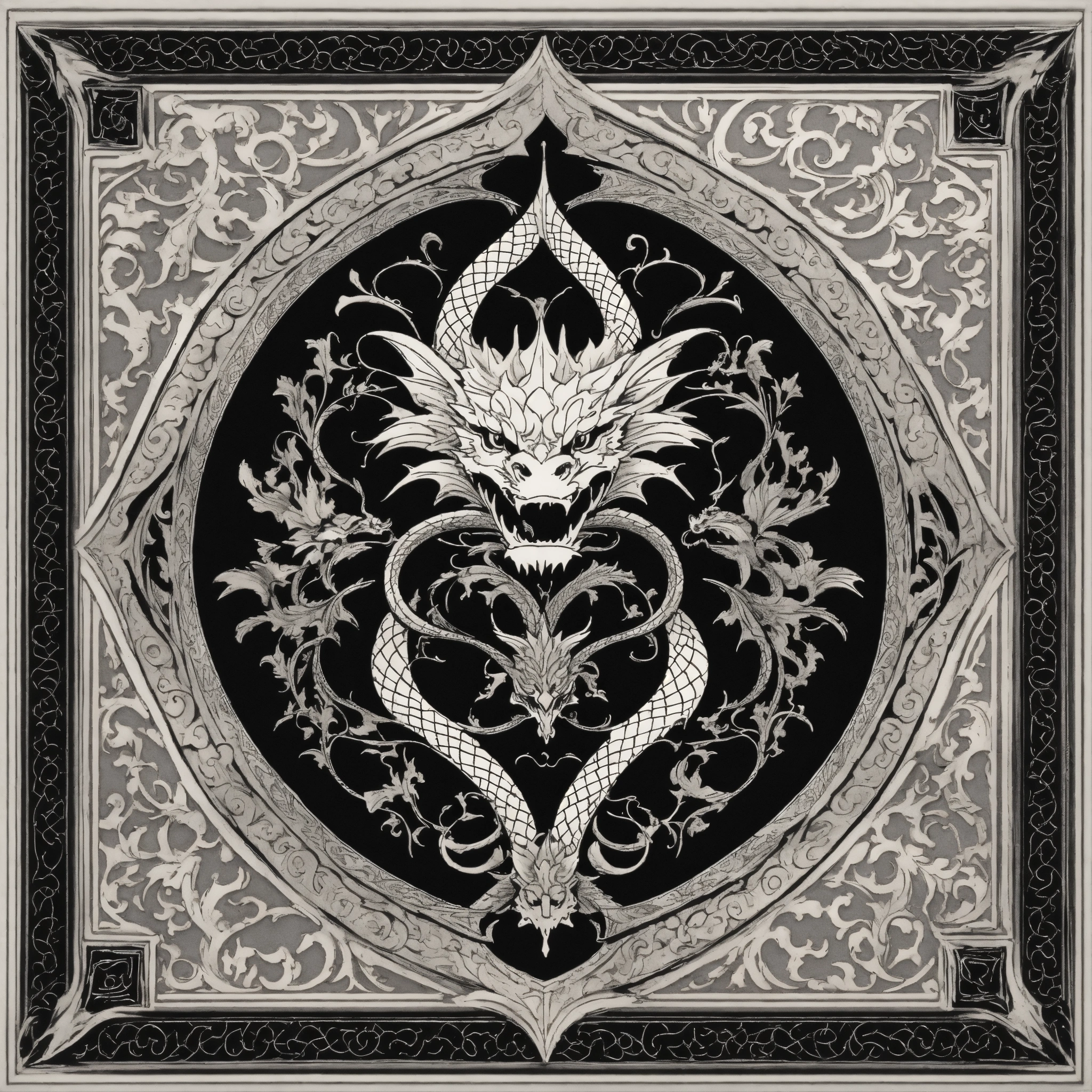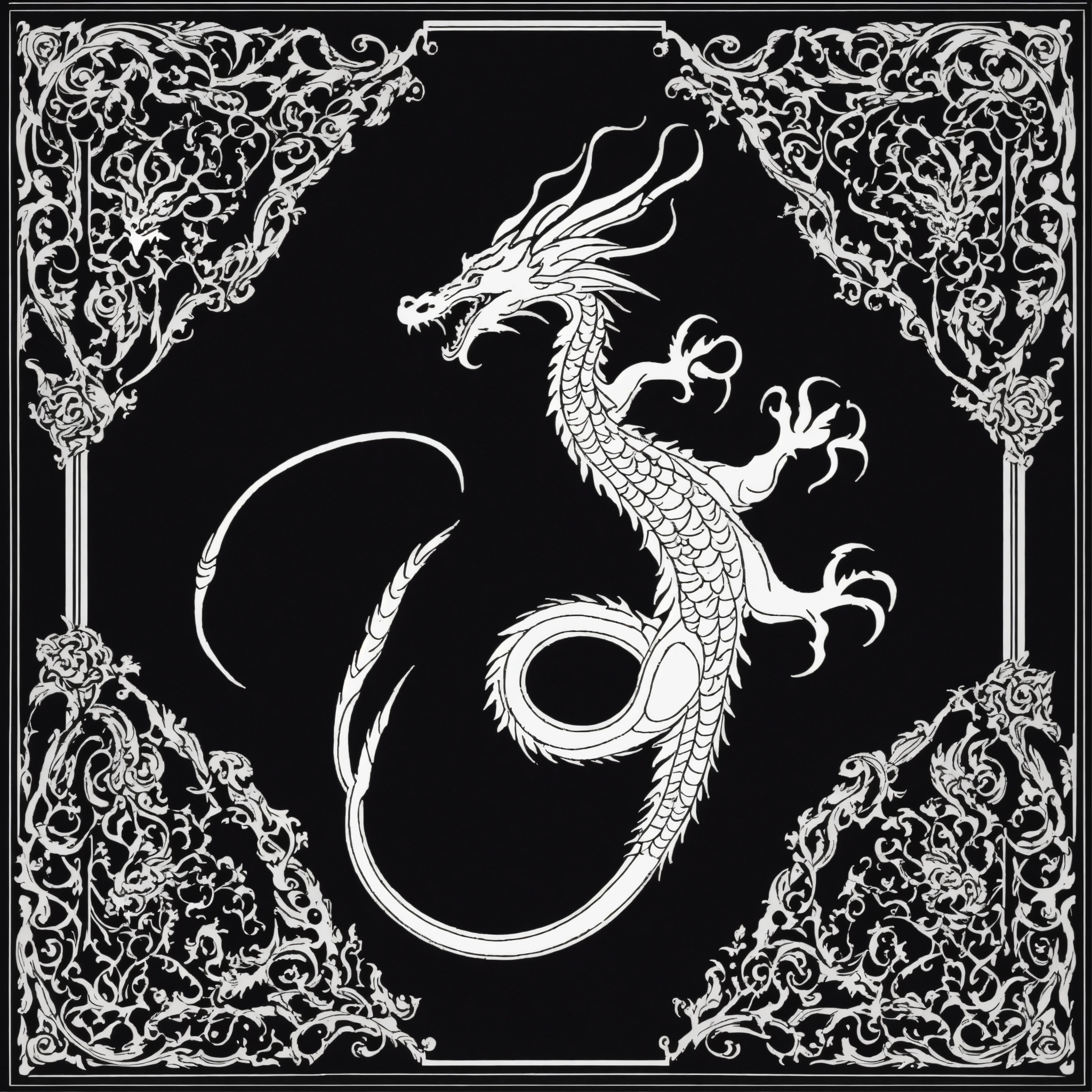 Black and white thin gothic ornament in the form of a straight line in the shape of a dragon
