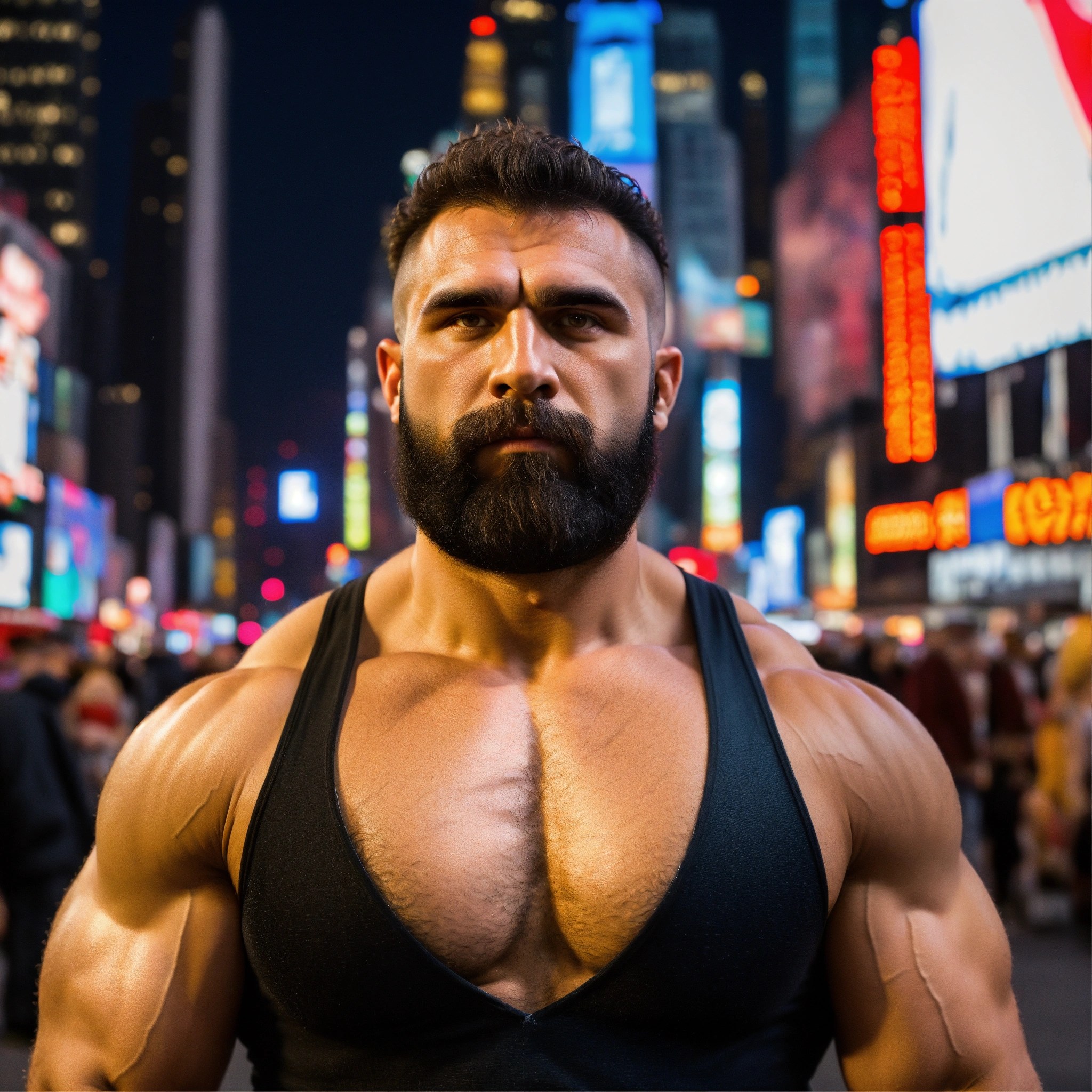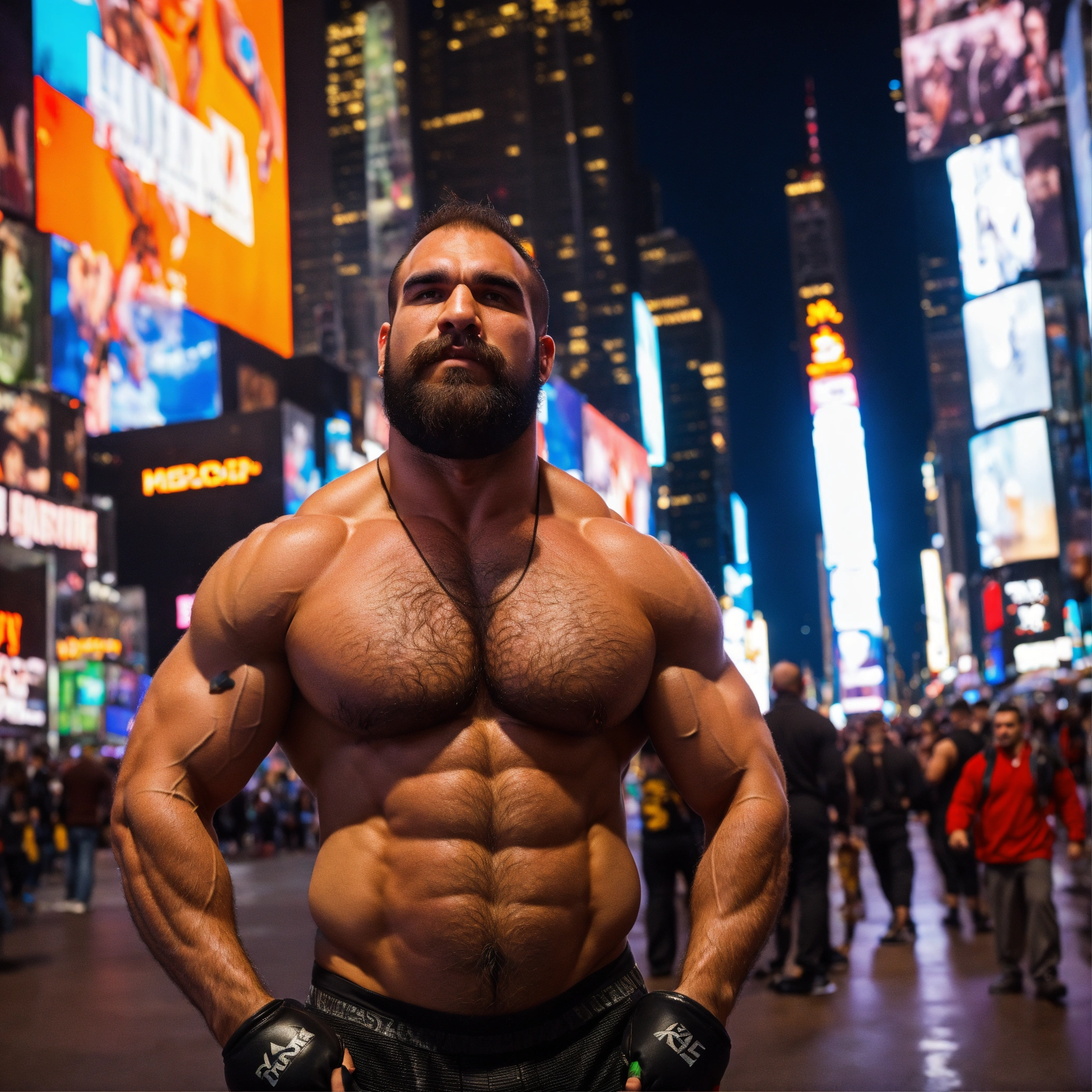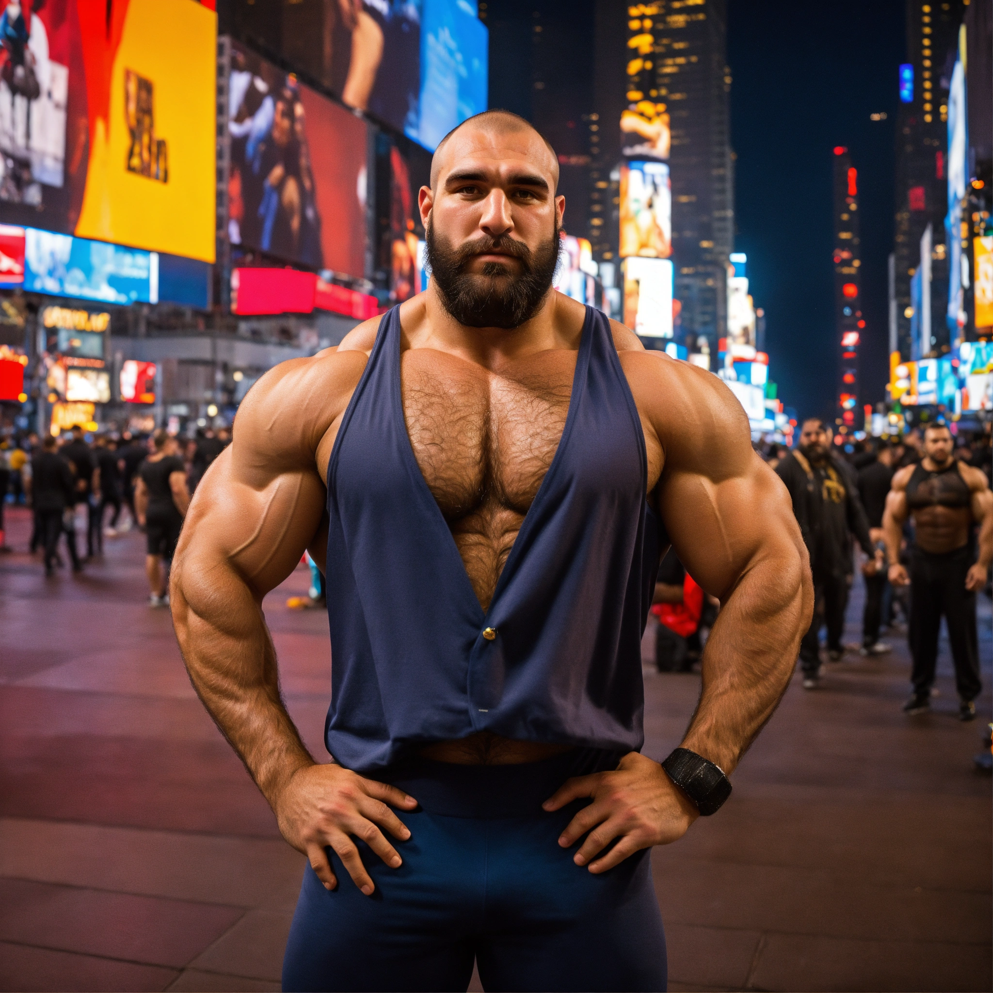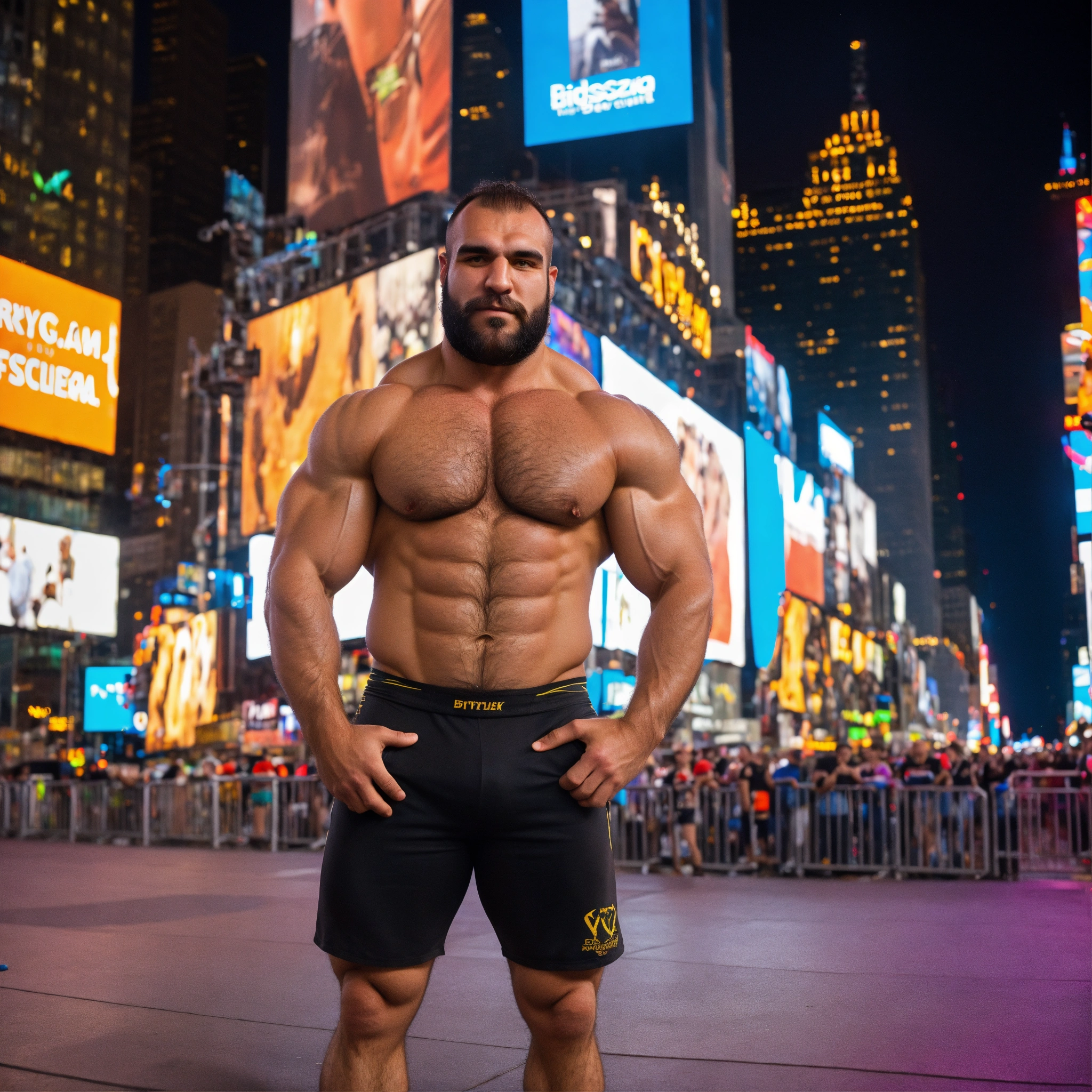 30-year-old hairy bulgarian man with big muscles, big bodybuilder, body like a wrestler, in times square at night