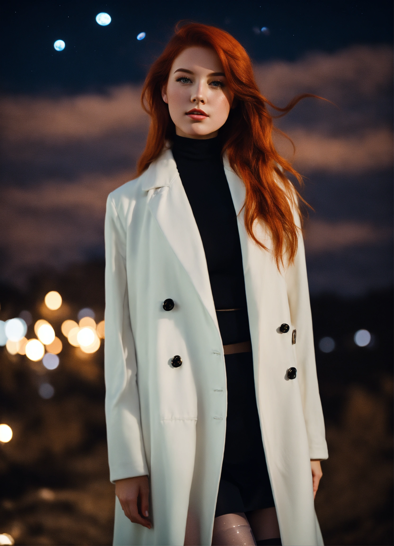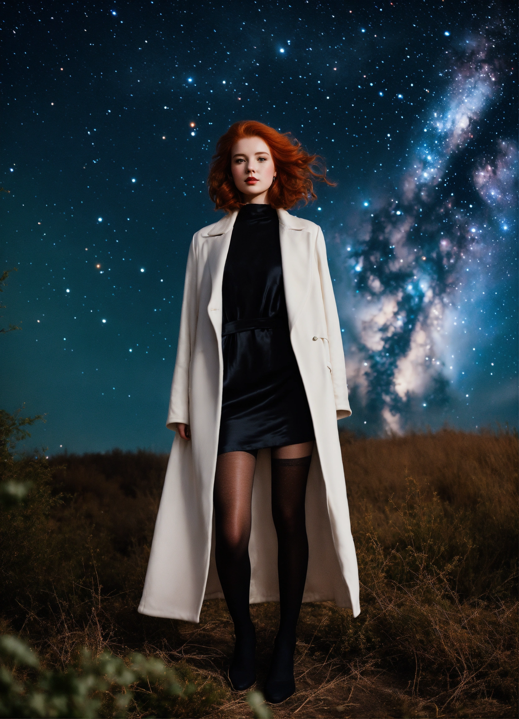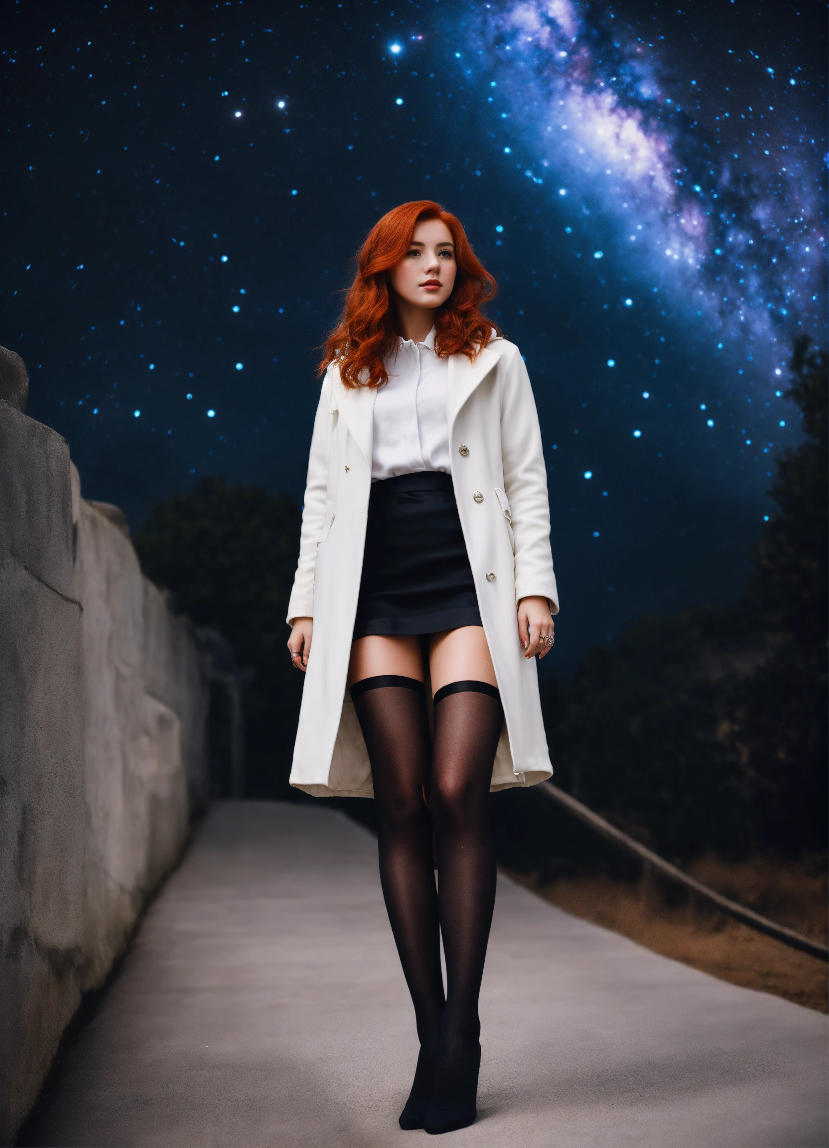 A real photo of a 23 year old redhead princess girl, wearing shiny black silk stockings and a white overcoat. in the sky we see the galaxy