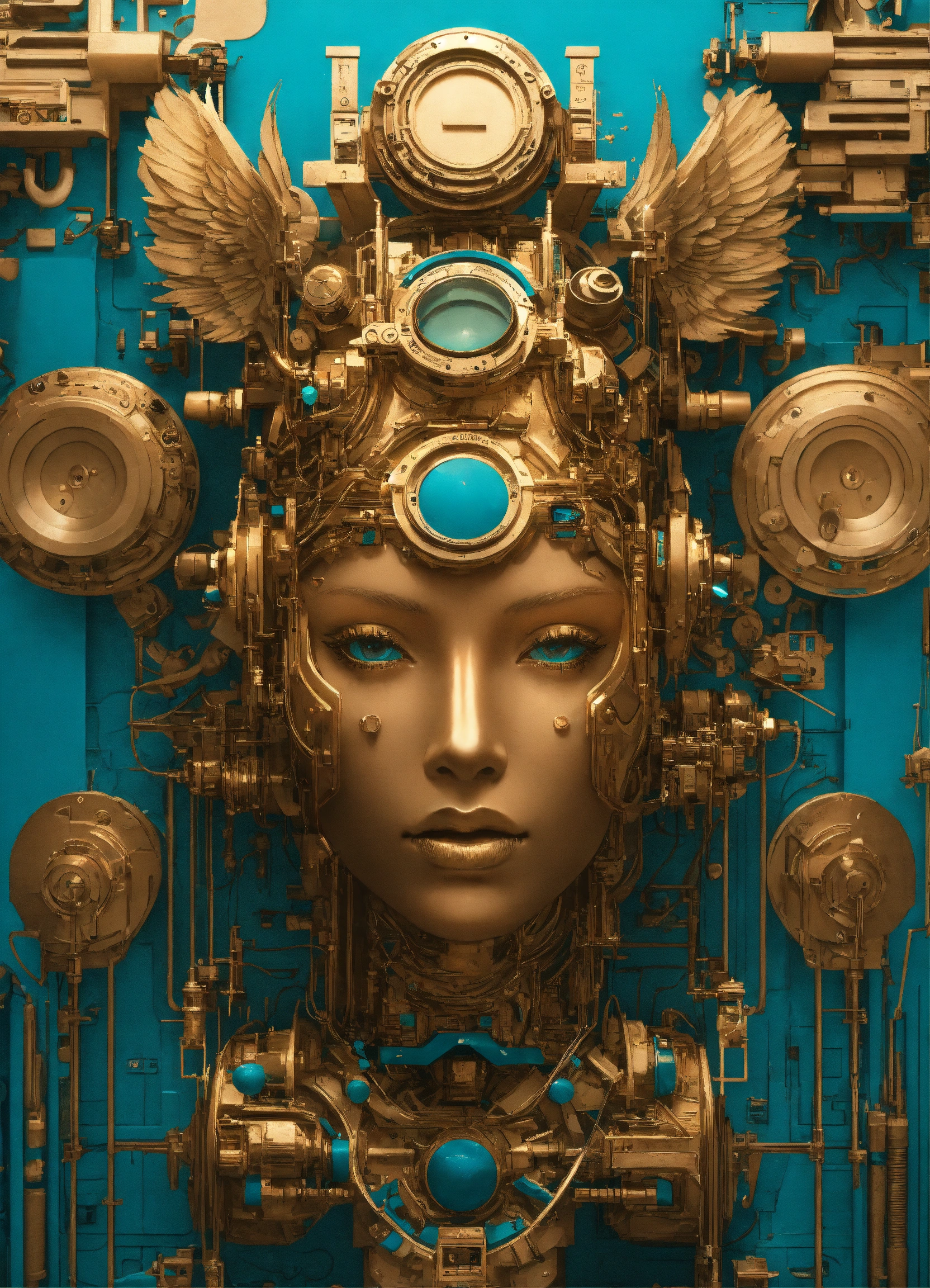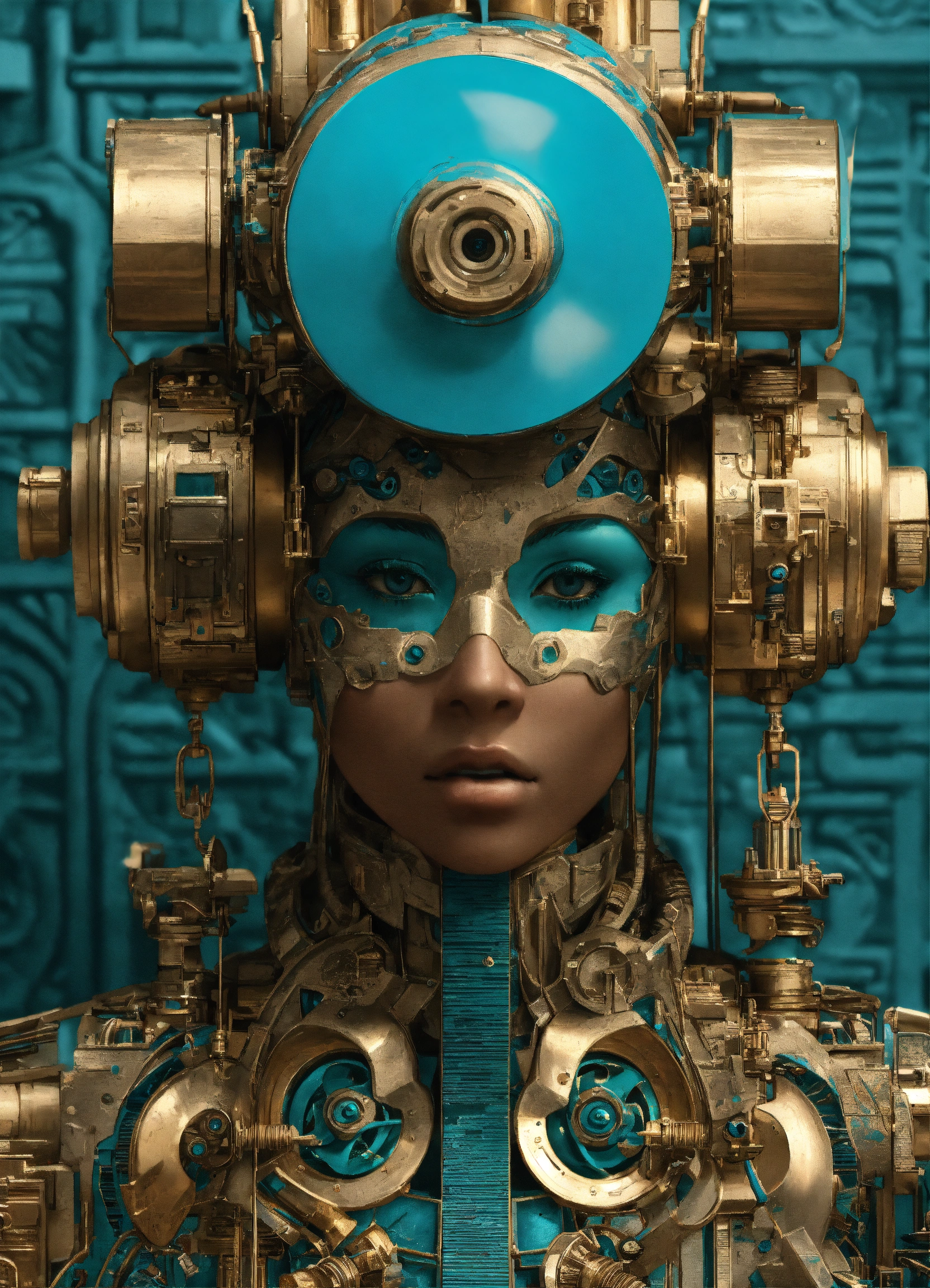 3d wallpapers, in the style of dark turquoise and beige, afrofuturism, relief sculpture, light azure and bronze, in the style of hyper-realistic sculptures, colorful metal engraving, hyperrealistic murals, dark white and turquoise, captivating gaze, gold and bronze, mechanical sculptures, celestialpunk, cyberpunk had with movimaking elements in head, movie making accessories, surreal cyberpunk iconography, camera lens, moive making equipment elements, cranes, trolly, dolly, lights, clap board, momento base design from shoulders