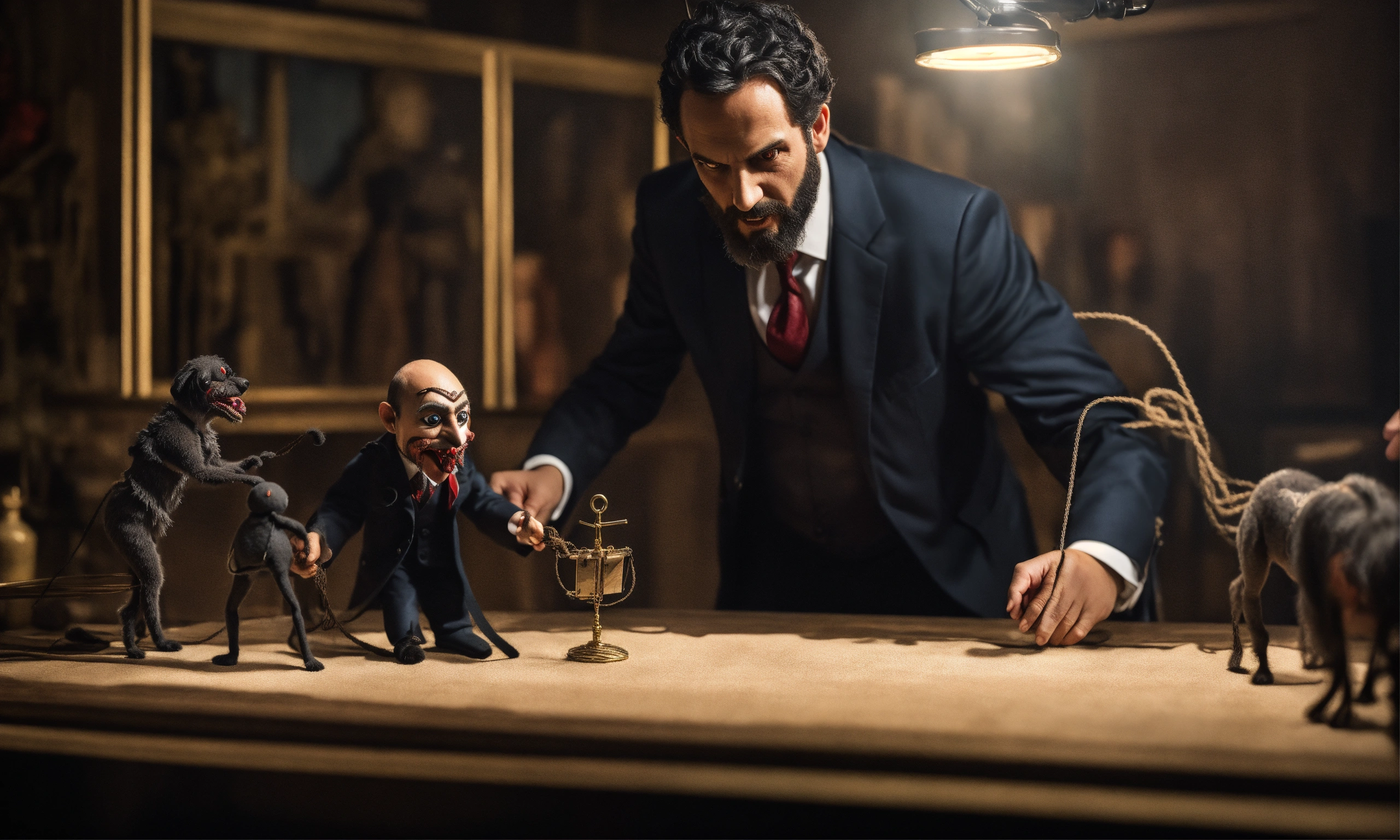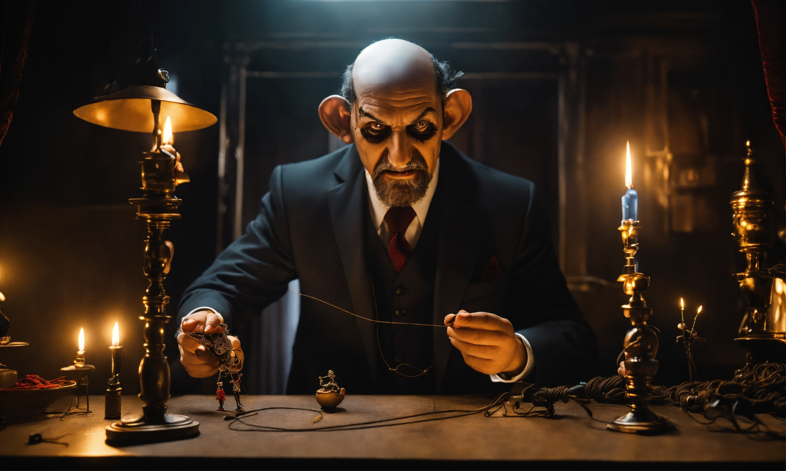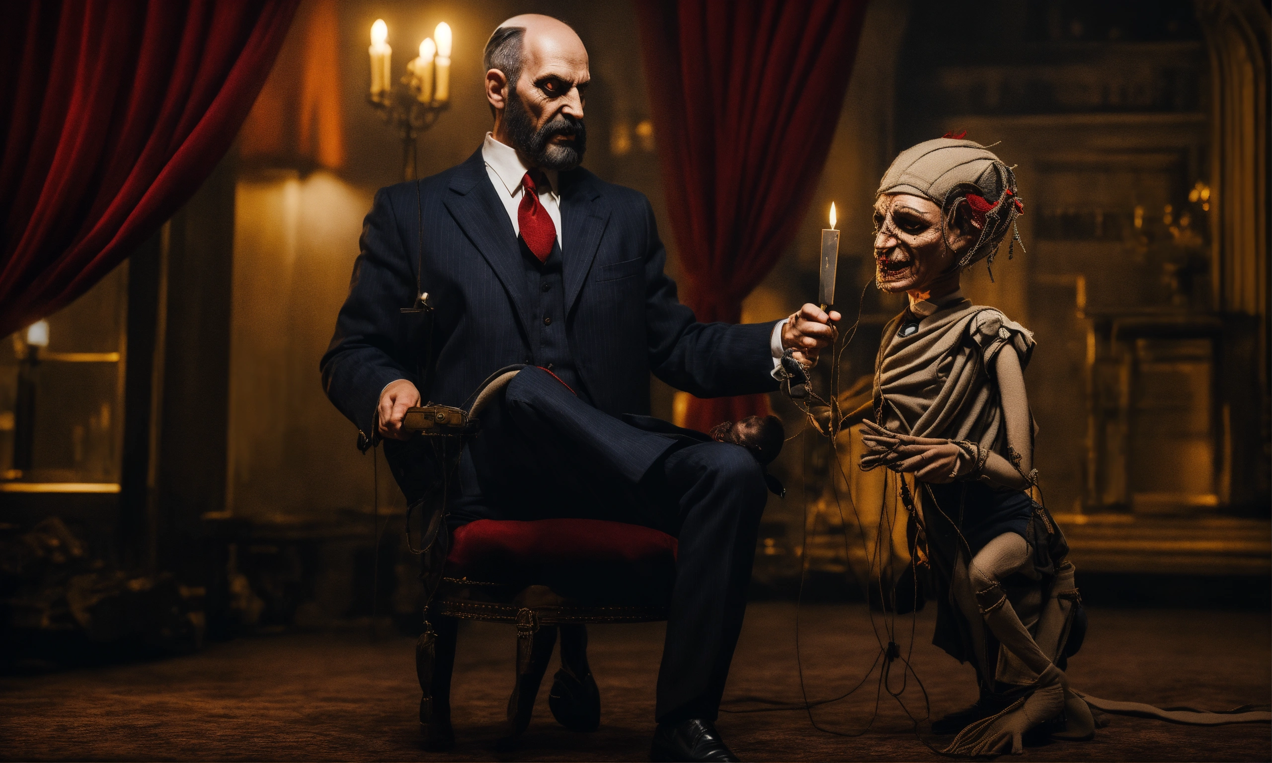 Jew puppet master puppateering of a person in a business suit. jew pulling the strings of puppet. evil, demonic, insidious, ominous, highly detailed and realistic, inspired by apollyon