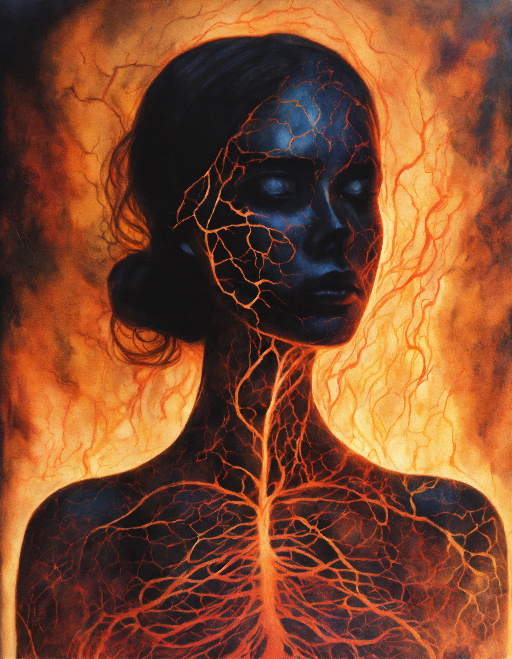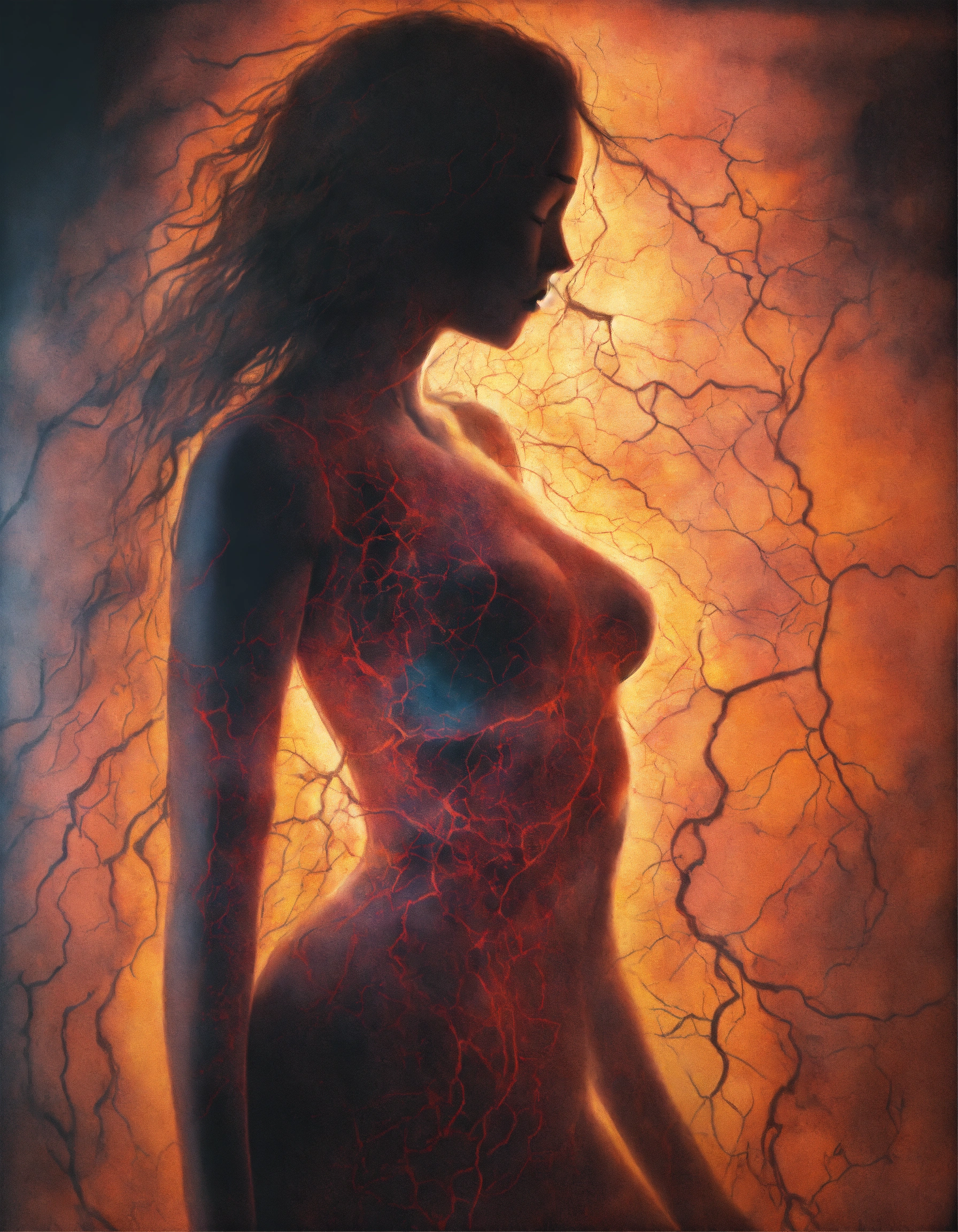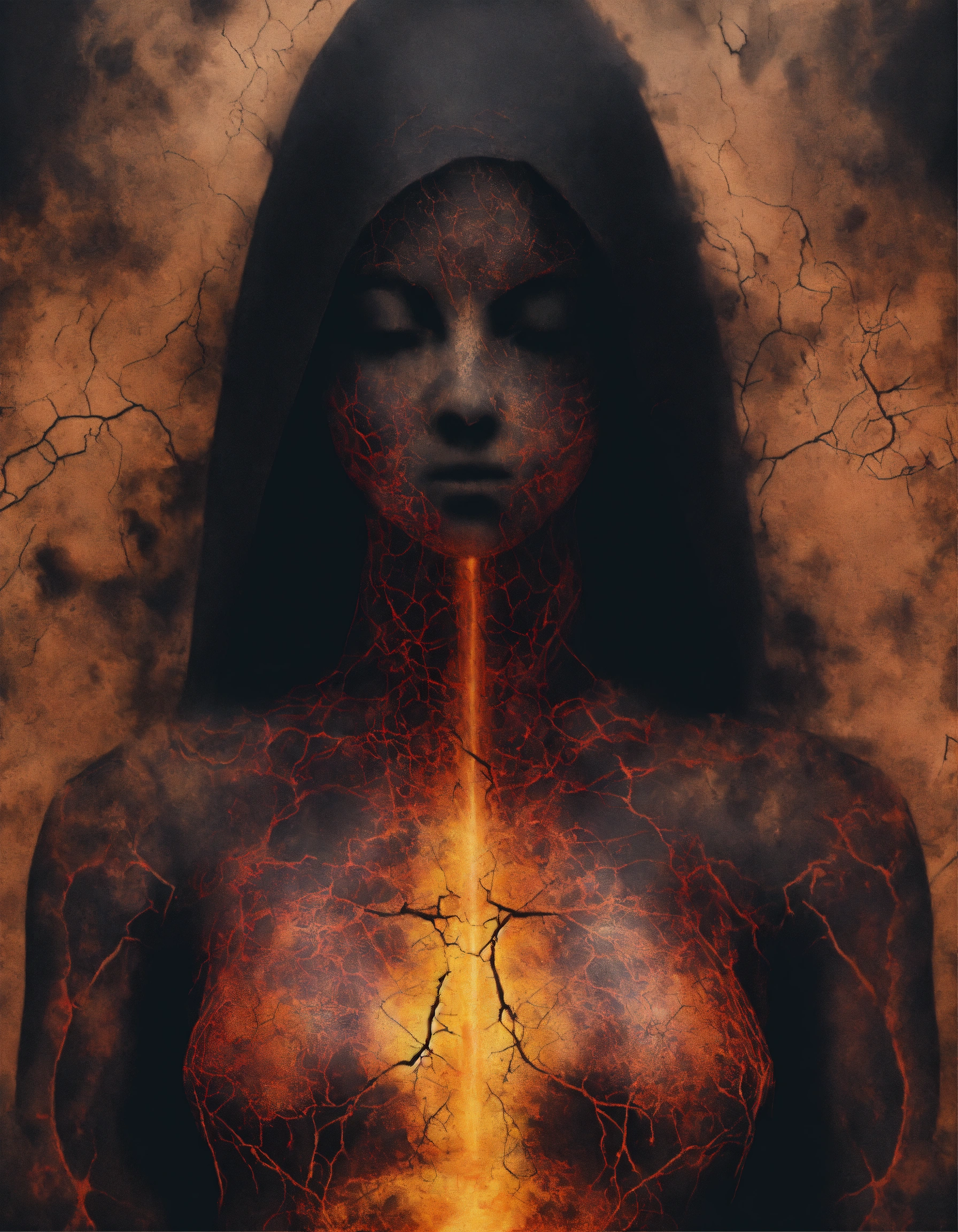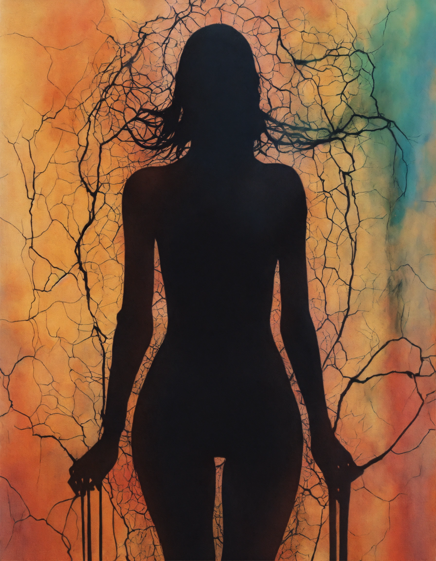 I draw an illustration of a female silhouette of an spiritual body, no face, with a film around that body. cracks and black smoke in this film around the body. spiritual art. cracks in the aura. colored pencil.
