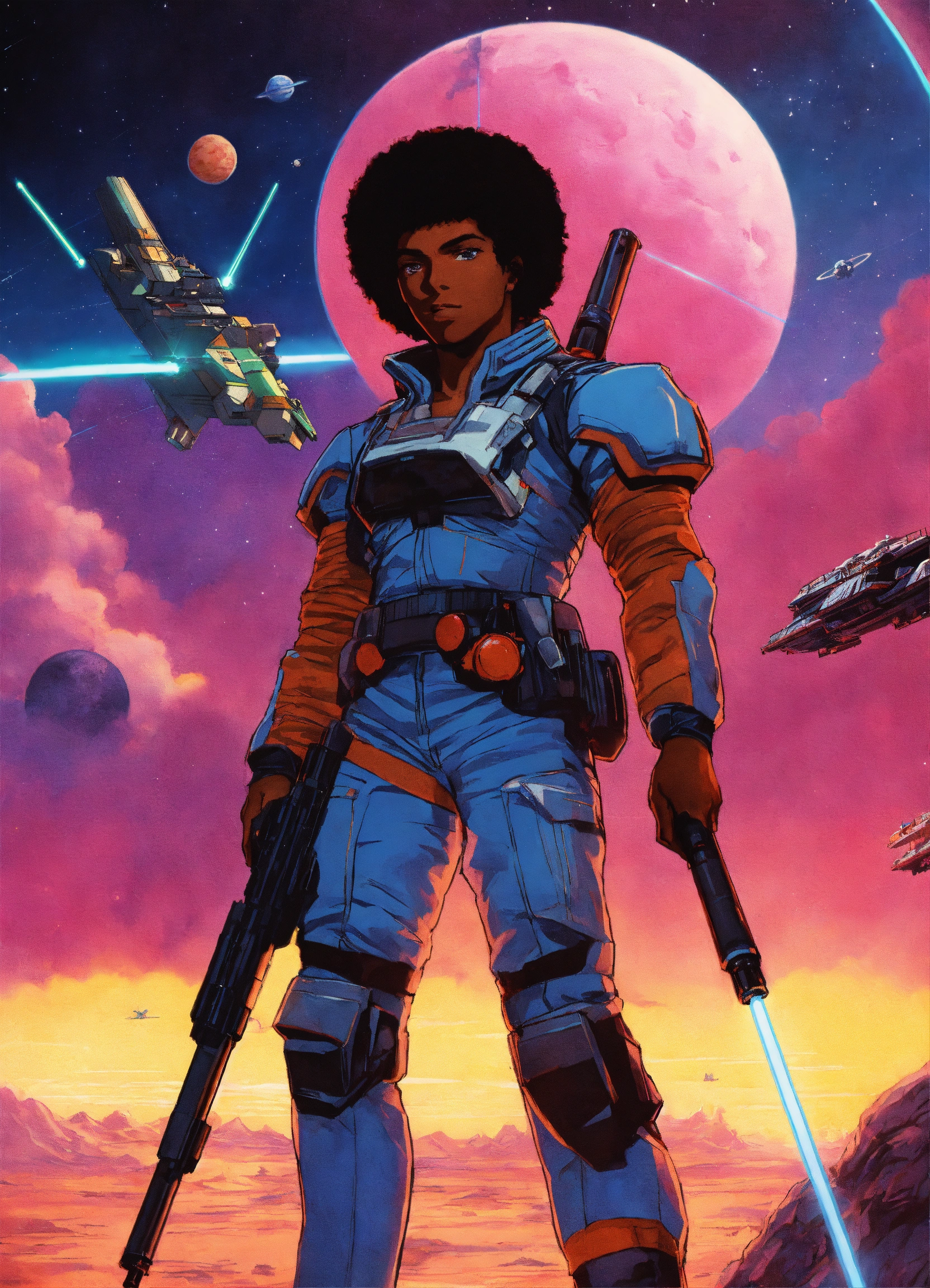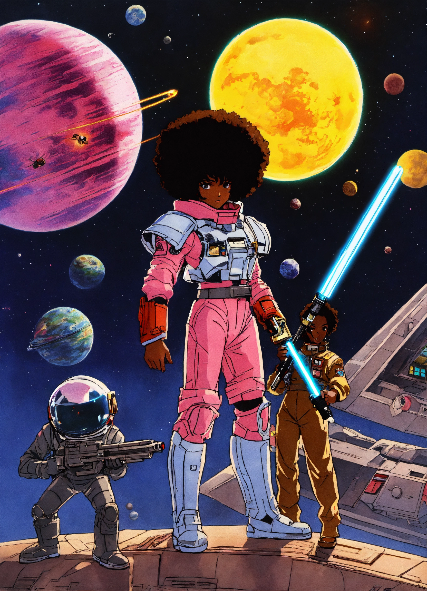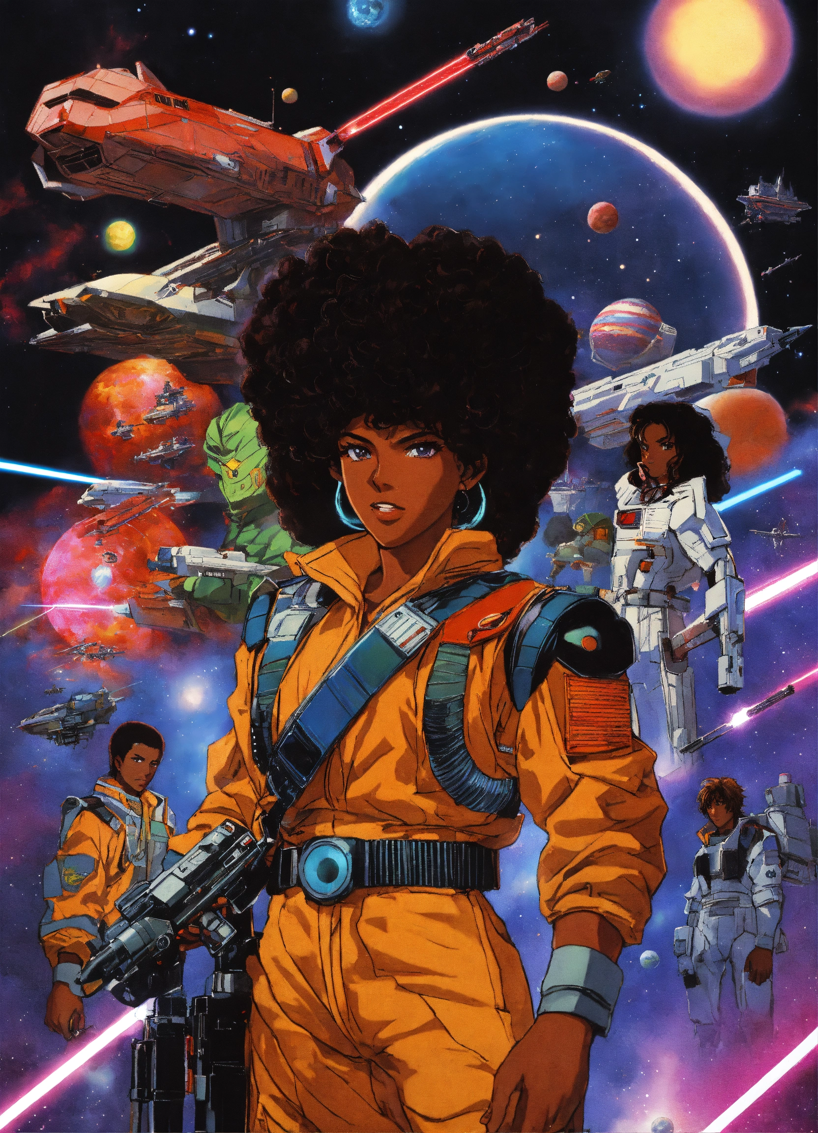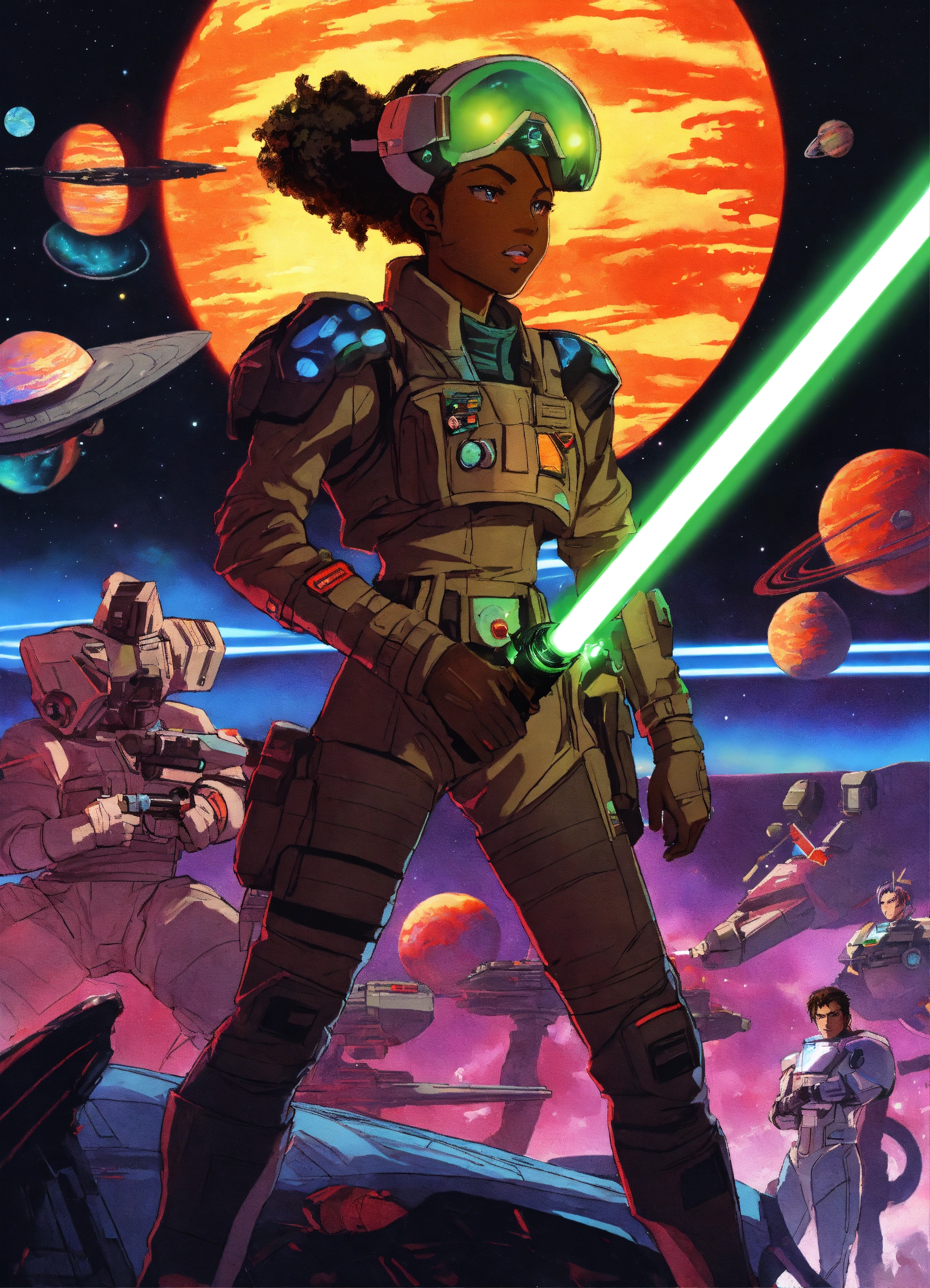 80s anime black characters sci fi space ships laser guns lightsabers pilots good evil planets fighting aliens