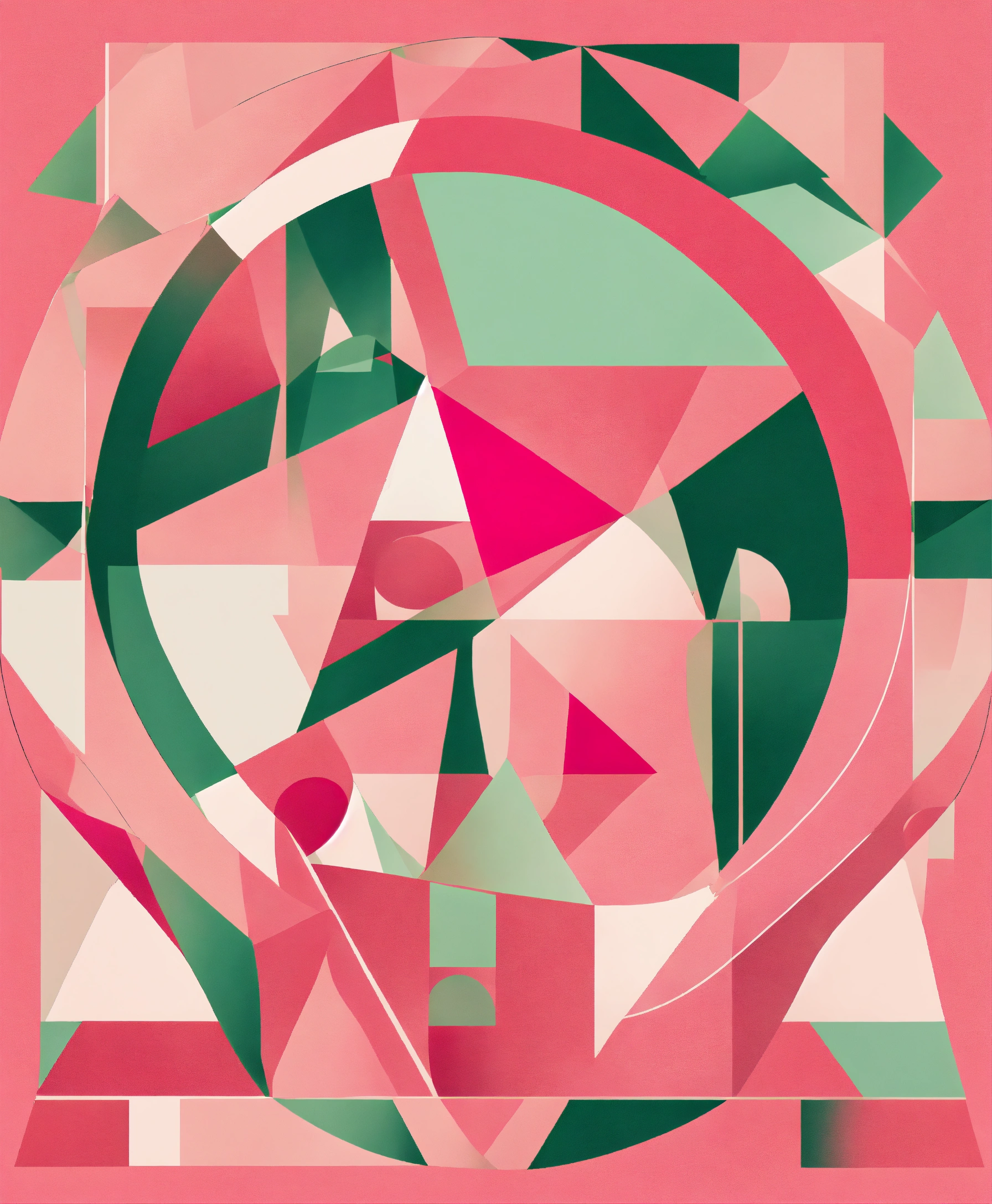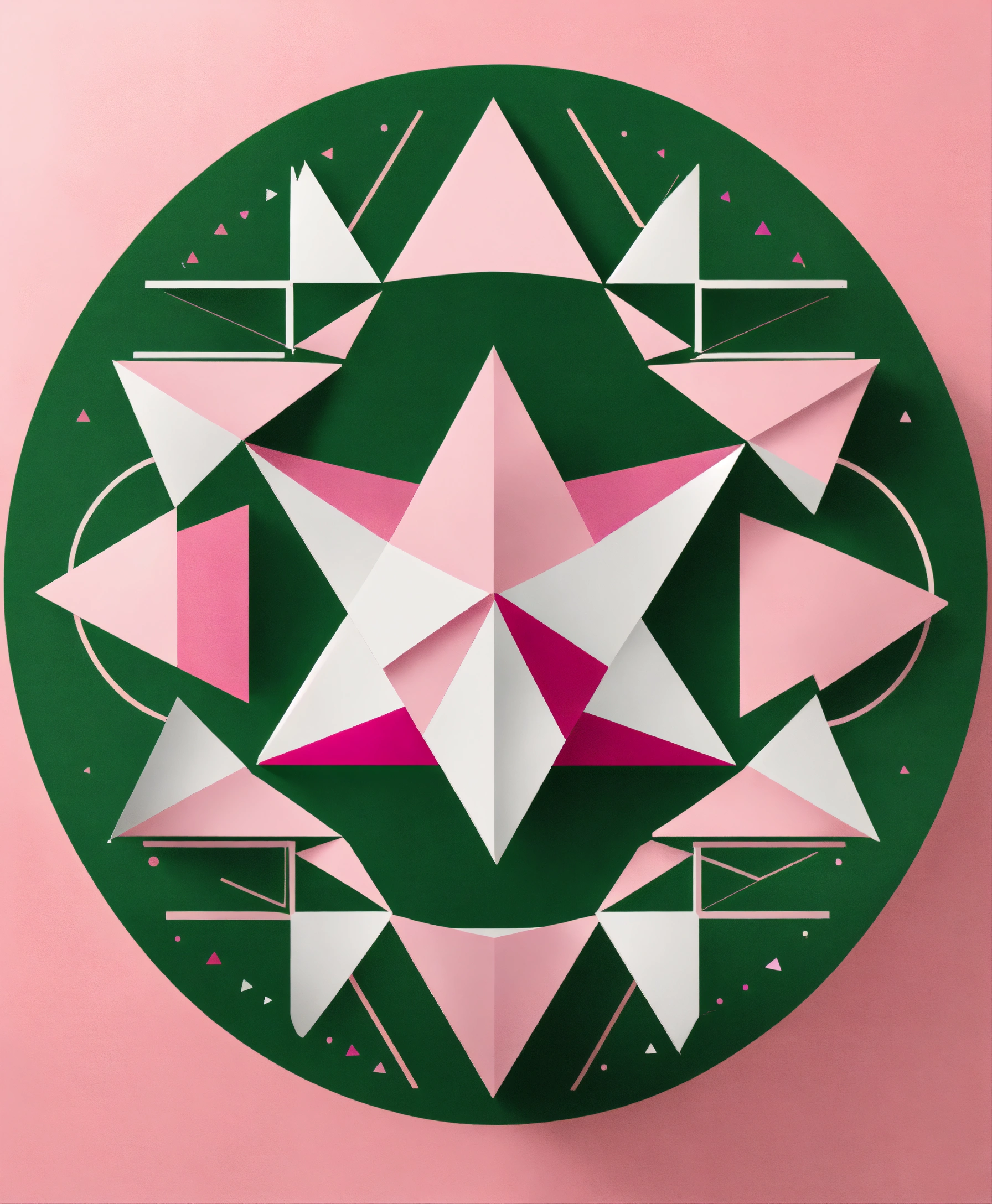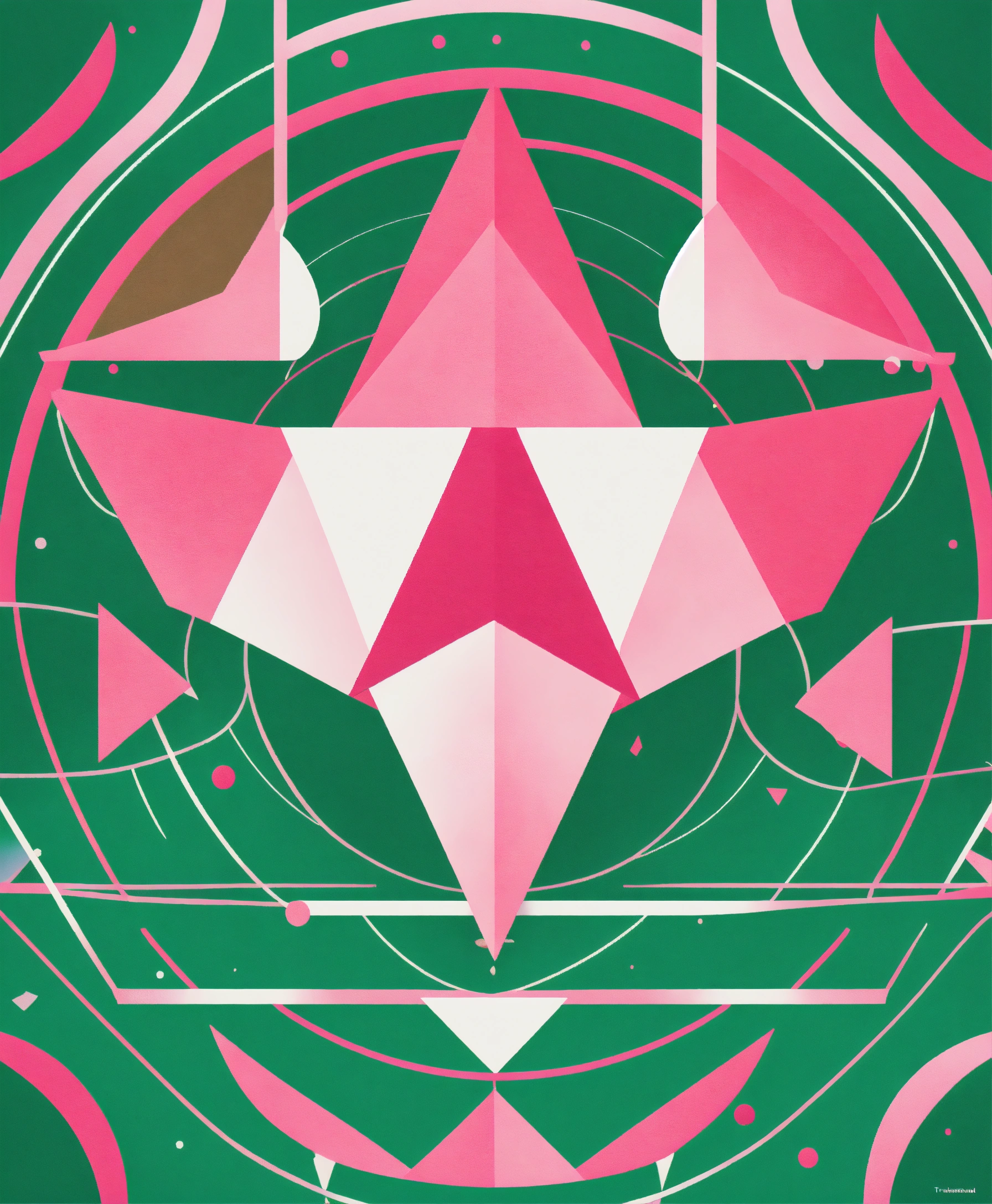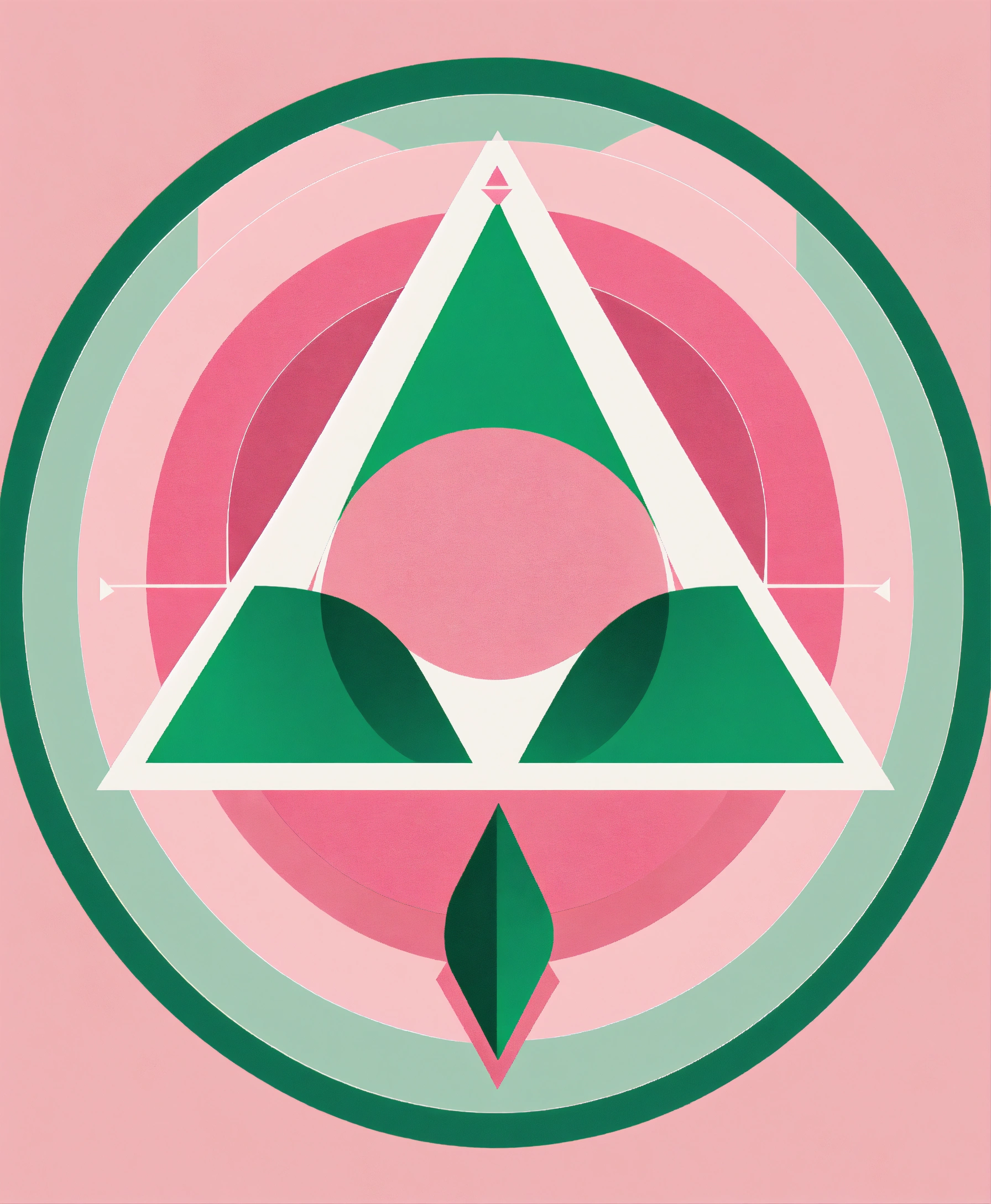 A magical minimalist symbol made up of circular and triangular shapes. predominant colors pink, white and green.