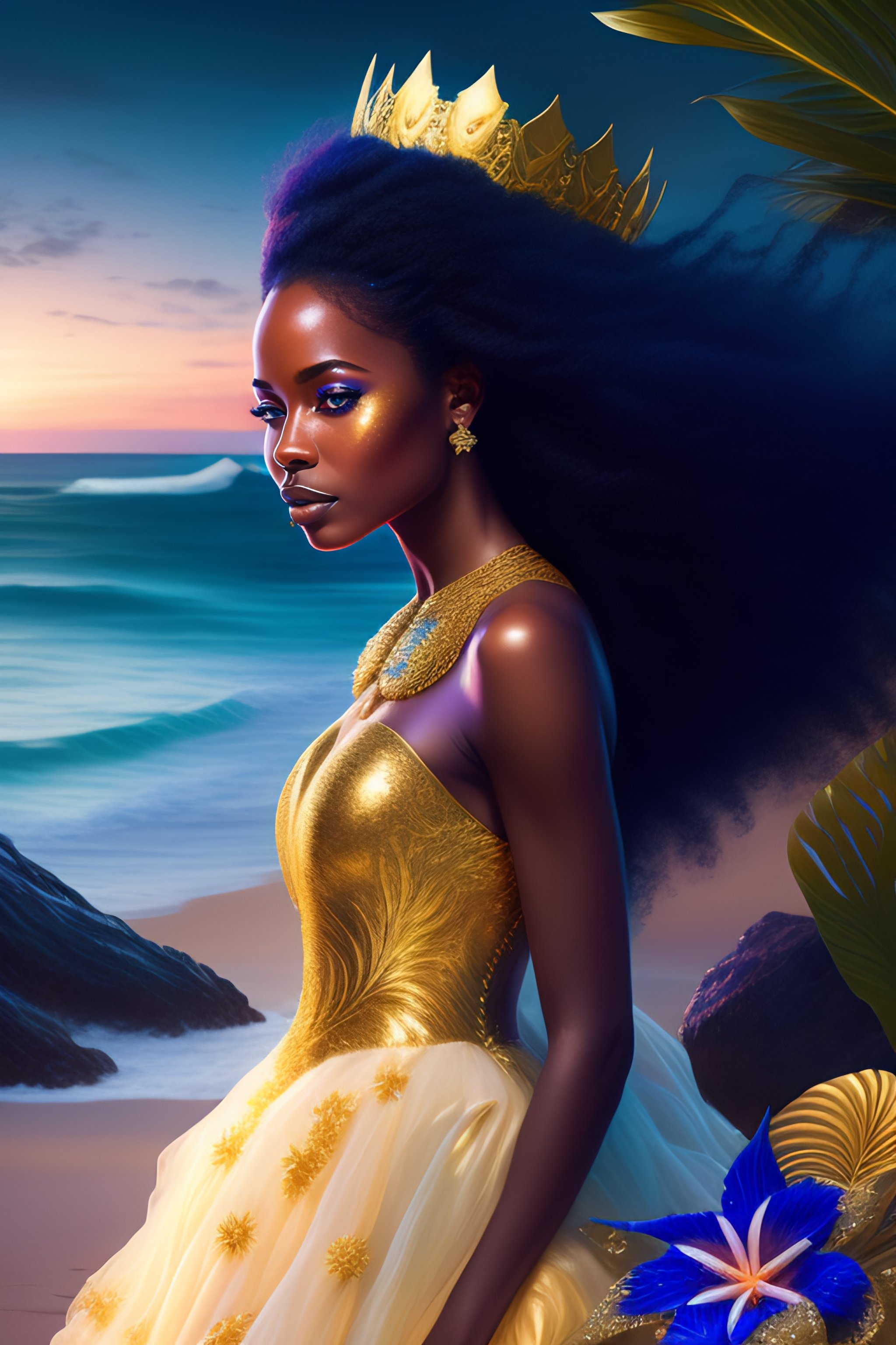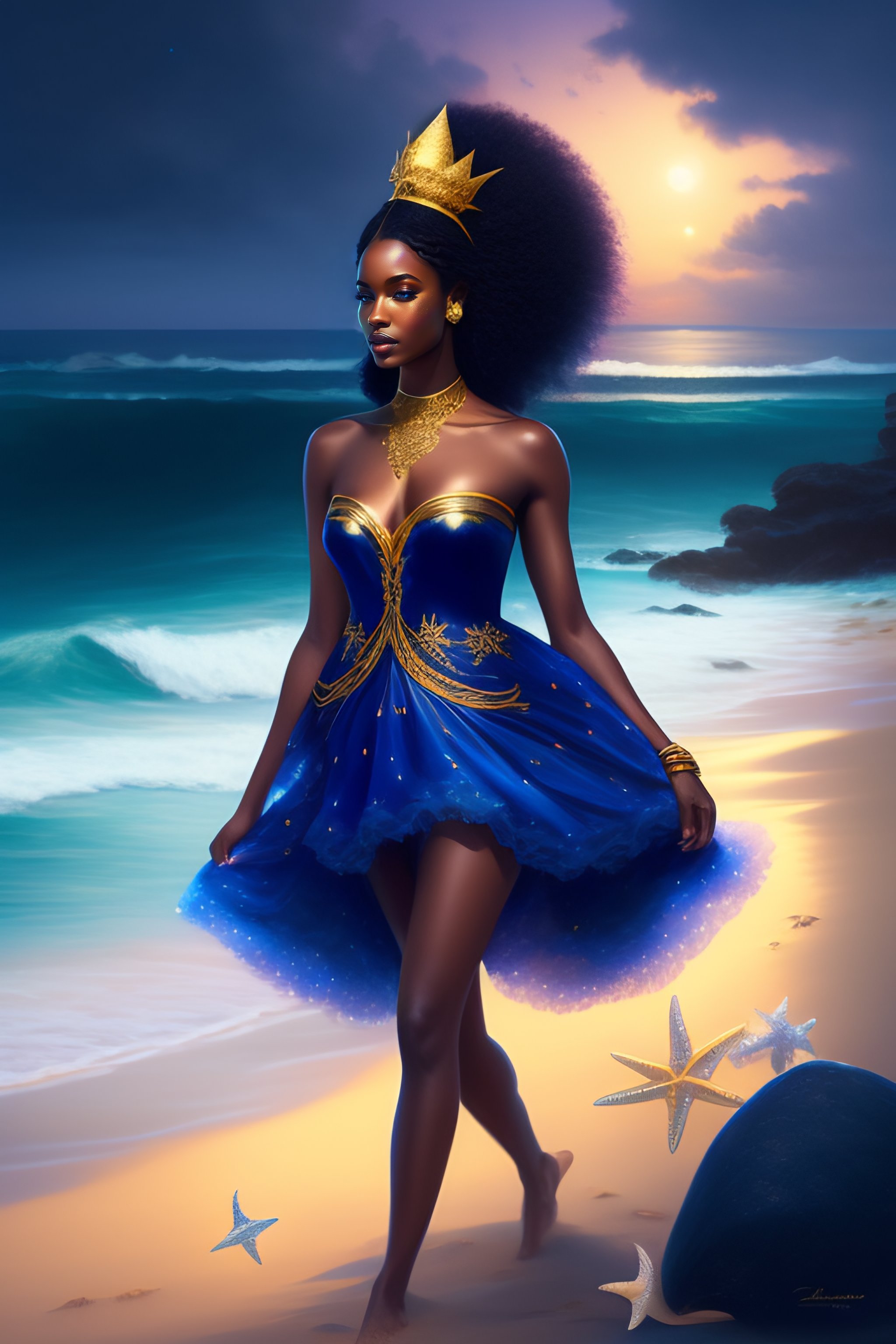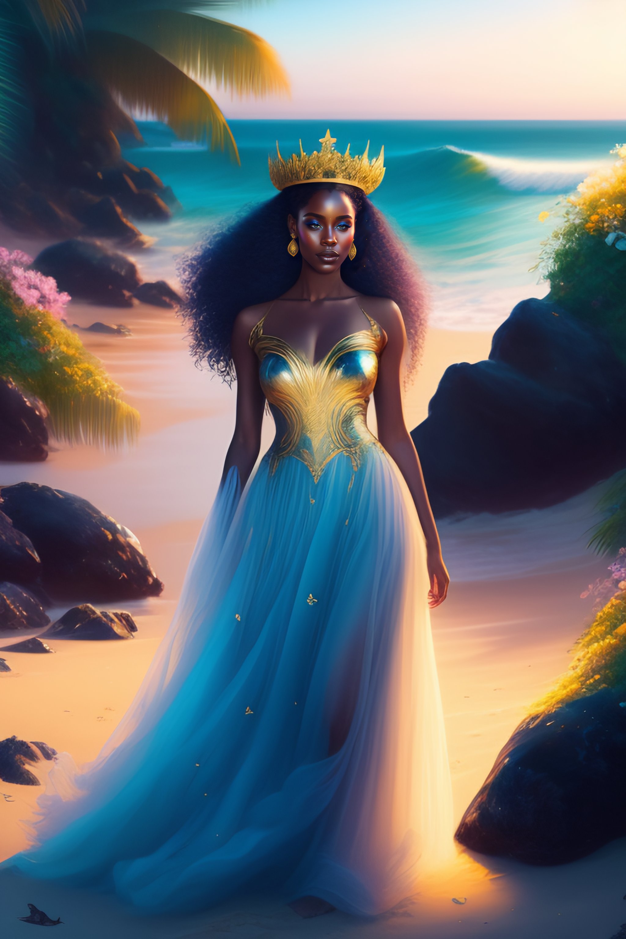Beautiful black princess wearing blue dress with gold crown and starfish details, shells and gold jewelry dancing in tropical beach sea at night with greenery and colorful flowers, full length view, greg rutkowski, ultra detailed, volumetric lighting