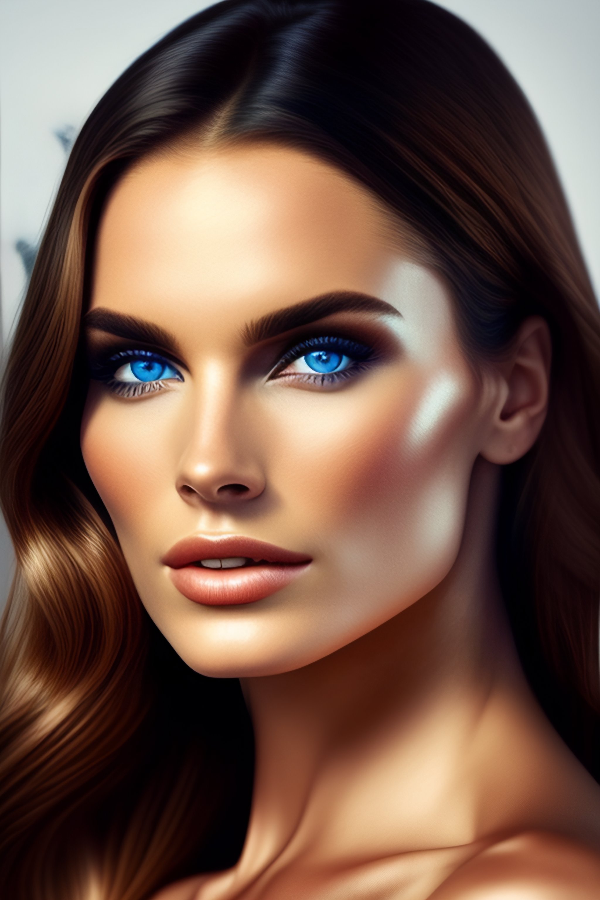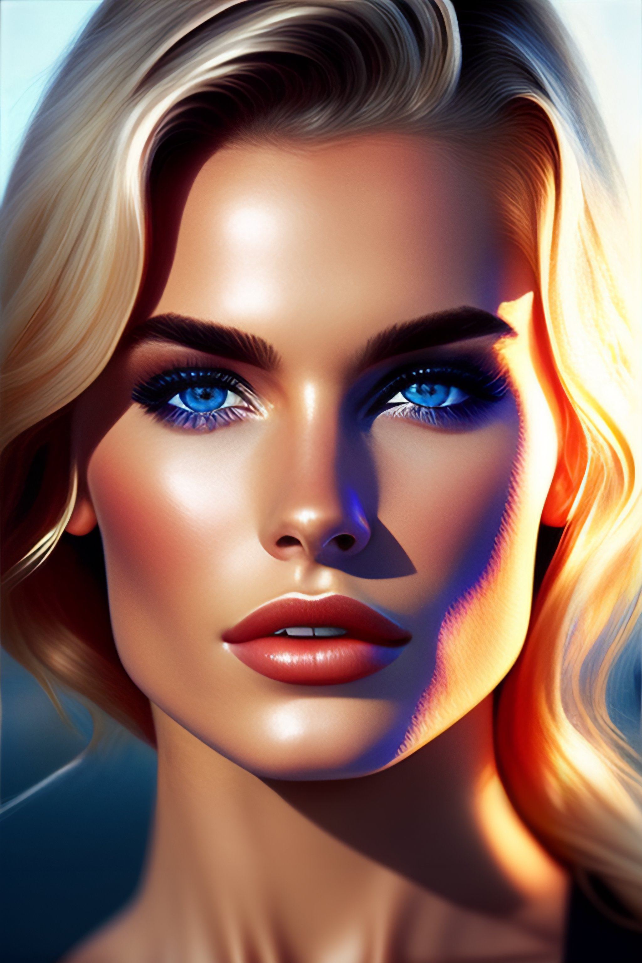 Pretty woman, almond shaped blue eyes, huge big lips, tiny sculpted nose, perfect chiseled face and chin, tight shiny perfect skin