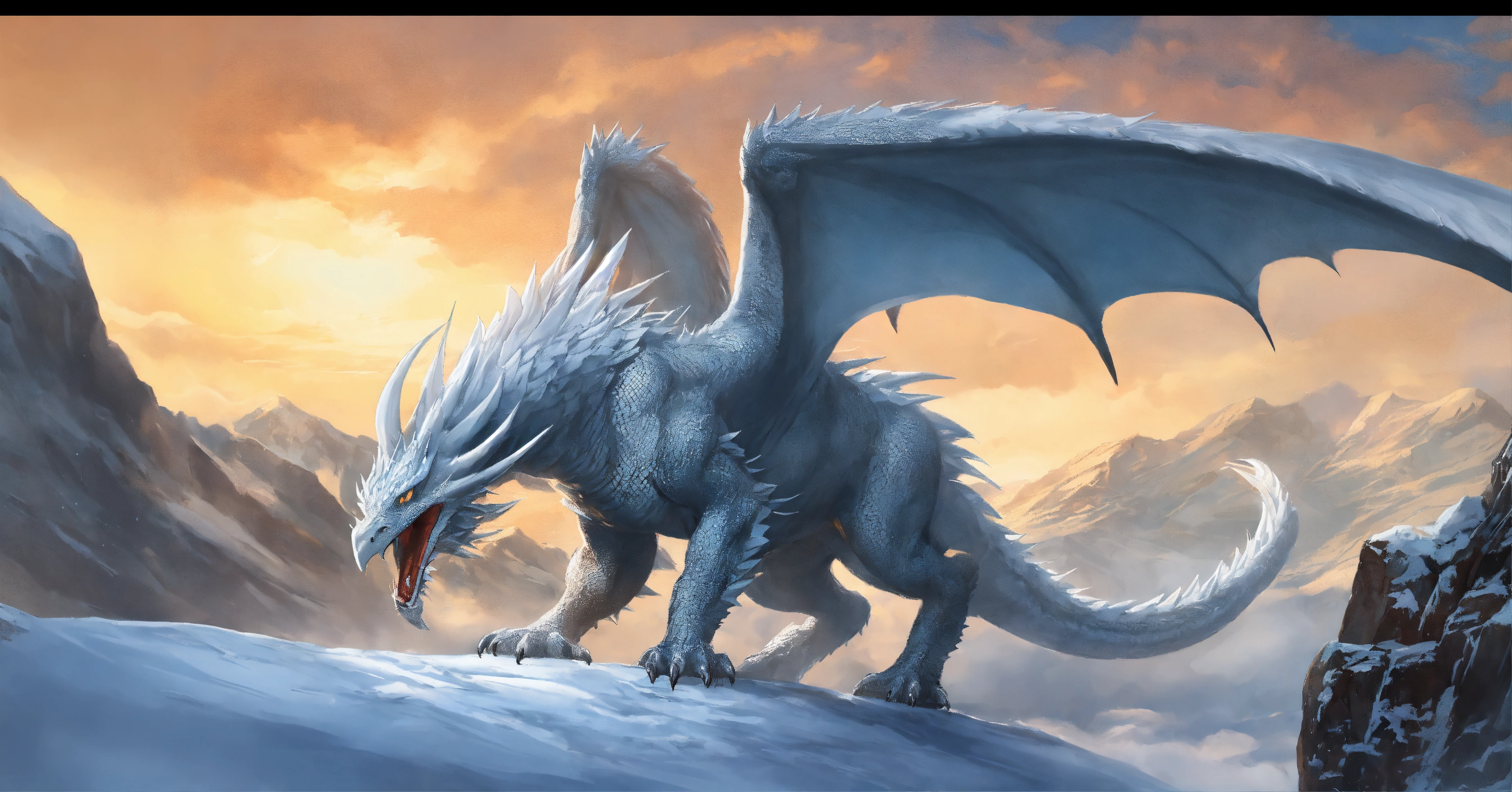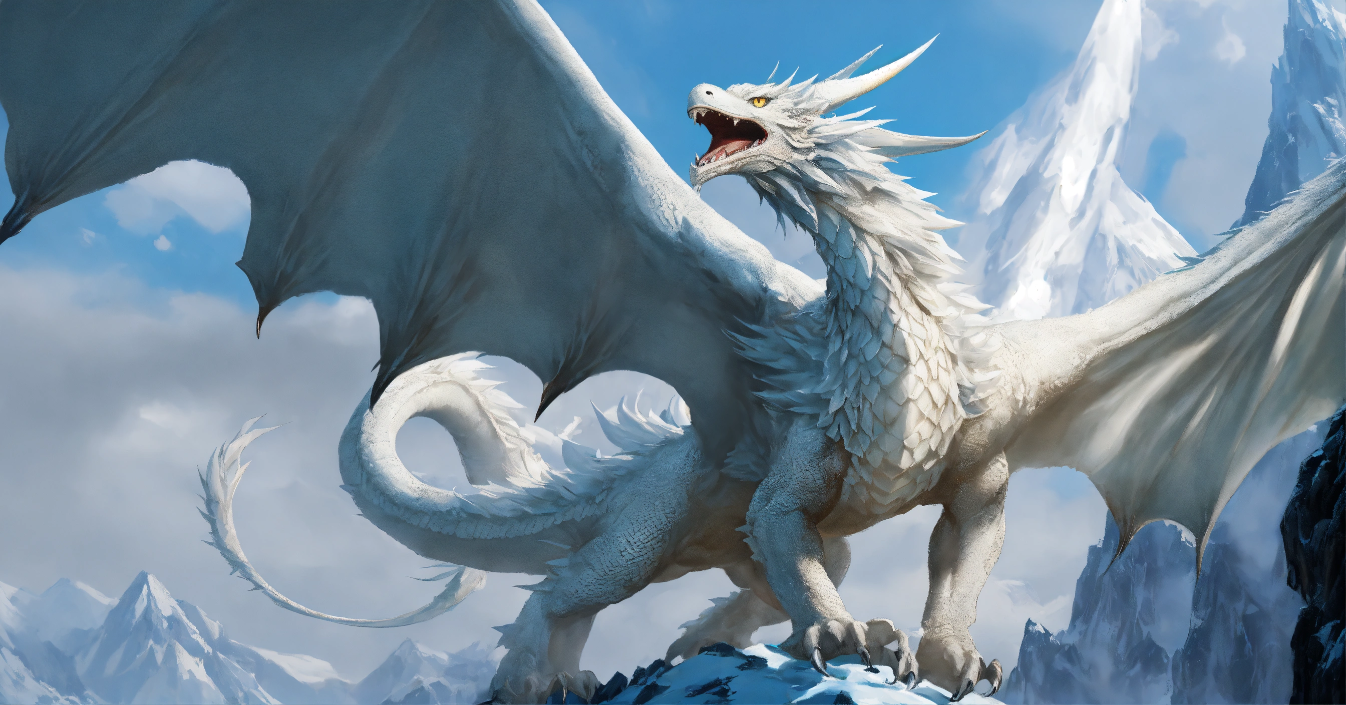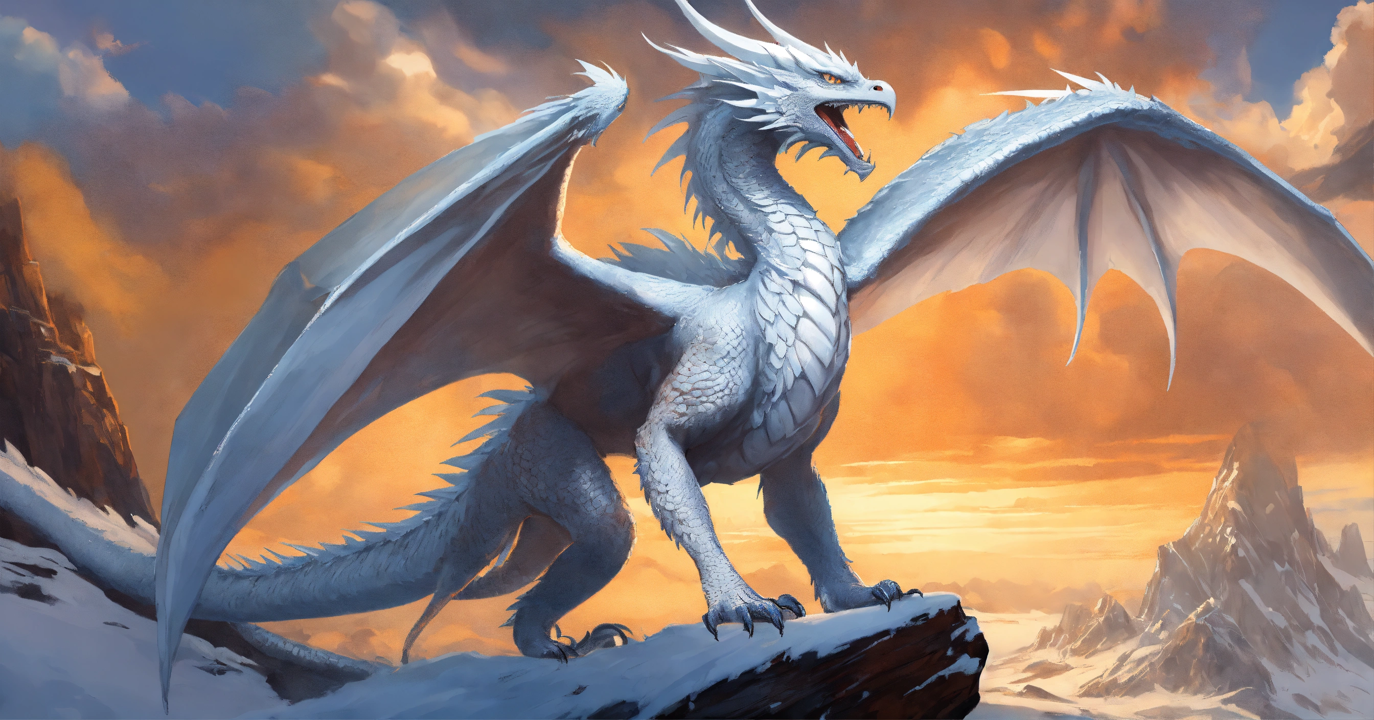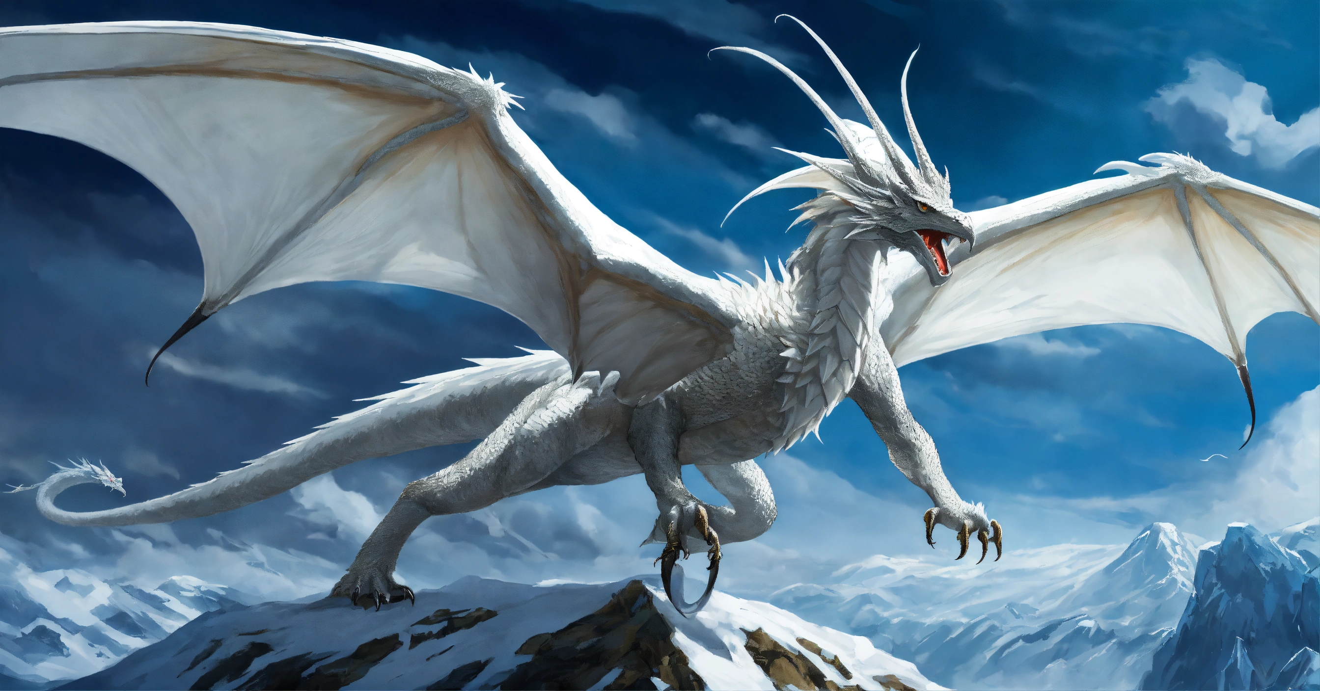 Fine art, delicate detail, menacing, angry white dragon with a beak of a vulture. his skin is smooth and matte, like ice white, elongated face with large horns, spikey arms. his wings are long and elegant providing impressive strength in the air. the dragon is very agile and fast and can navigate the sky with grace and elegance. he is a hunter and powerful, and the sight of him in the sky is impressive, icy region background, in the style of dungeons and dragons monster manual, graphic novel art