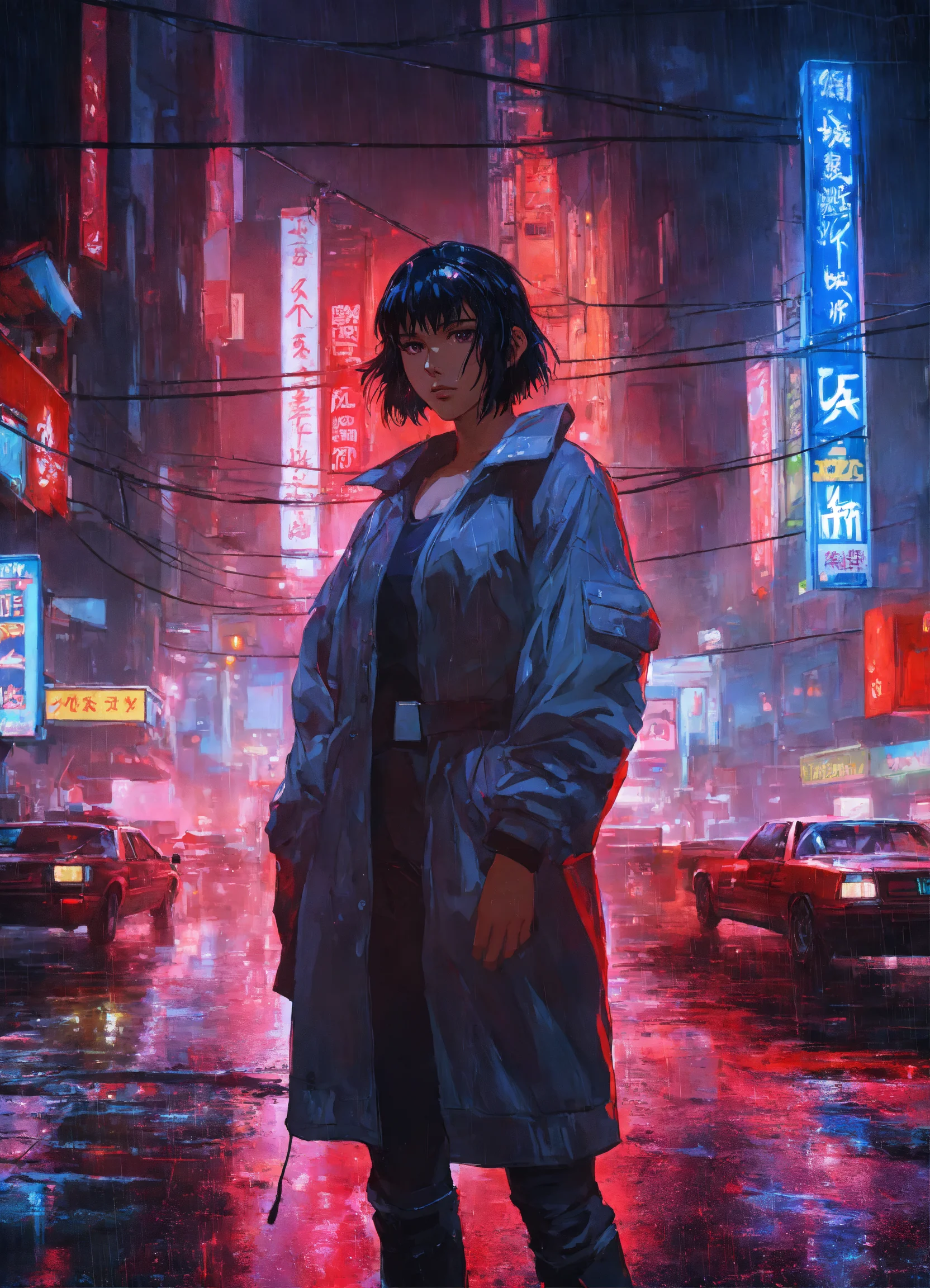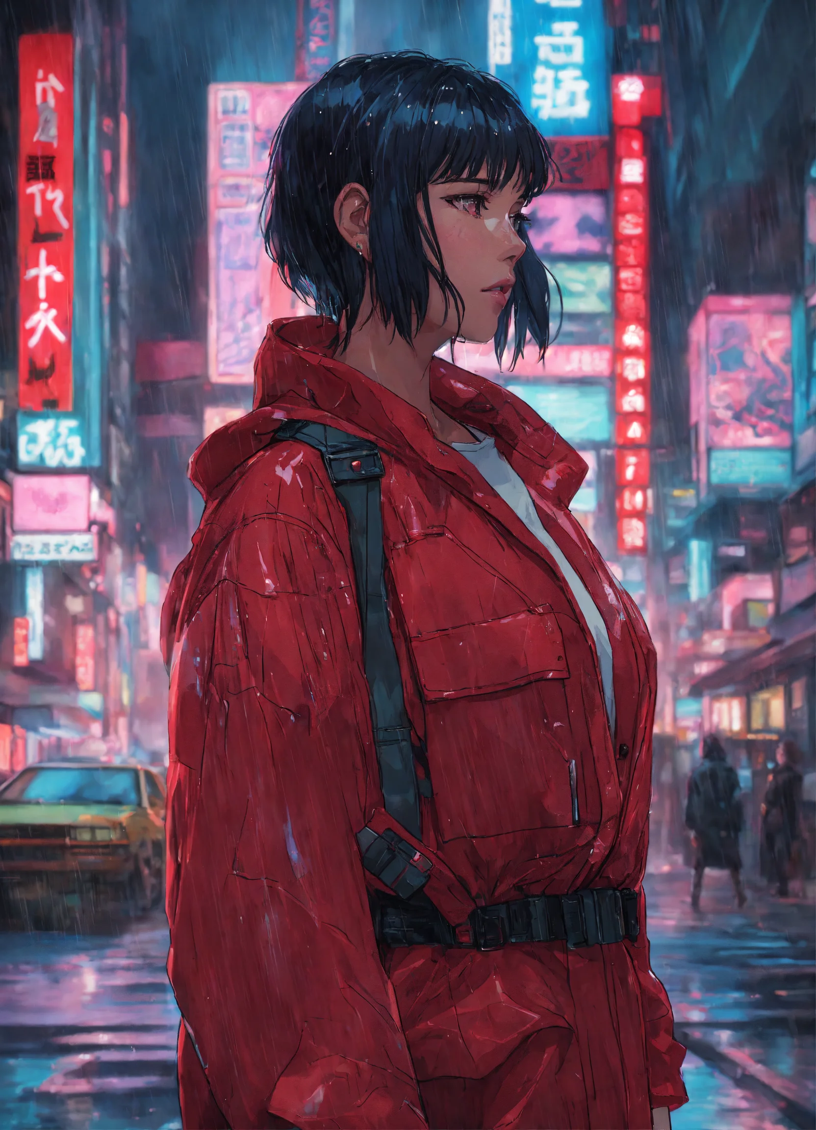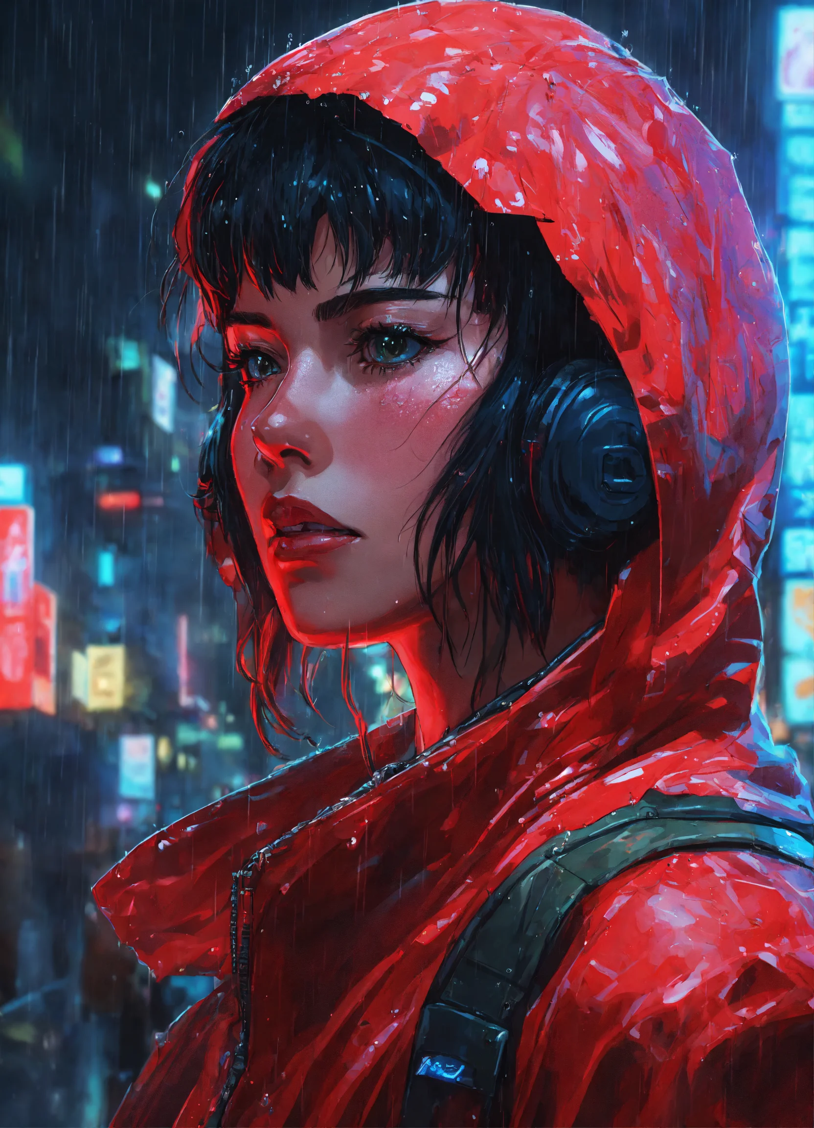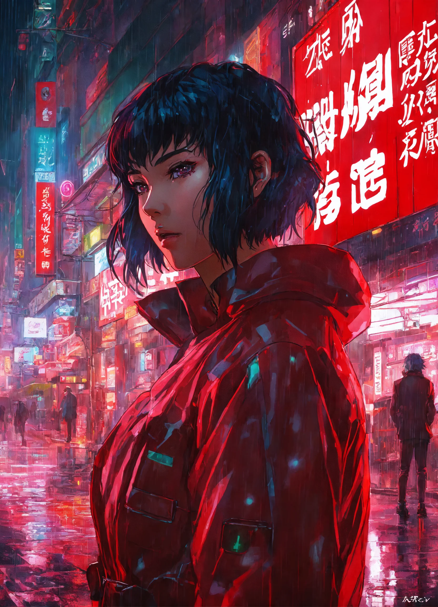 Anime art of ghost in the shell, detailed scene, red, perfect face, intricately detailed photorealism, trending on artstation, neon lights, rainy day, ray-traced environment, vintage 90's anime artwork.