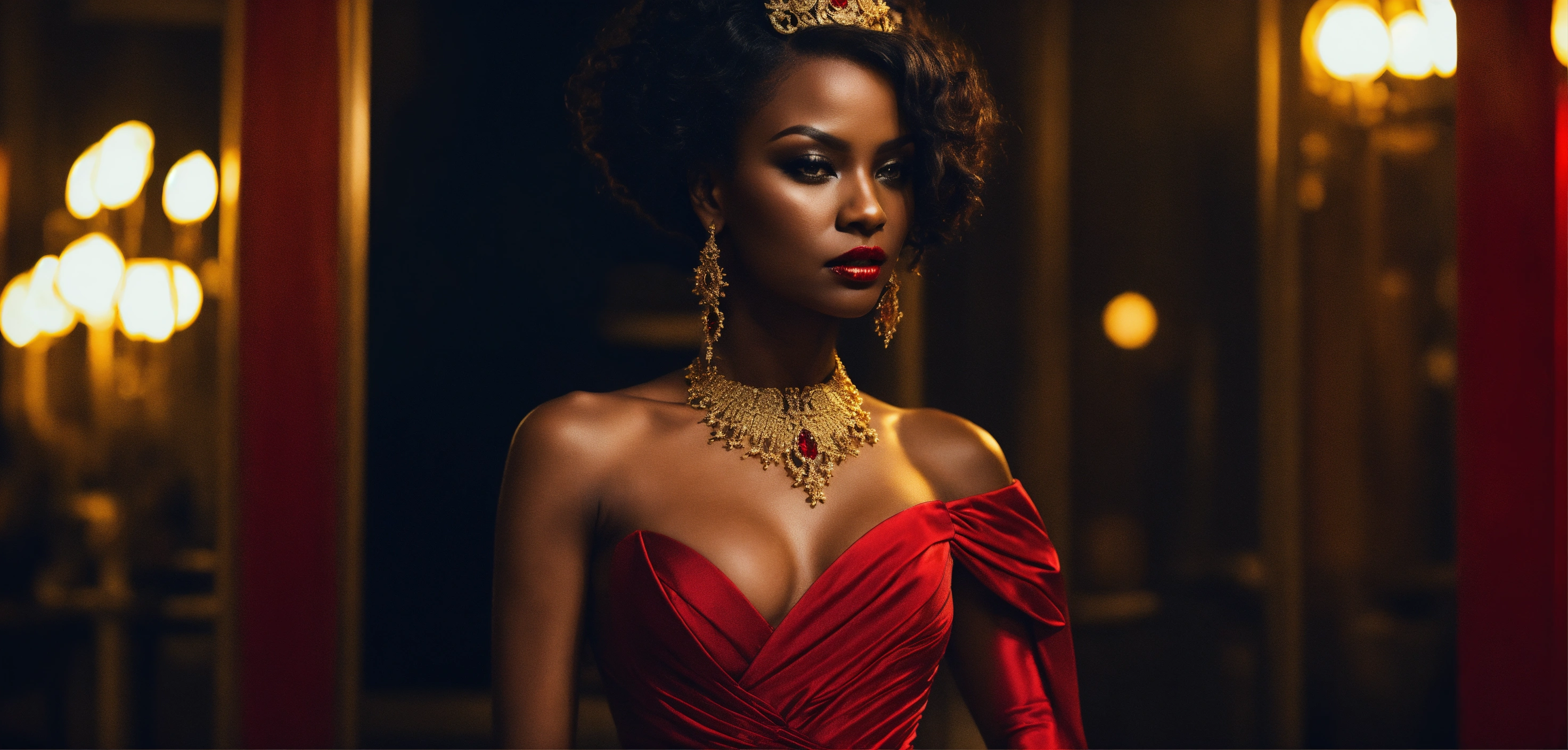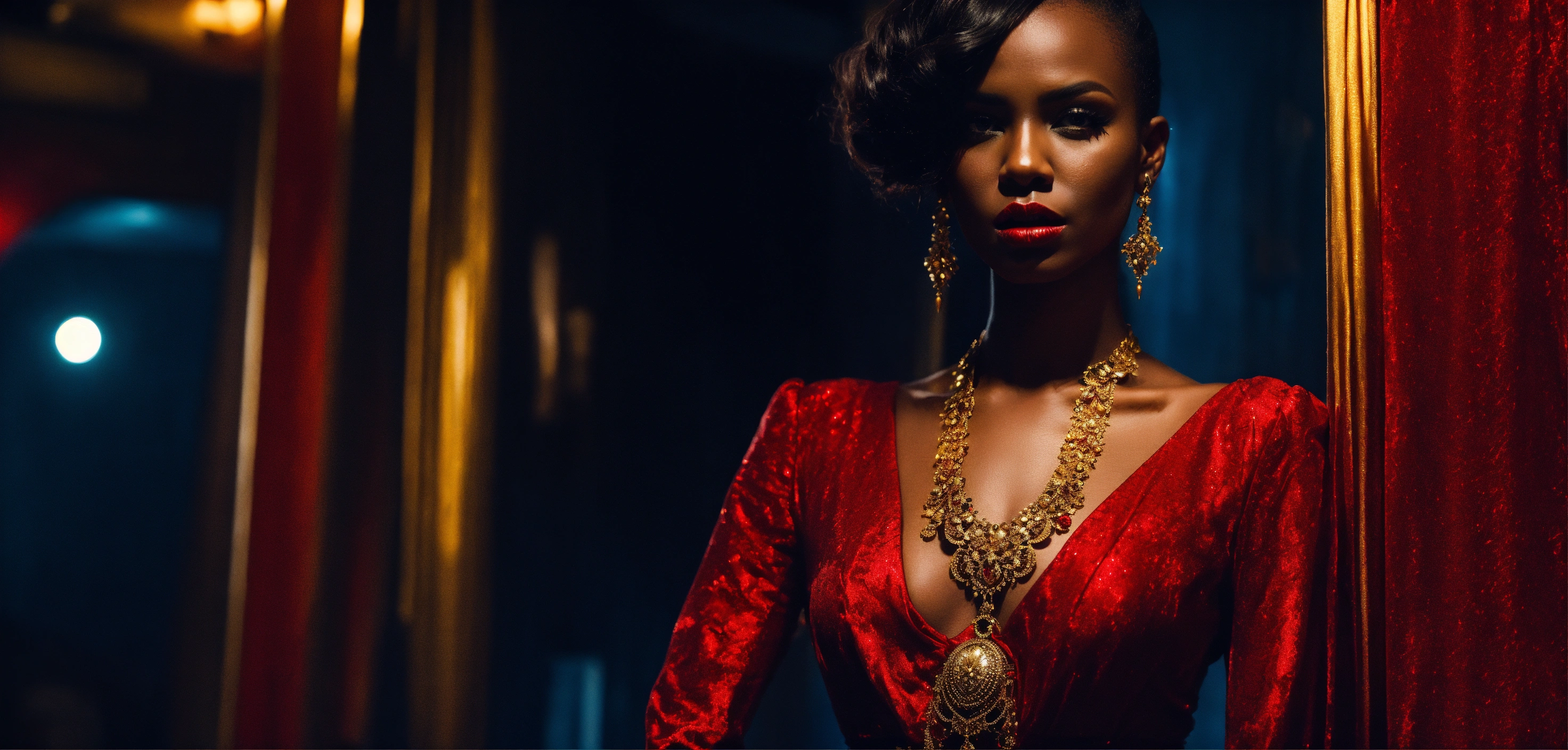 Cinematic look, stunning female black model, gallant crimson european designer evening dress, arrogant evil looking, golden jewelry, urban night club, underworld vampire movie style