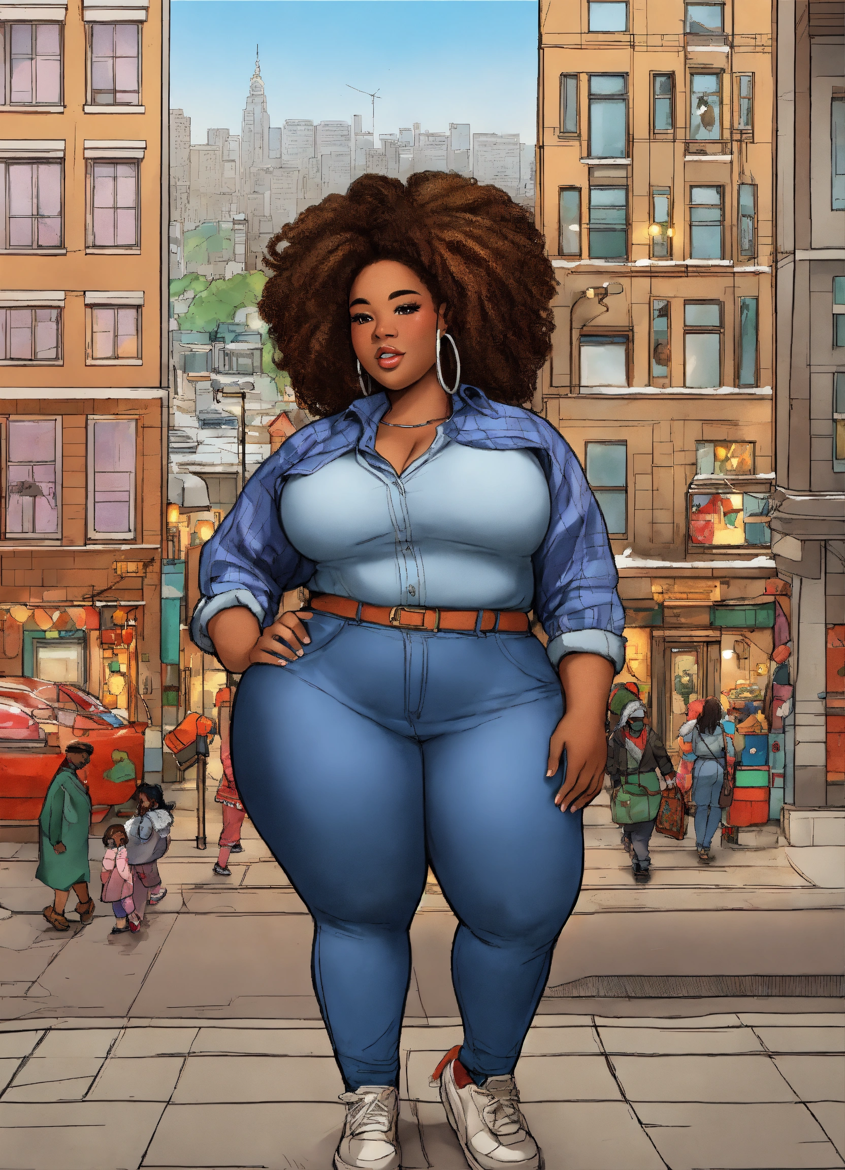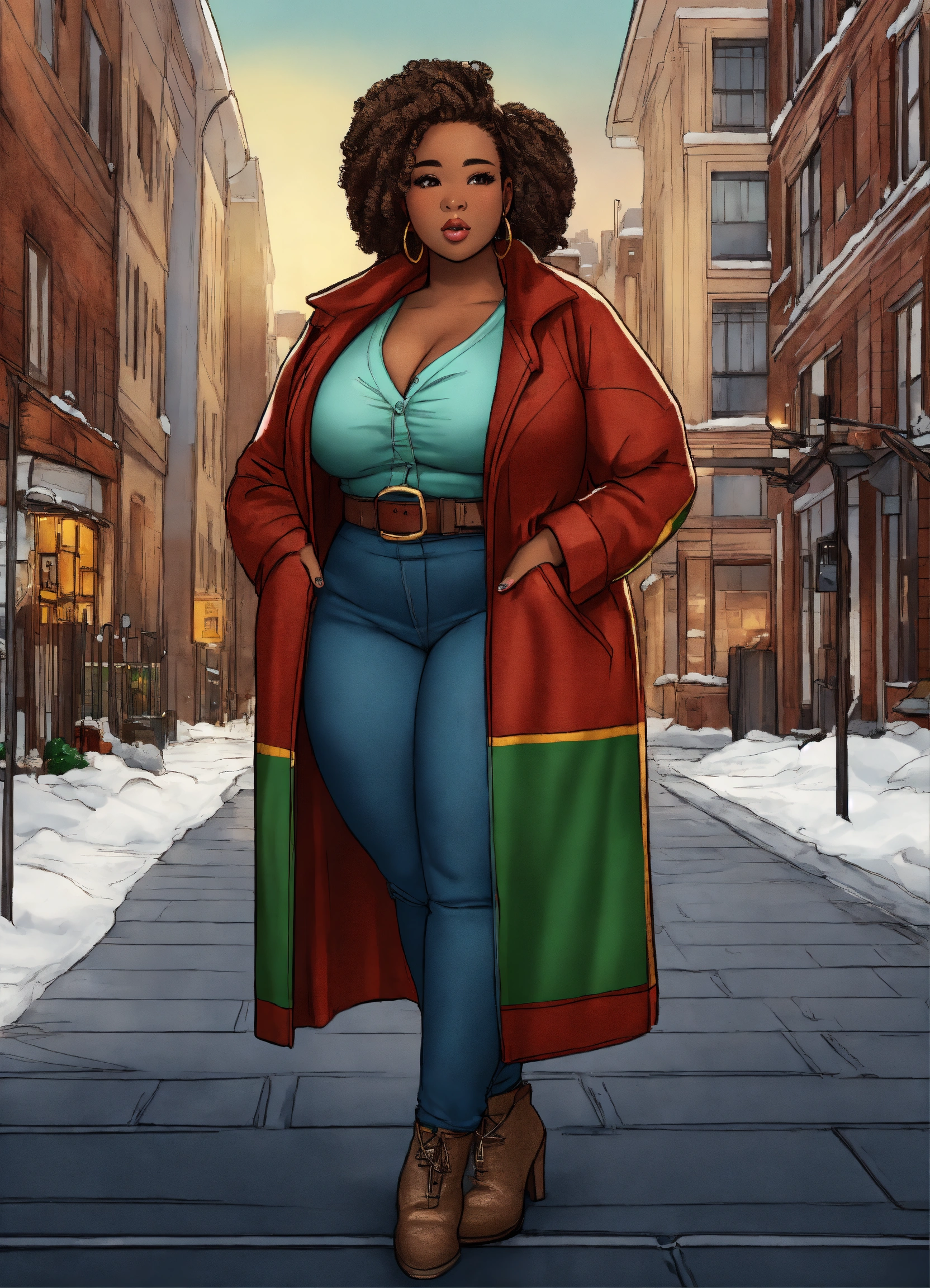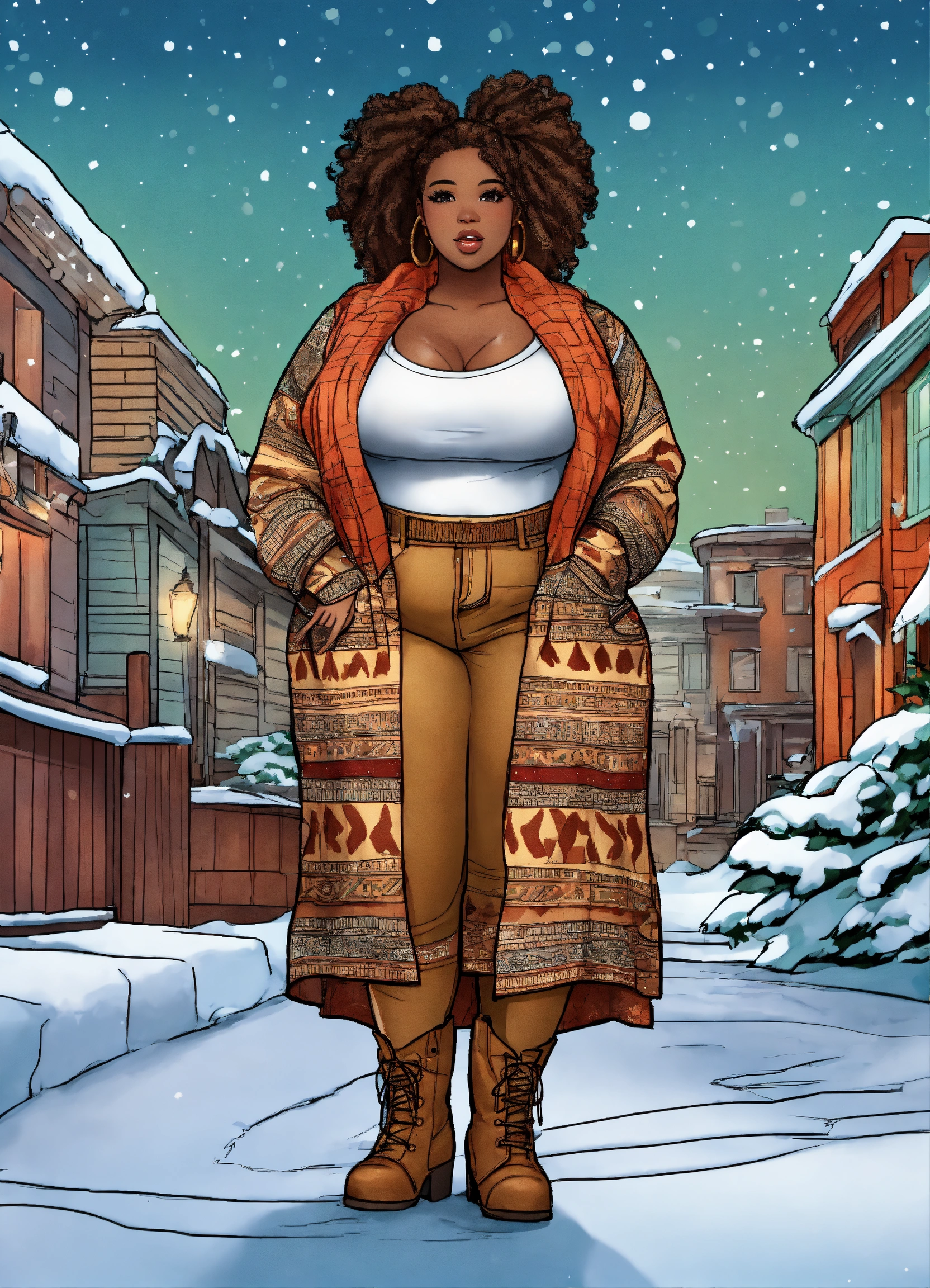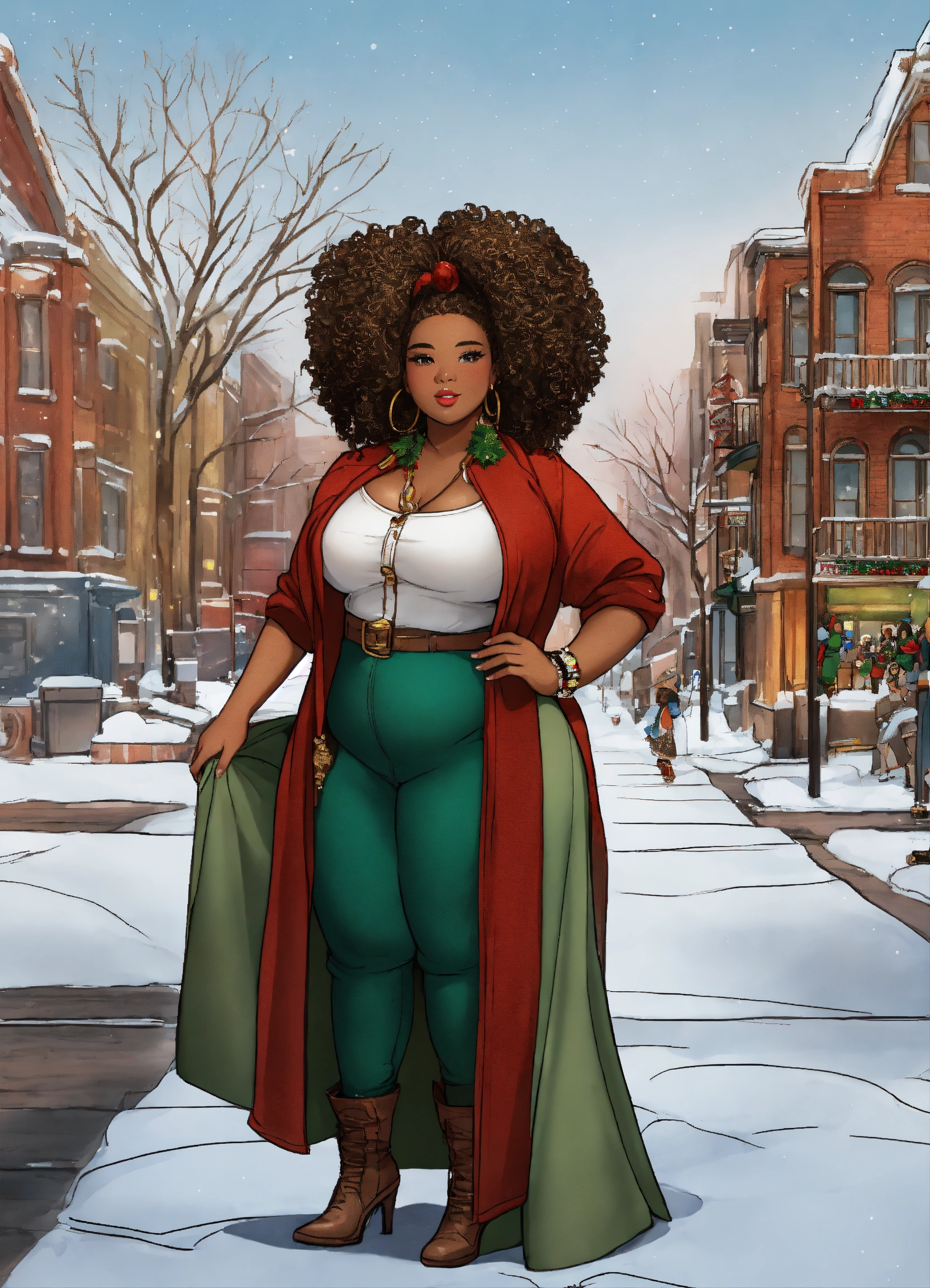 African american west african features fully clothed well proportioned full figured woman, realistic healthy glossy well defined loc’d hair texture, full body shot, urban big city winter christmas scene theme rule of thirds centered subject placement, storybook, cartoon, intricate detail line drawing, coloring book style, v2, 3