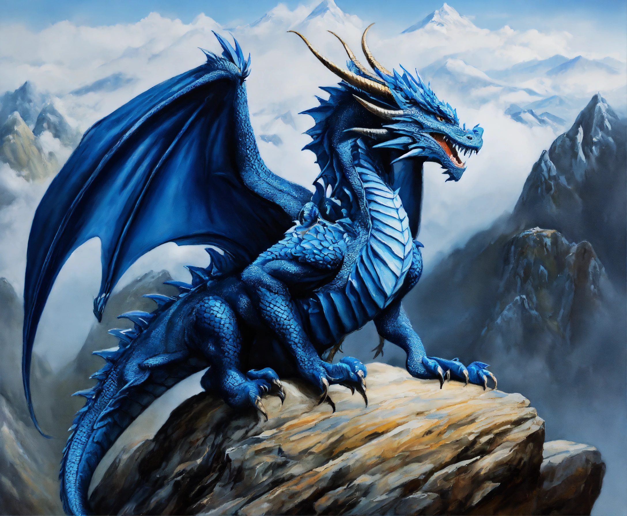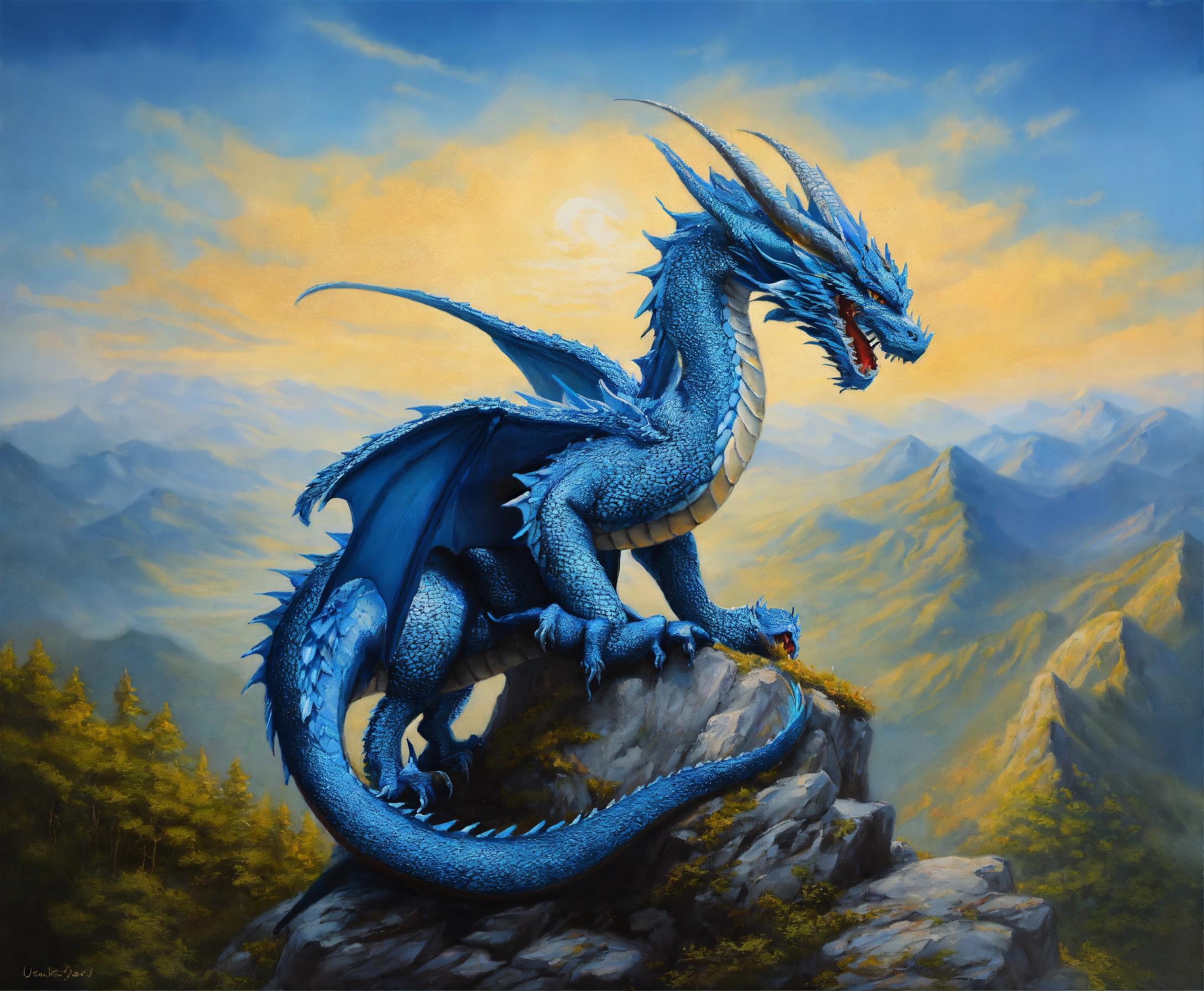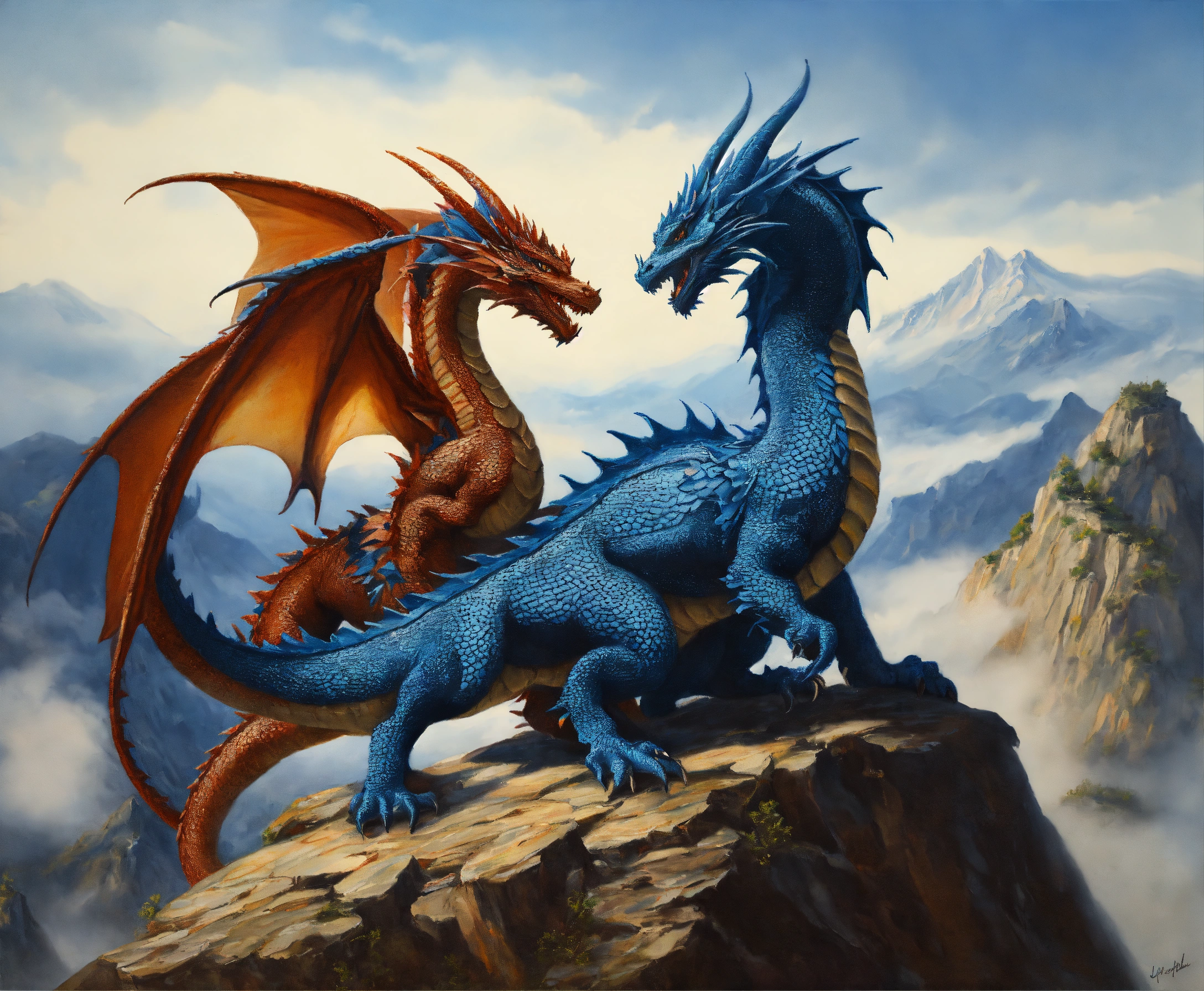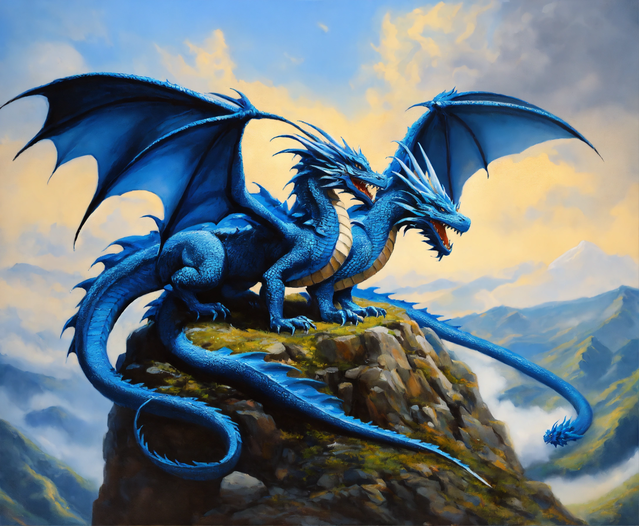 Oil painting of two blue dragons touching each other on top of a high mountain, one of the dragons is much bigger than the other dragon, ultra detailled, ultra realistic