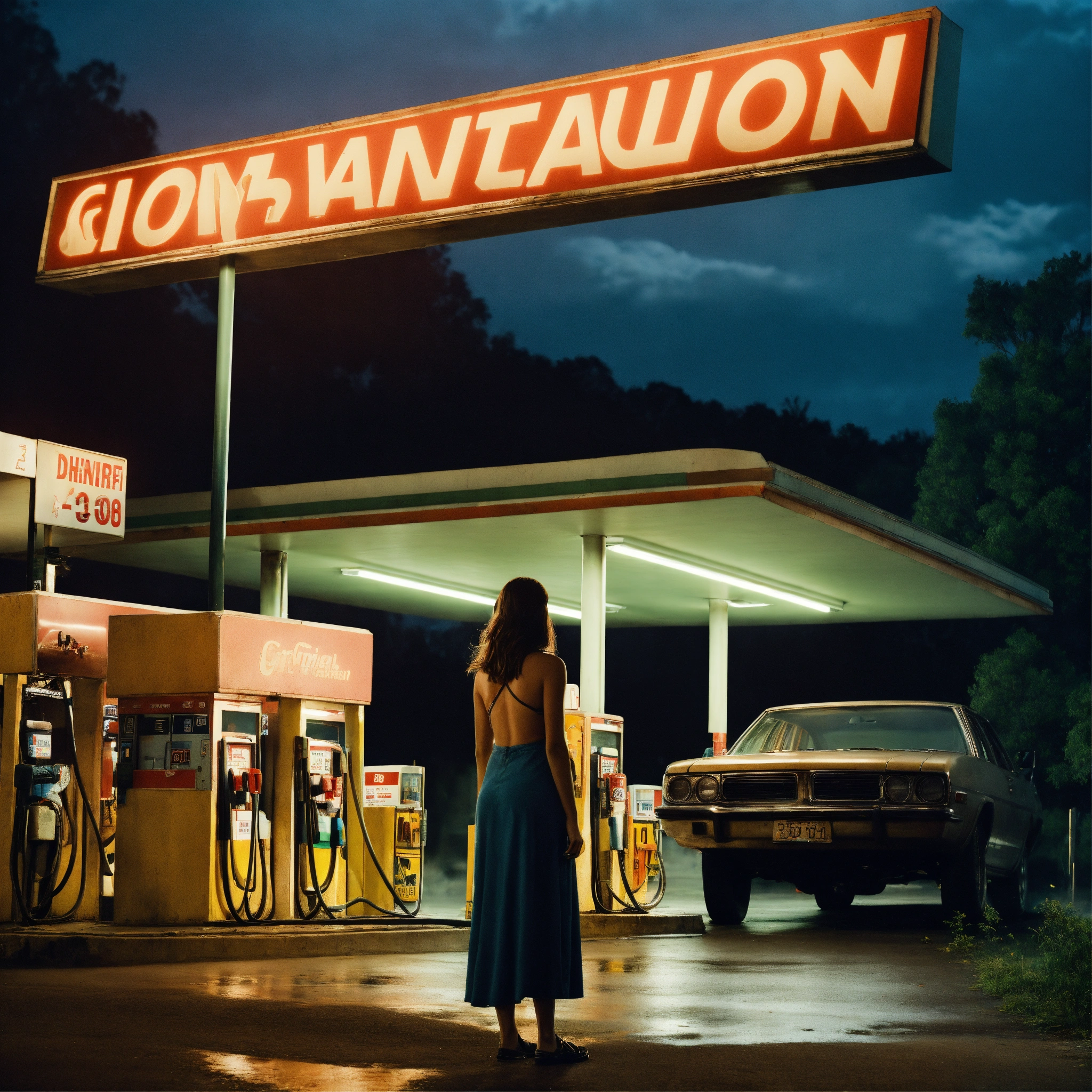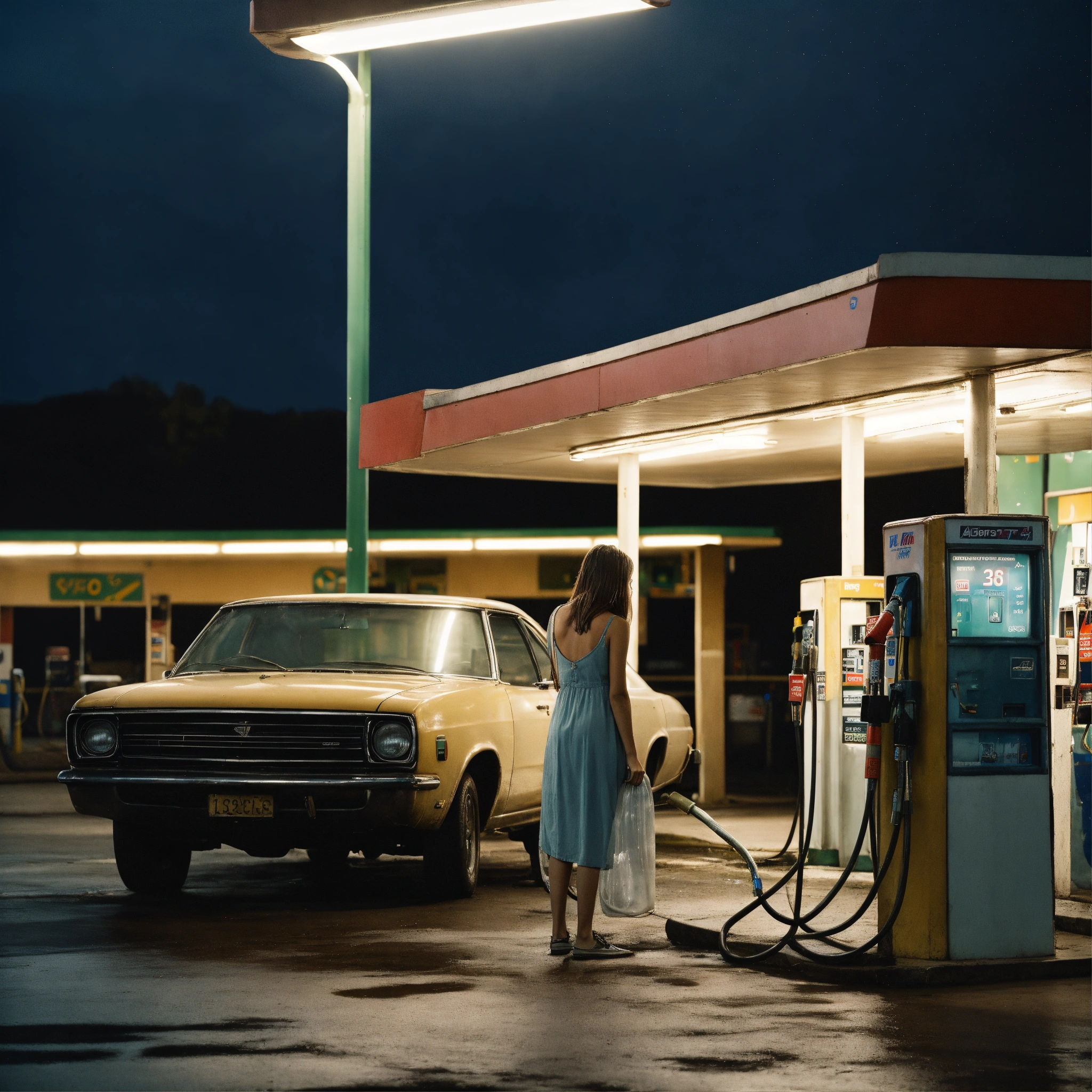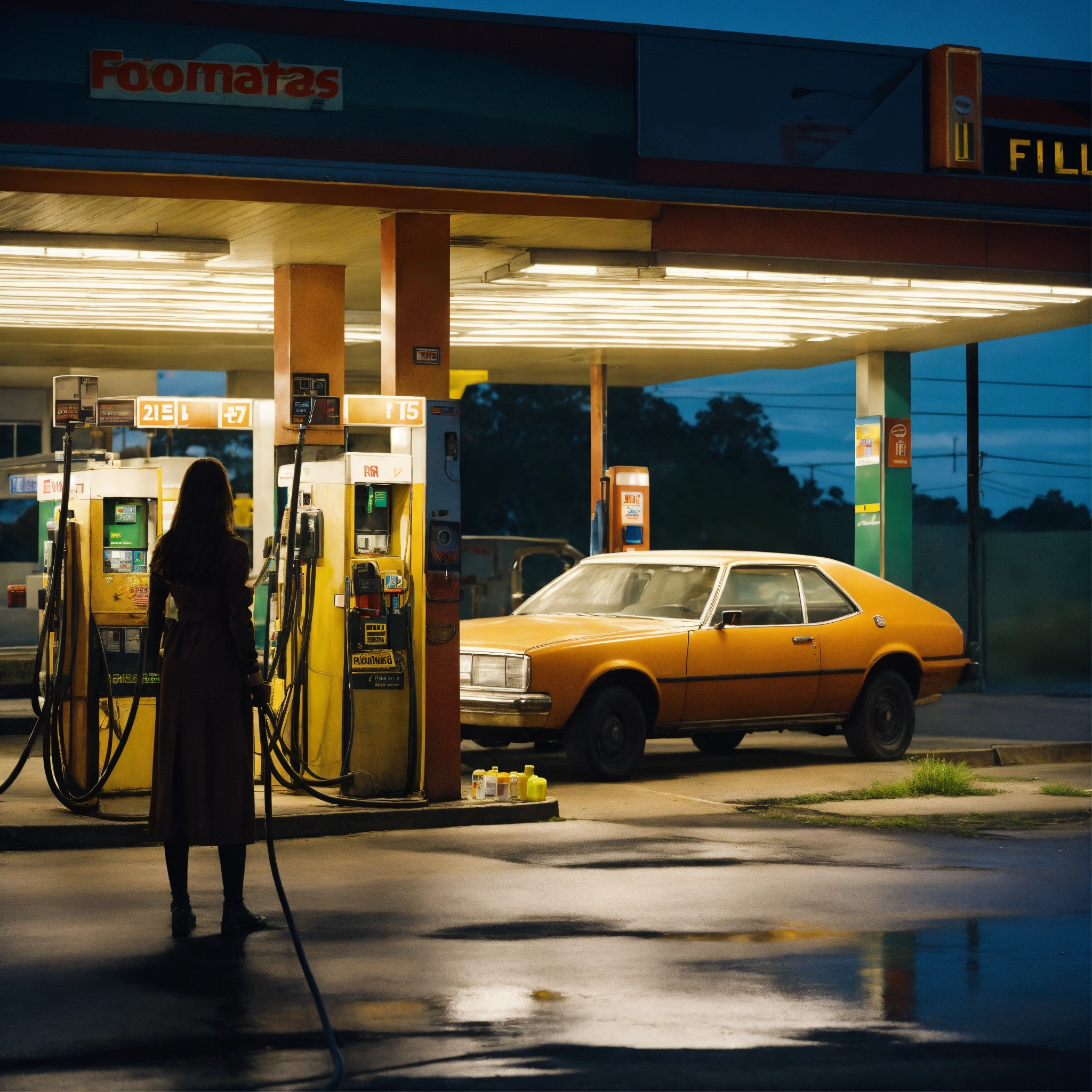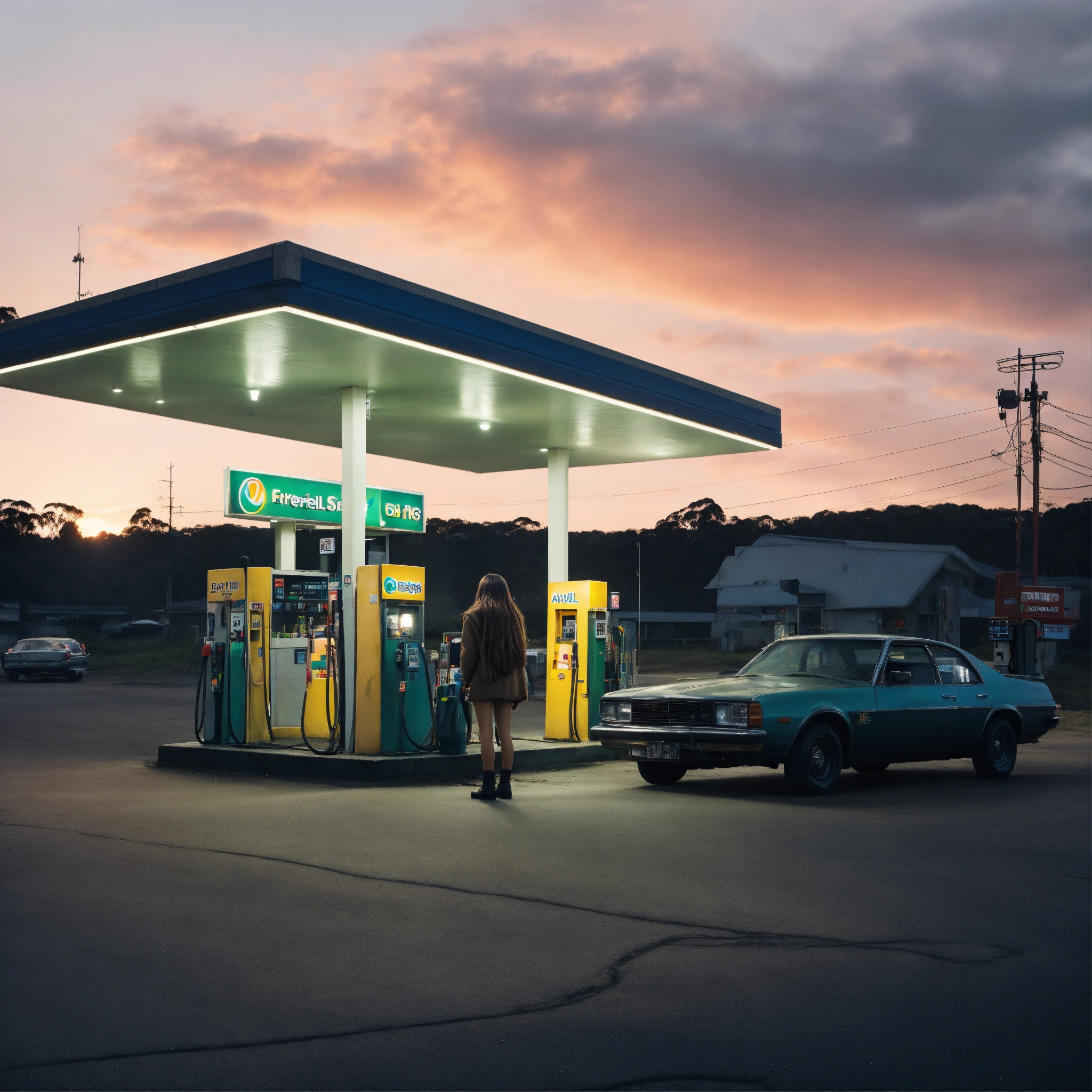 A photograph of a woman with long brown hair standing at a dystopian australian petrol station filling up her car, gregory crewdson cinematic stylerear view