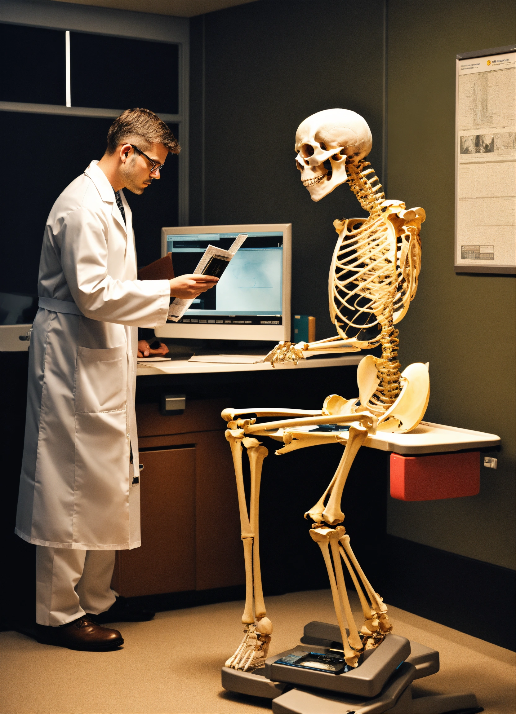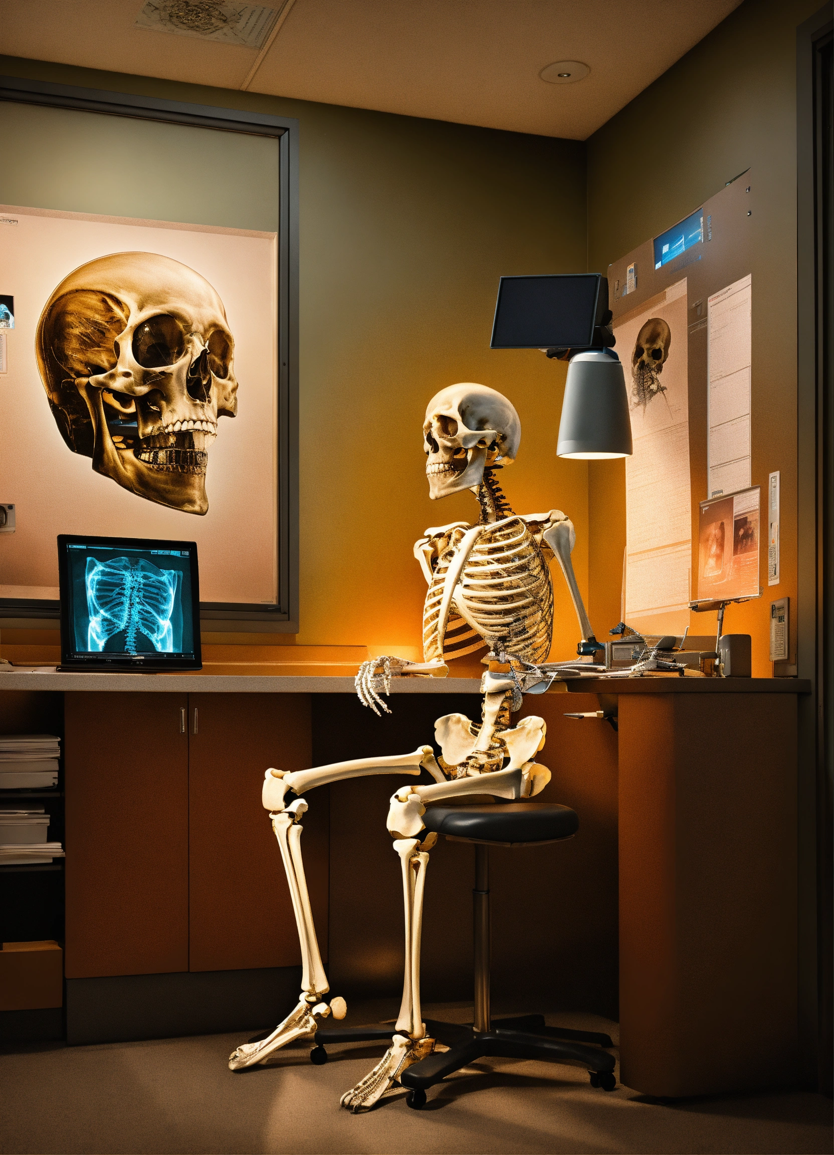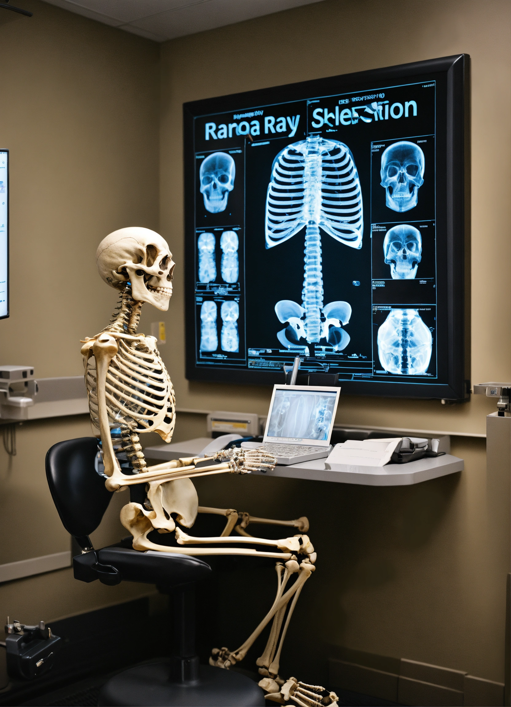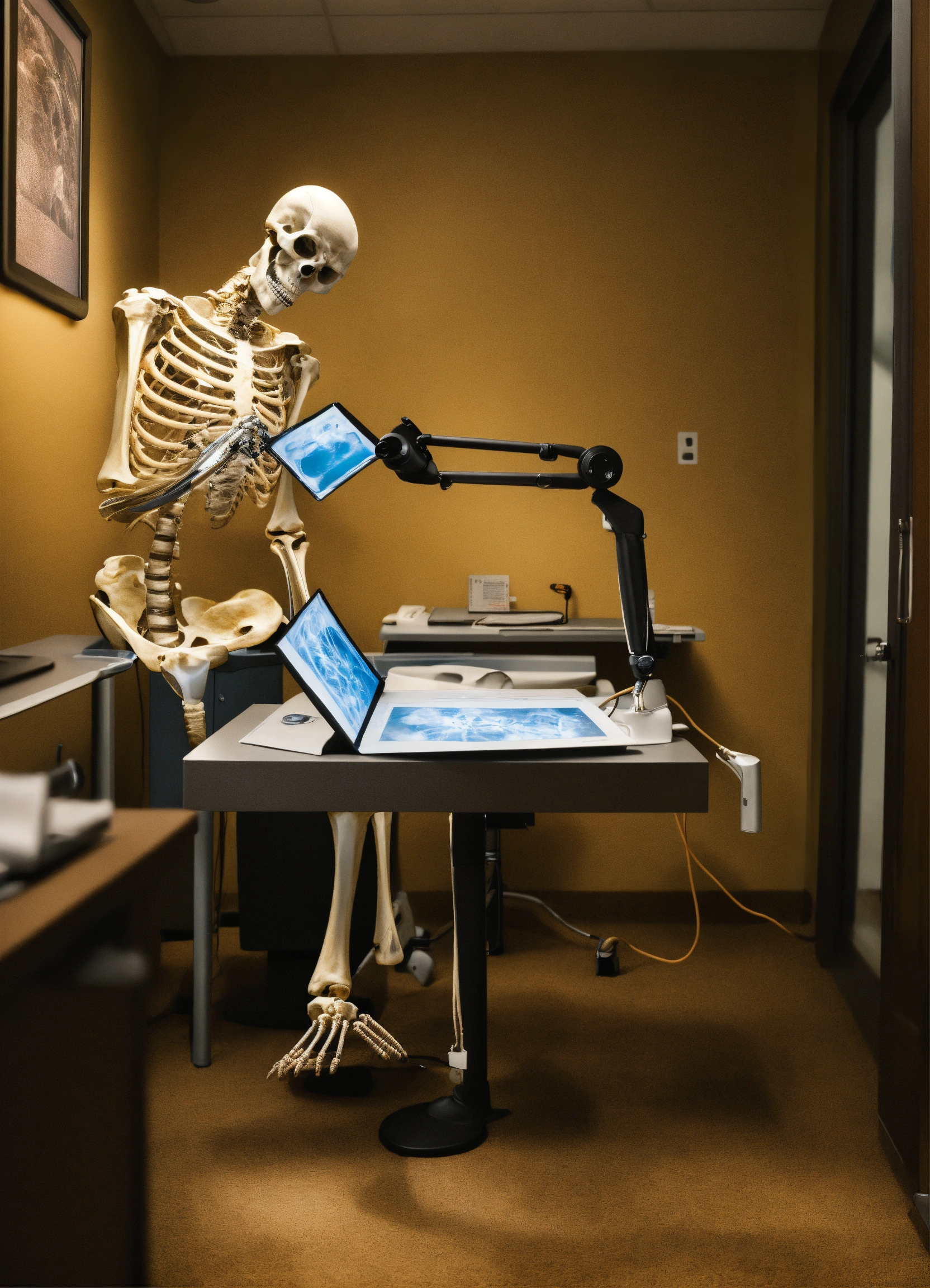 A photo realistic skeleton reading a photograph (instead of an xray) at a radiology work station dressed as a radiologist