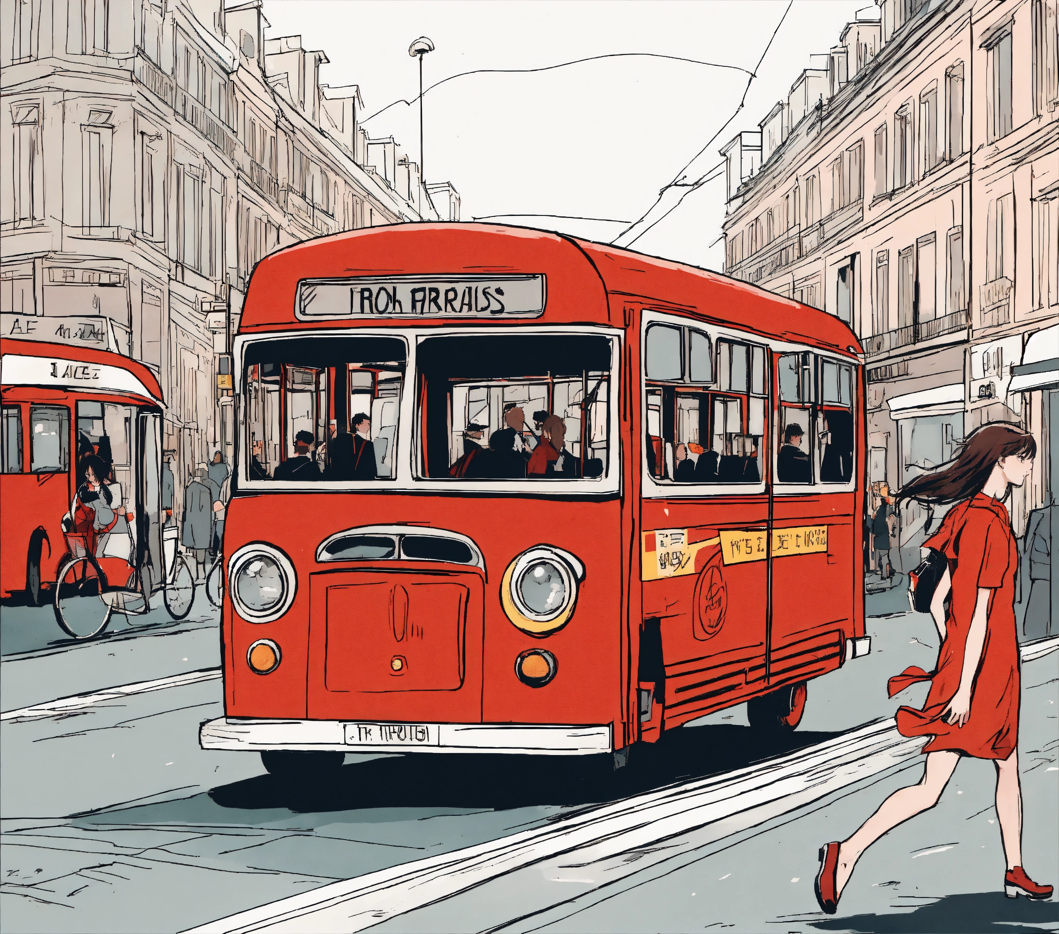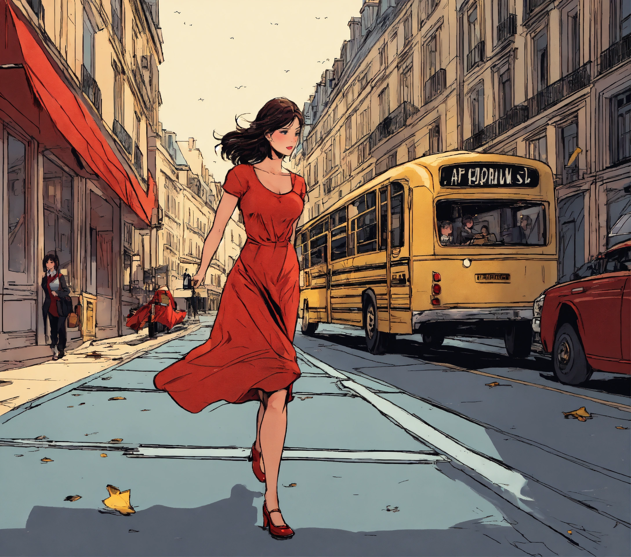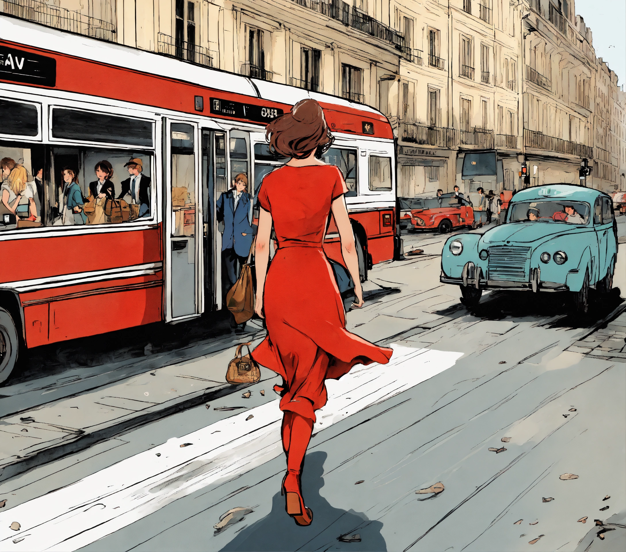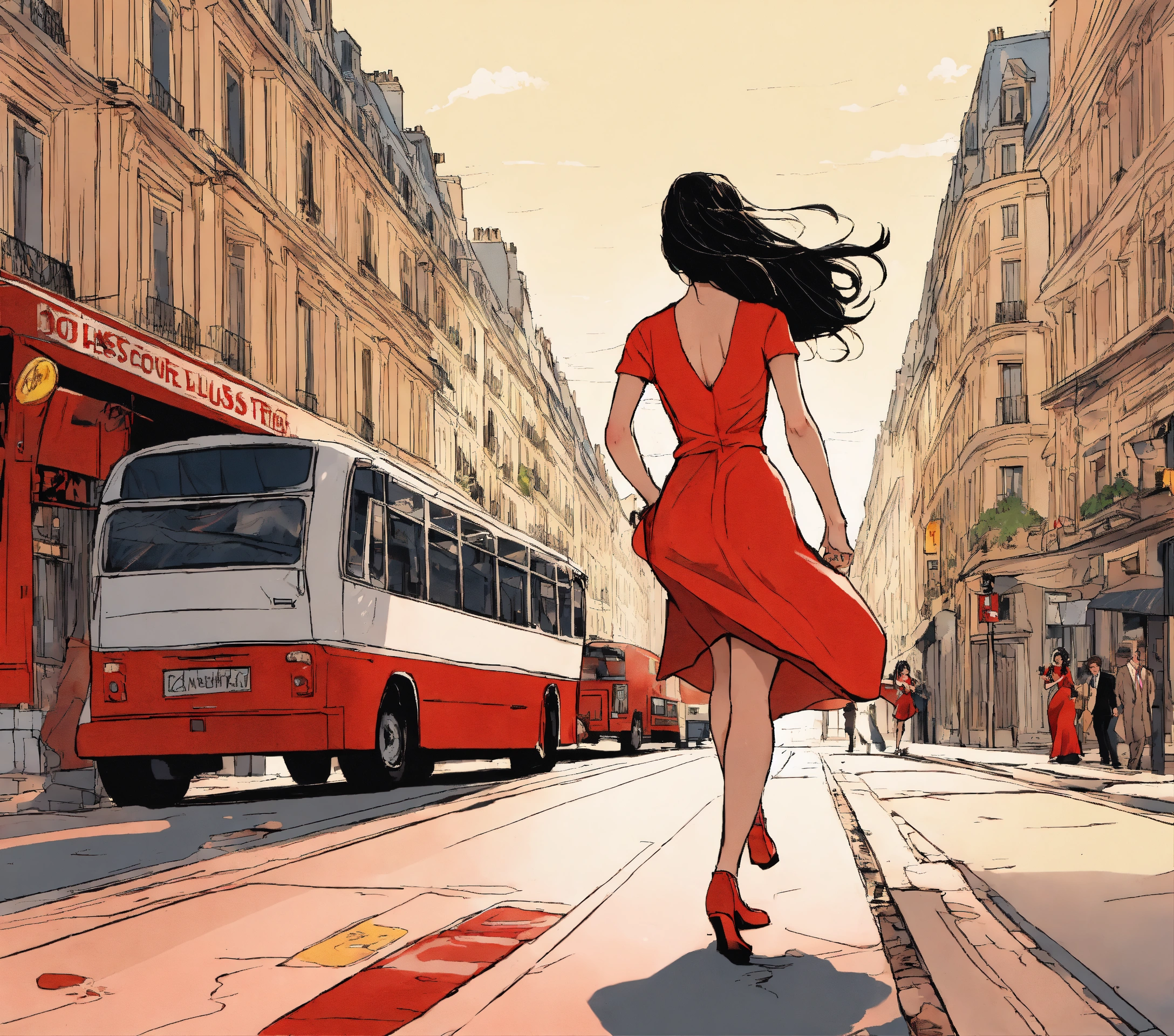 A beautiful girl in red dress runs after a bus down the street paris is late for work comics