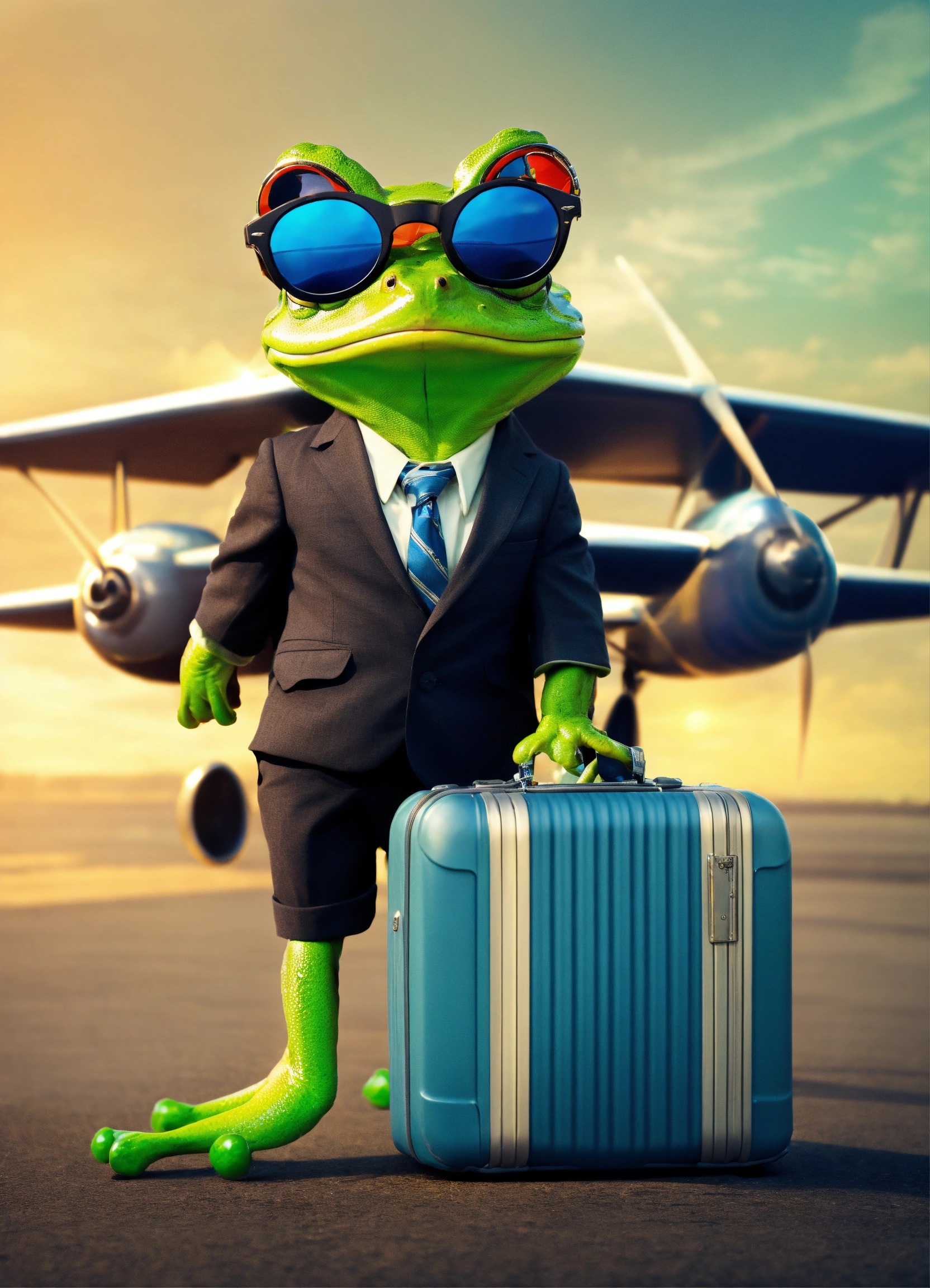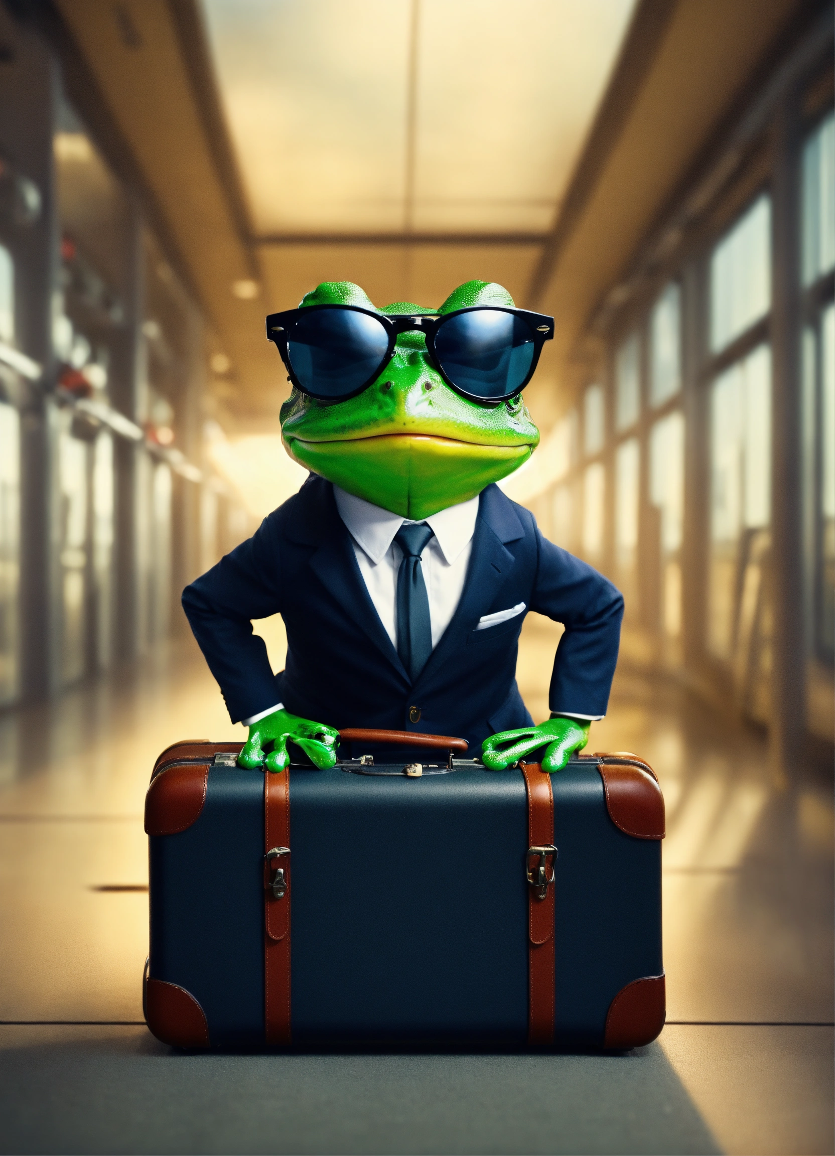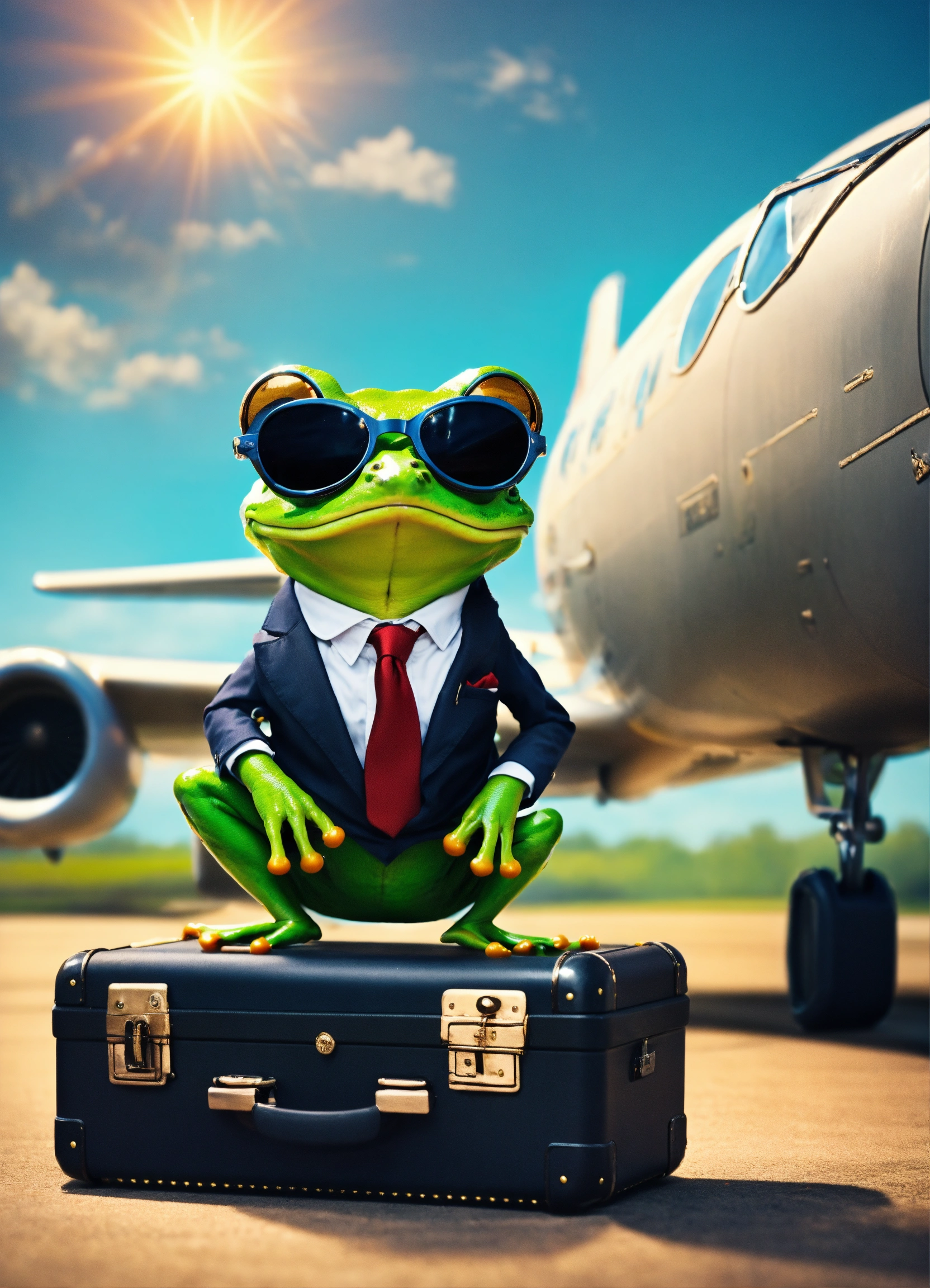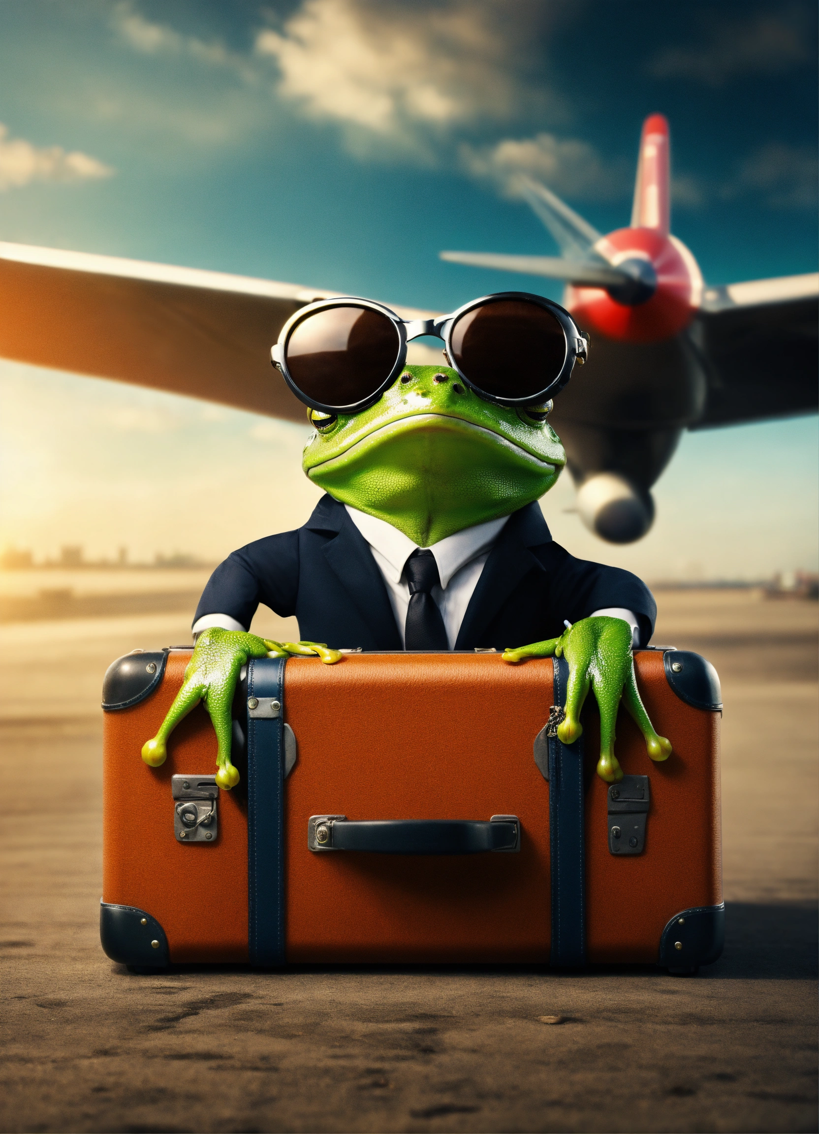 Cute frog in suit and sun glasses in in rich colour airplane black suitcase chases by security in cinematic environment