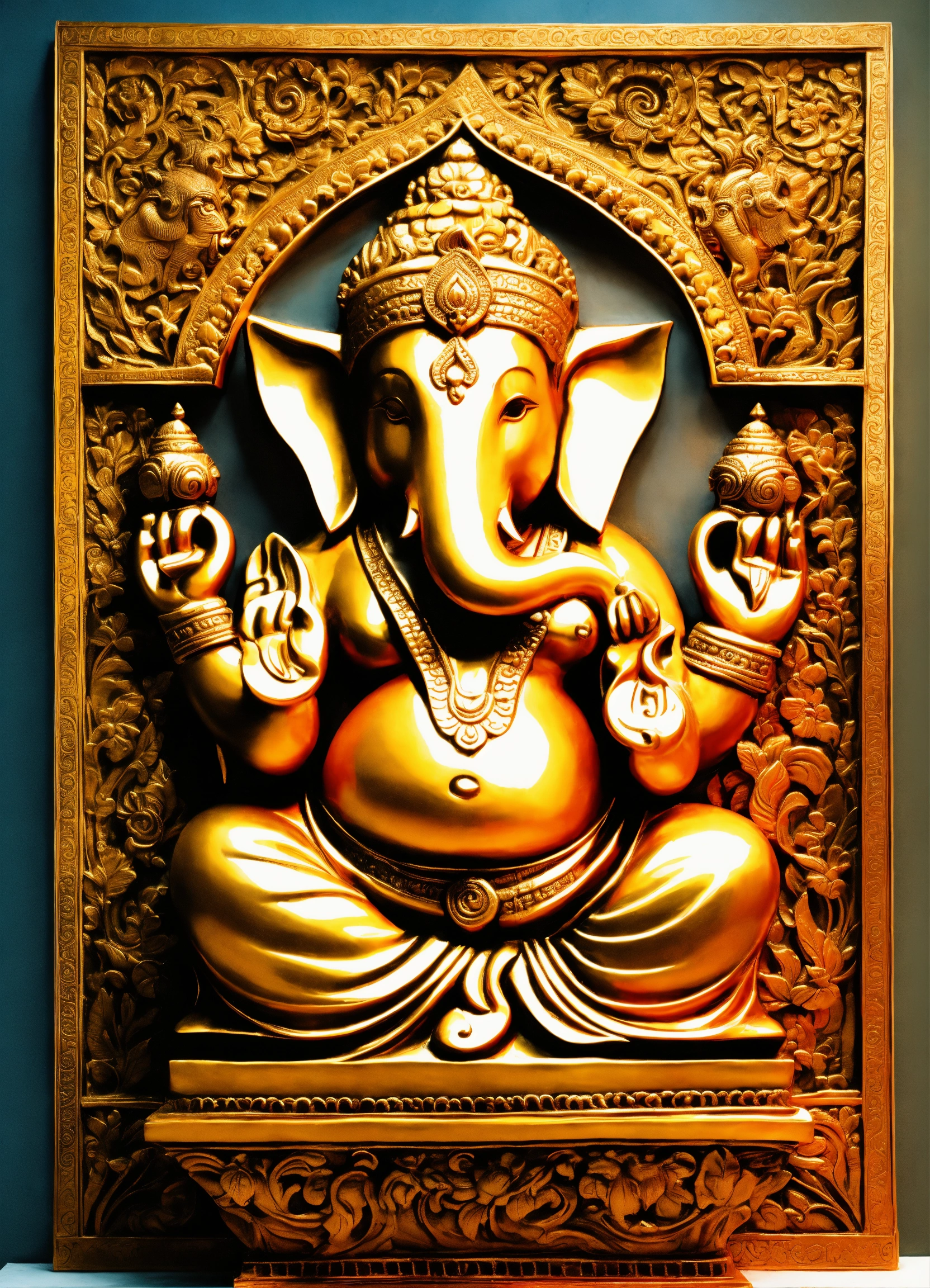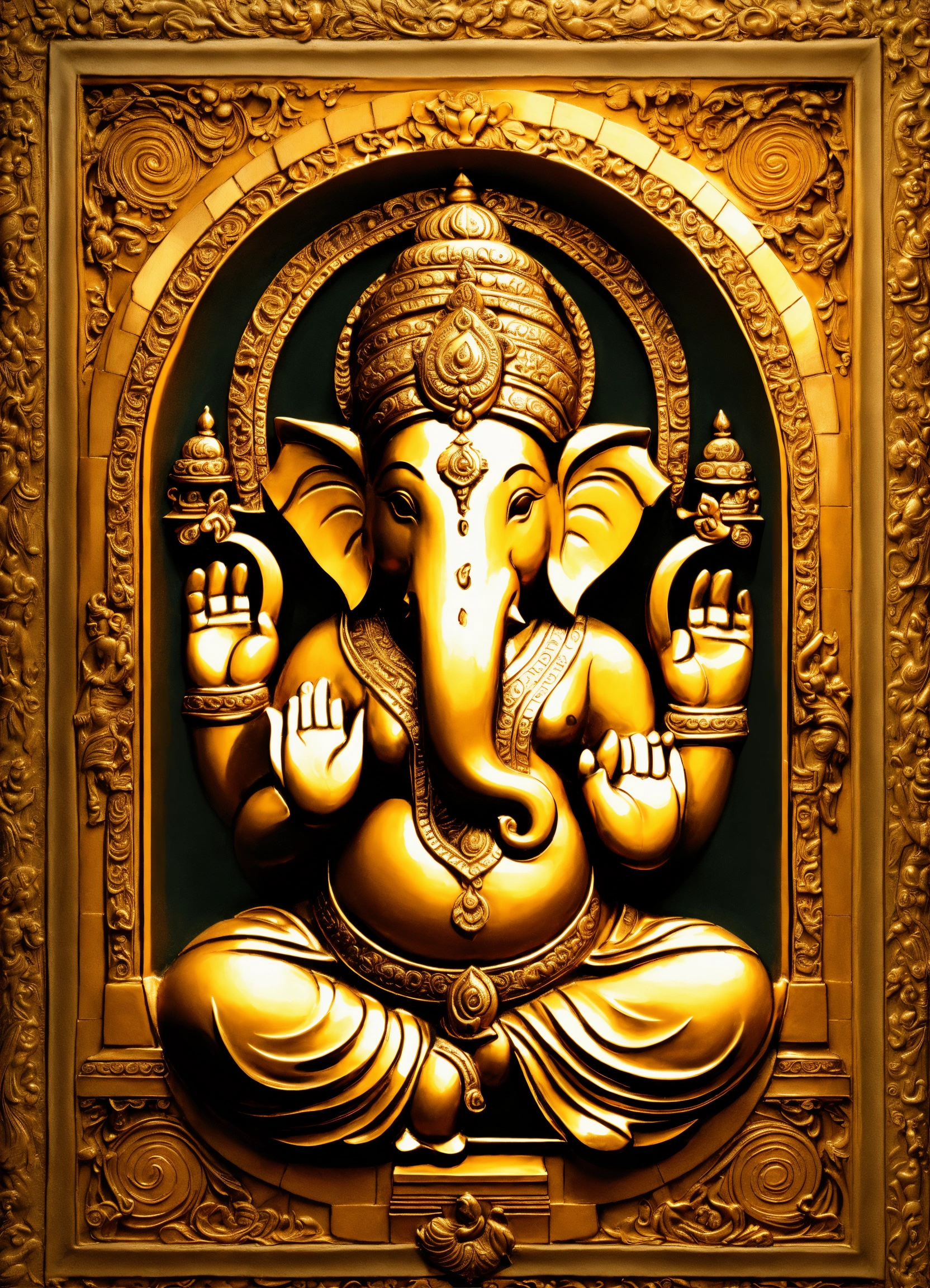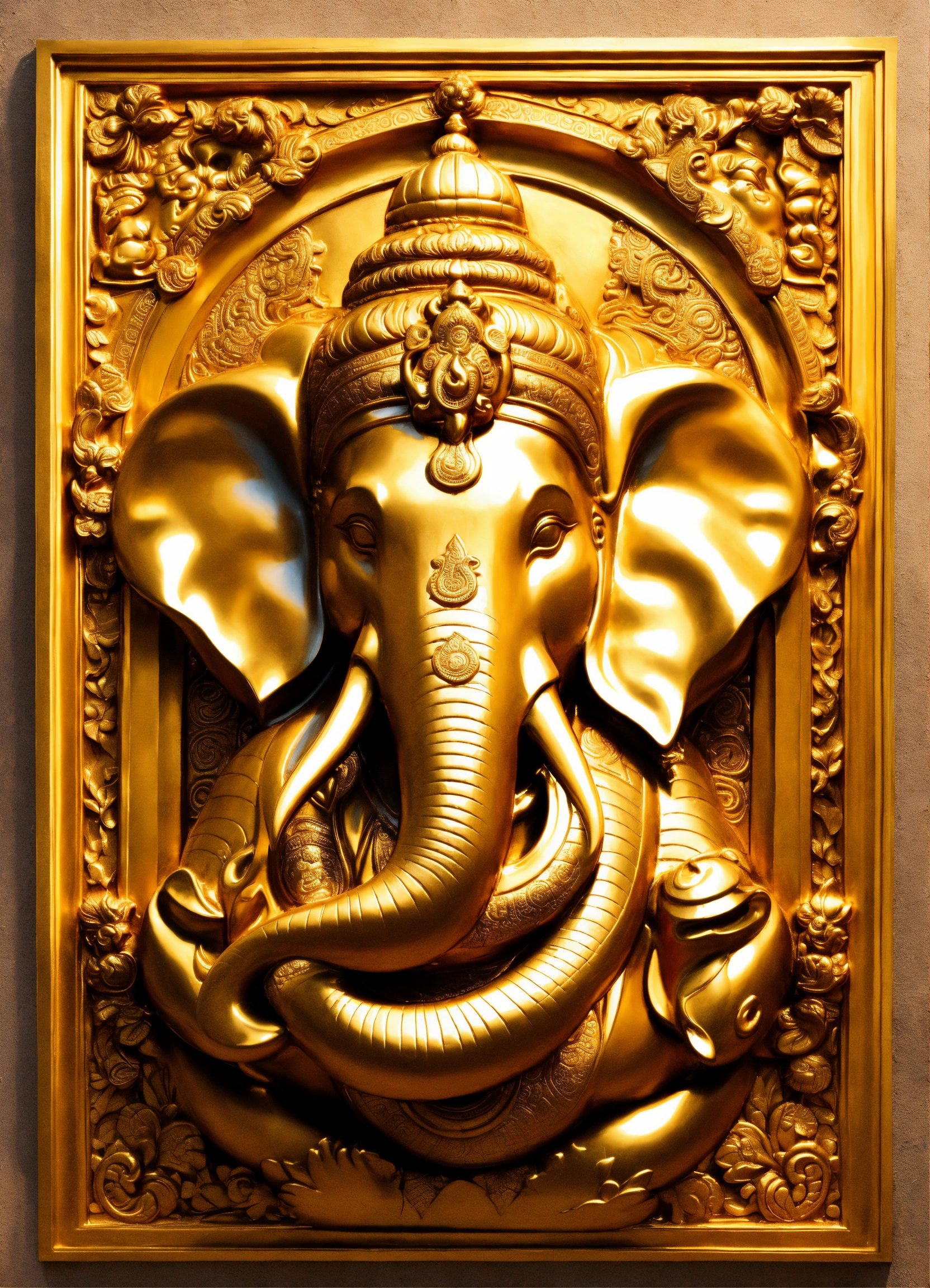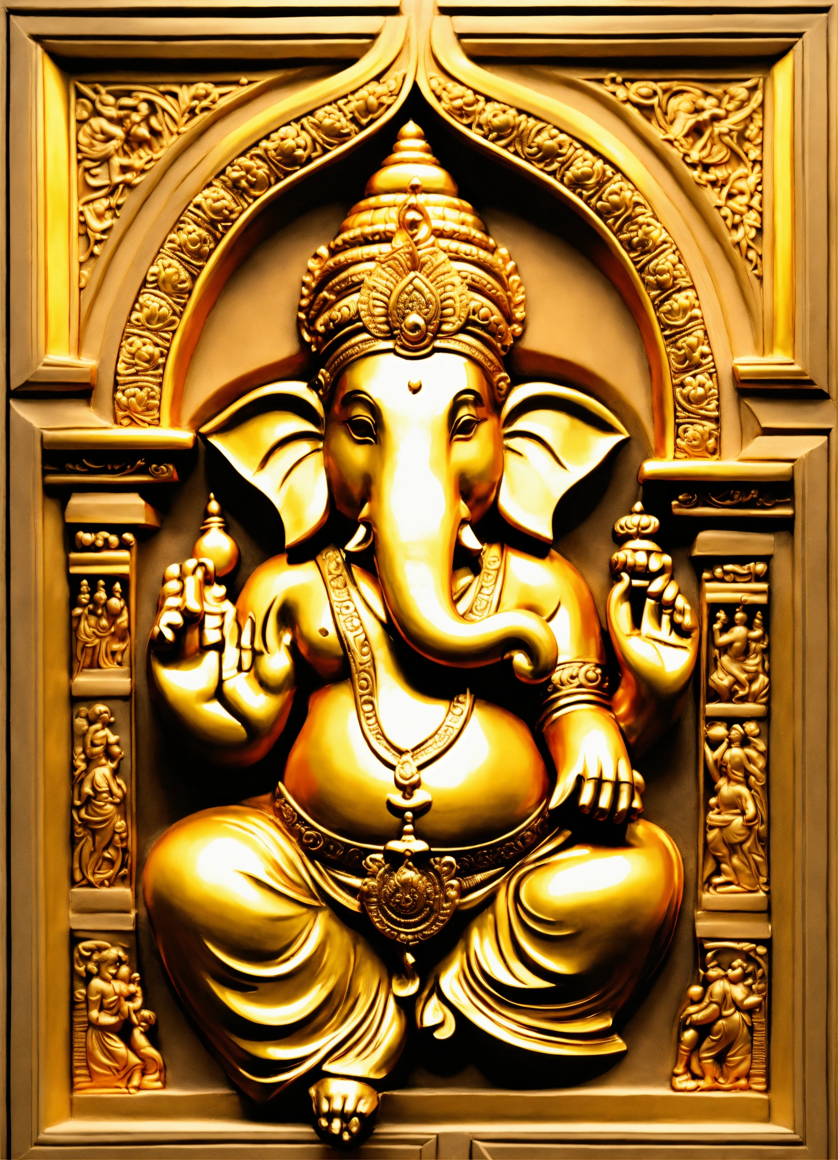 Picture relief, plaster, 4k, volume, high detail, sculpture, the background is golden, smooth, gypsum, bas-relief, center, motif, symmetry, highly detailed volumetric plaster work, bas-relief, painting, beautiful composition, the golden ratio, the big picture, the composition is beautiful, handcrafted ganesha mural panel