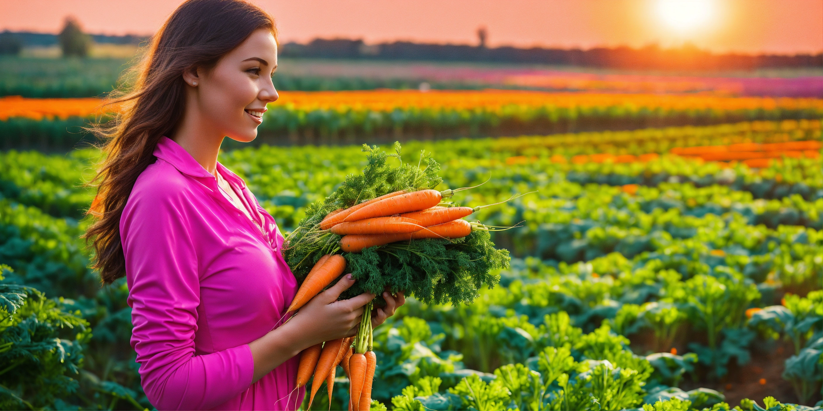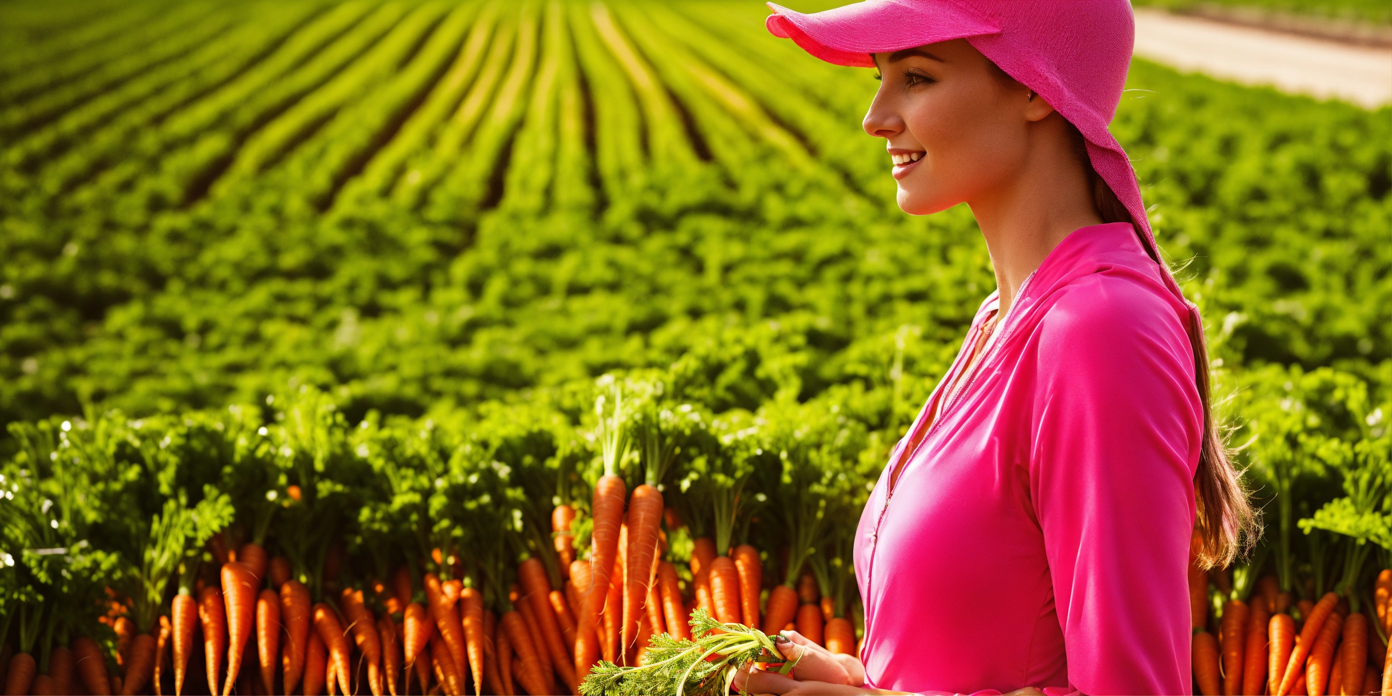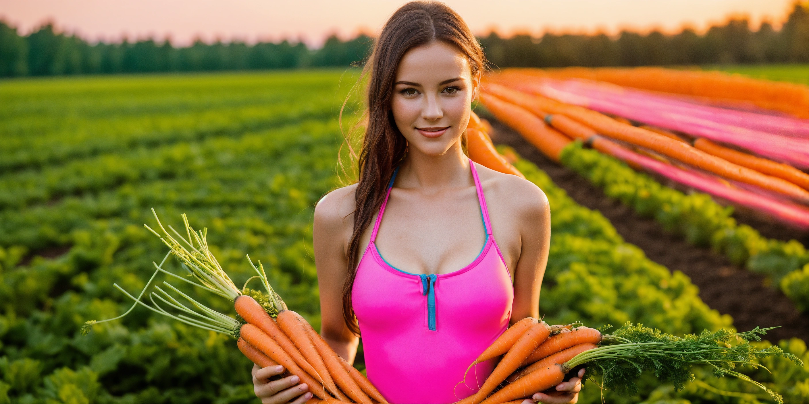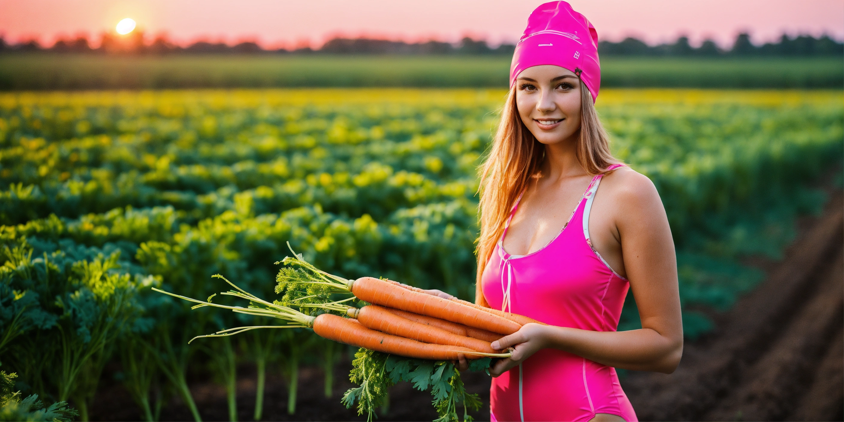 A radiant young woman in a vibrant pink swimming suit is illuminated against ukranian field of carrots, she is holding freshly harvested carrots in her hands