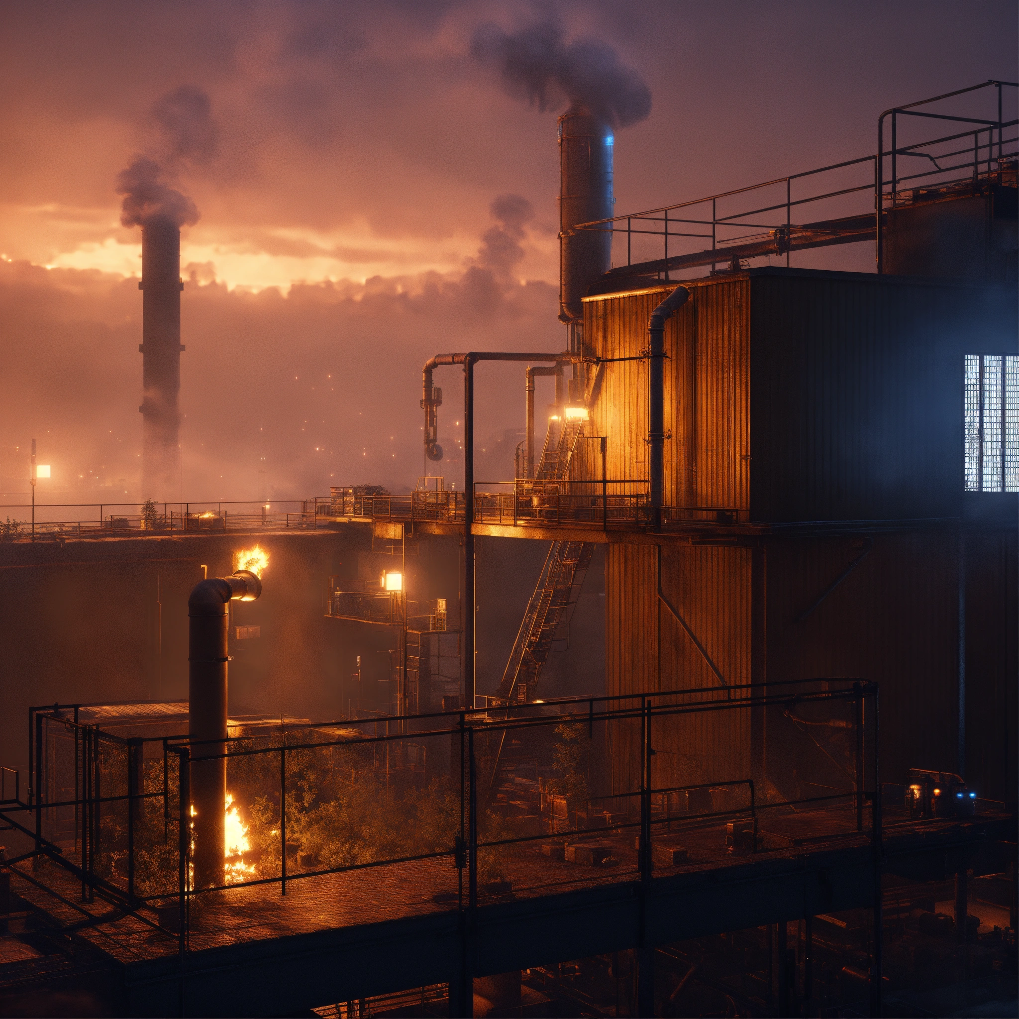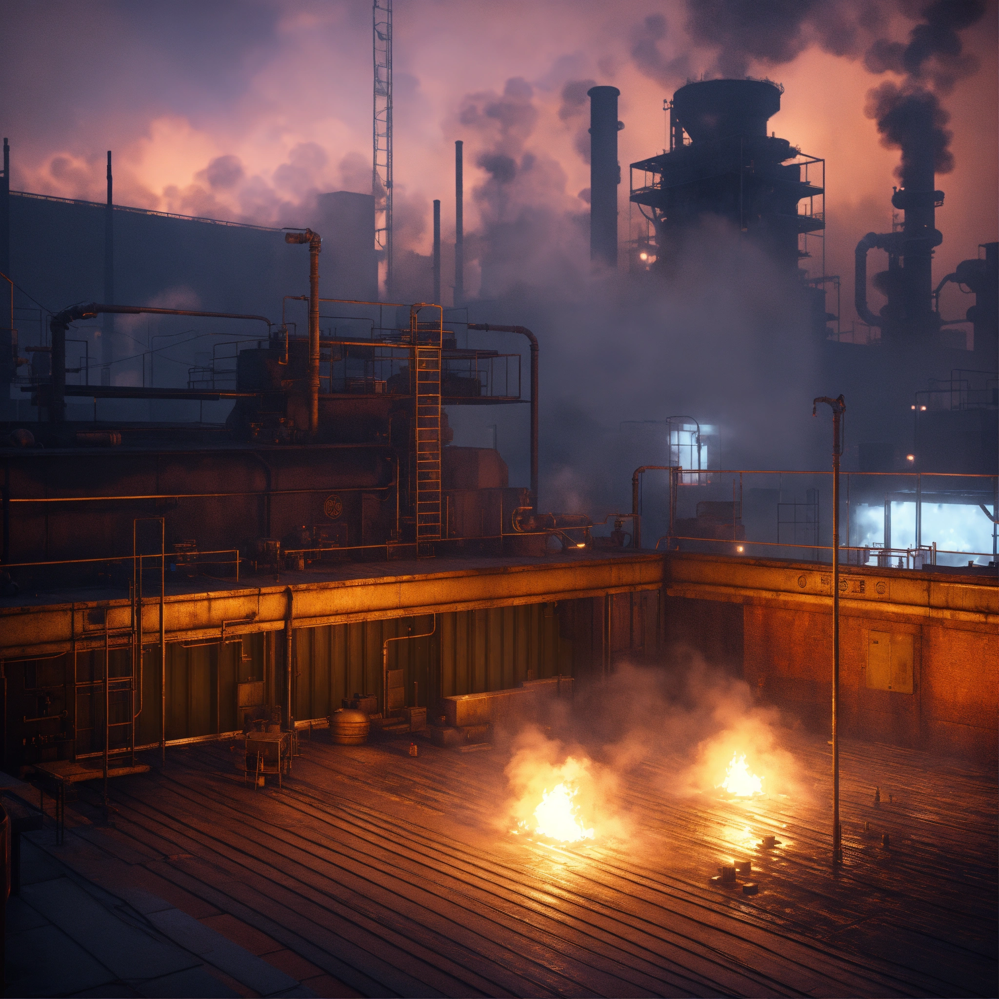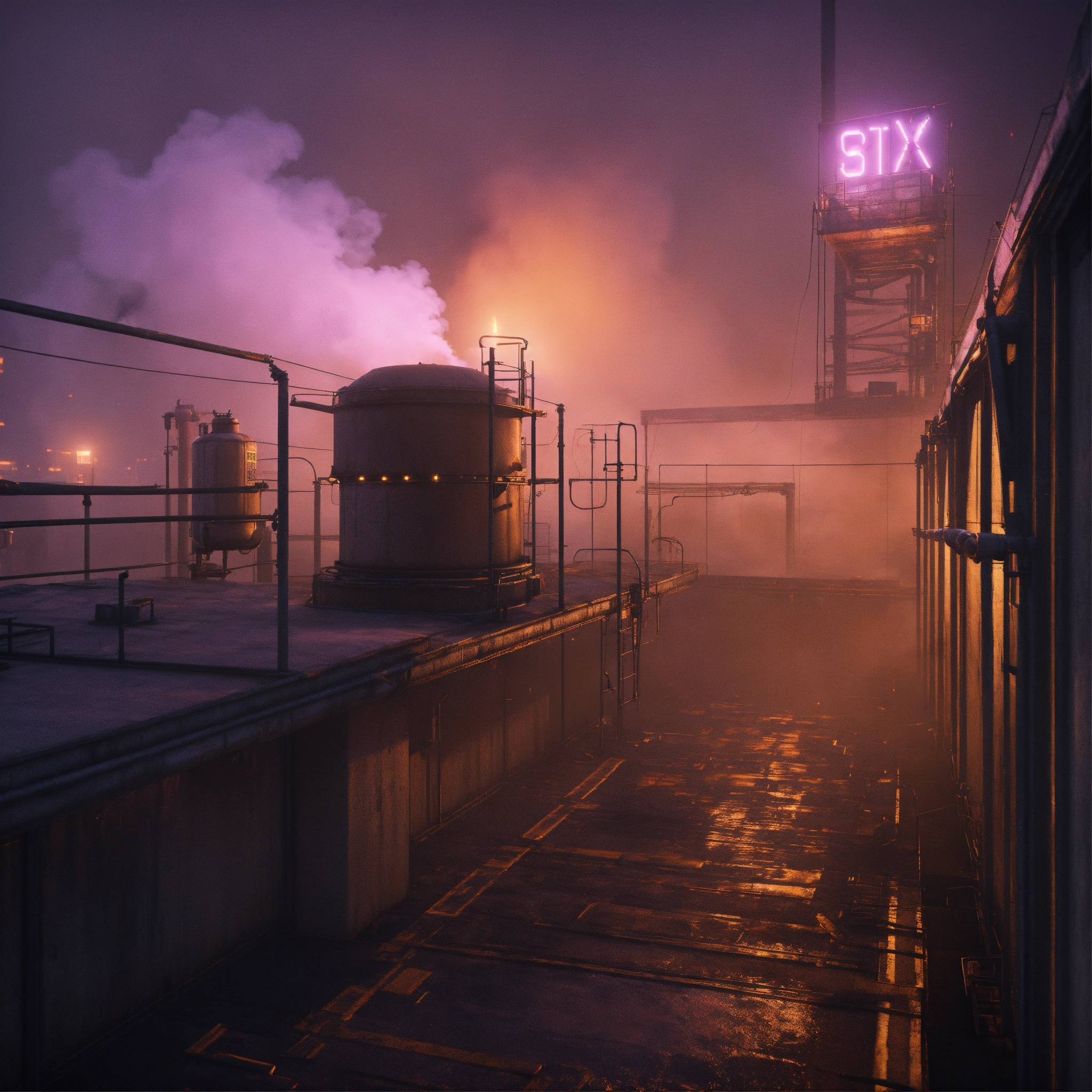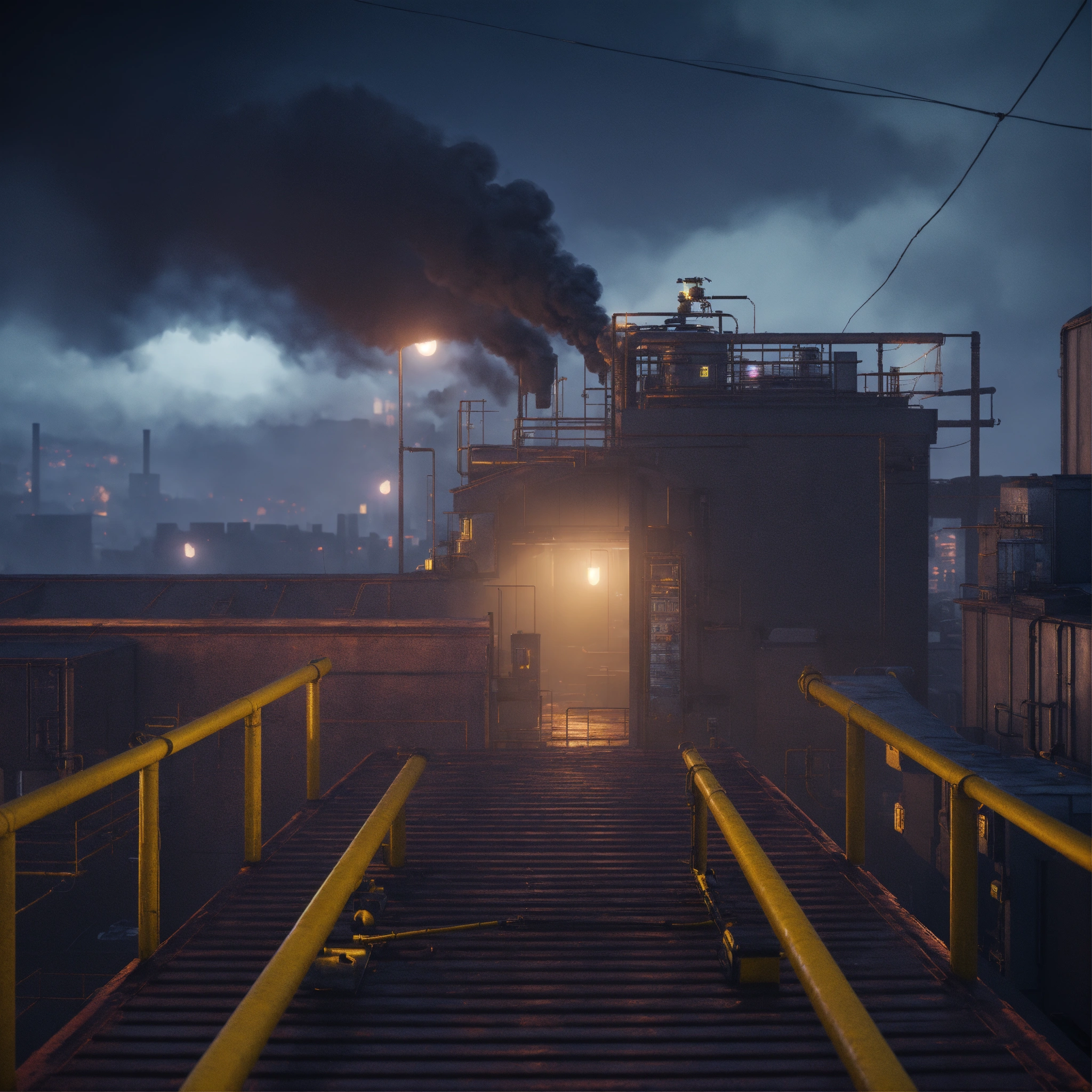 An industrial rooftop platform, toxic fumes, mist, smoke, at night, dark atmosphere, videogame graphic, blender, pixar animation, octane render
