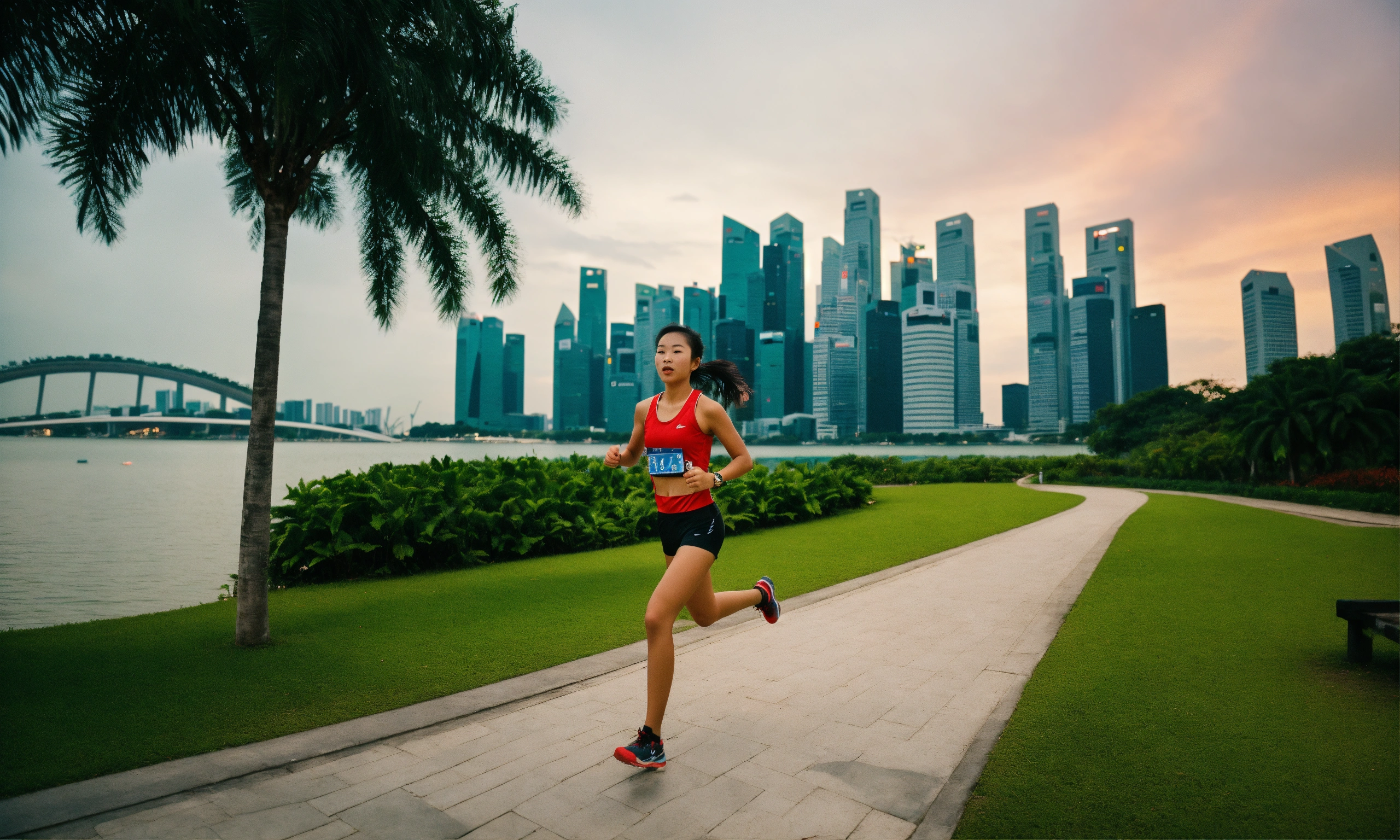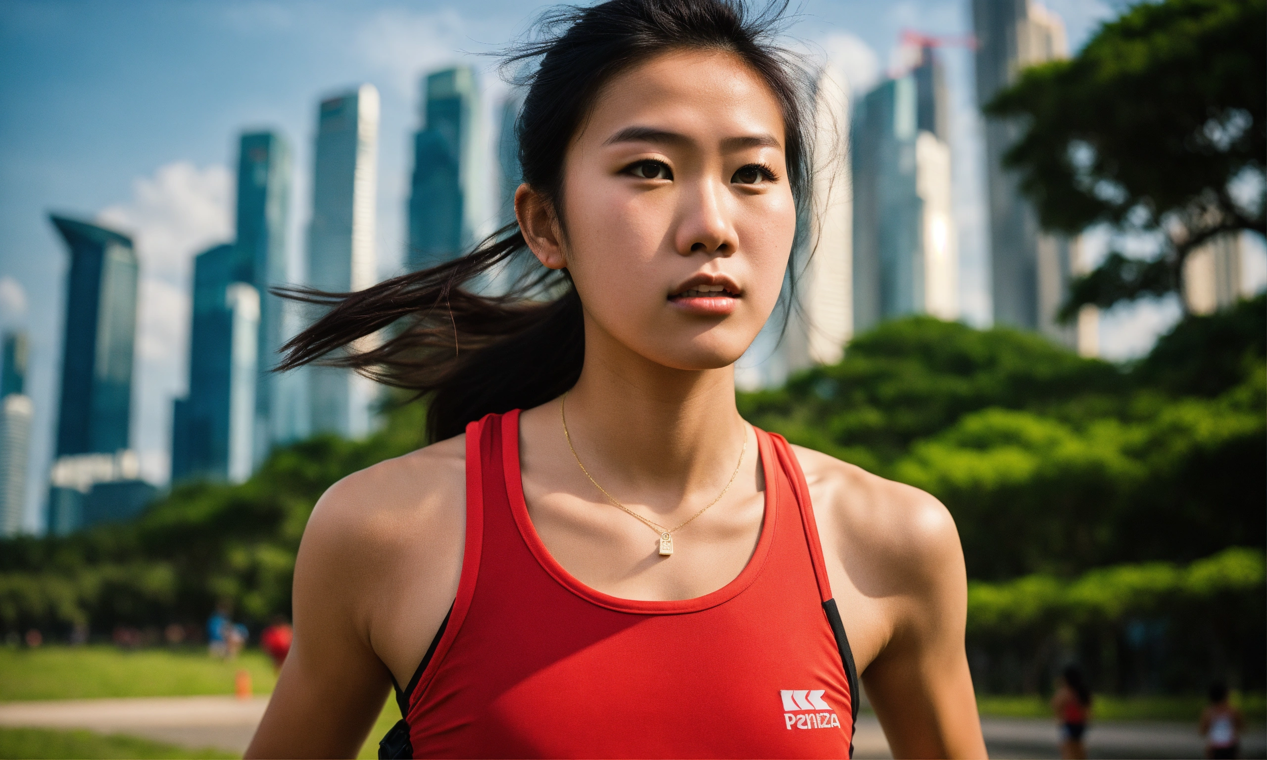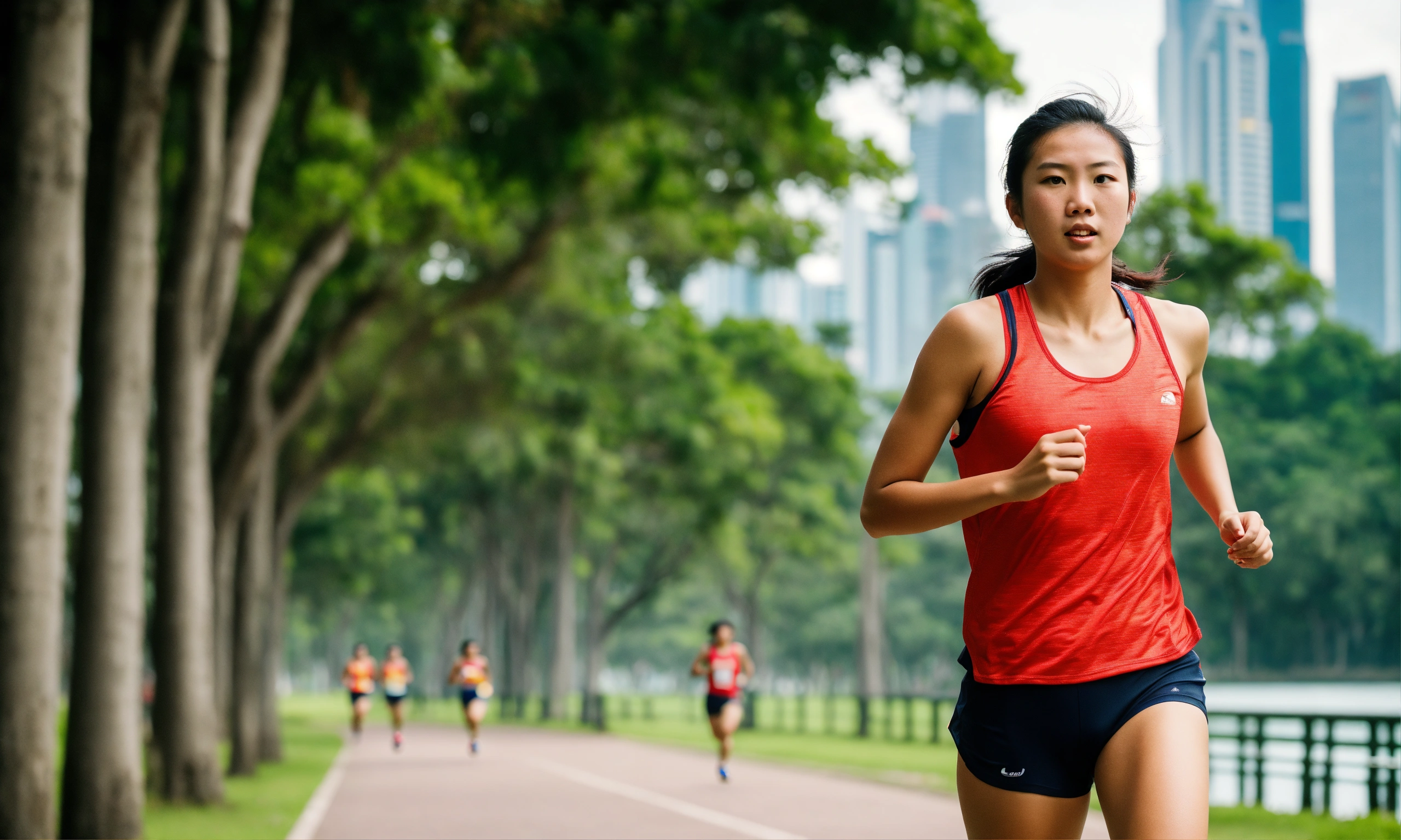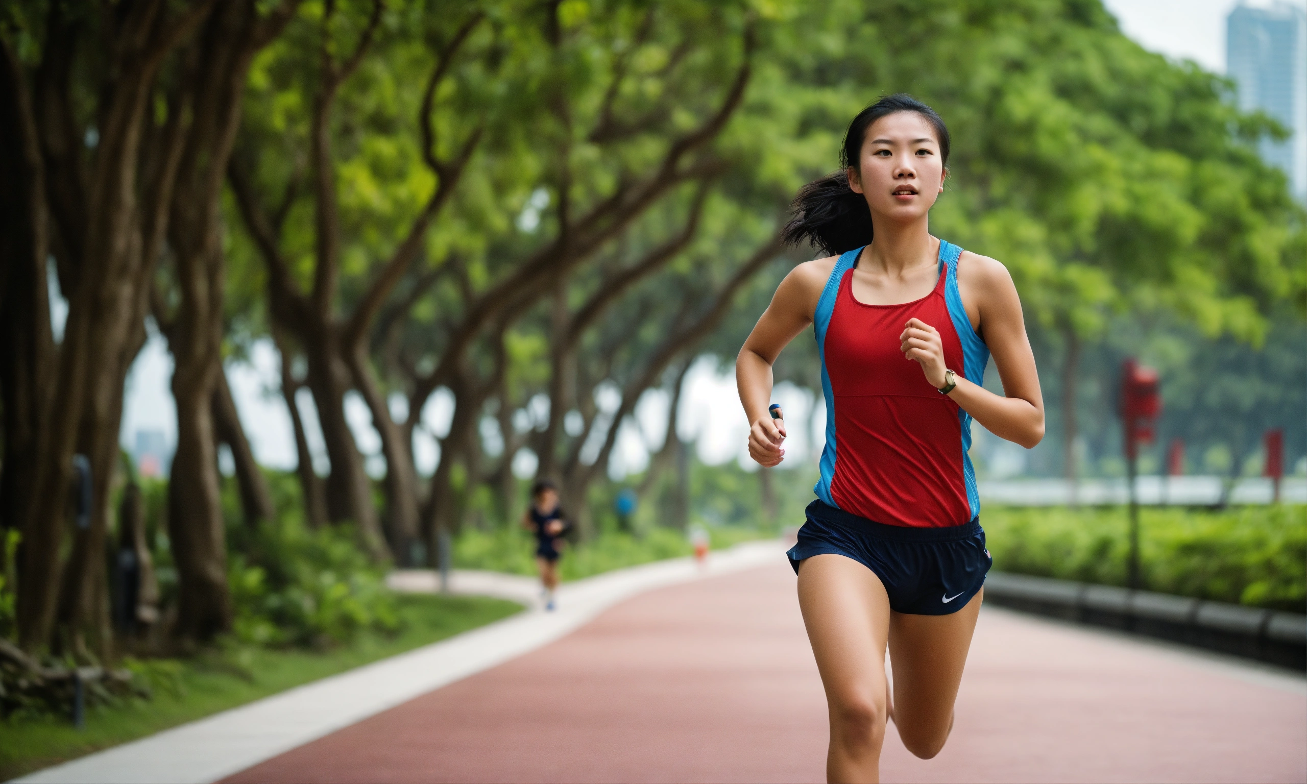 Close up shot of an athletic 18-year-old asian girl running in singapore's east coast park, a sleeveless plain red singlet, determined expression, towering trees, backdrop is the iconic singapore cityscape rises with modern skyscrapers and marina barrage, and vibrant attire symbolize the energy of this unique urban park, a leica summicron 35mm f2.0 lens to enhance the colors, shooting with kodak portra 400 film to add cinematic richness.